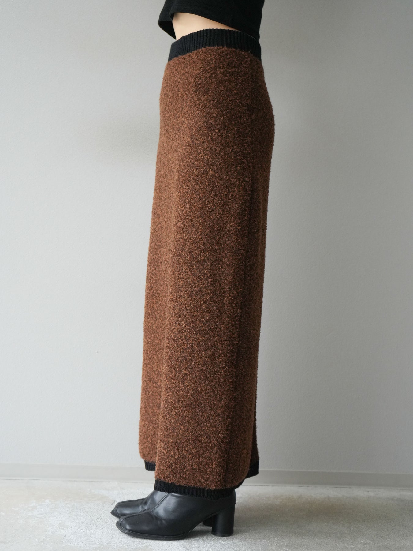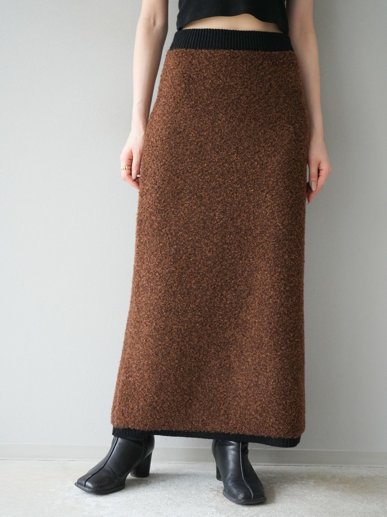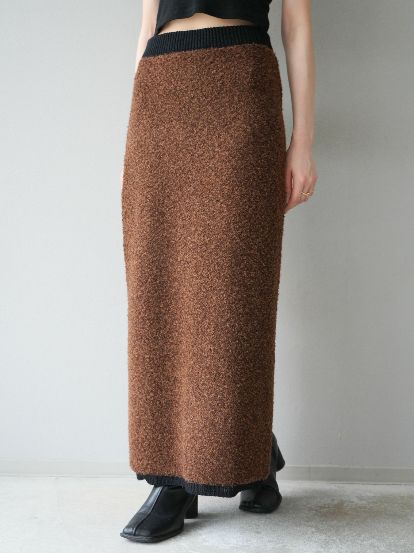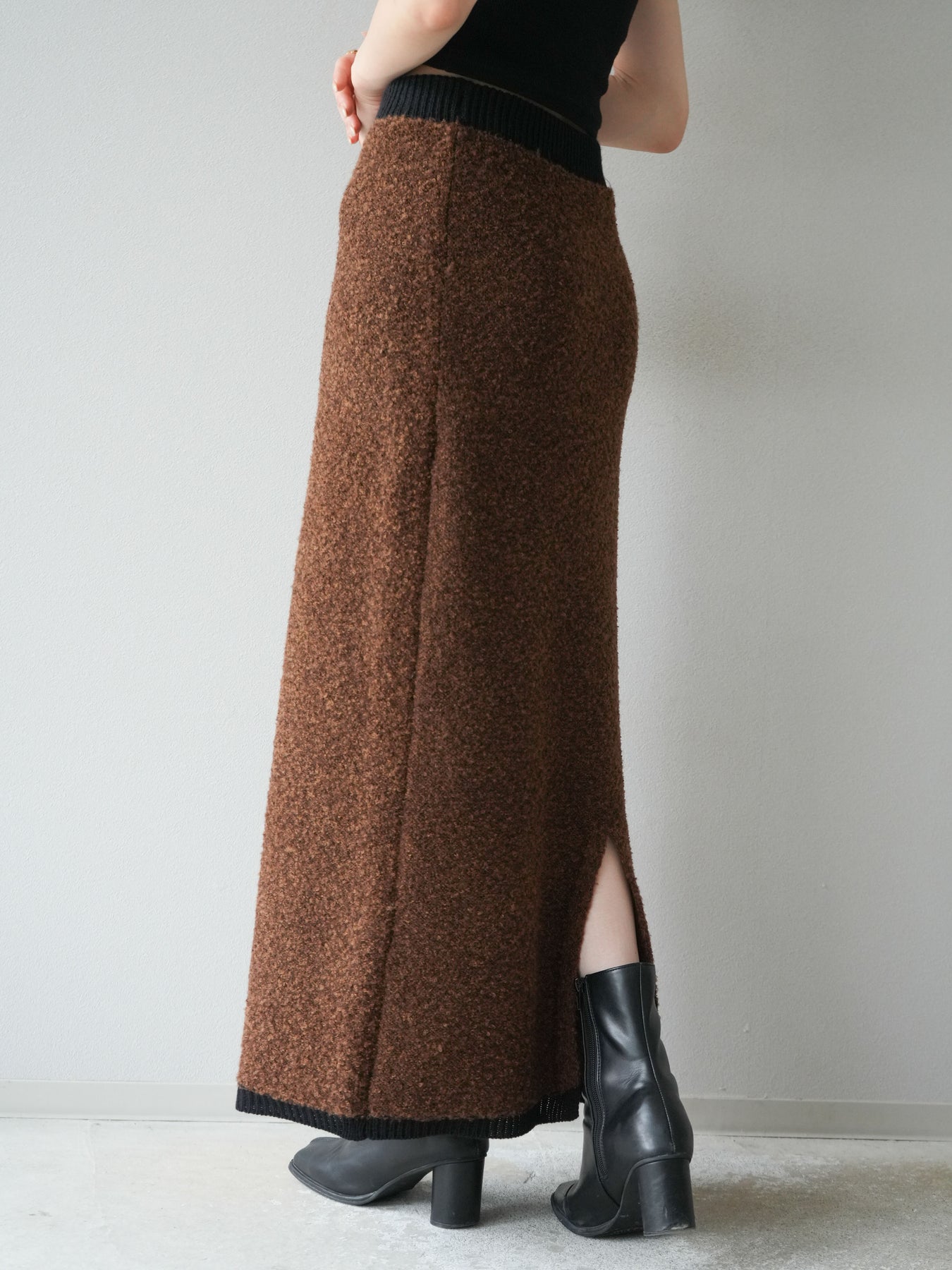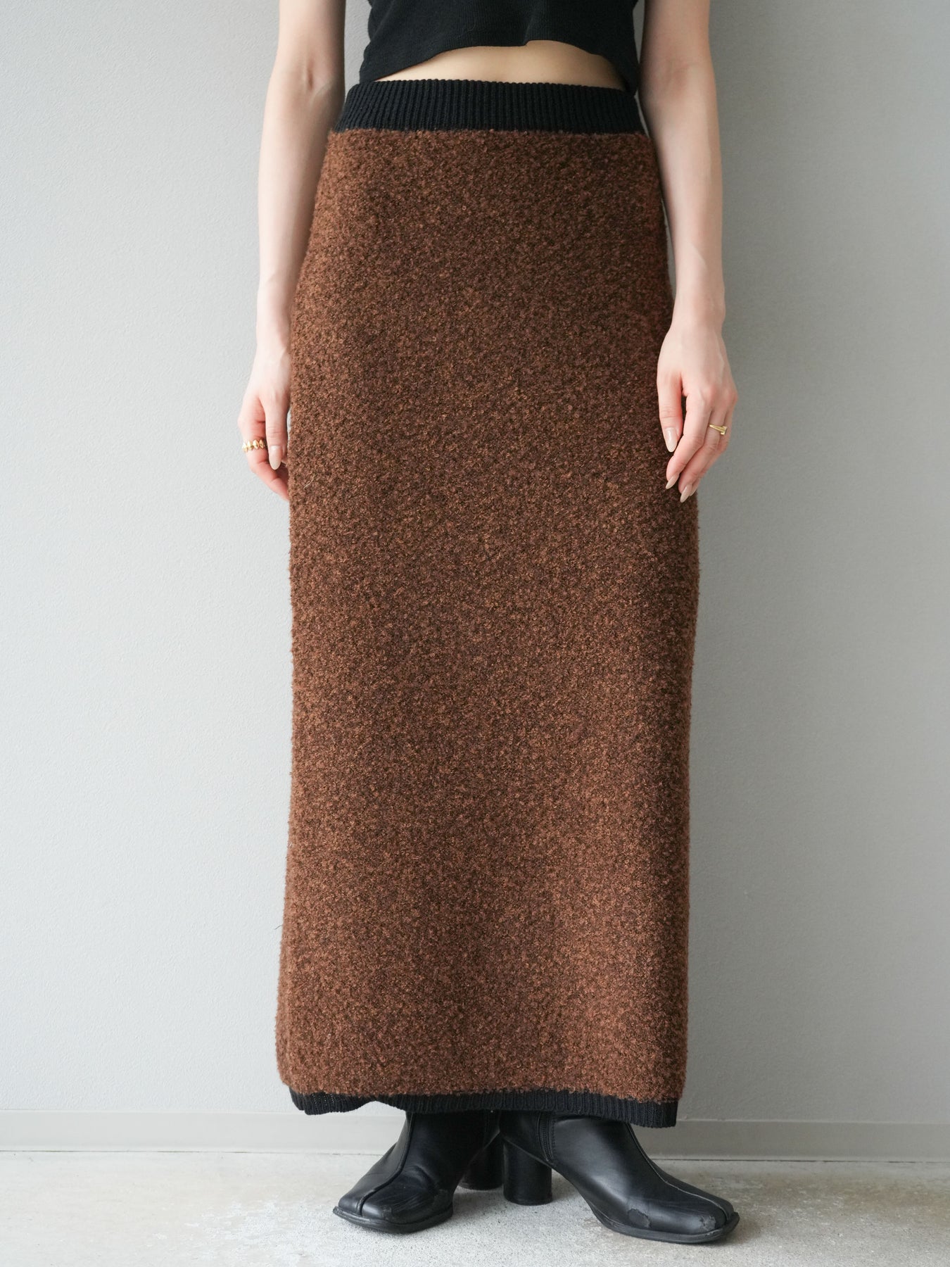 表情のあるブークレ素材を使用したタイトニットスカート。シンプルなシルエットながらも、ウエストと裾に施されたバイカラーの切り替えがスタイリングにアクセントを加えます。すっきりとしたIラインで縦のラインを強調し、スタイルアップ効果も期待できる一着。柔らかな風合いで着心地が良く、デイリー使いはもちろん、合わせるトップス次第でモードにもフェミニンにも印象を変えて楽しめます。同素材のベストと合わせたセットアップスタイルもおすすめ。
