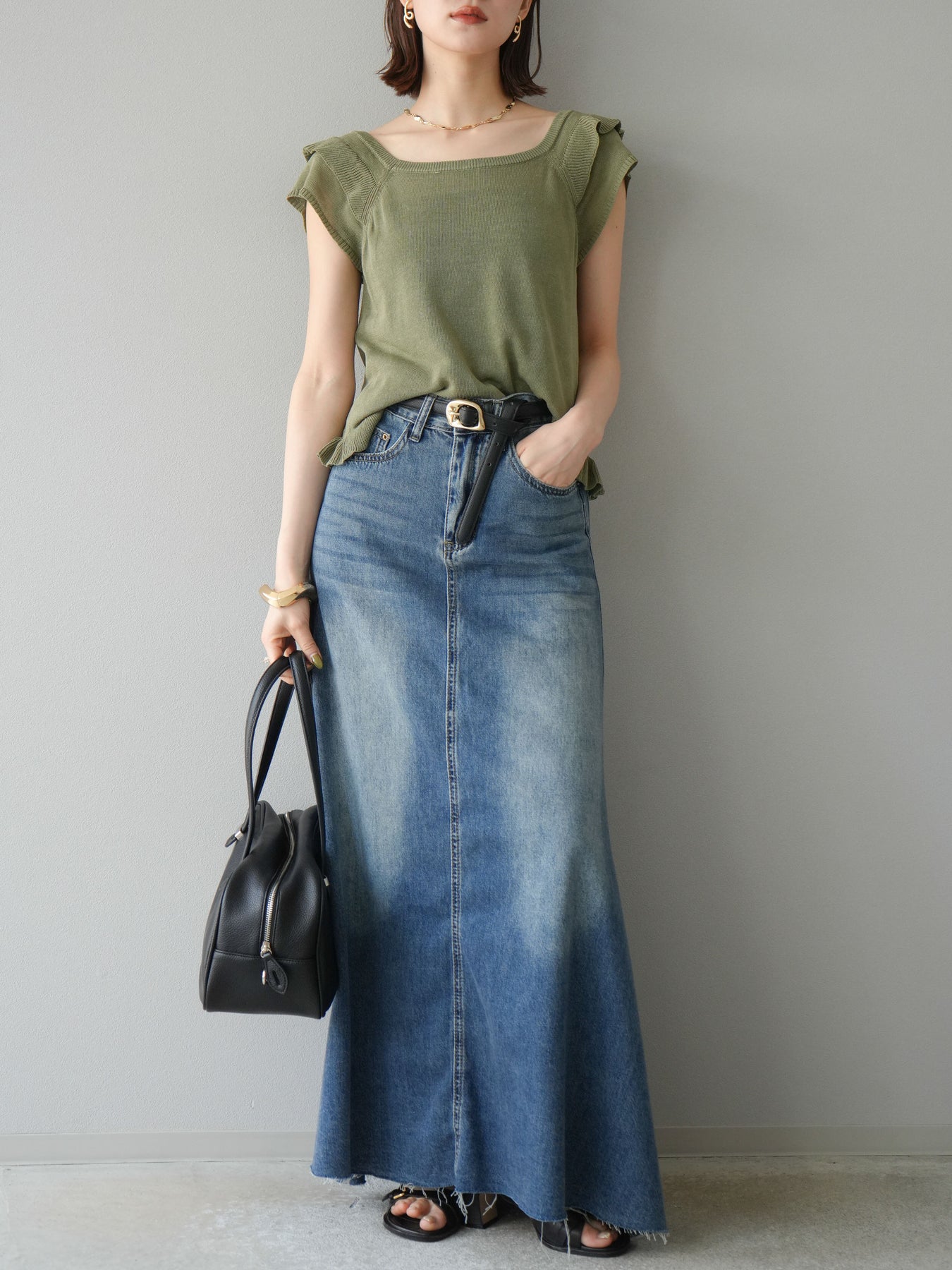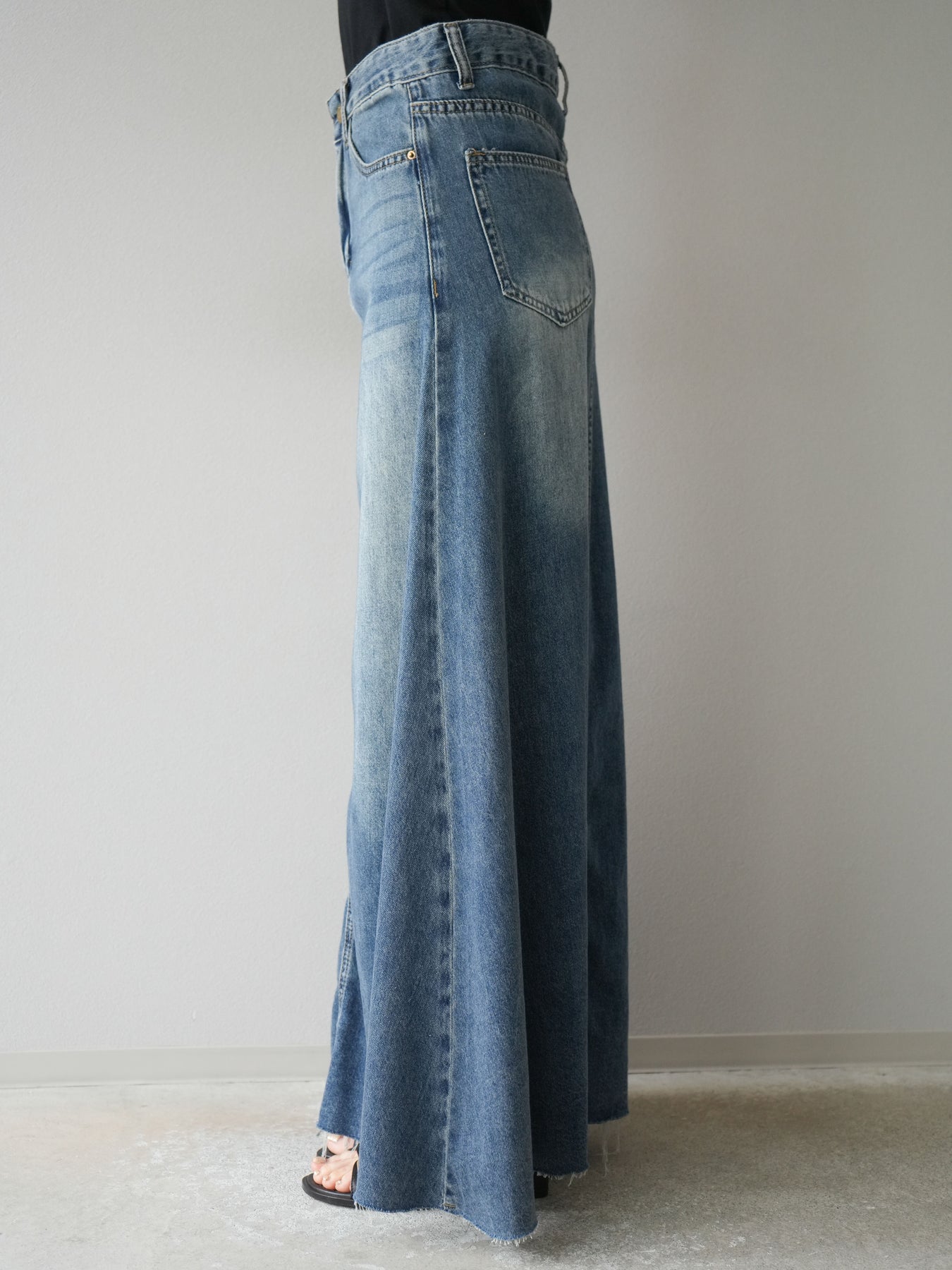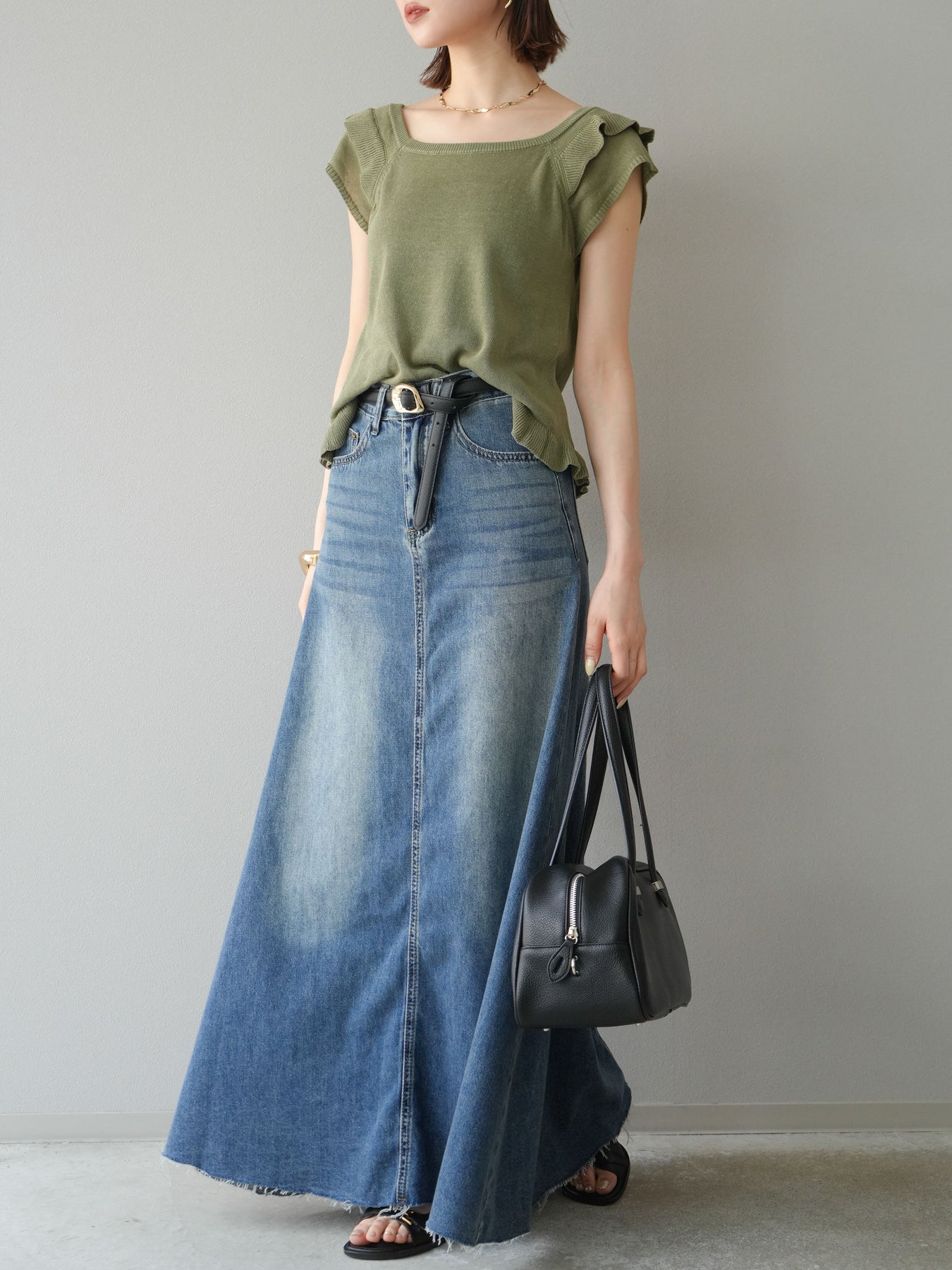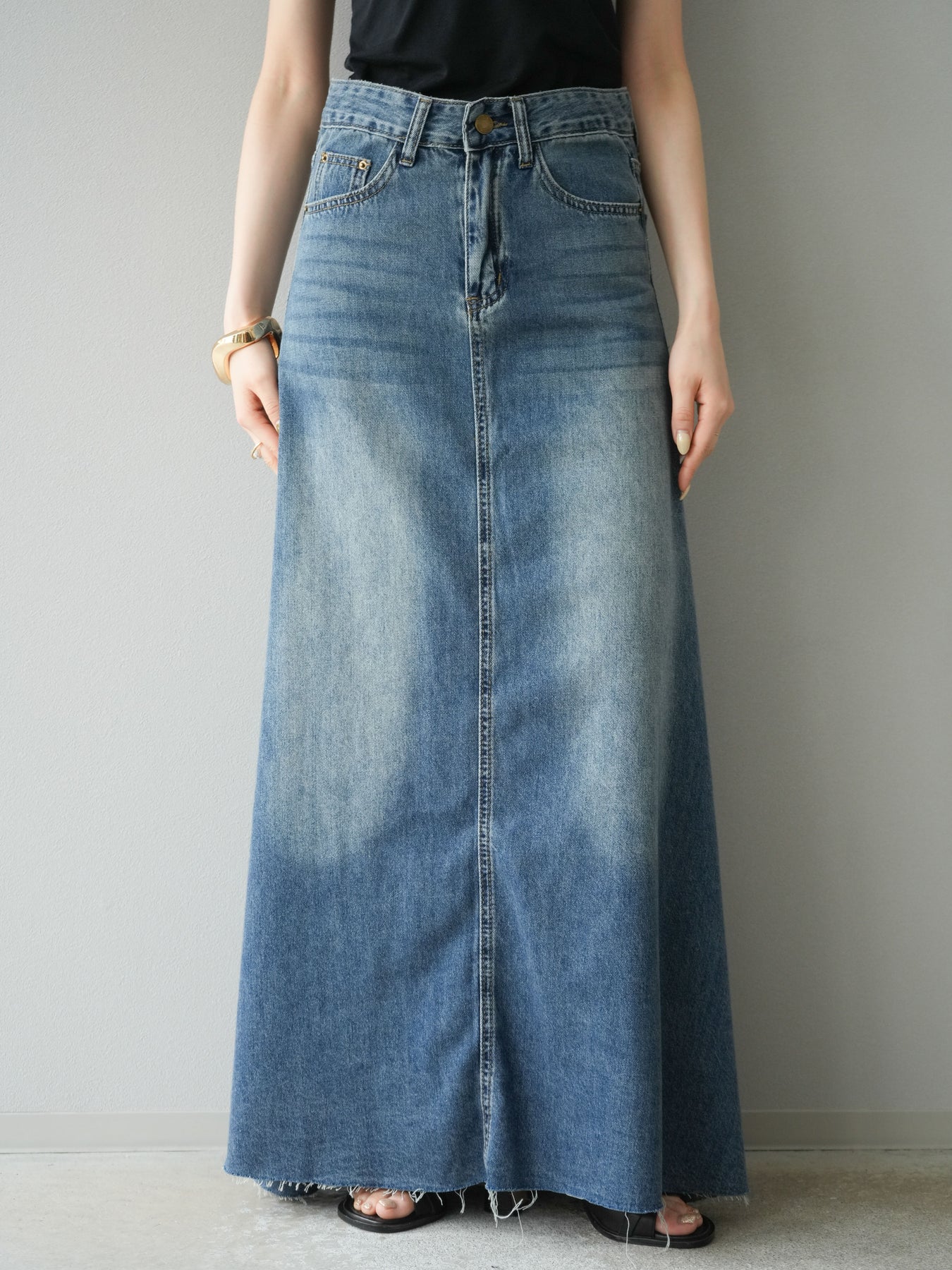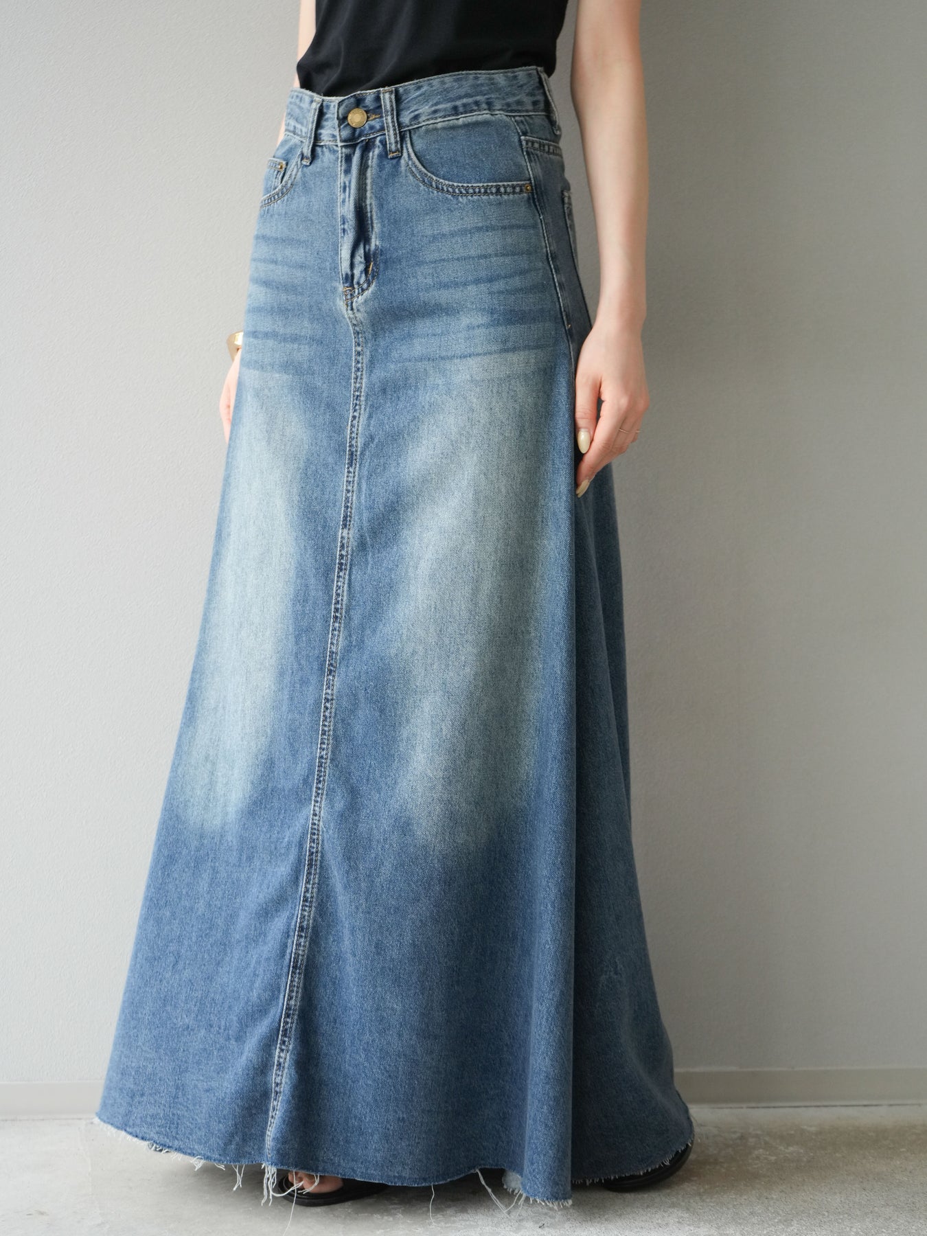 美しいフレアシルエットが魅力のAラインデニムスカート。裾はカットオフ仕様でラフな抜け感を演出しつつ、ハイウエスト設計がスタイルアップ効果を叶えてくれます。 適度な厚みと柔らかさを兼ね備えたデニム生地を使用しており、シーズンレスで着回せるのも嬉しいポイント。Tシャツやブラウスなど、幅広いトップスと好相性です。 1枚でトレンド感と女性らしさを兼ね備えた、ワードローブに加えたい優秀アイテムです。