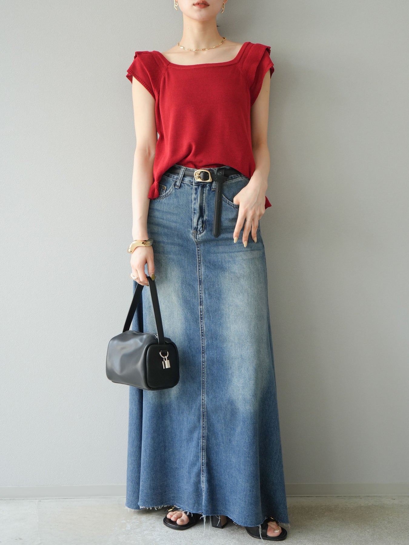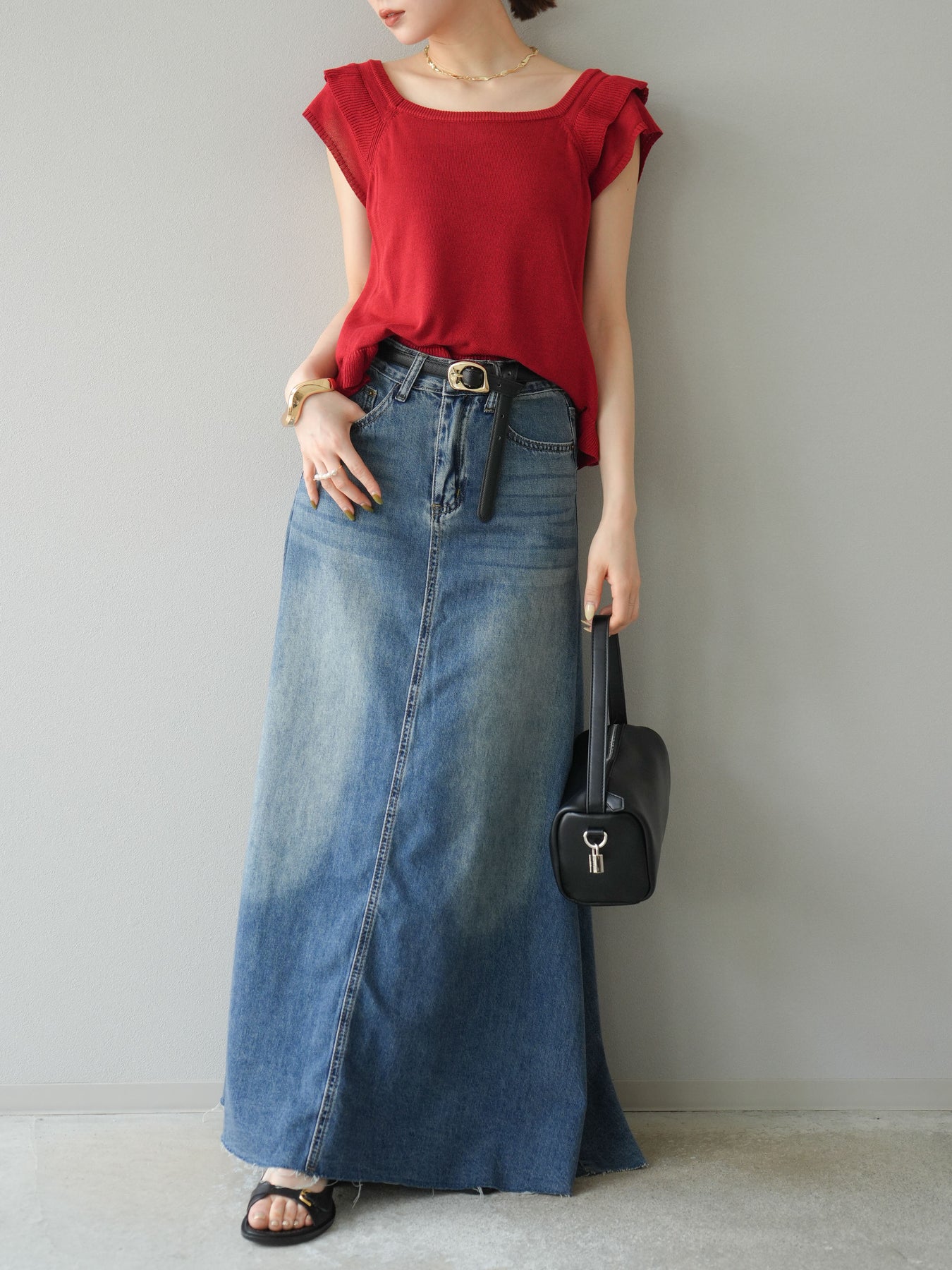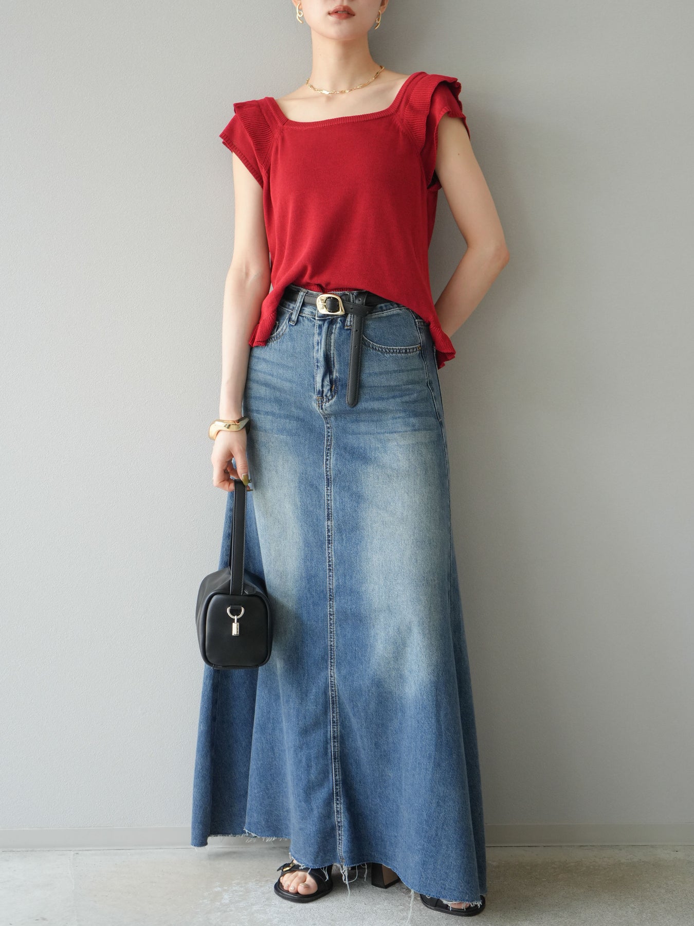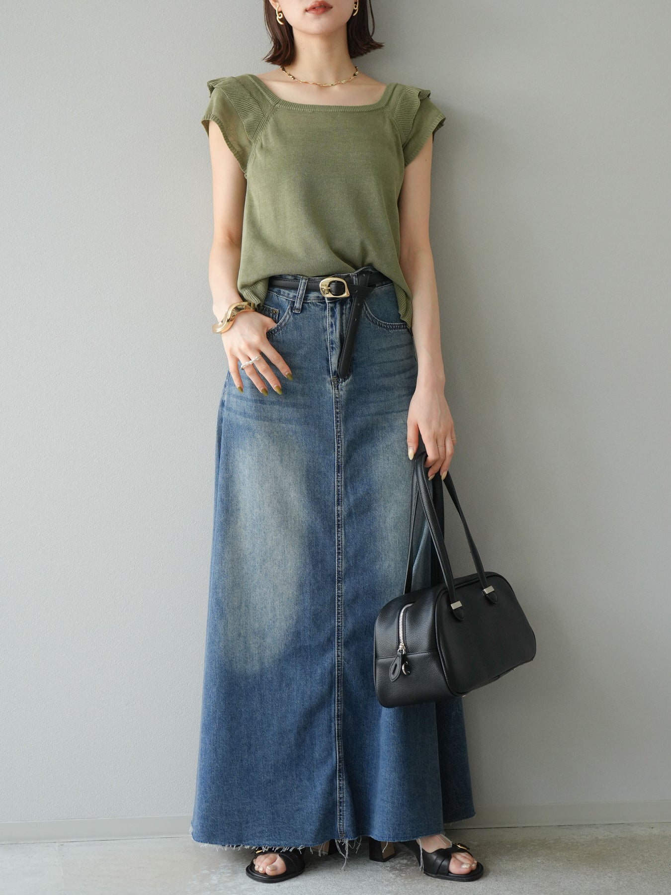 美しいフレアシルエットが魅力のAラインデニムスカート。裾はカットオフ仕様でラフな抜け感を演出しつつ、ハイウエスト設計がスタイルアップ効果を叶えてくれます。 適度な厚みと柔らかさを兼ね備えたデニム生地を使用しており、シーズンレスで着回せるのも嬉しいポイント。Tシャツやブラウスなど、幅広いトップスと好相性です。 1枚でトレンド感と女性らしさを兼ね備えた、ワードローブに加えたい優秀アイテムです。