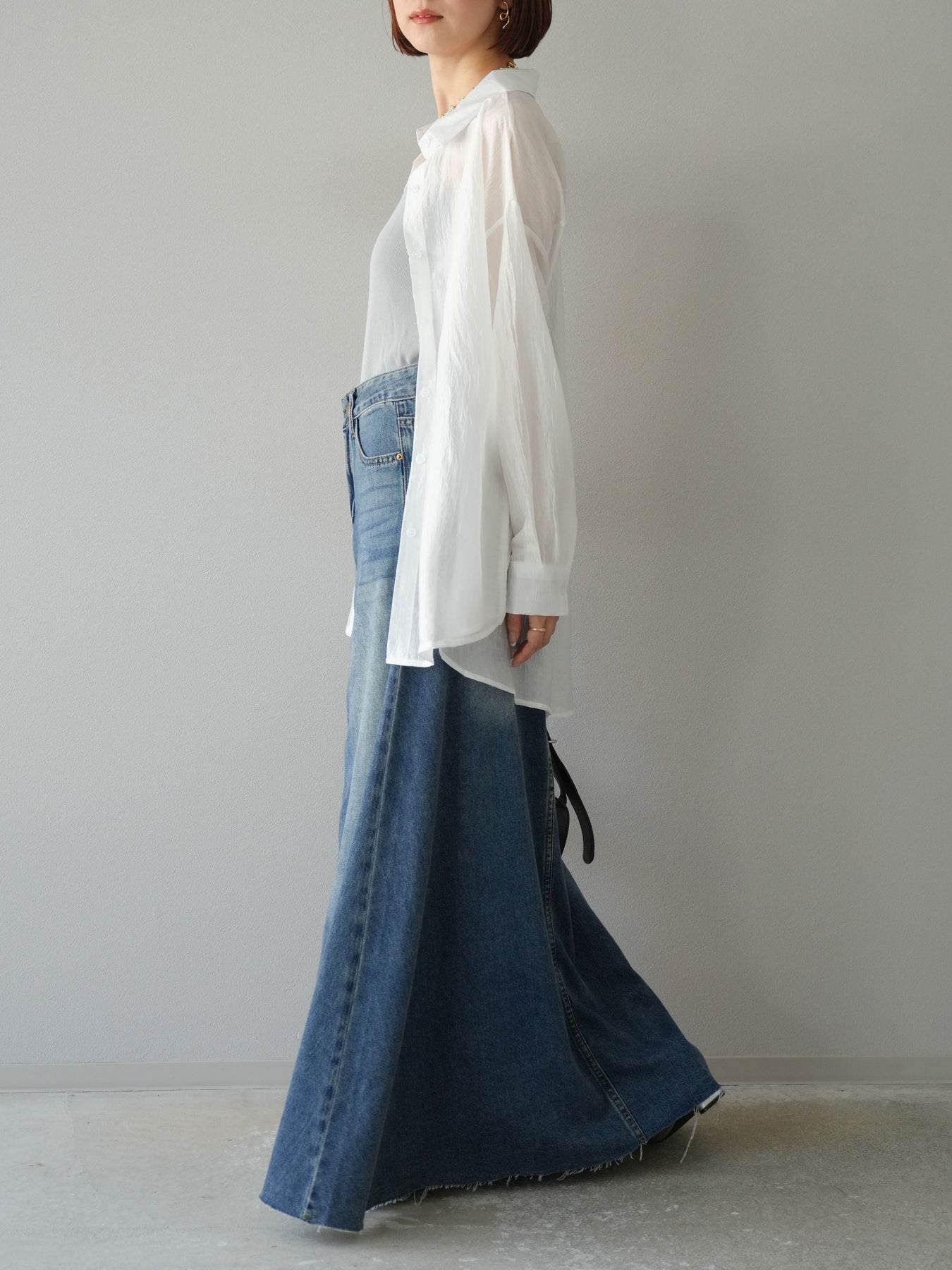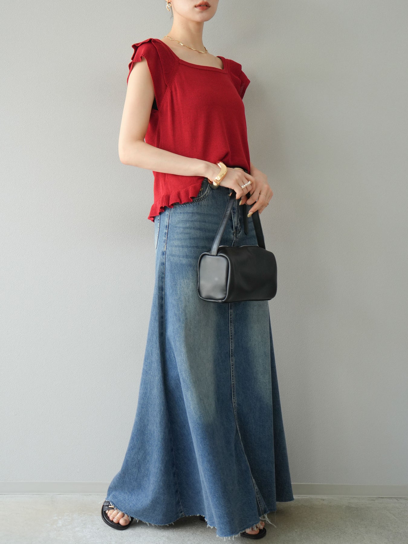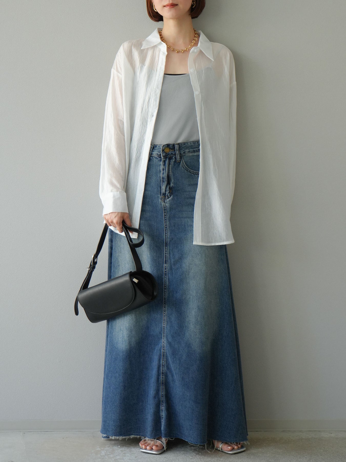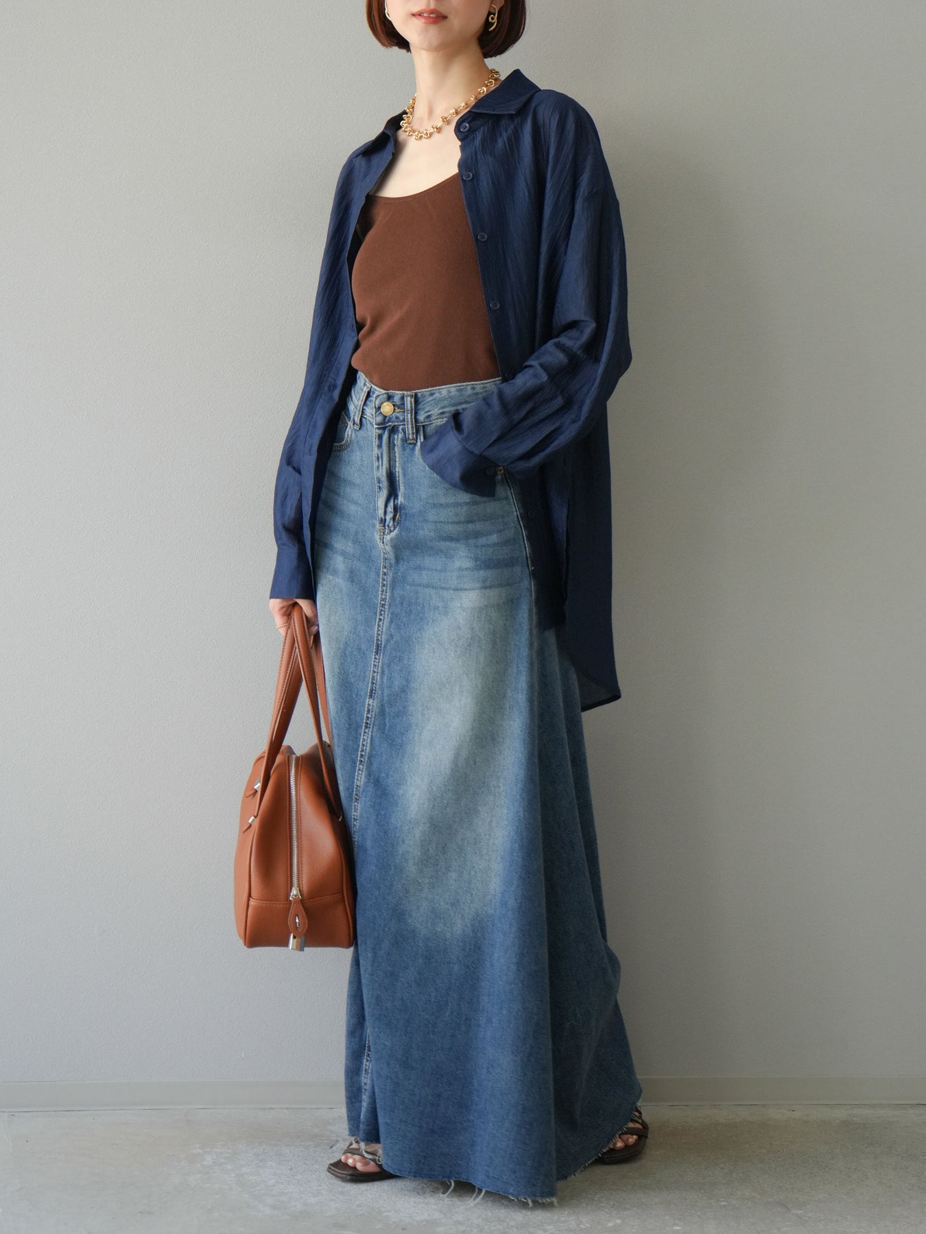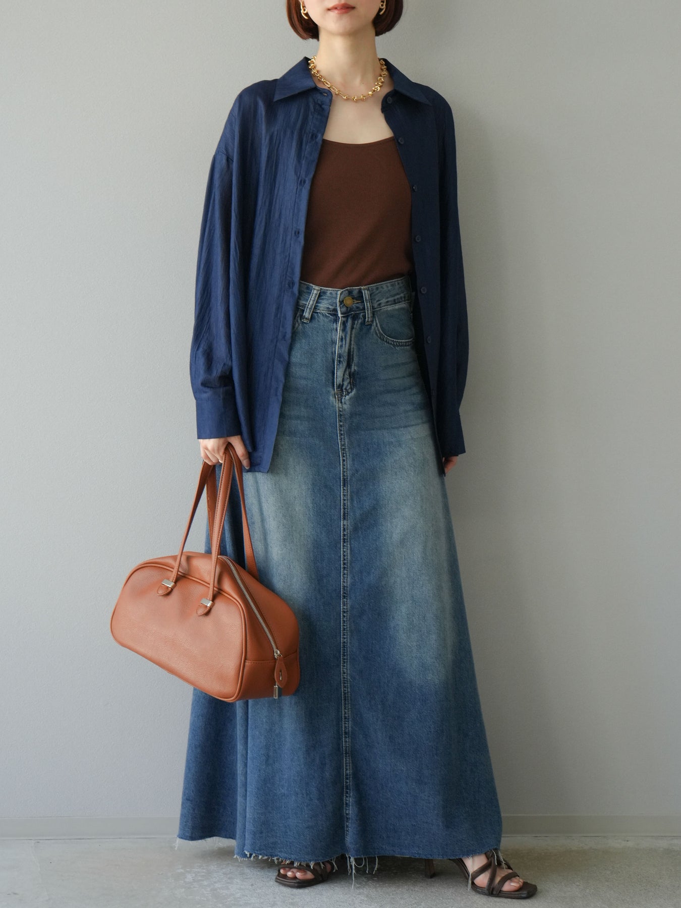 美しいフレアシルエットが魅力のAラインデニムスカート。裾はカットオフ仕様でラフな抜け感を演出しつつ、ハイウエスト設計がスタイルアップ効果を叶えてくれます。 適度な厚みと柔らかさを兼ね備えたデニム生地を使用しており、シーズンレスで着回せるのも嬉しいポイント。Tシャツやブラウスなど、幅広いトップスと好相性です。 1枚でトレンド感と女性らしさを兼ね備えた、ワードローブに加えたい優秀アイテムです。