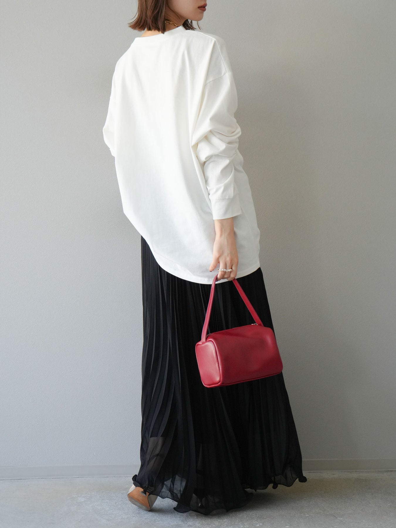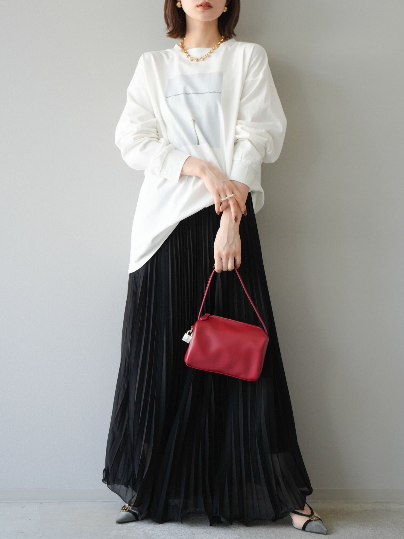 柔らかく透け感のあるシフォン素材を使用した、軽やかなロングプリーツスカート。 動くたびにふわりと広がるエアリーな揺れ感が、女性らしい印象を引き立てます。 裾のパイピングがさりげないアクセントになり、コーディネートに上品な華やかさをプラス。 ウエストはゴム仕様でストレスフリーな穿き心地も魅力の一枚です。