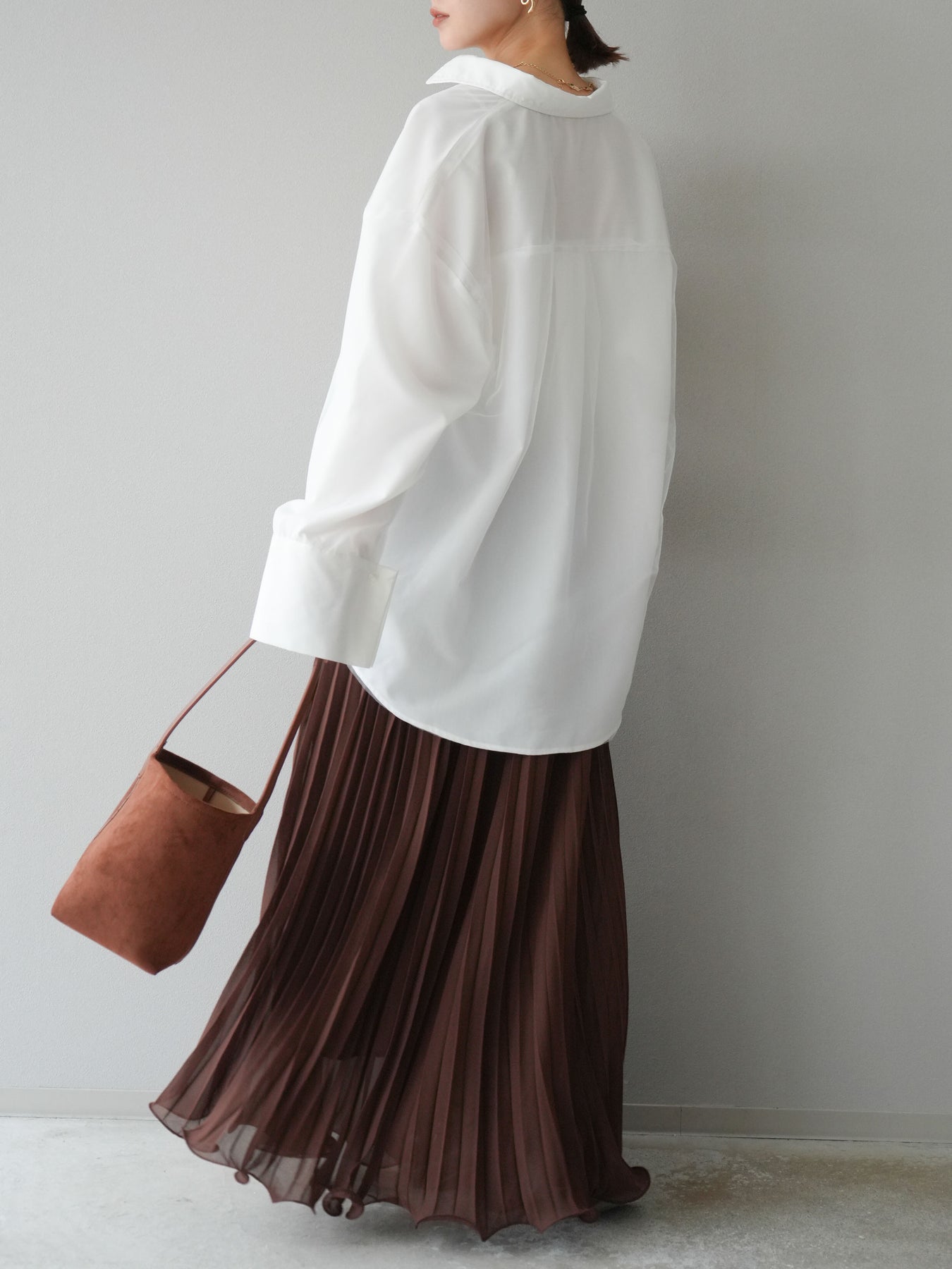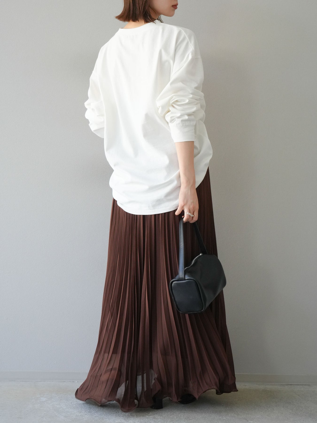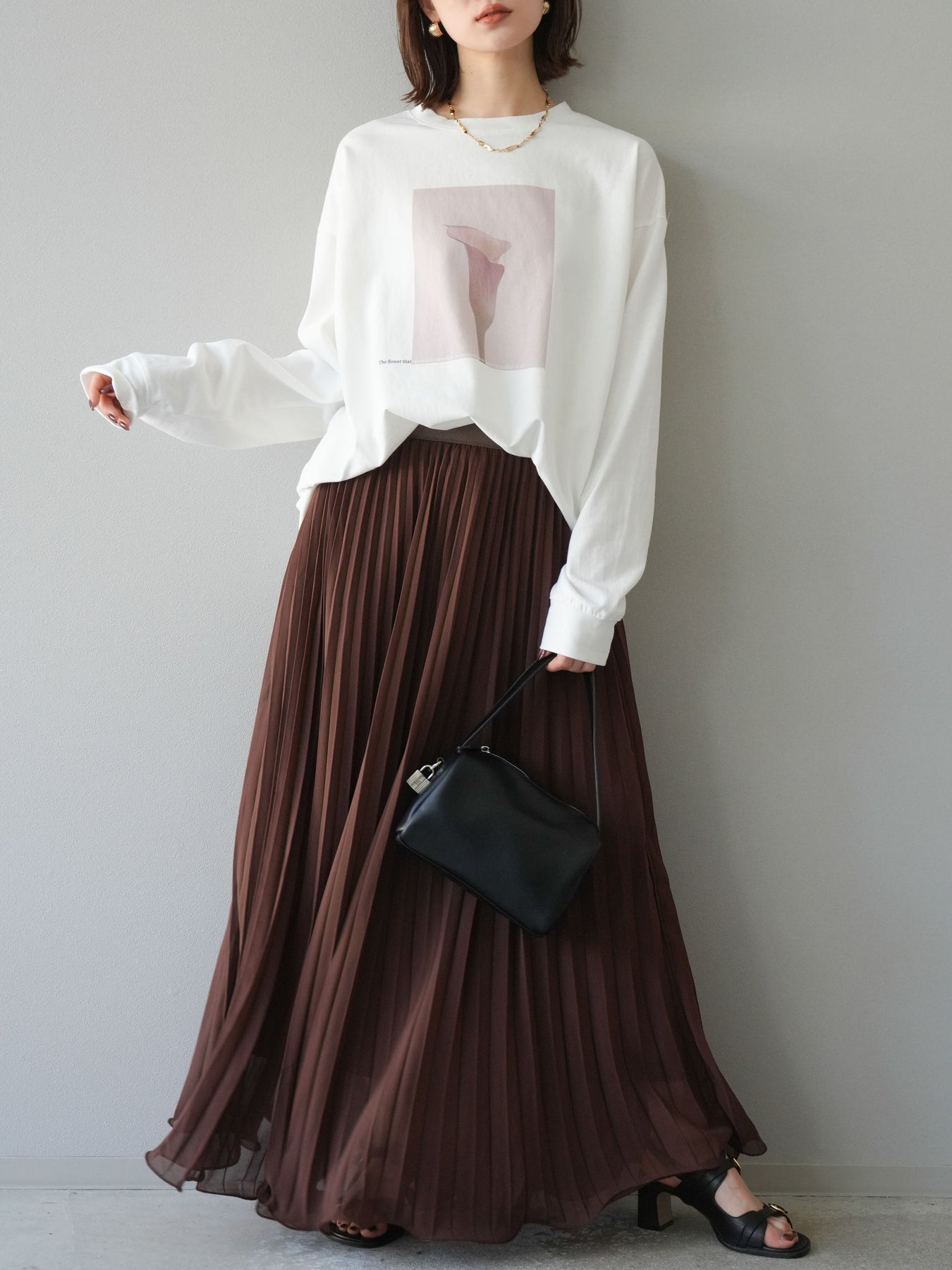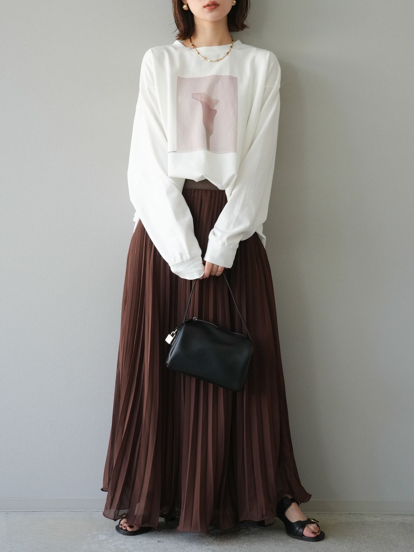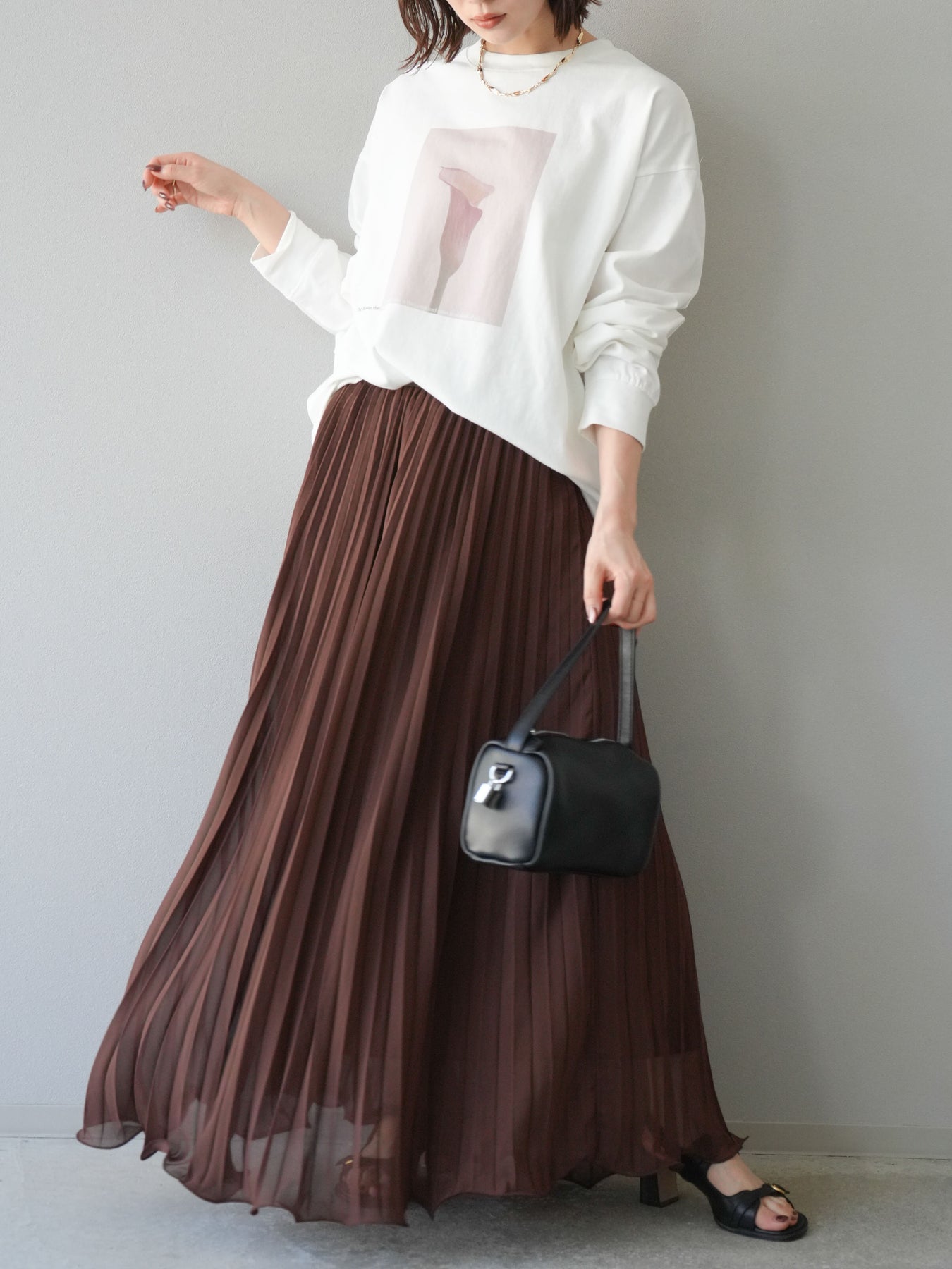 柔らかく透け感のあるシフォン素材を使用した、軽やかなロングプリーツスカート。 動くたびにふわりと広がるエアリーな揺れ感が、女性らしい印象を引き立てます。 裾のパイピングがさりげないアクセントになり、コーディネートに上品な華やかさをプラス。 ウエストはゴム仕様でストレスフリーな穿き心地も魅力の一枚です。