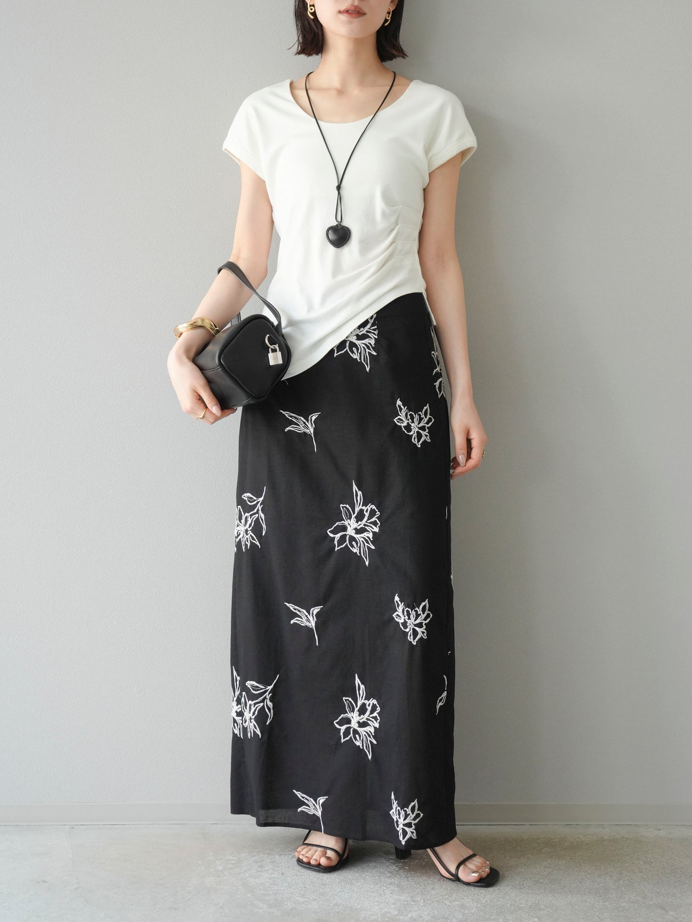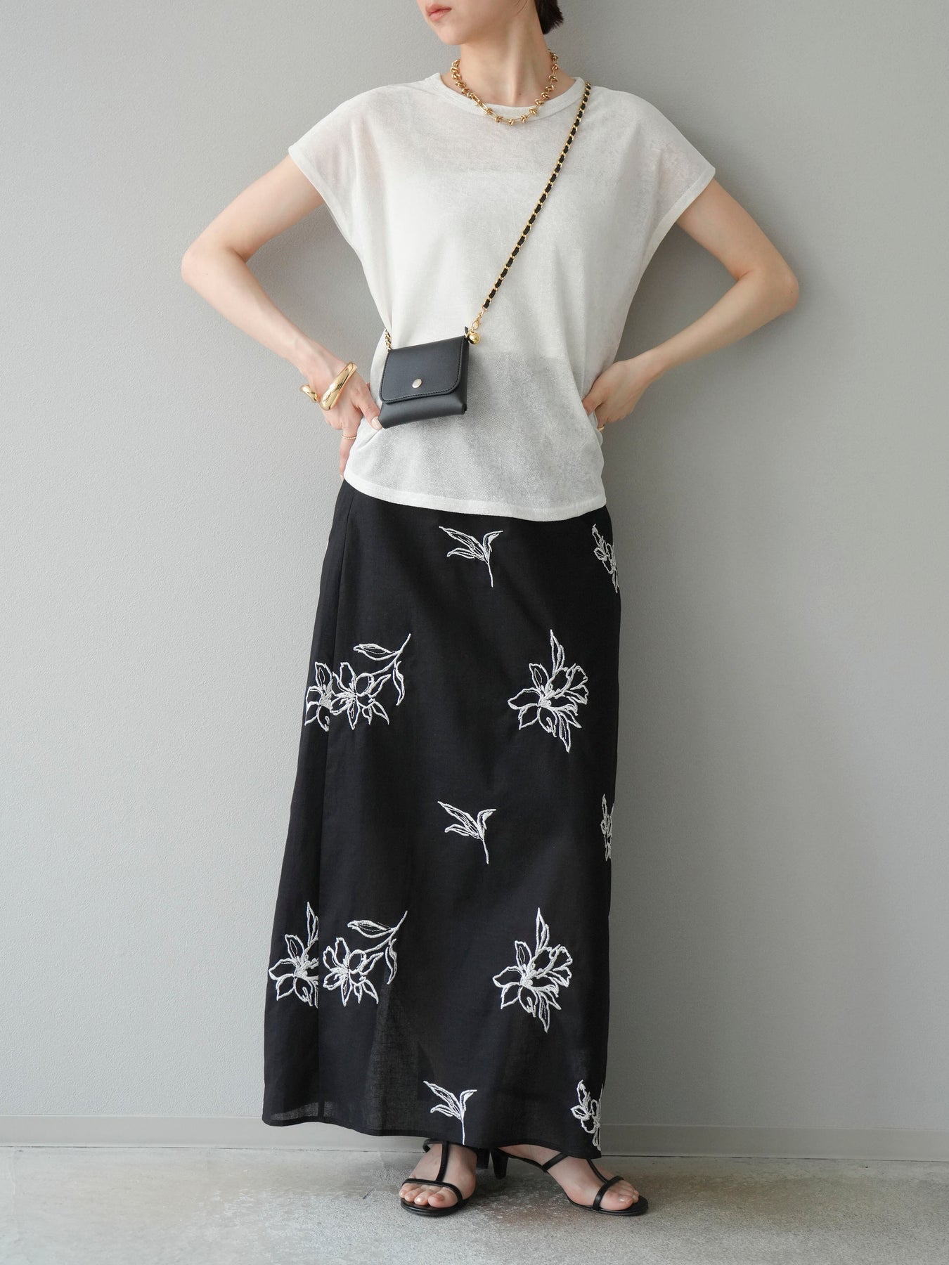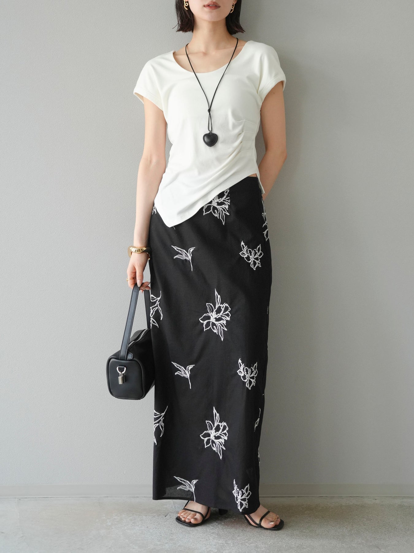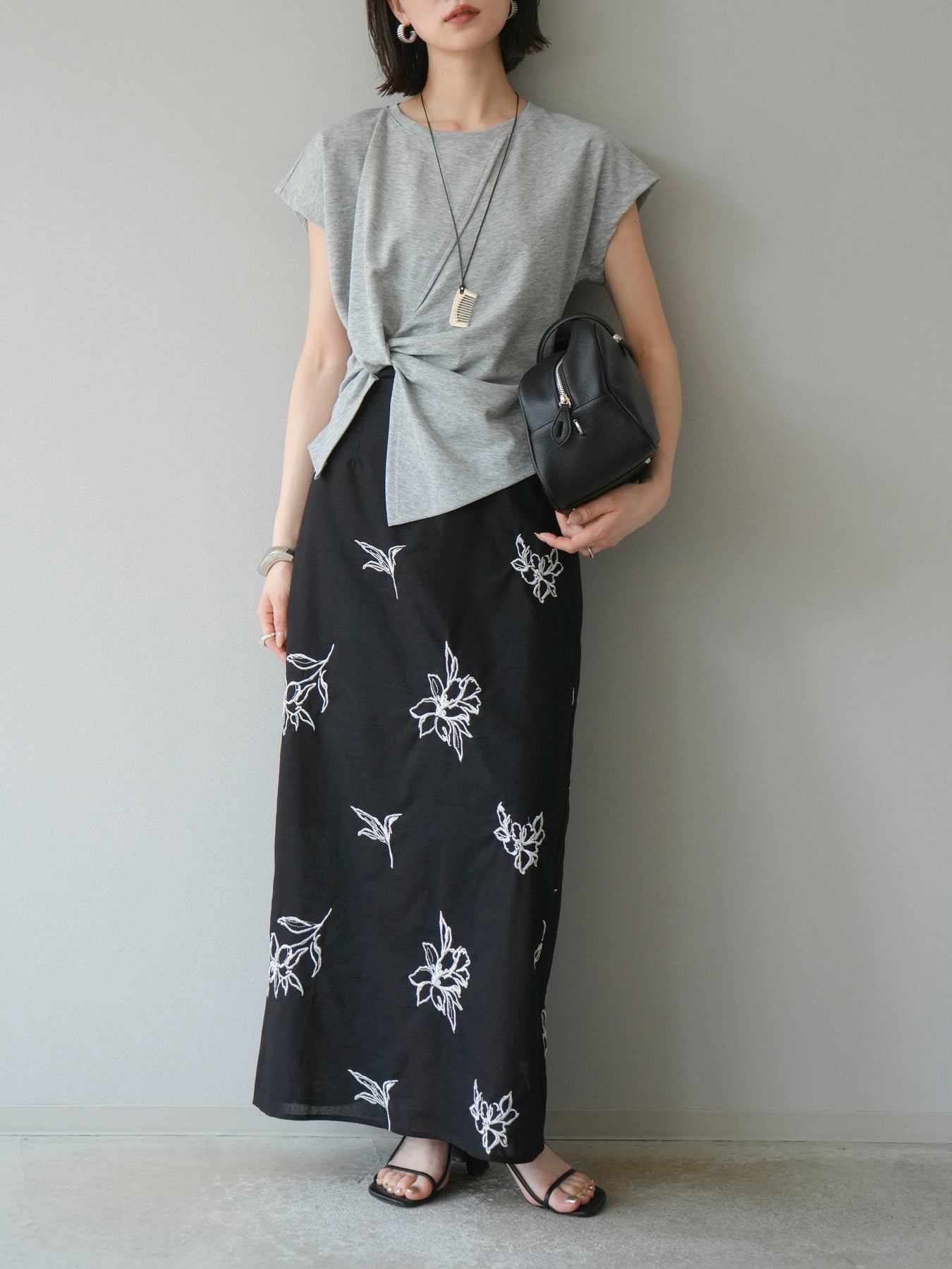 繊細なフラワー刺繍が目を惹く、上品な印象のナロースカート。程よく身体に沿うストレートシルエットで、すっきりとした美しいラインを演出します。落ち着いた色味の中に華やかさを添える刺繍が、大人フェミニンなスタイリングにぴったり。ウエストはゴム仕様で着心地も快適。Tシャツやブラウスと合わせてカジュアルにもきれいめにも着こなせる、着回し力抜群のアイテムです。春夏のコーディネートにアクセントを加えてくれる一着。