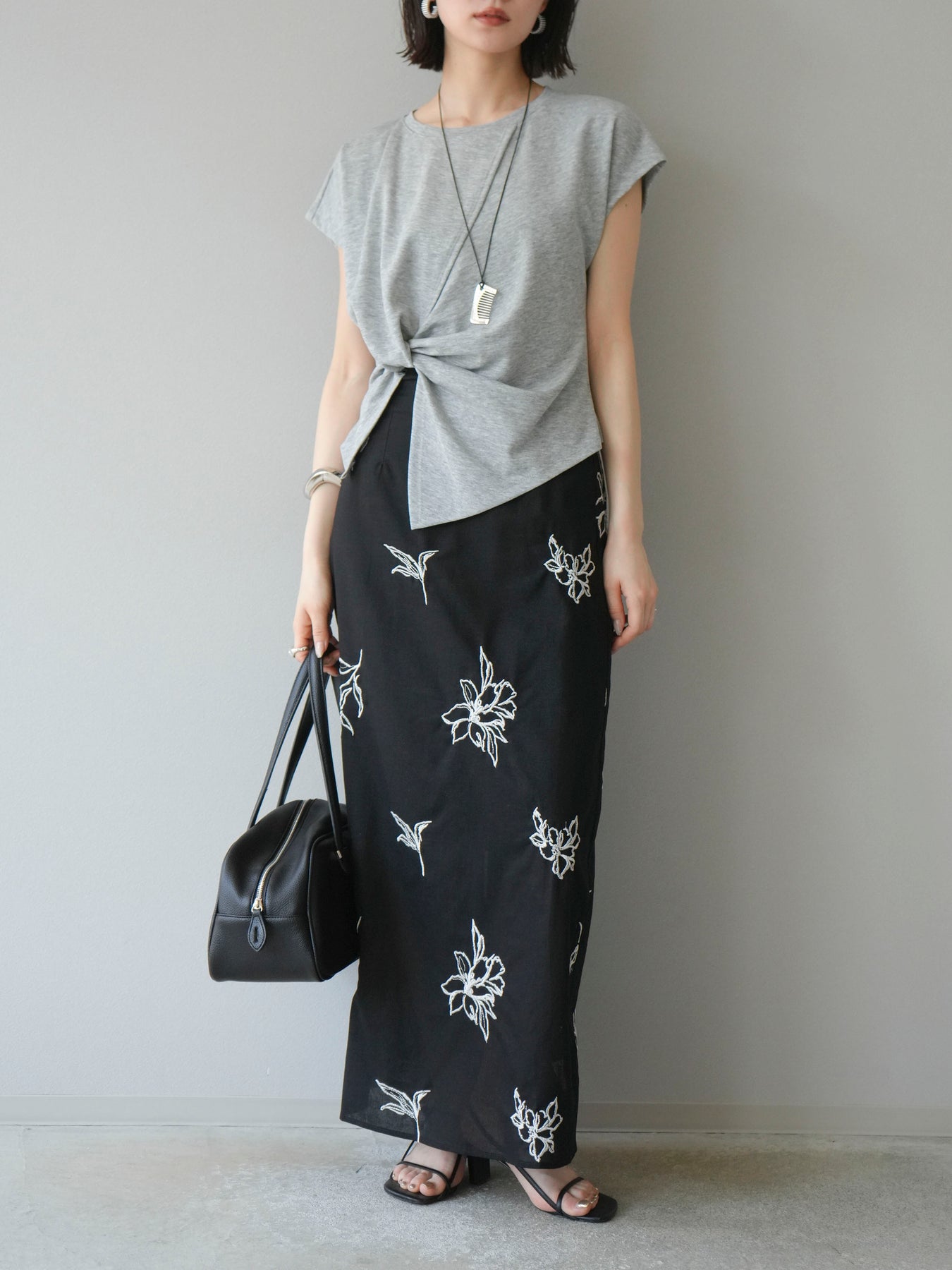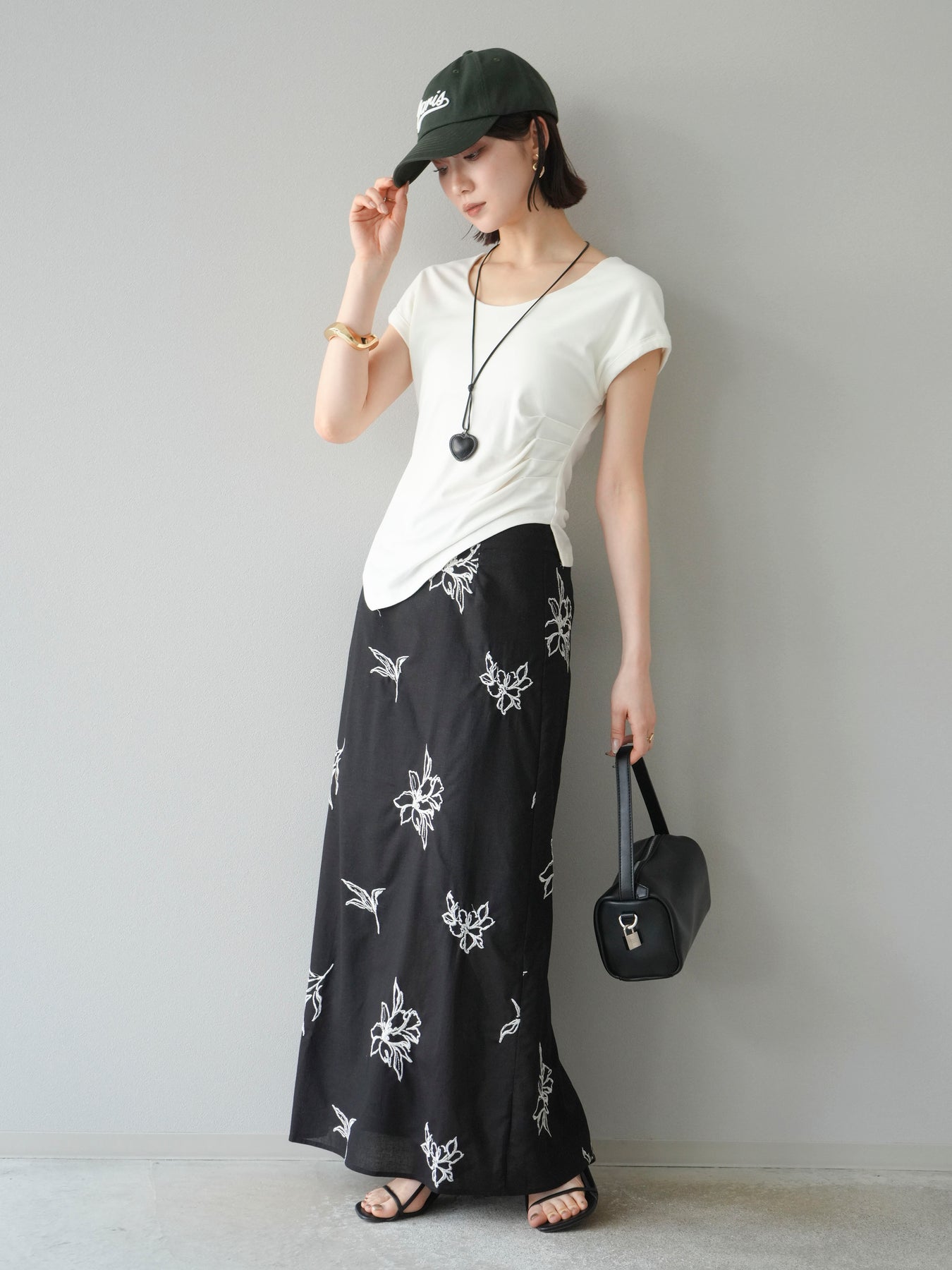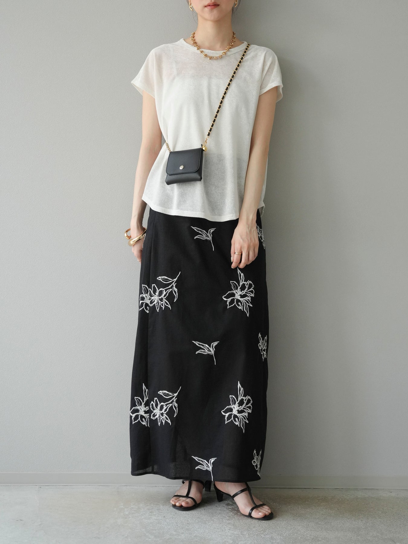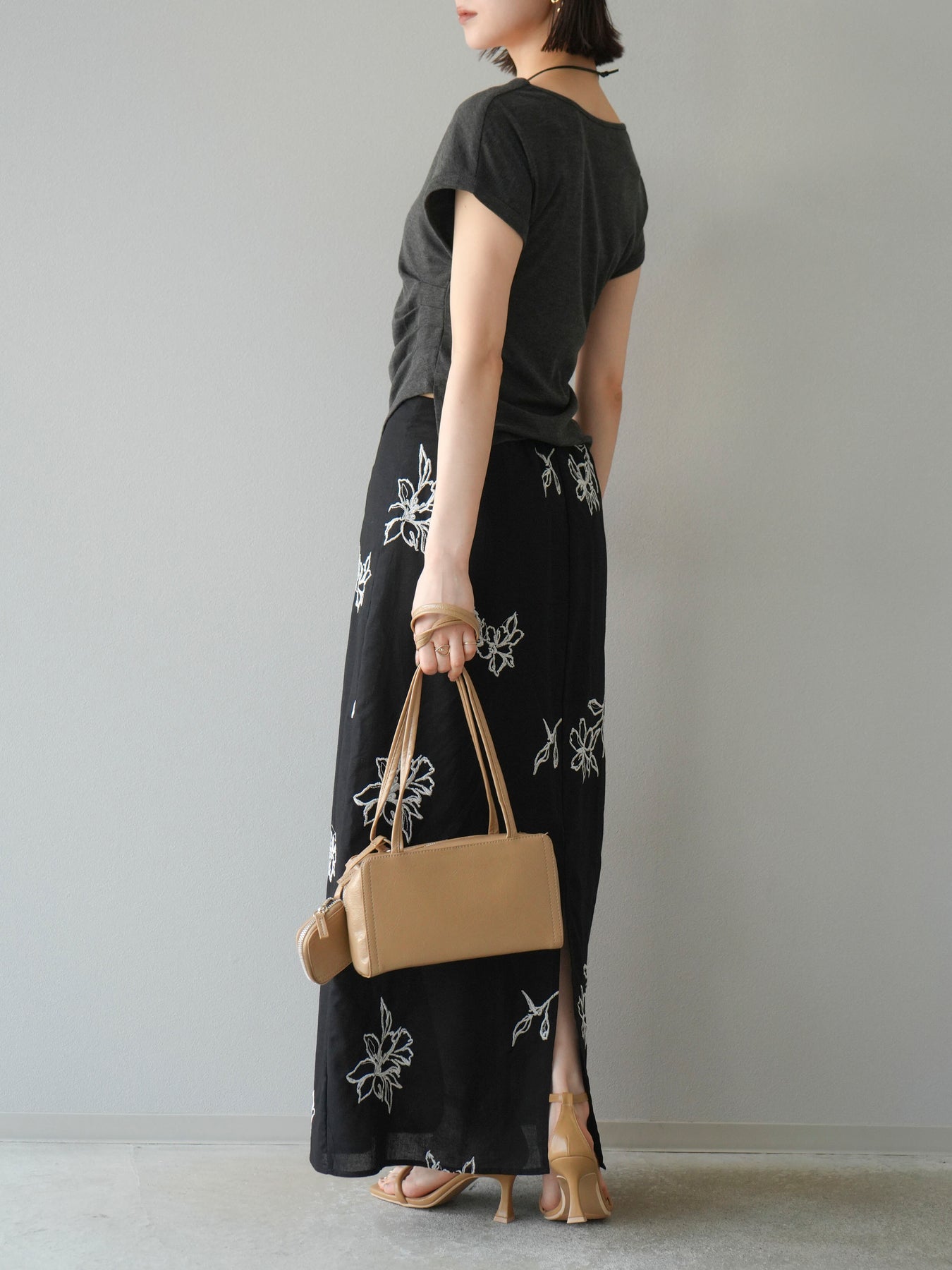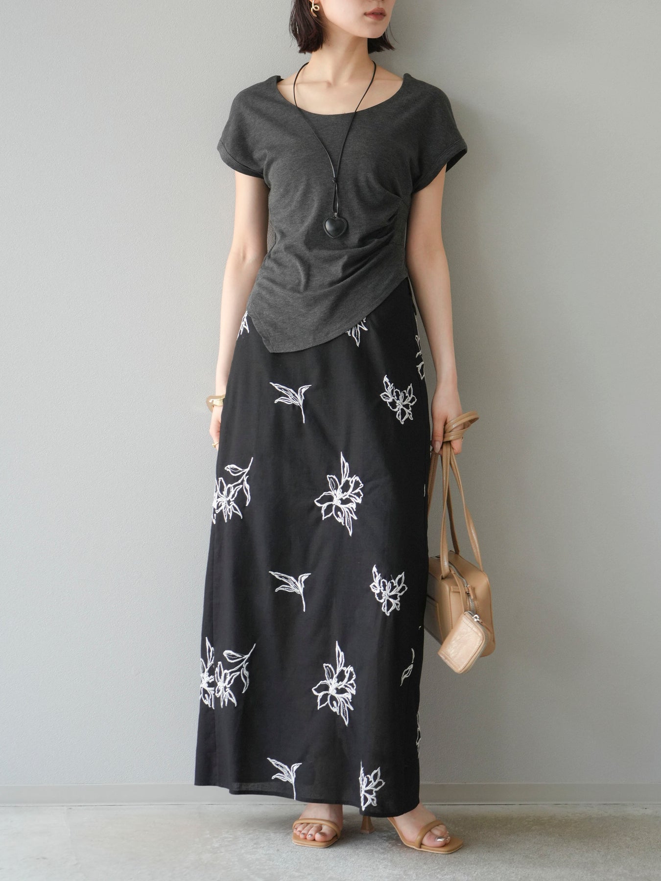 繊細なフラワー刺繍が目を惹く、上品な印象のナロースカート。程よく身体に沿うストレートシルエットで、すっきりとした美しいラインを演出します。落ち着いた色味の中に華やかさを添える刺繍が、大人フェミニンなスタイリングにぴったり。ウエストはゴム仕様で着心地も快適。Tシャツやブラウスと合わせてカジュアルにもきれいめにも着こなせる、着回し力抜群のアイテムです。春夏のコーディネートにアクセントを加えてくれる一着。