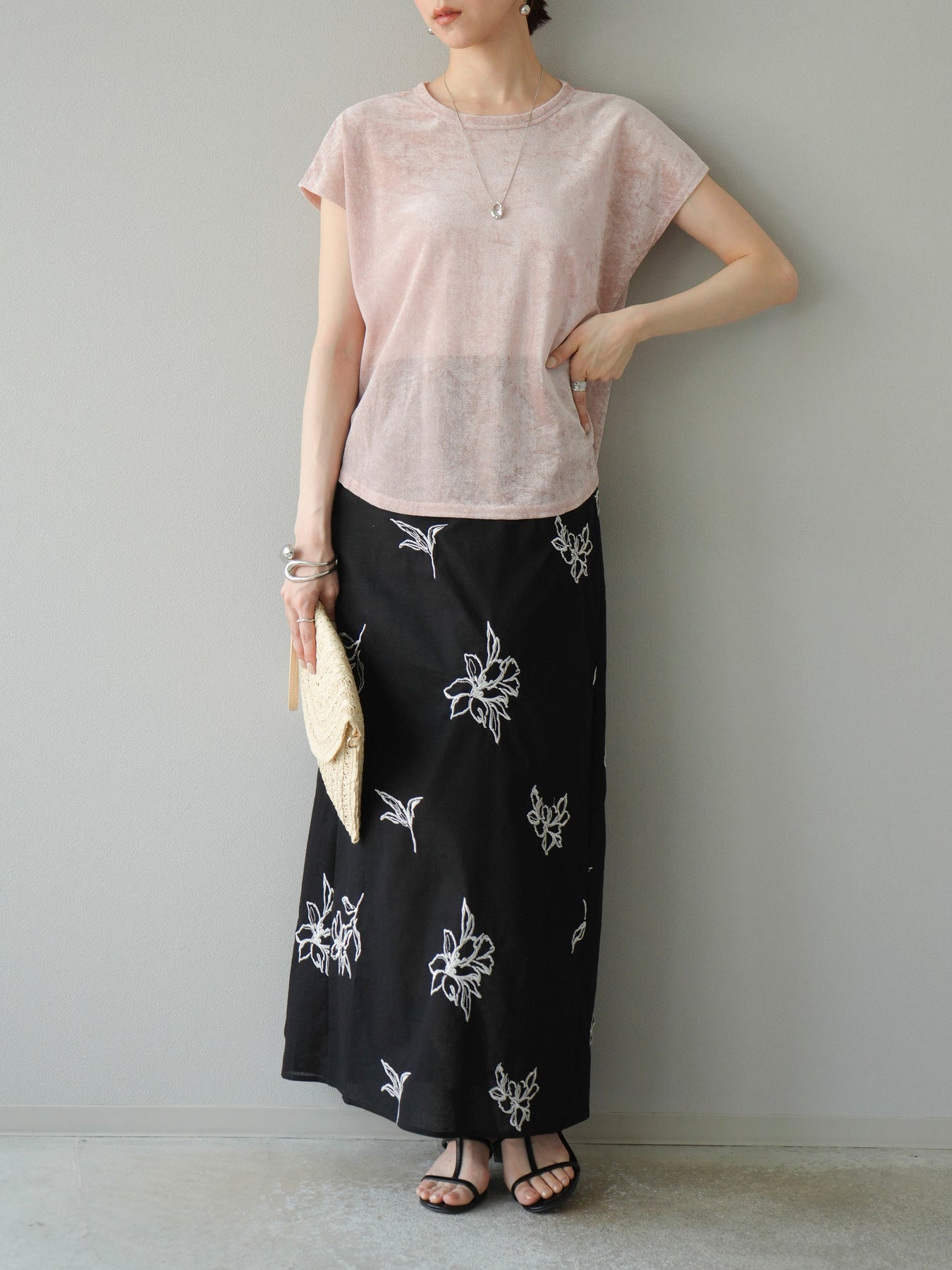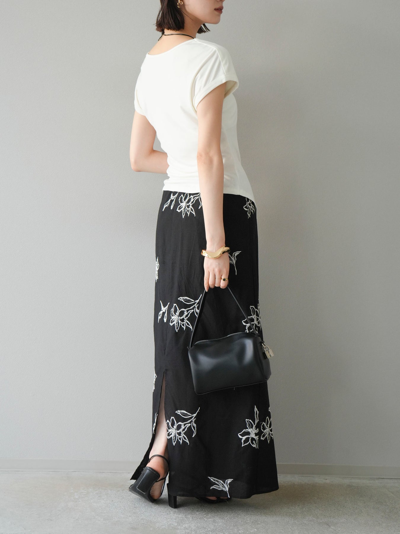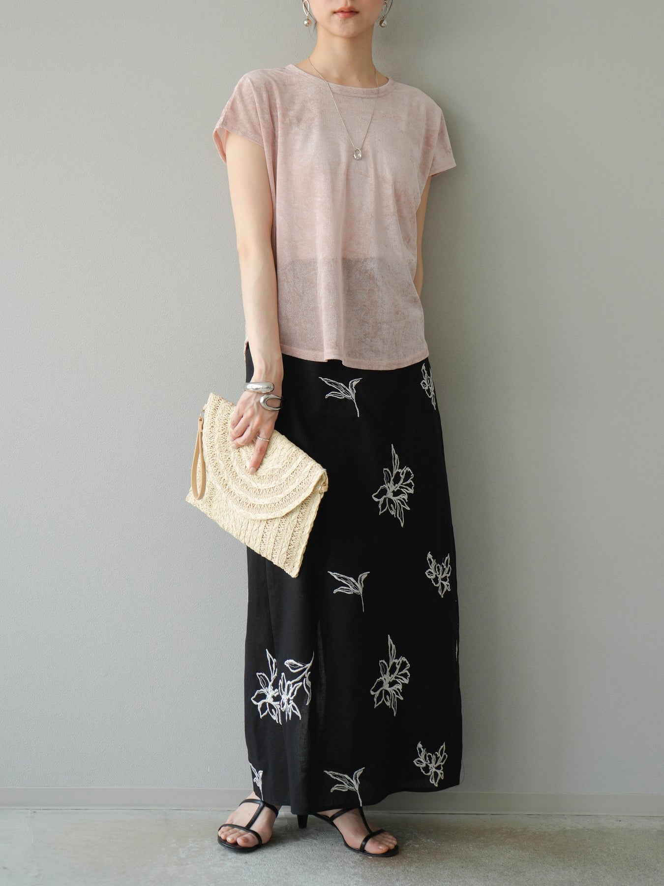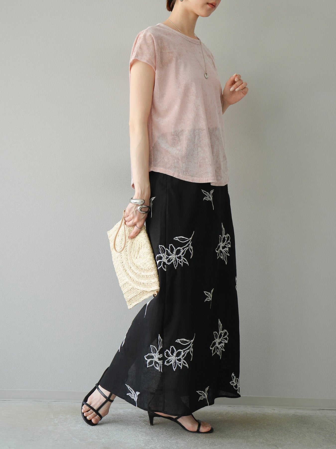 繊細なフラワー刺繍が目を惹く、上品な印象のナロースカート。程よく身体に沿うストレートシルエットで、すっきりとした美しいラインを演出します。落ち着いた色味の中に華やかさを添える刺繍が、大人フェミニンなスタイリングにぴったり。ウエストはゴム仕様で着心地も快適。Tシャツやブラウスと合わせてカジュアルにもきれいめにも着こなせる、着回し力抜群のアイテムです。春夏のコーディネートにアクセントを加えてくれる一着。