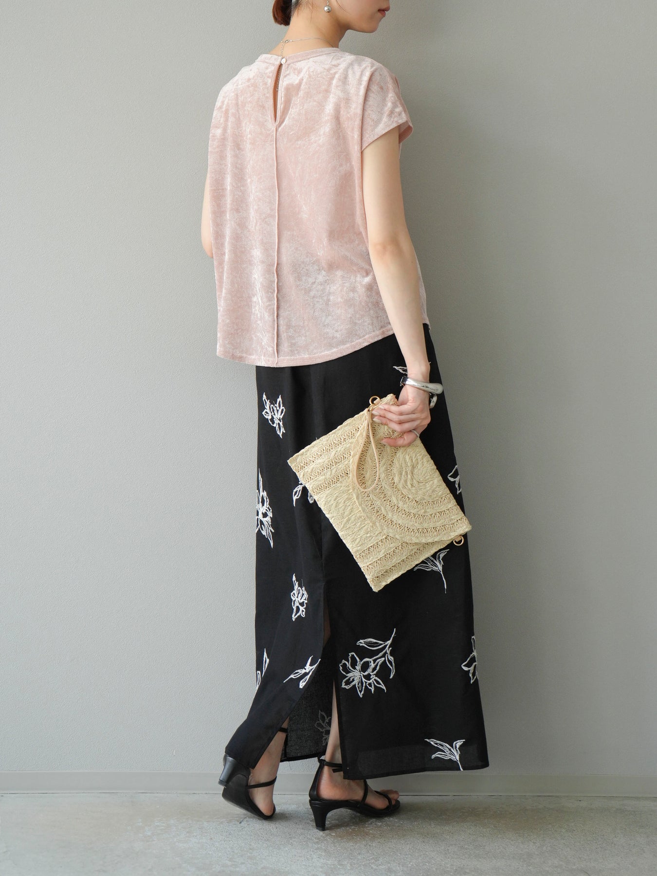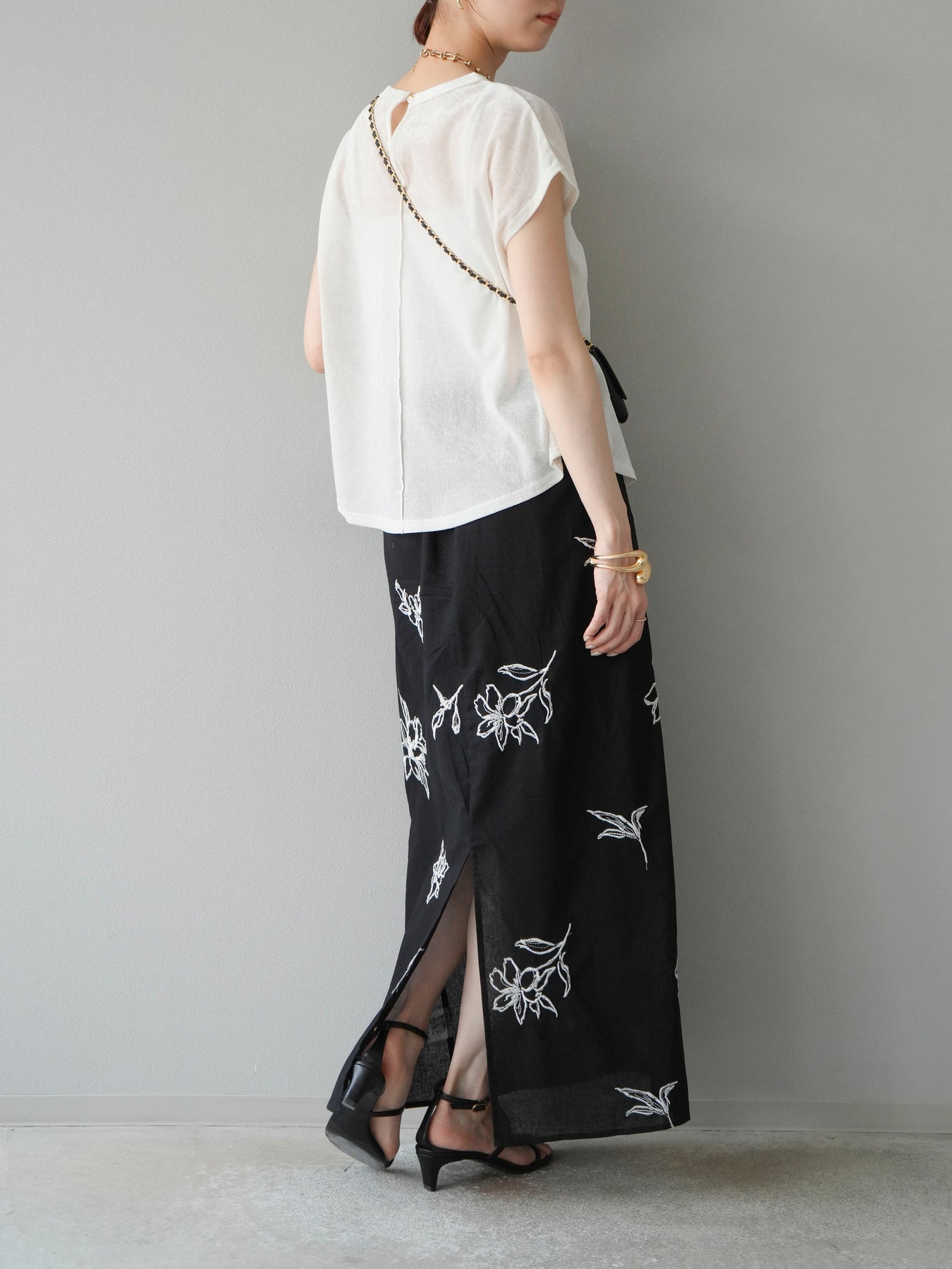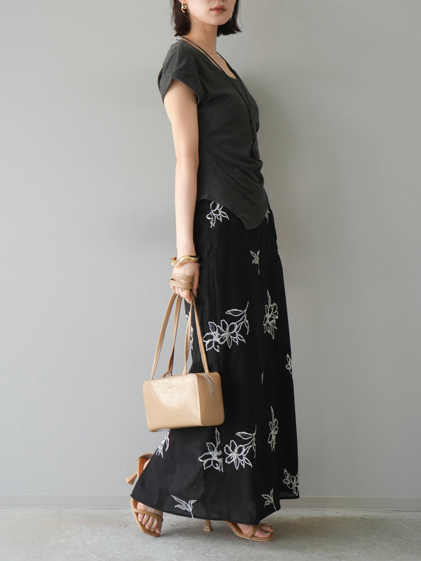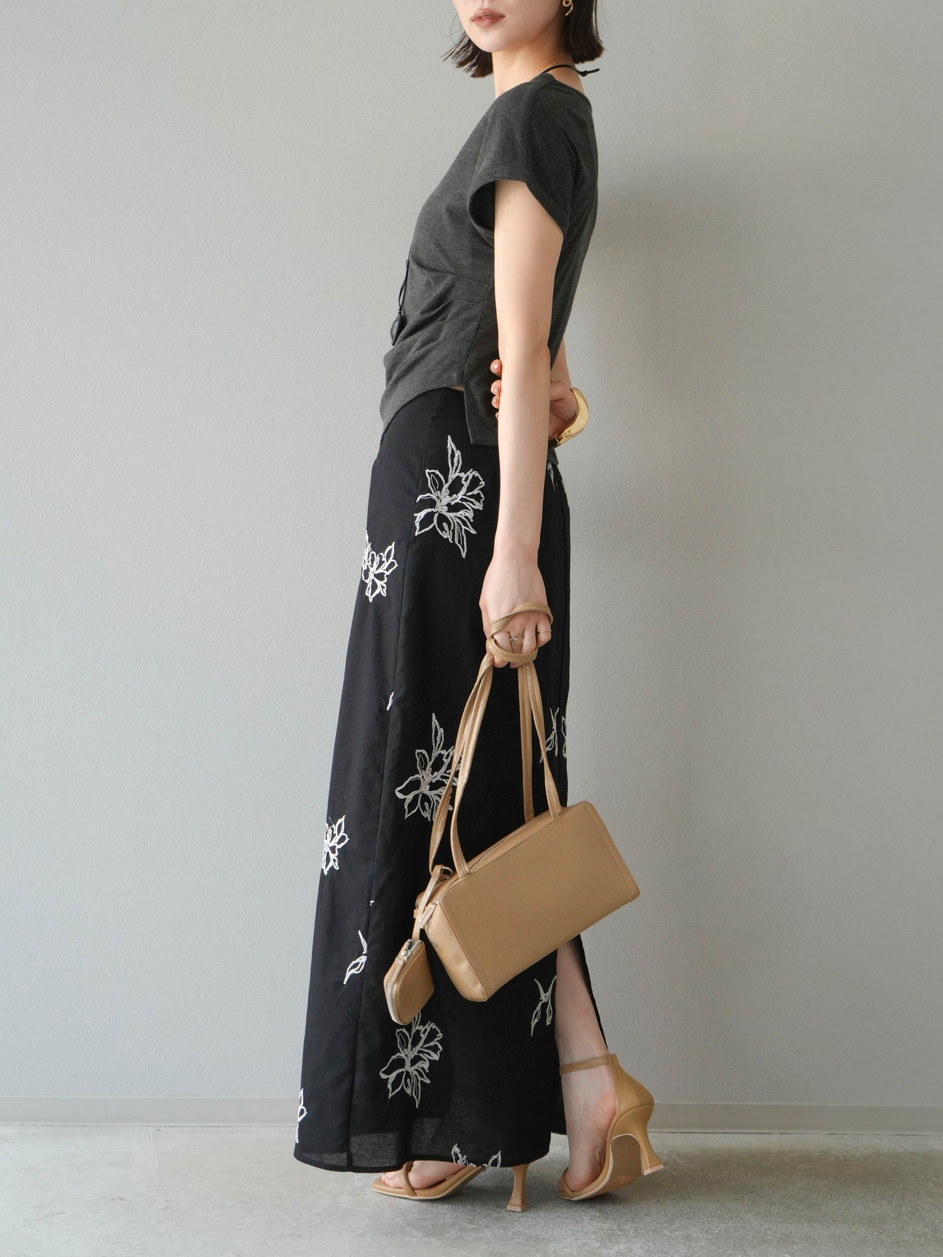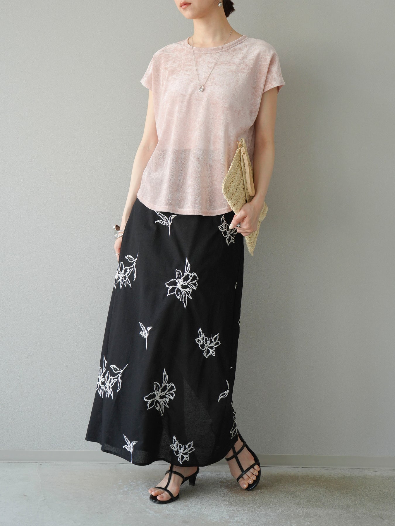 繊細なフラワー刺繍が目を惹く、上品な印象のナロースカート。程よく身体に沿うストレートシルエットで、すっきりとした美しいラインを演出します。落ち着いた色味の中に華やかさを添える刺繍が、大人フェミニンなスタイリングにぴったり。ウエストはゴム仕様で着心地も快適。Tシャツやブラウスと合わせてカジュアルにもきれいめにも着こなせる、着回し力抜群のアイテムです。春夏のコーディネートにアクセントを加えてくれる一着。