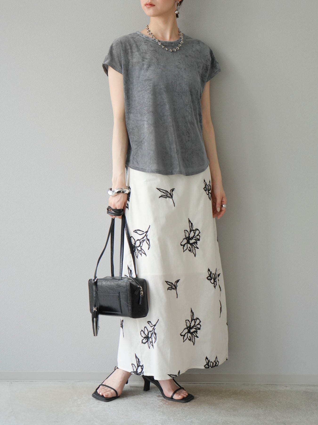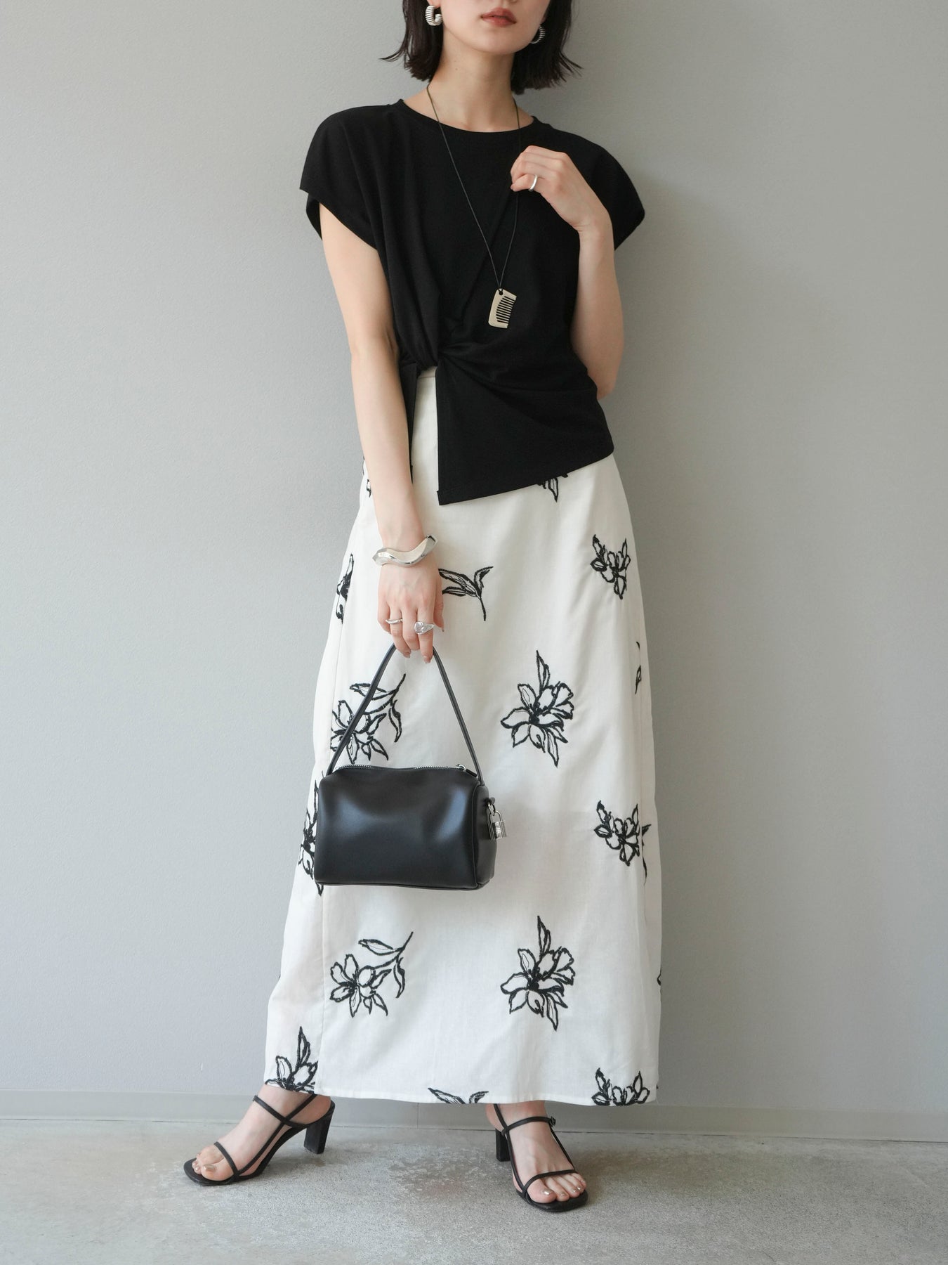 繊細なフラワー刺繍が目を惹く、上品な印象のナロースカート。程よく身体に沿うストレートシルエットで、すっきりとした美しいラインを演出します。落ち着いた色味の中に華やかさを添える刺繍が、大人フェミニンなスタイリングにぴったり。ウエストはゴム仕様で着心地も快適。Tシャツやブラウスと合わせてカジュアルにもきれいめにも着こなせる、着回し力抜群のアイテムです。春夏のコーディネートにアクセントを加えてくれる一着。