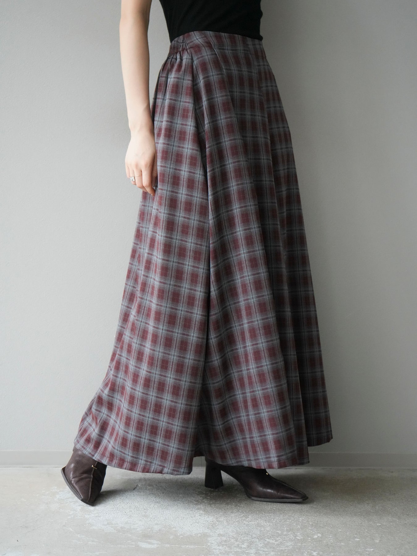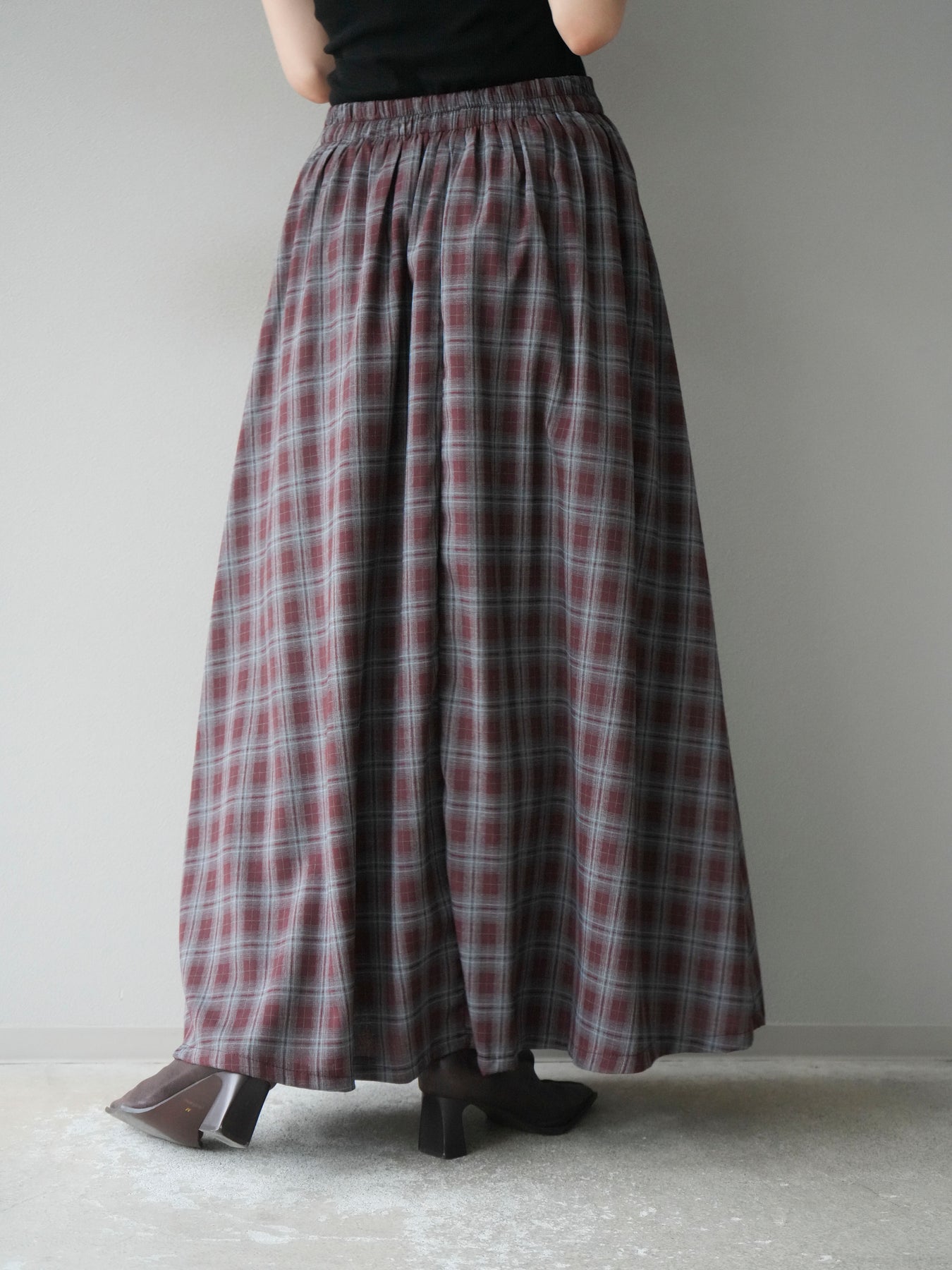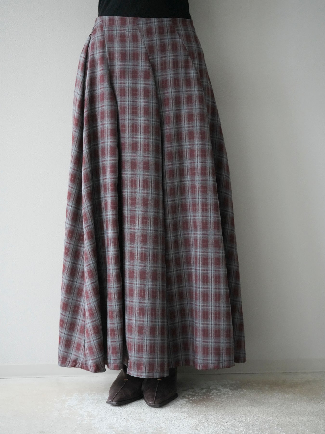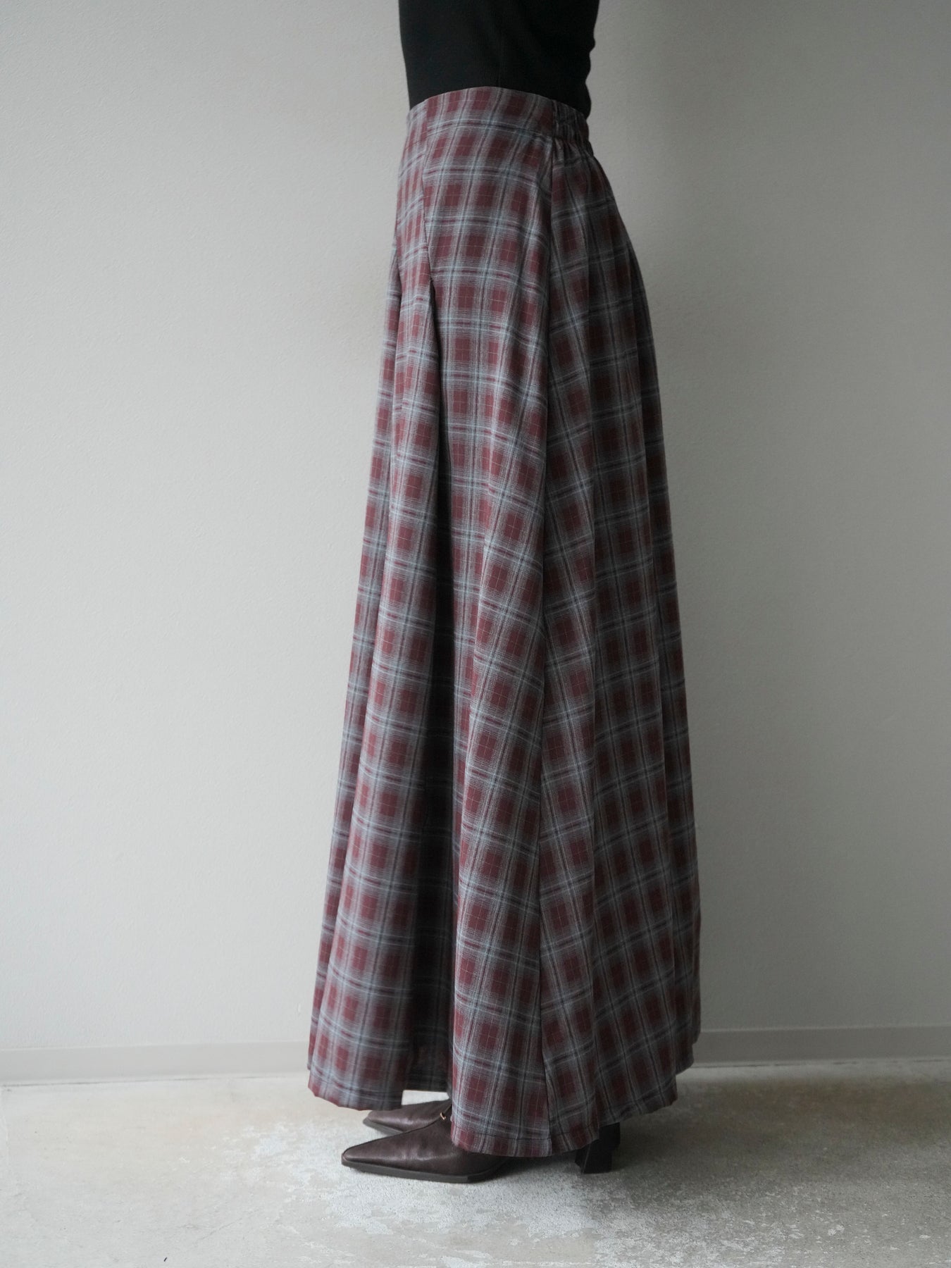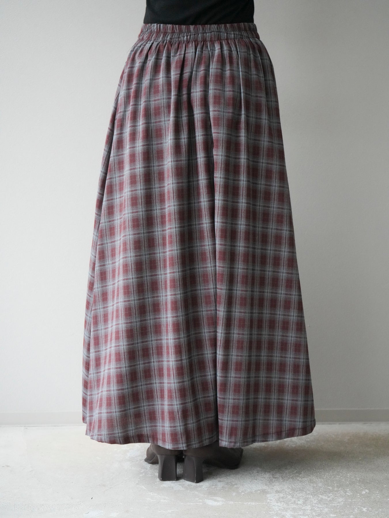 [予約]チェックタックフレアロングスカート/ ボルドー