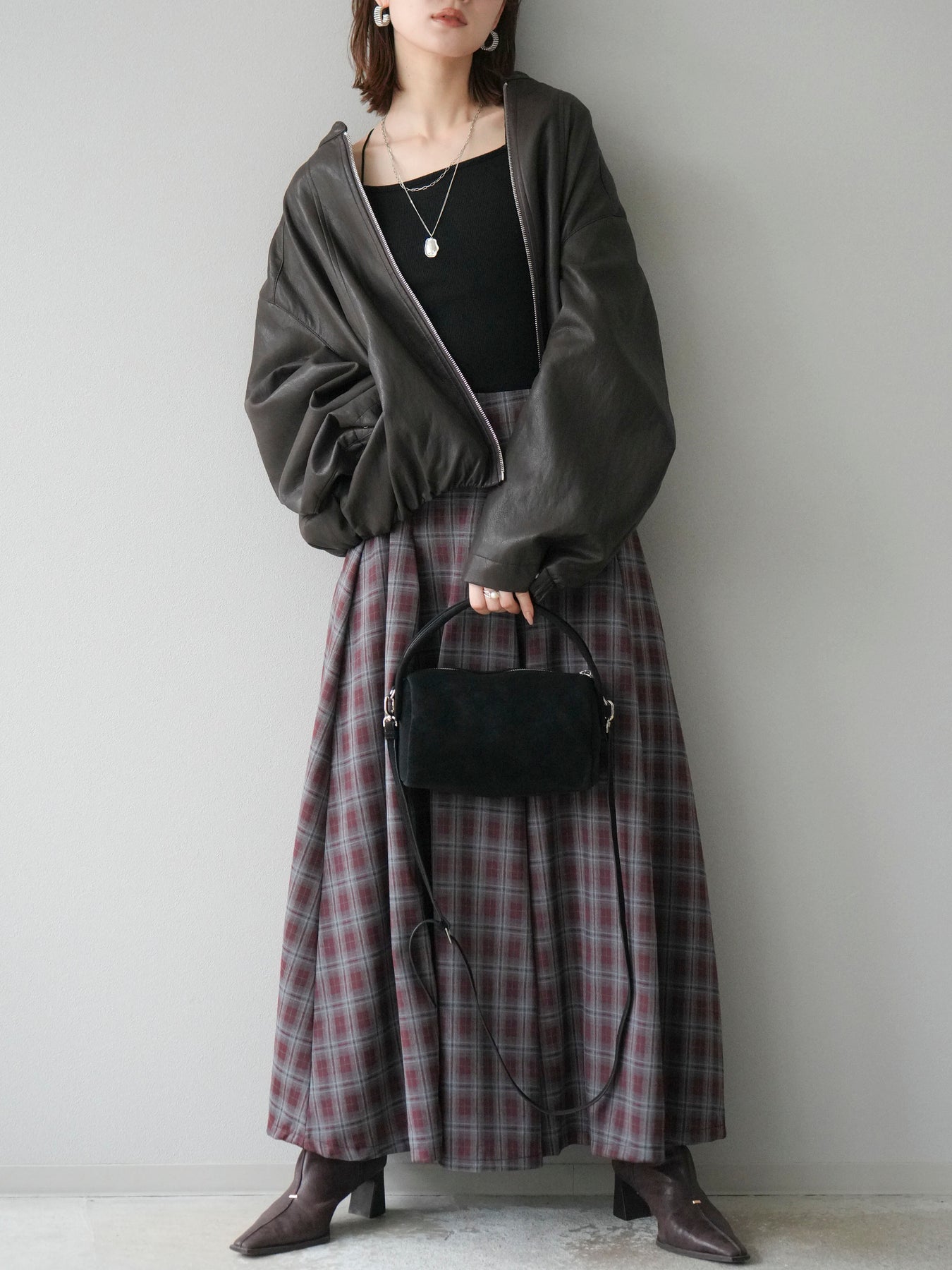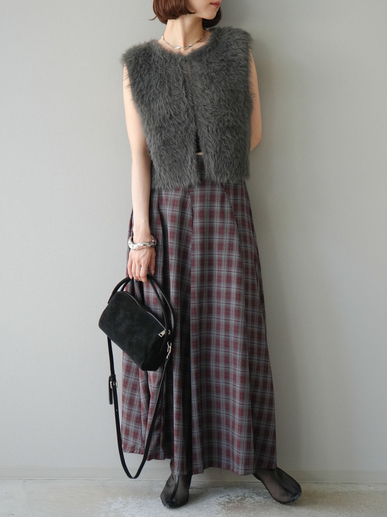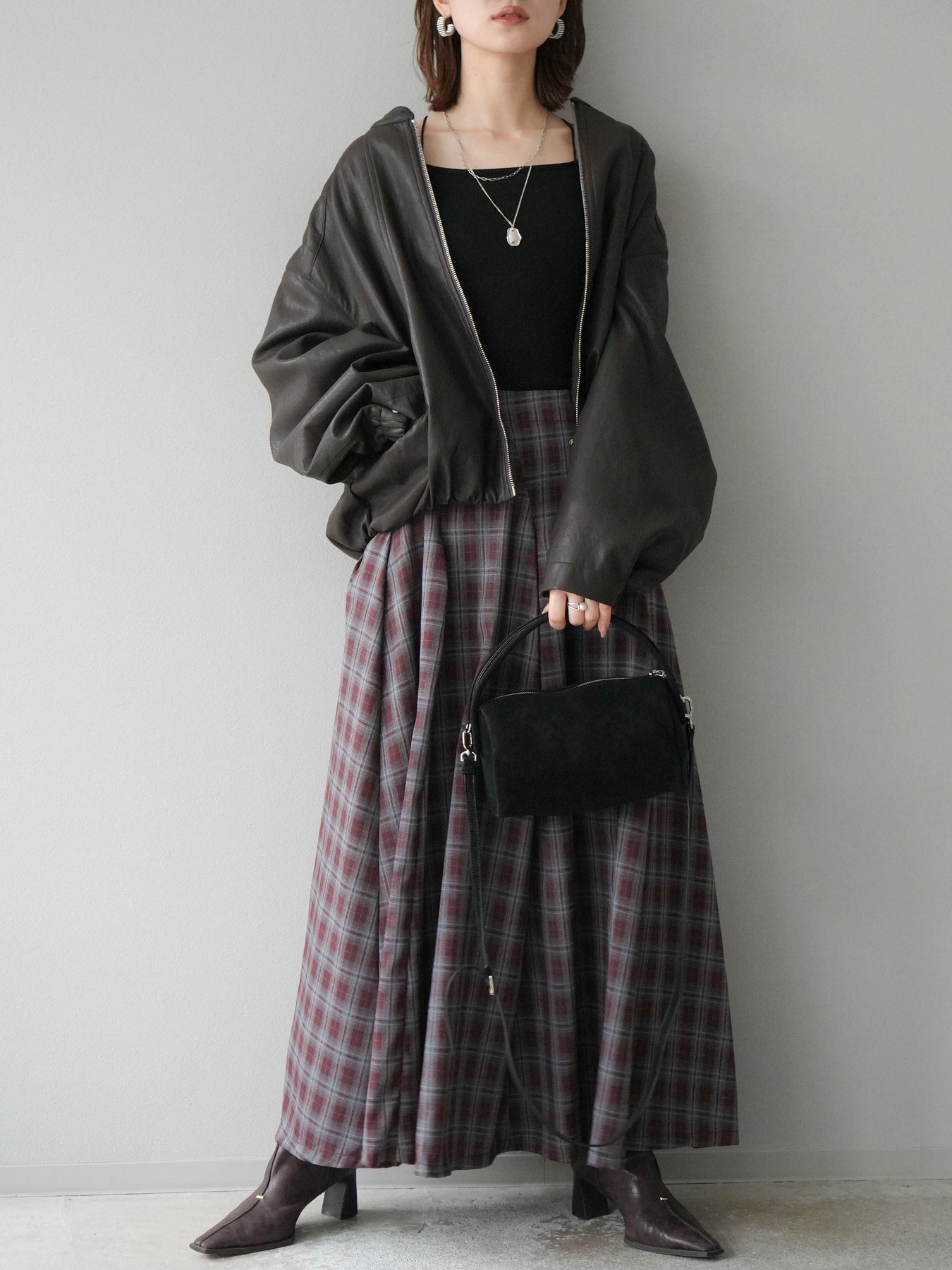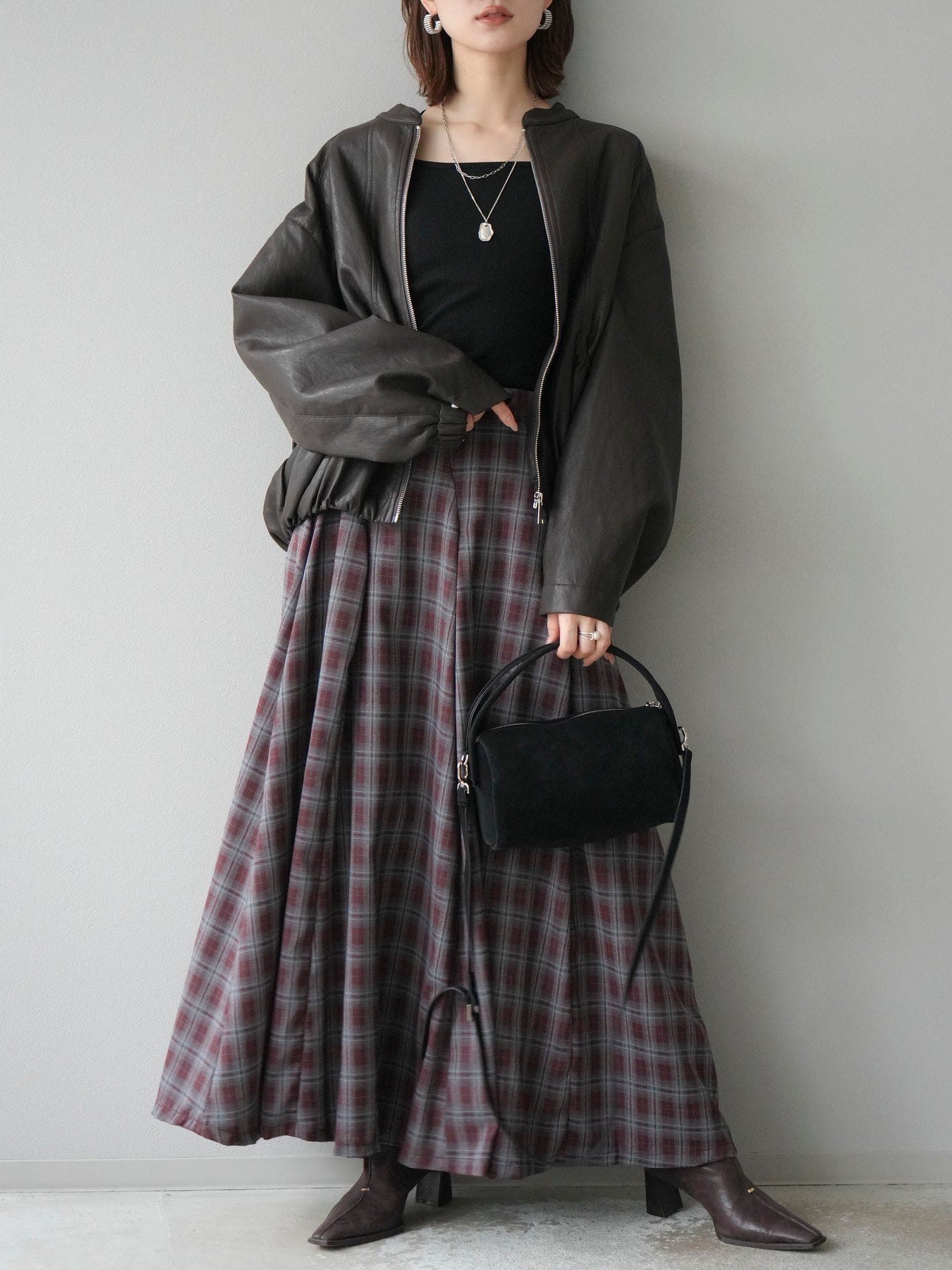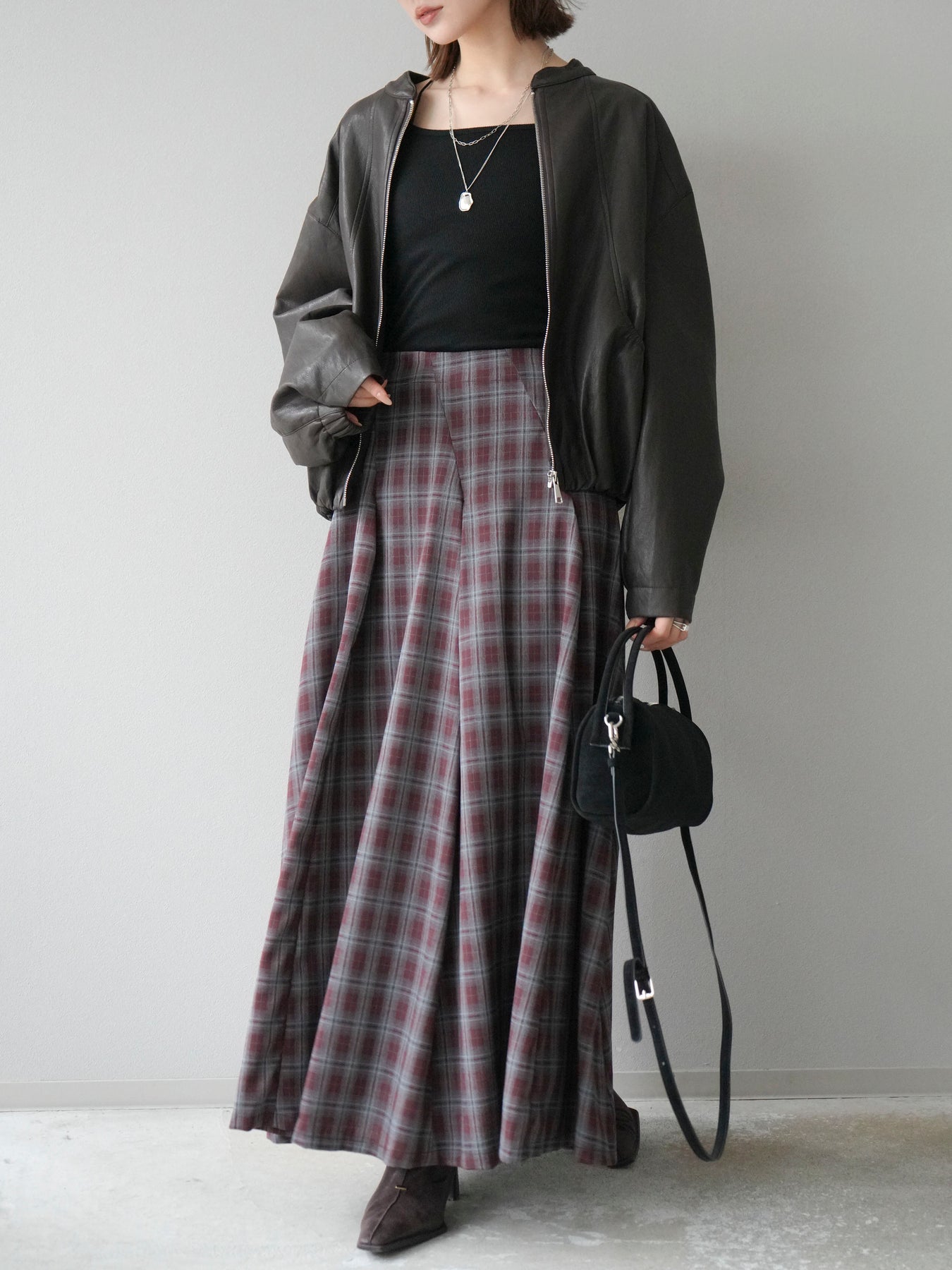 [予約]チェックタックフレアロングスカート/ ボルドー
