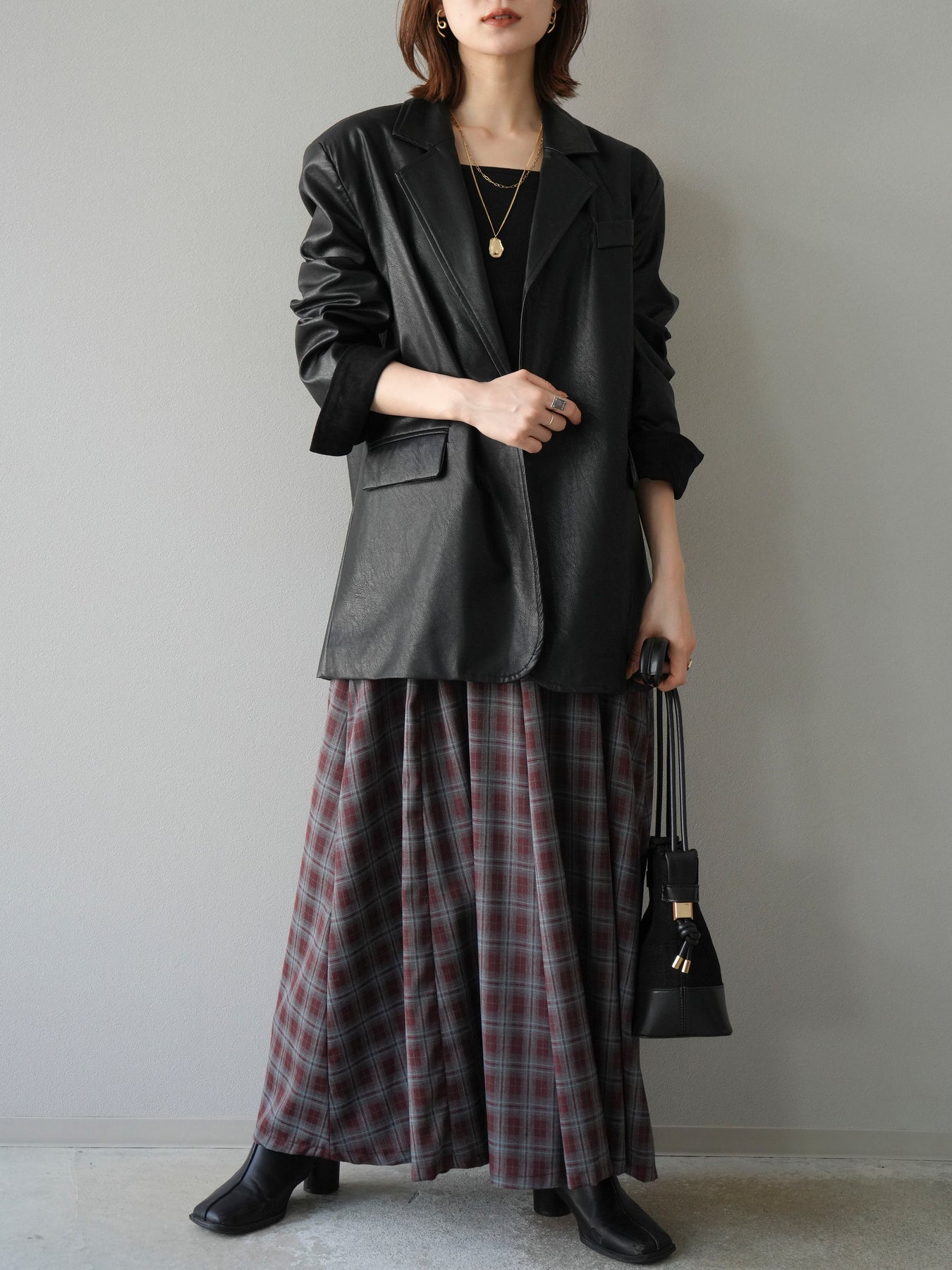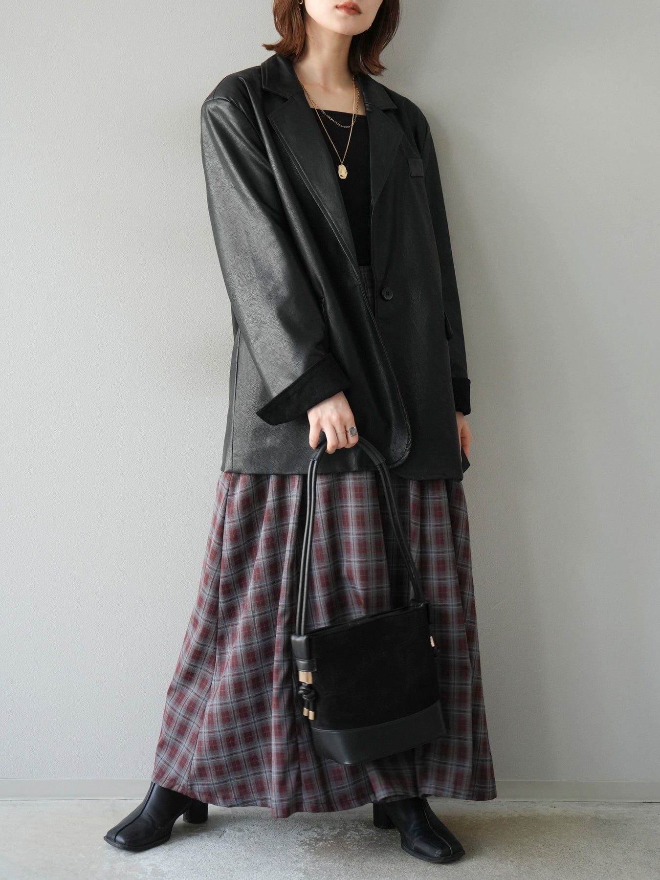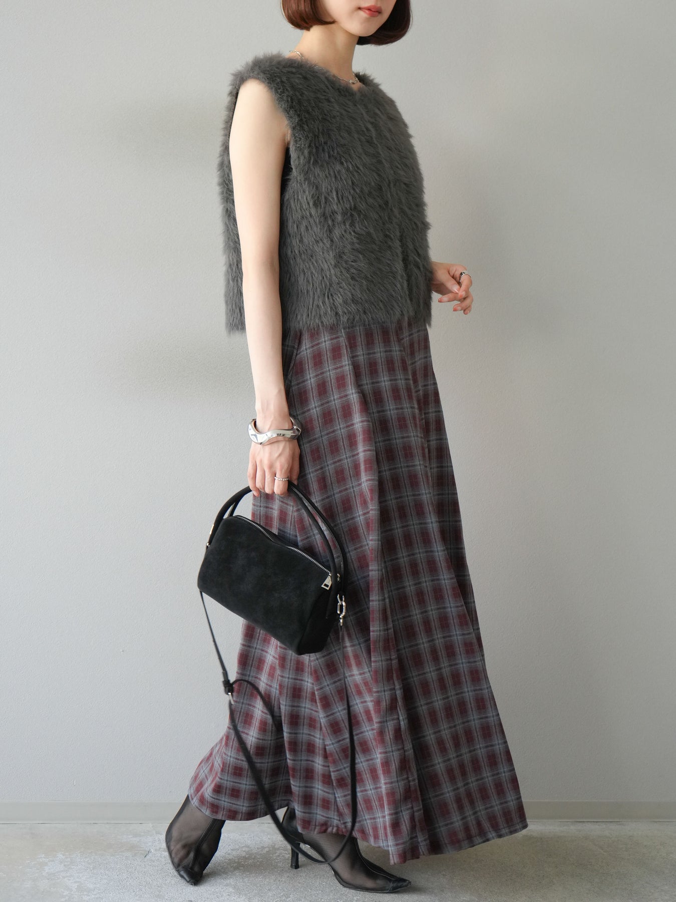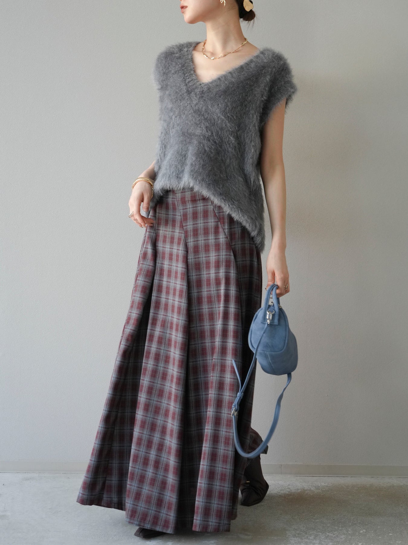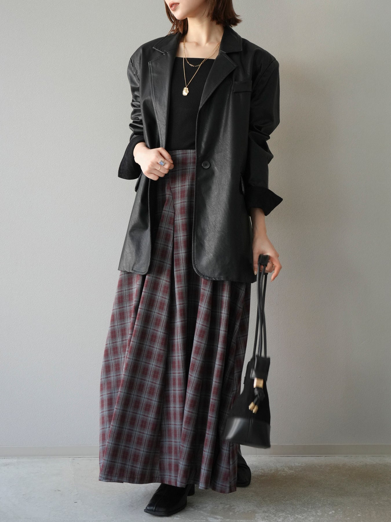 [予約]チェックタックフレアロングスカート/ ボルドー