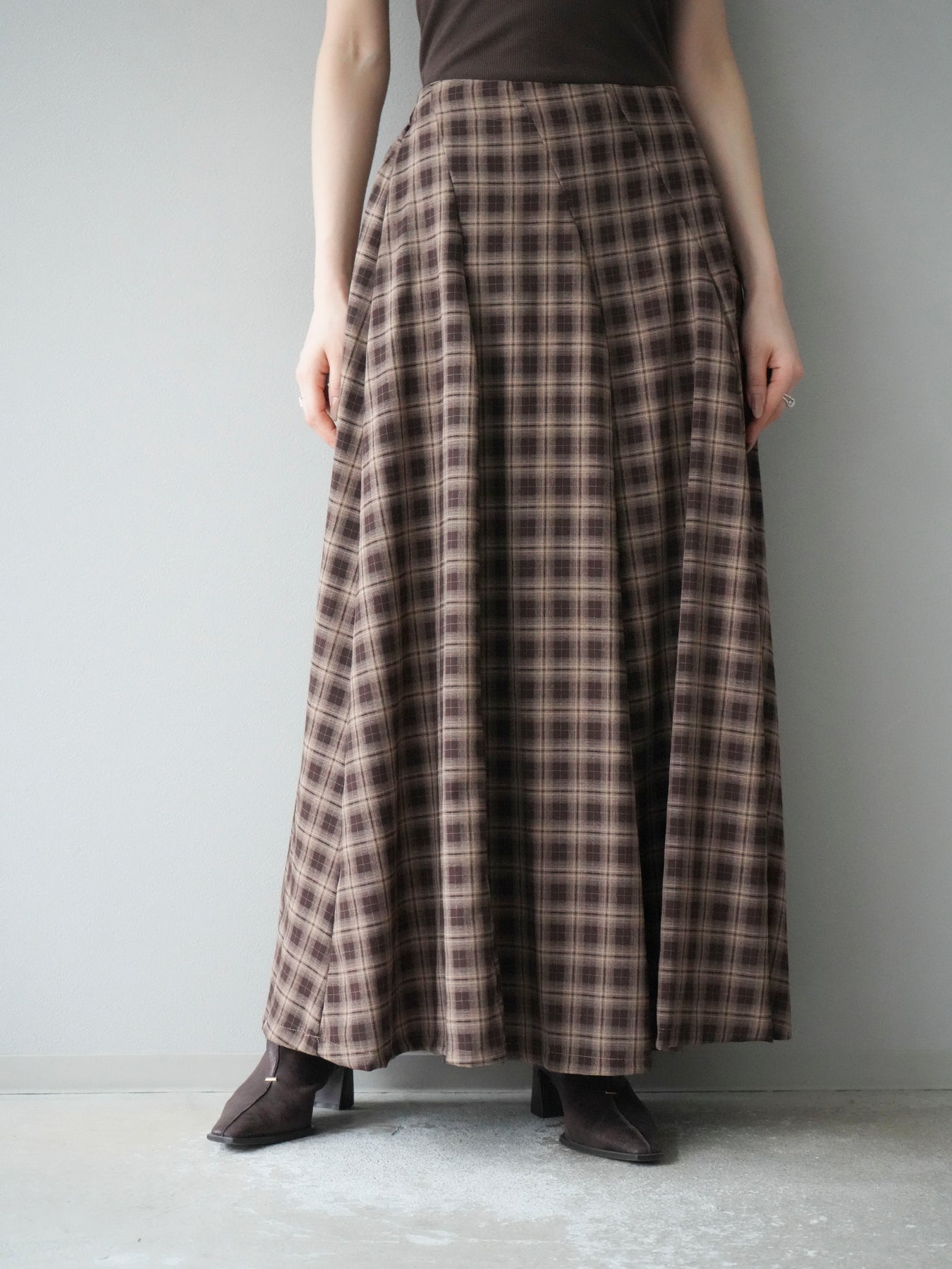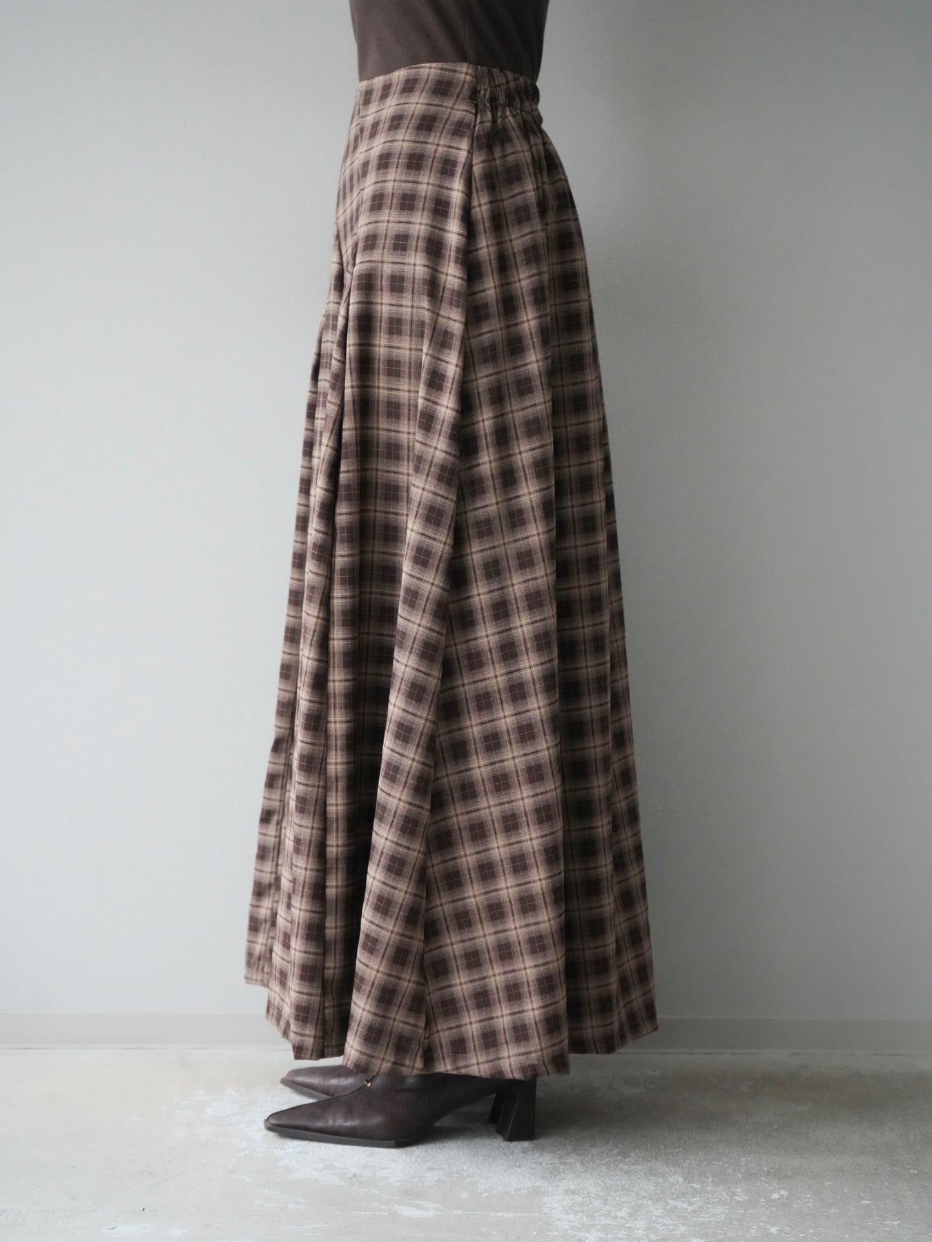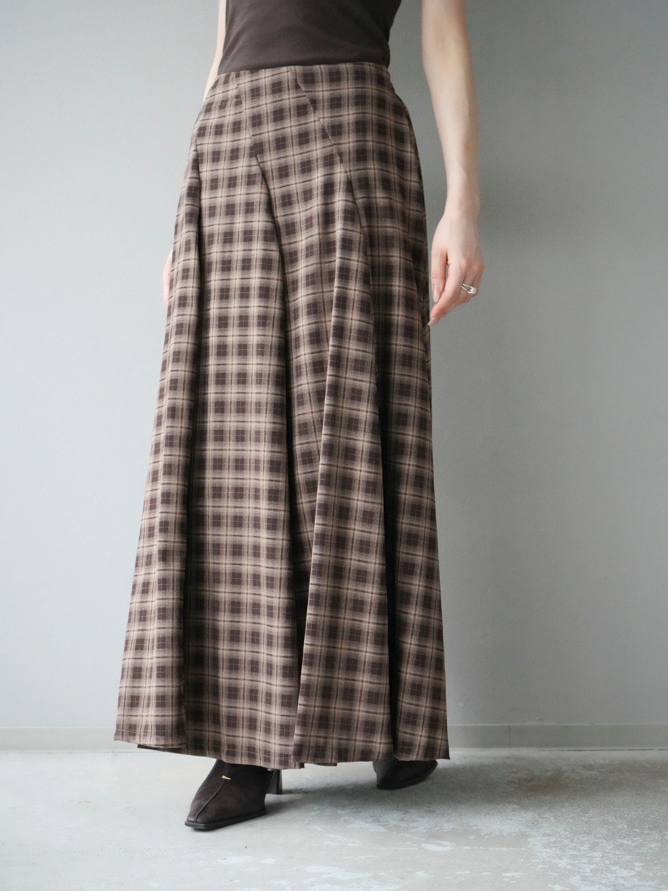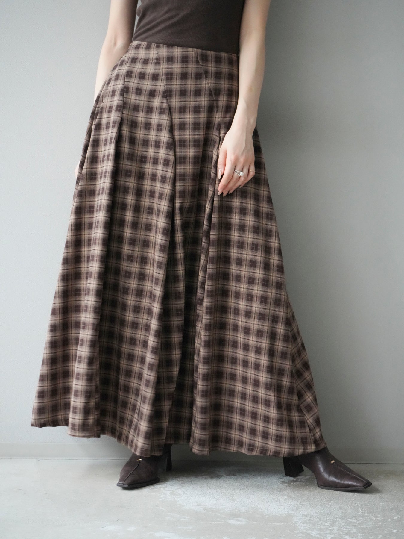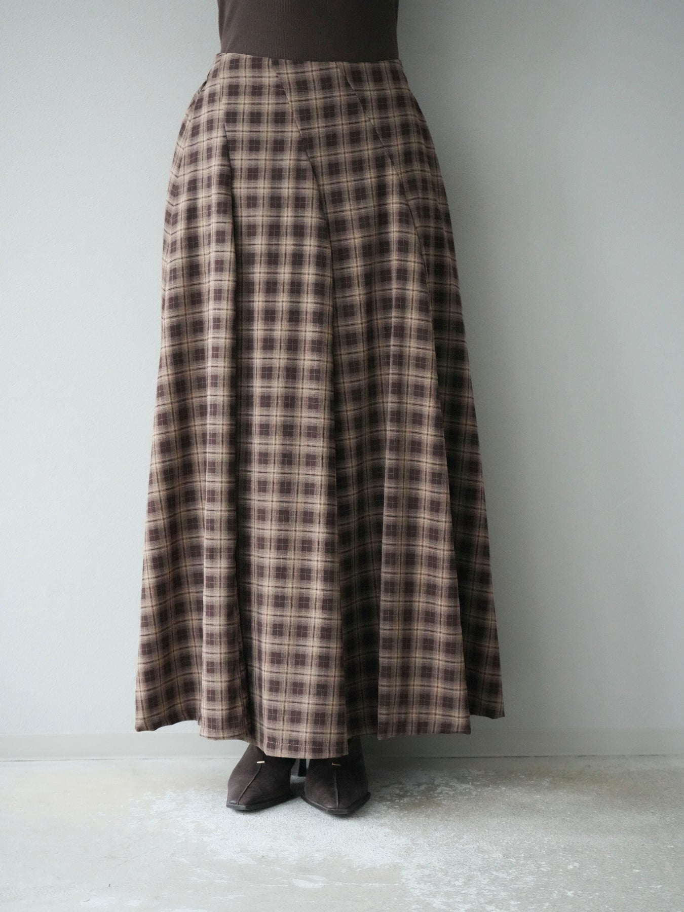 [予約]チェックタックフレアロングスカート/ ブラウン