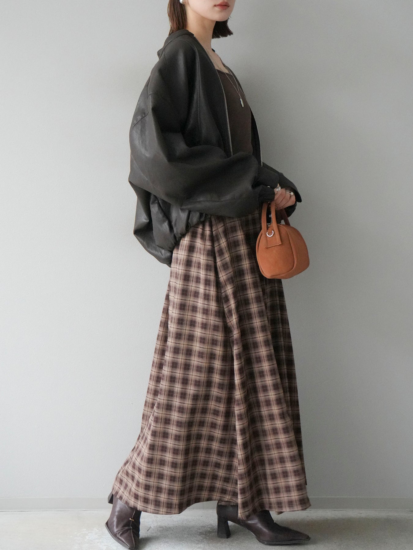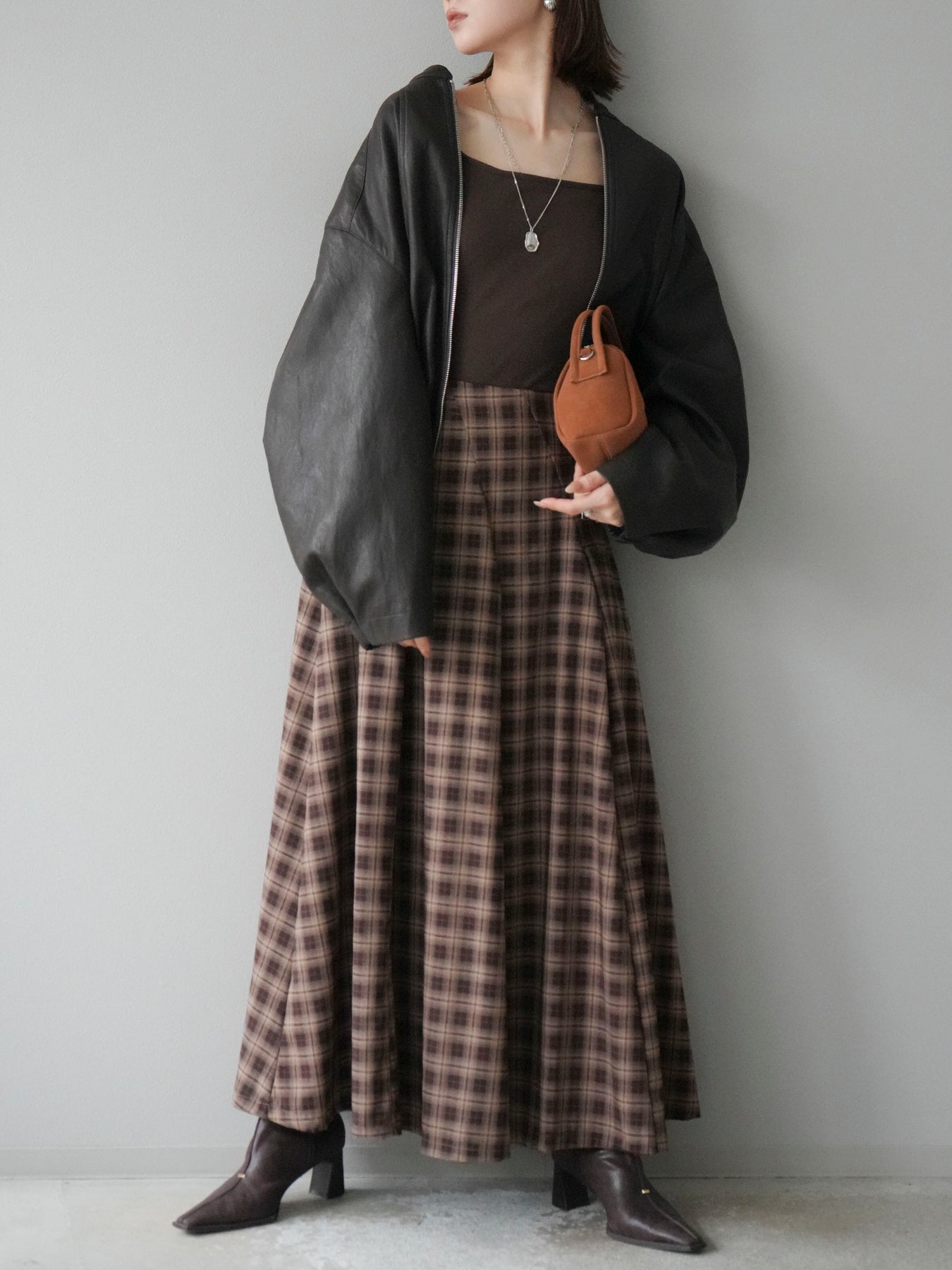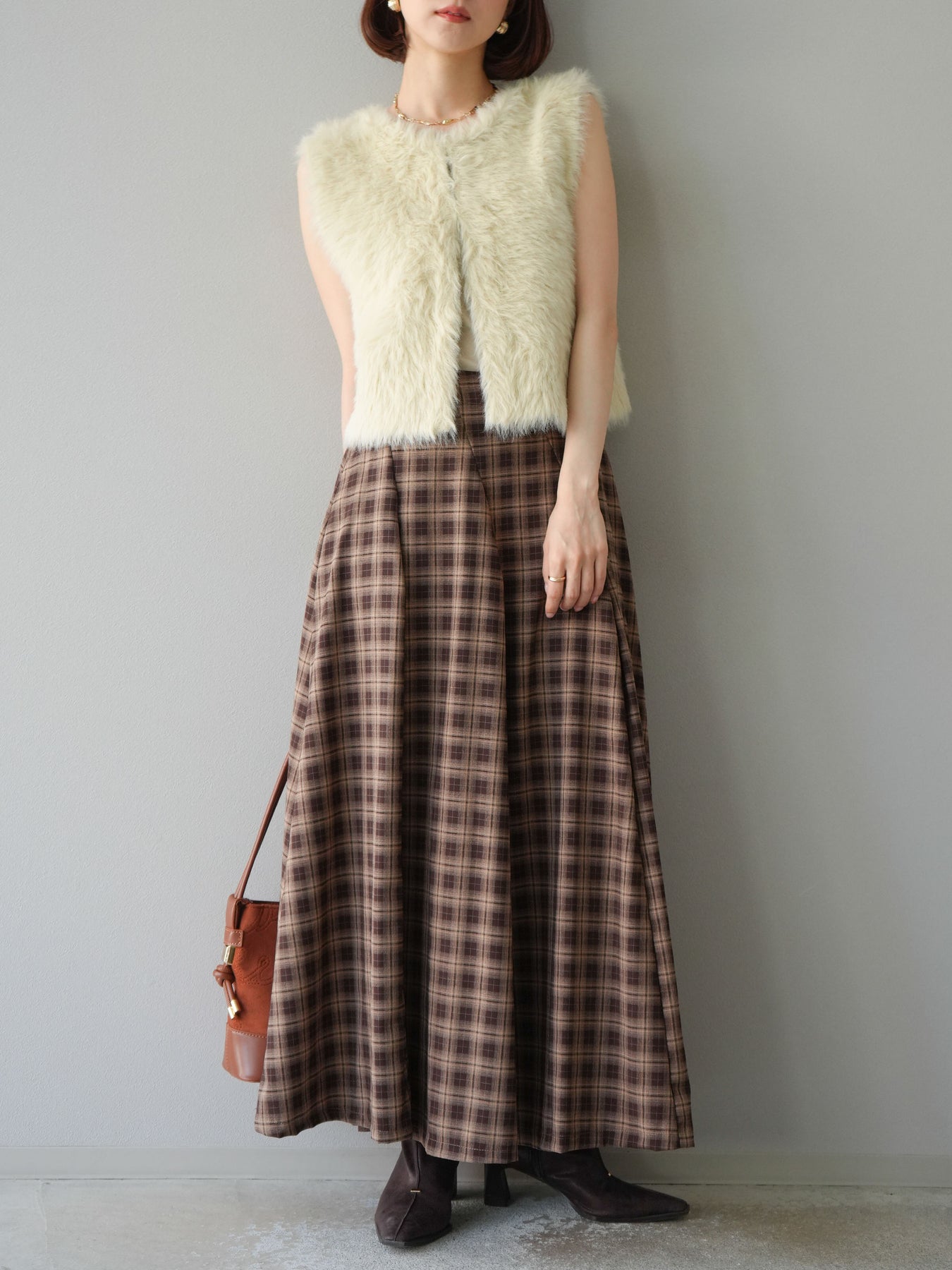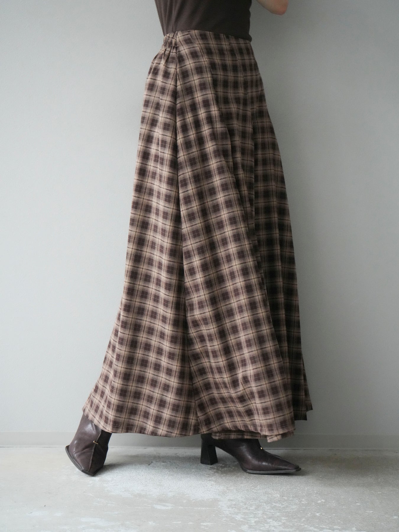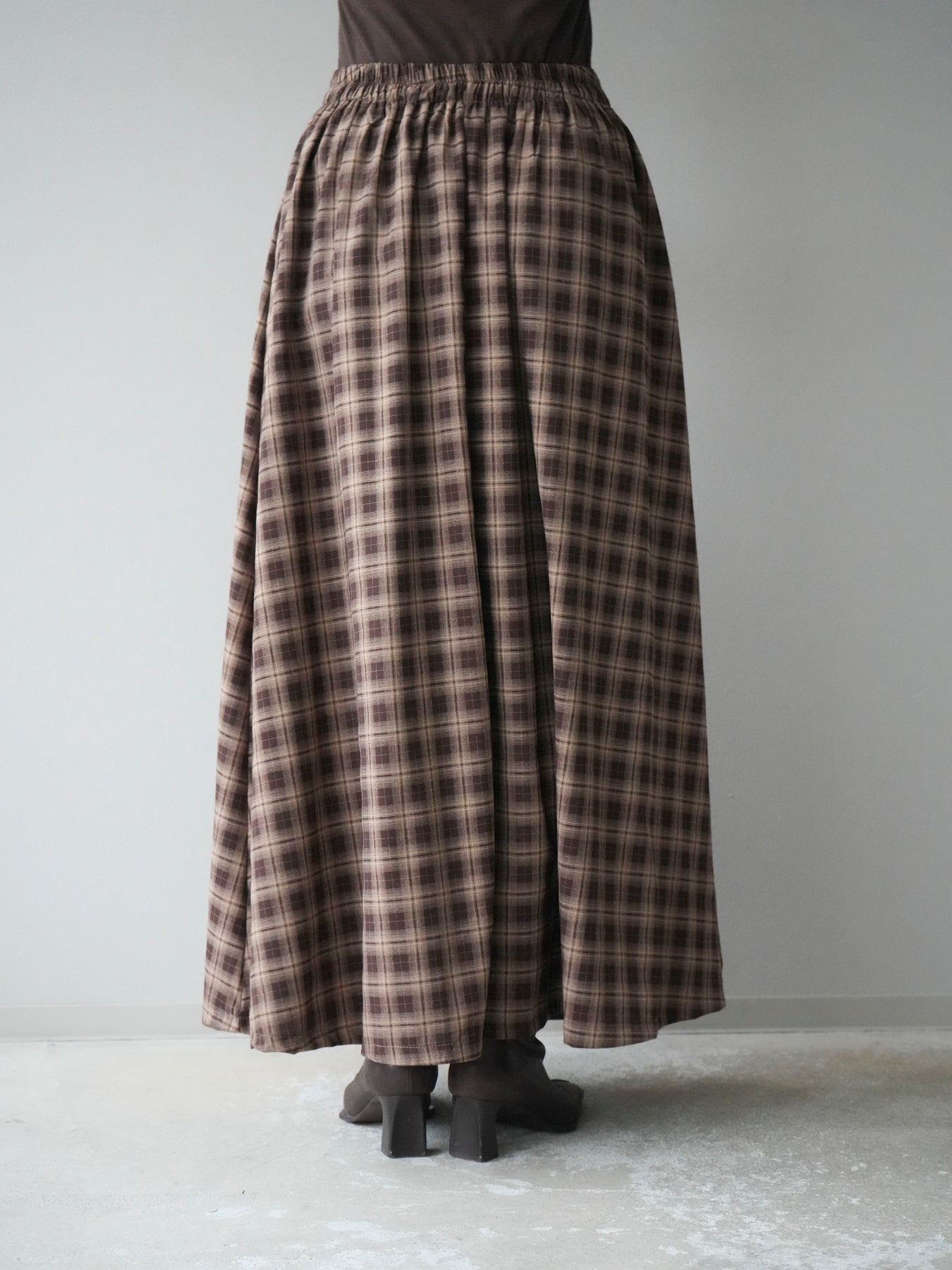 [予約]チェックタックフレアロングスカート/ ブラウン
