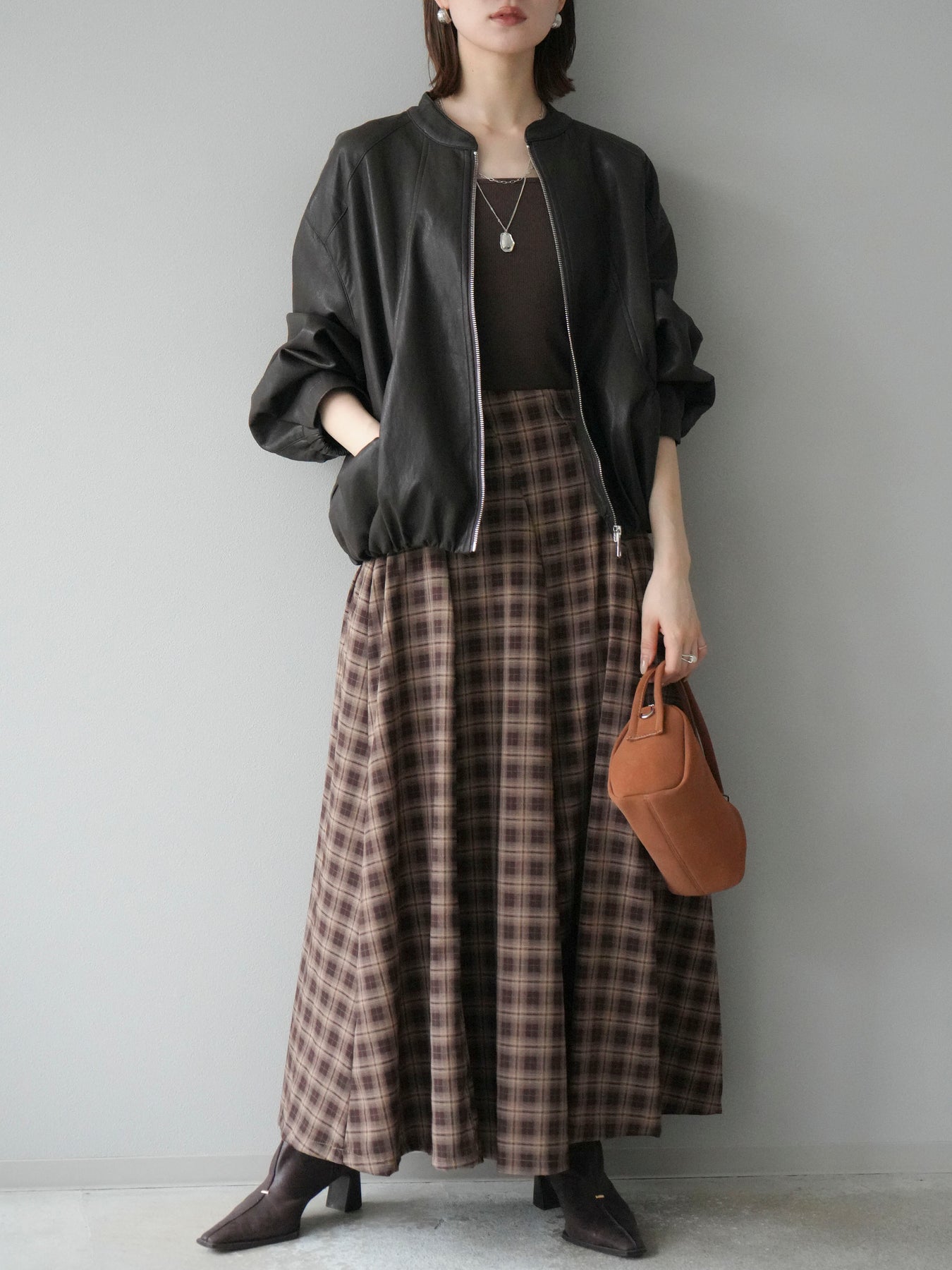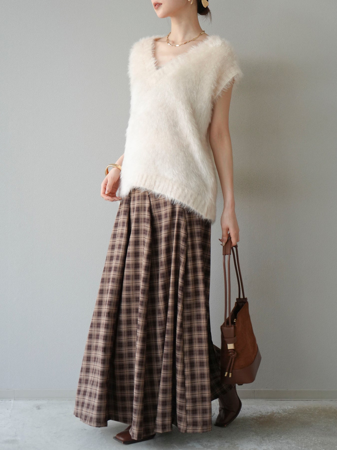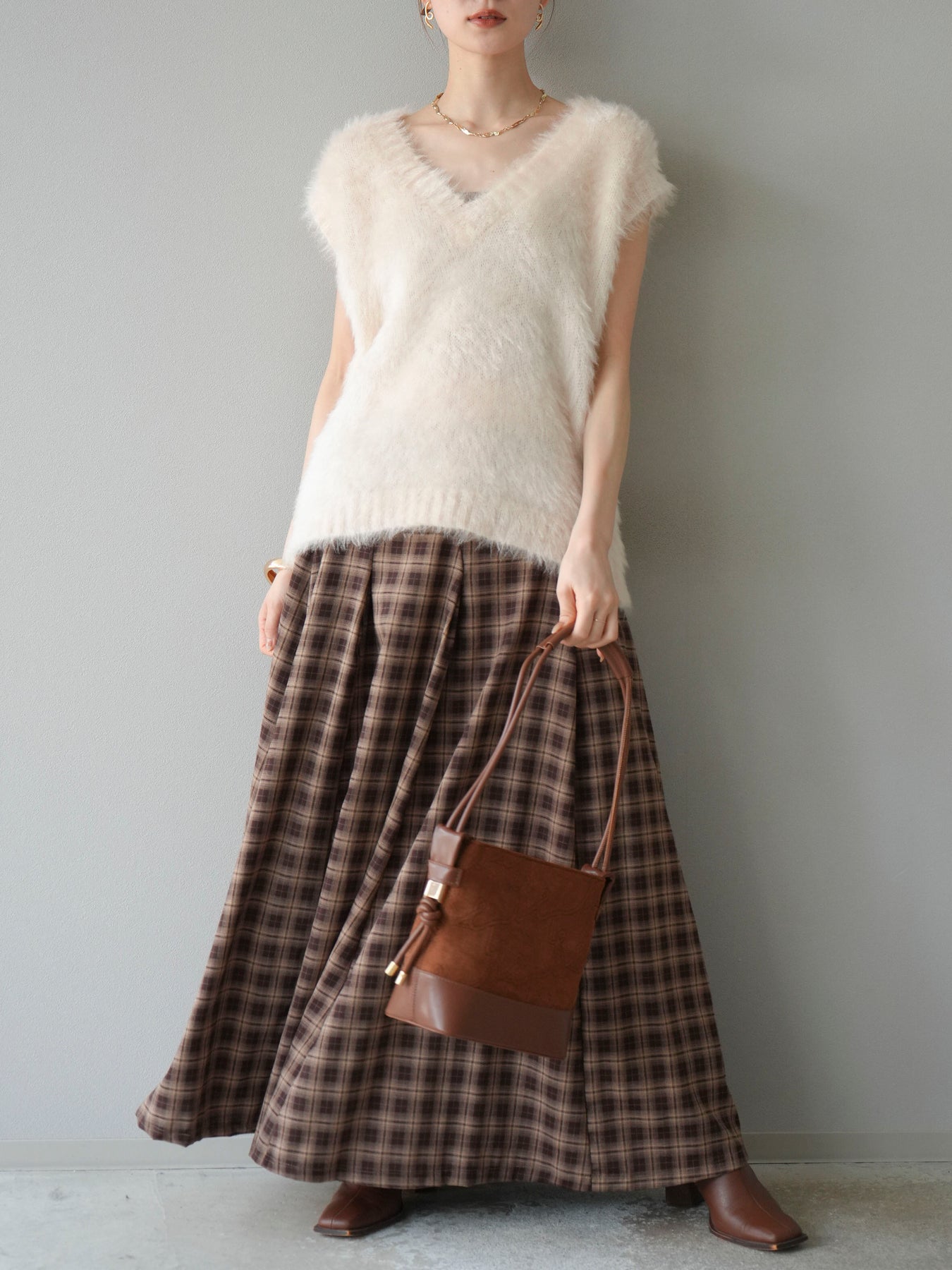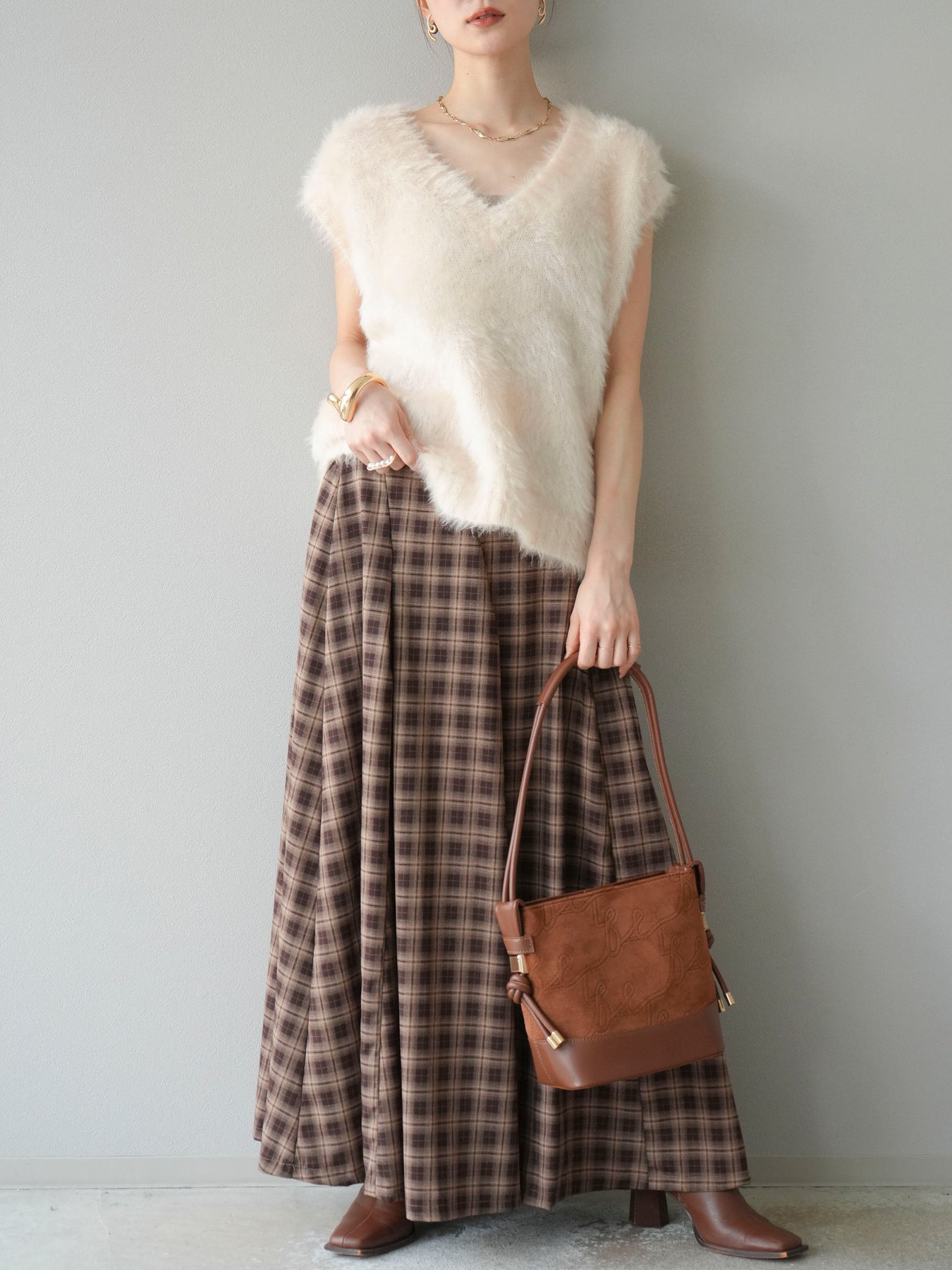 [予約]チェックタックフレアロングスカート/ ブラウン