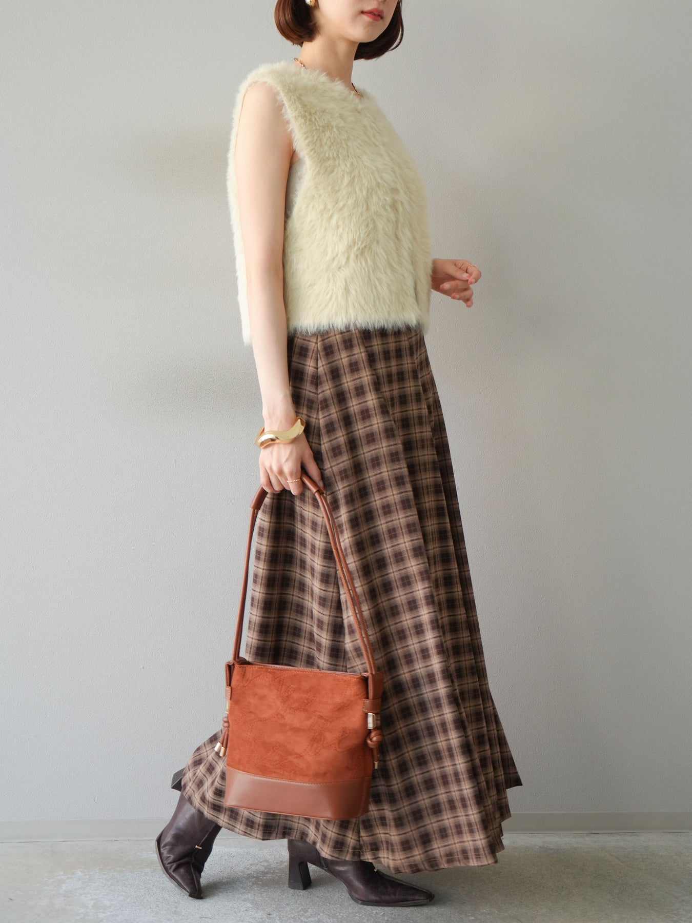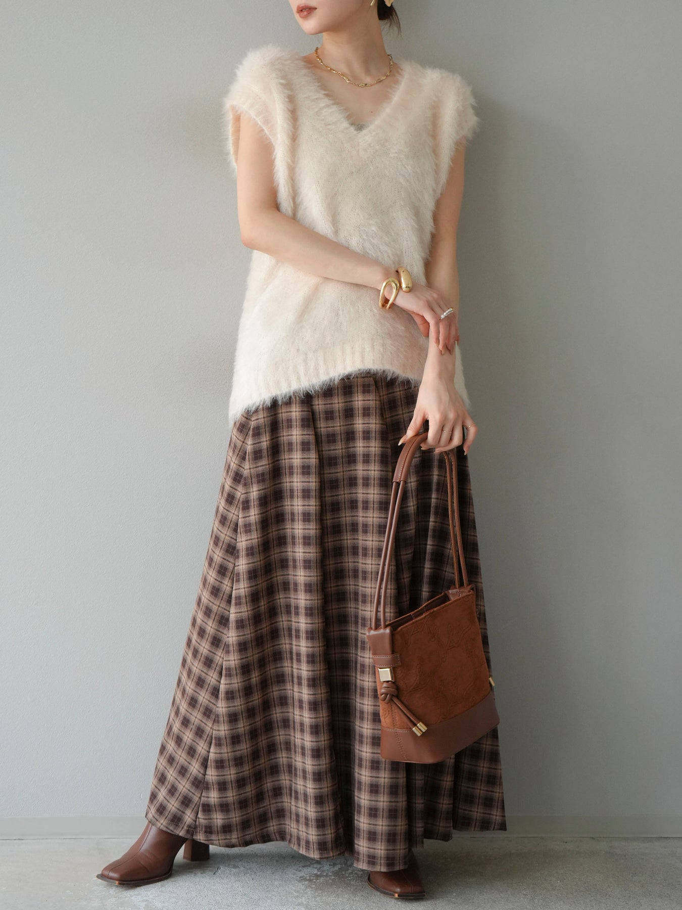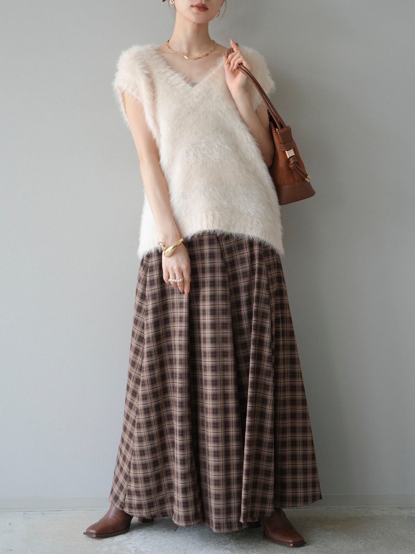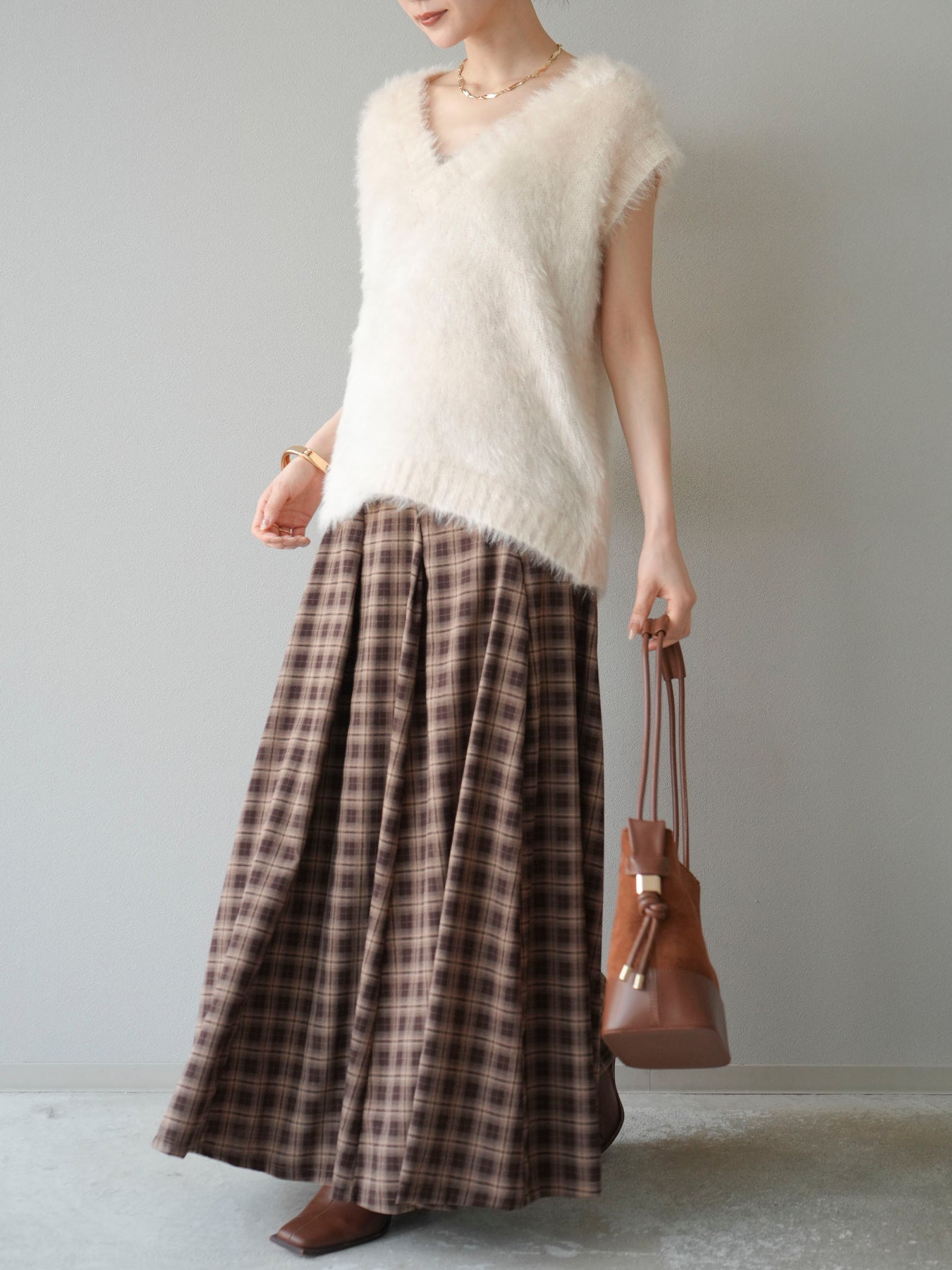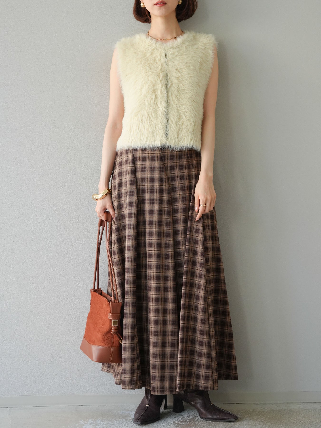 [予約]チェックタックフレアロングスカート/ ブラウン