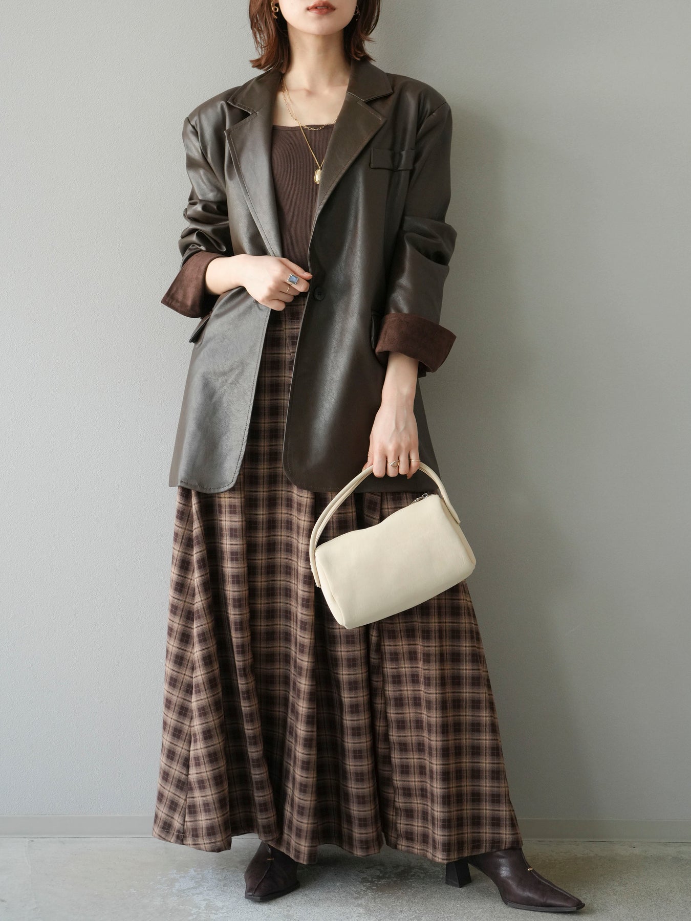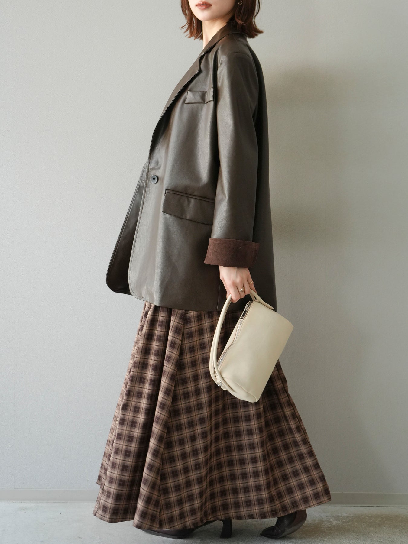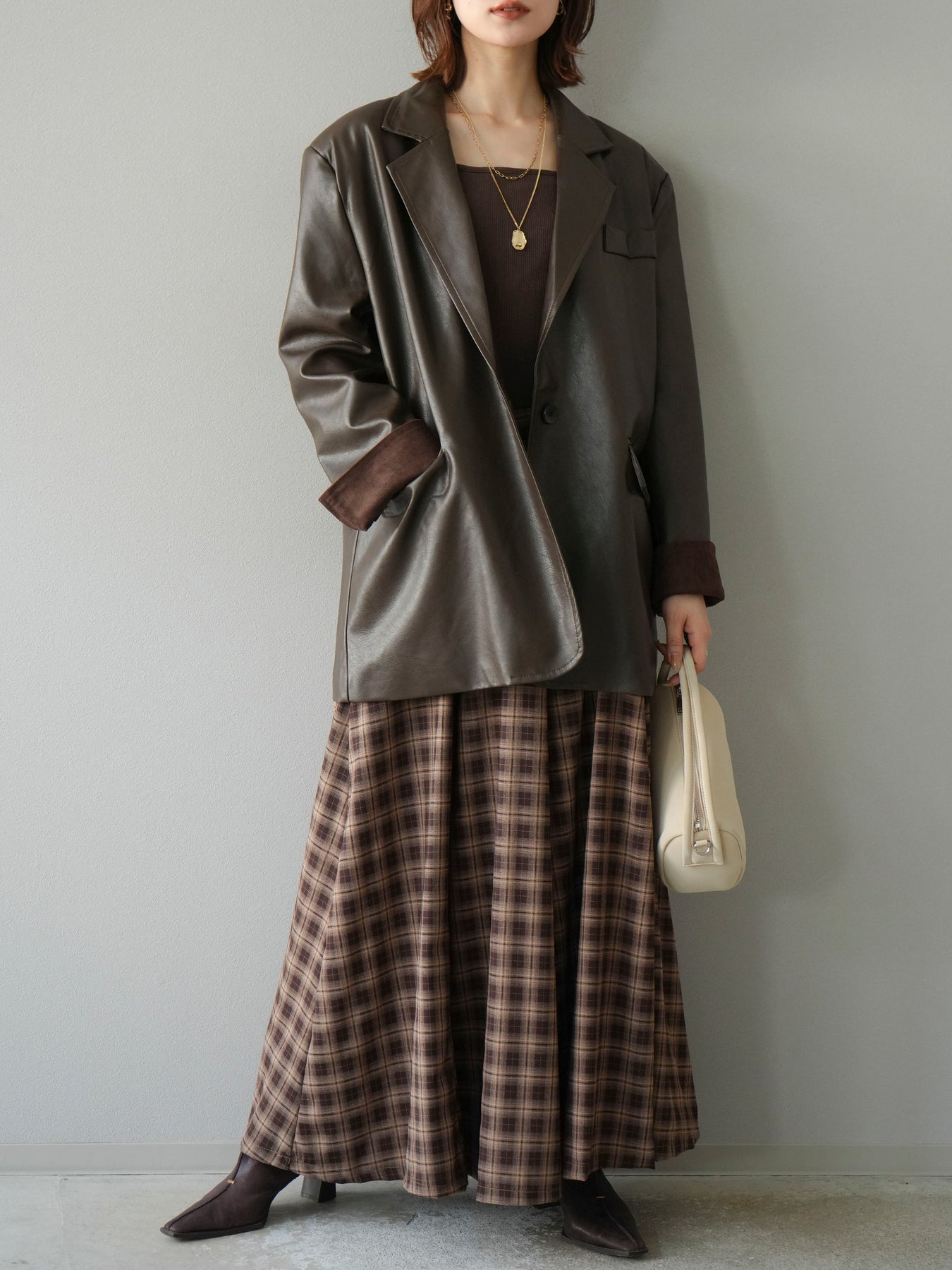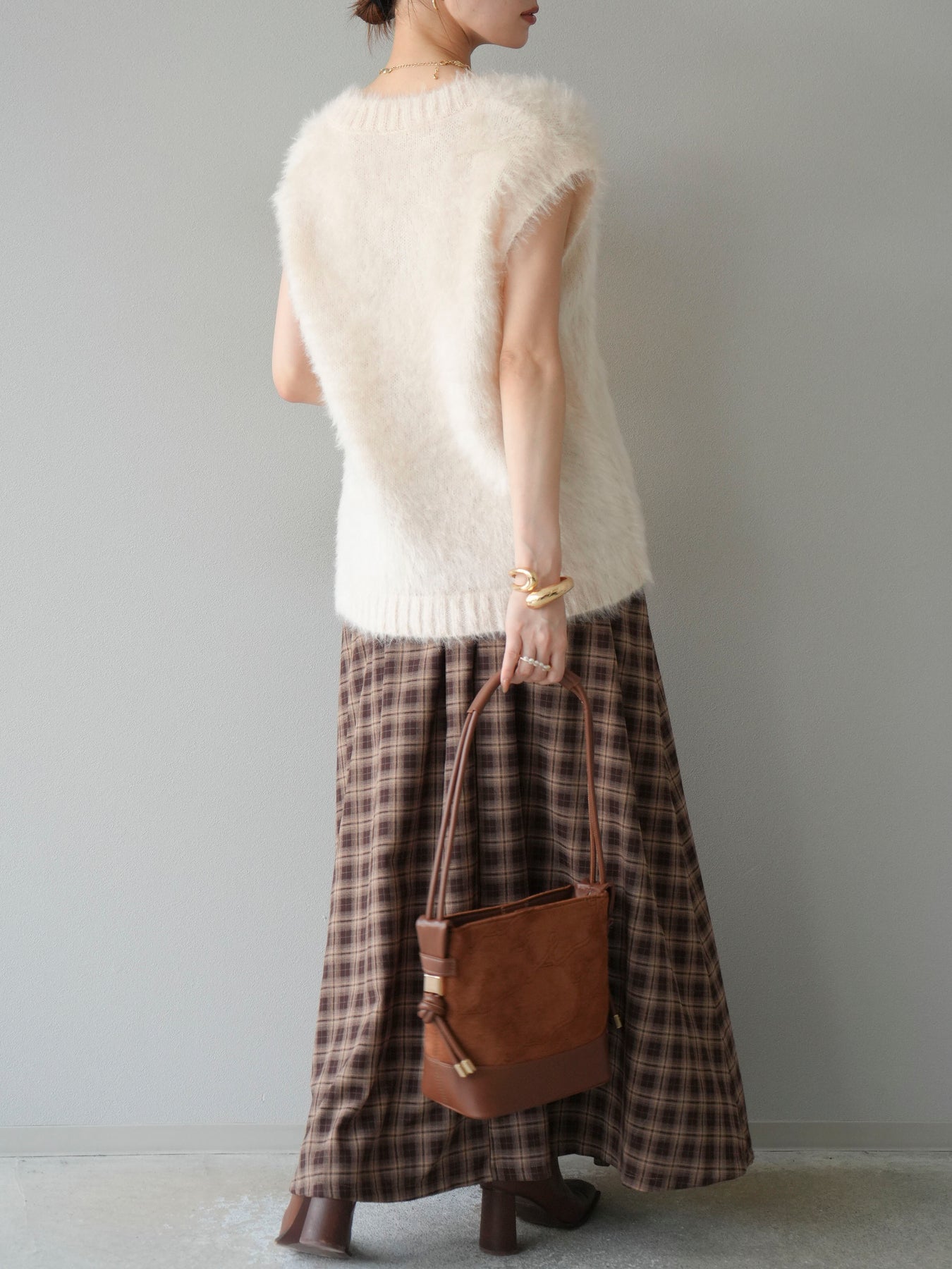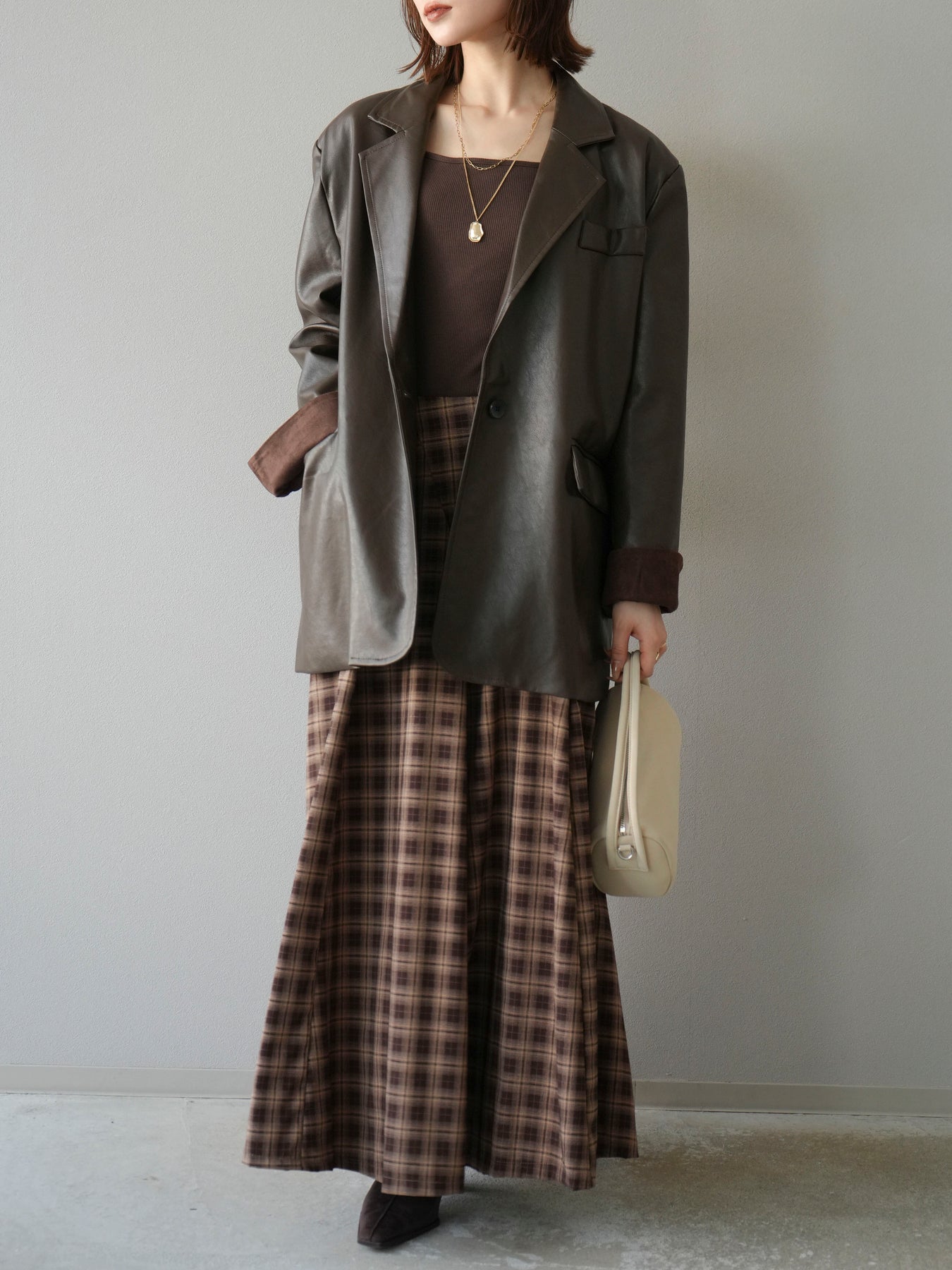 [予約]チェックタックフレアロングスカート/ ブラウン