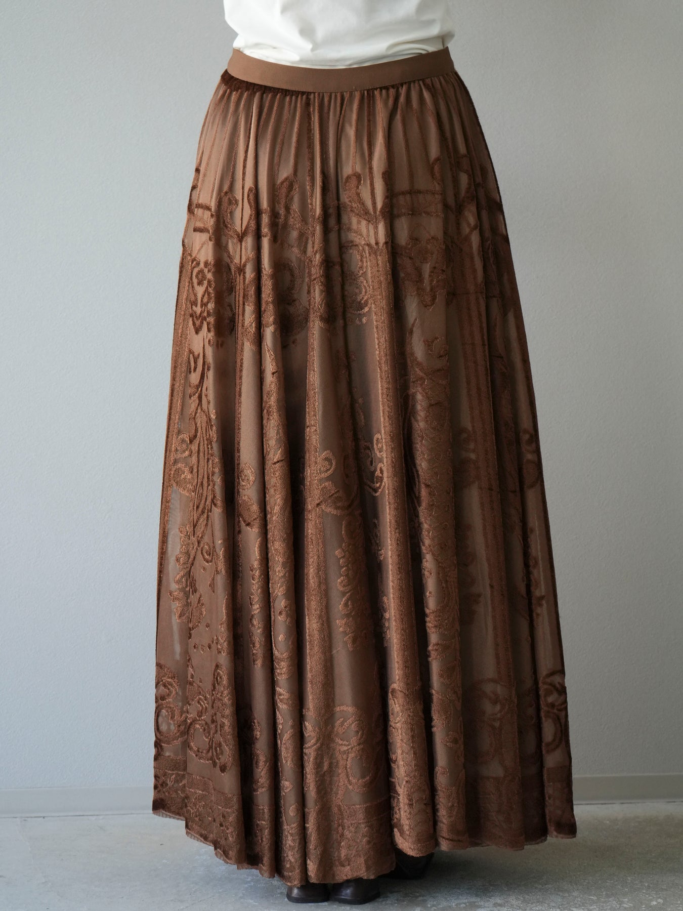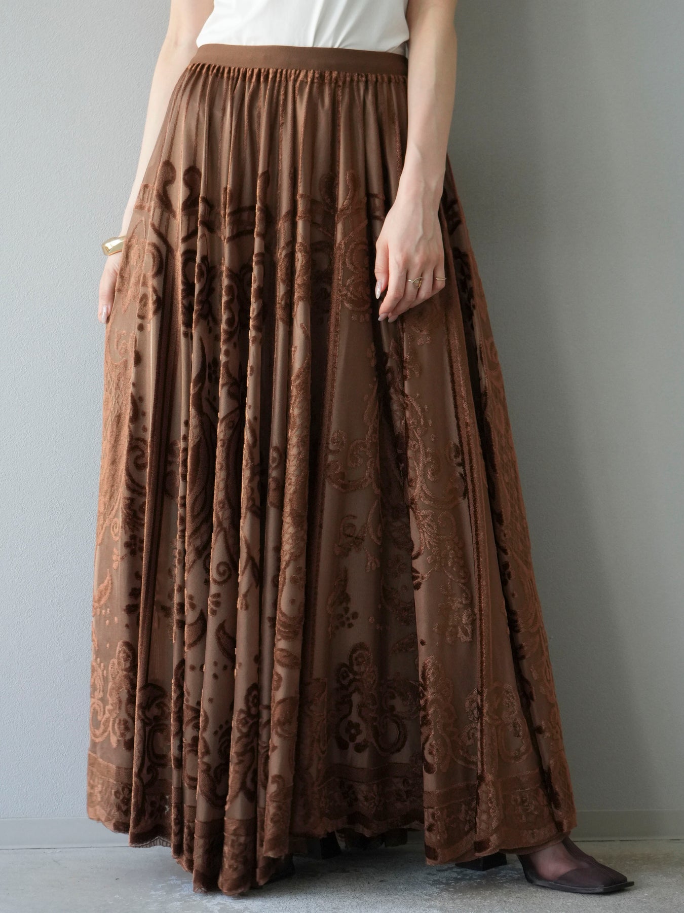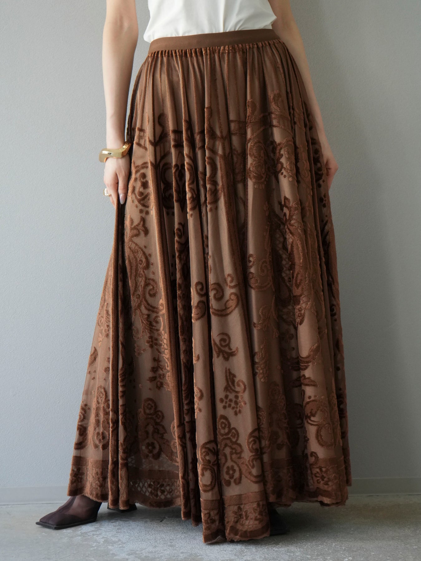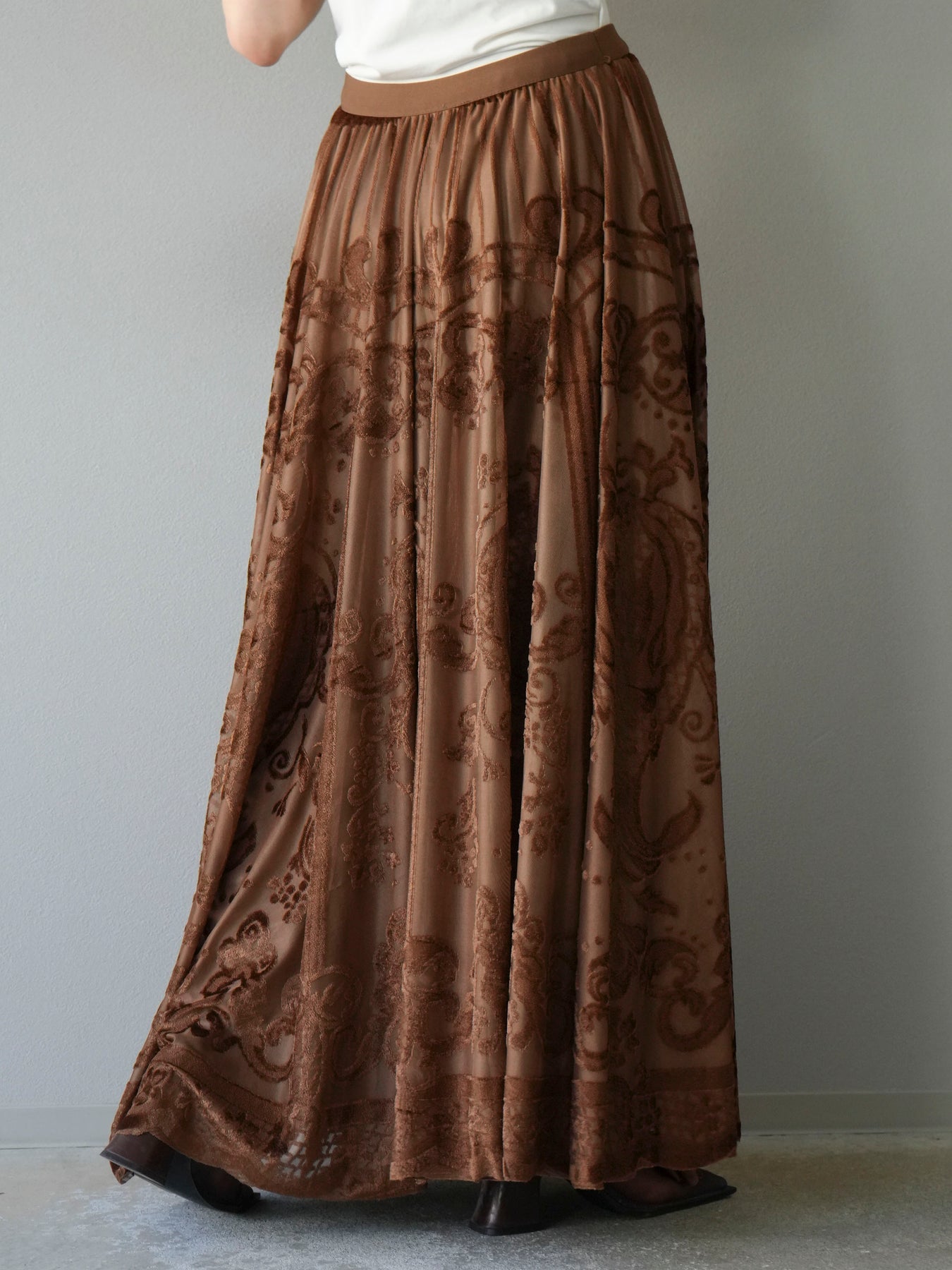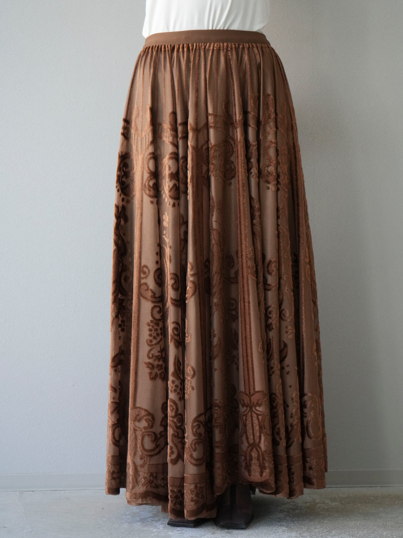 [予約]アンティーク柄フロッキーマキシスカート/ブラウン