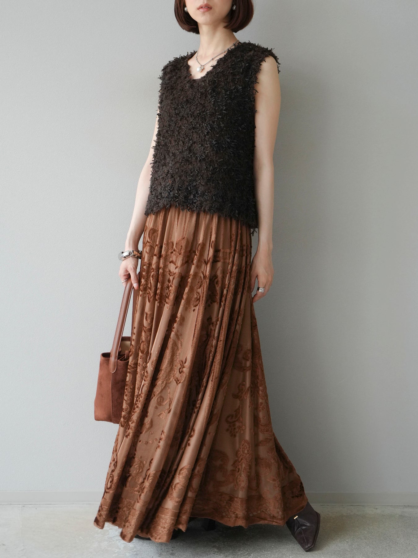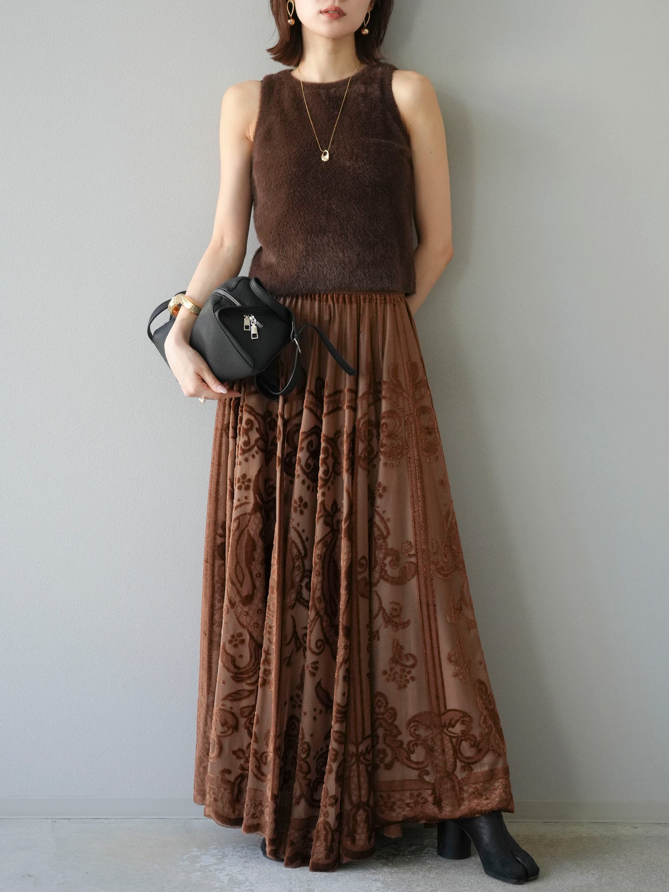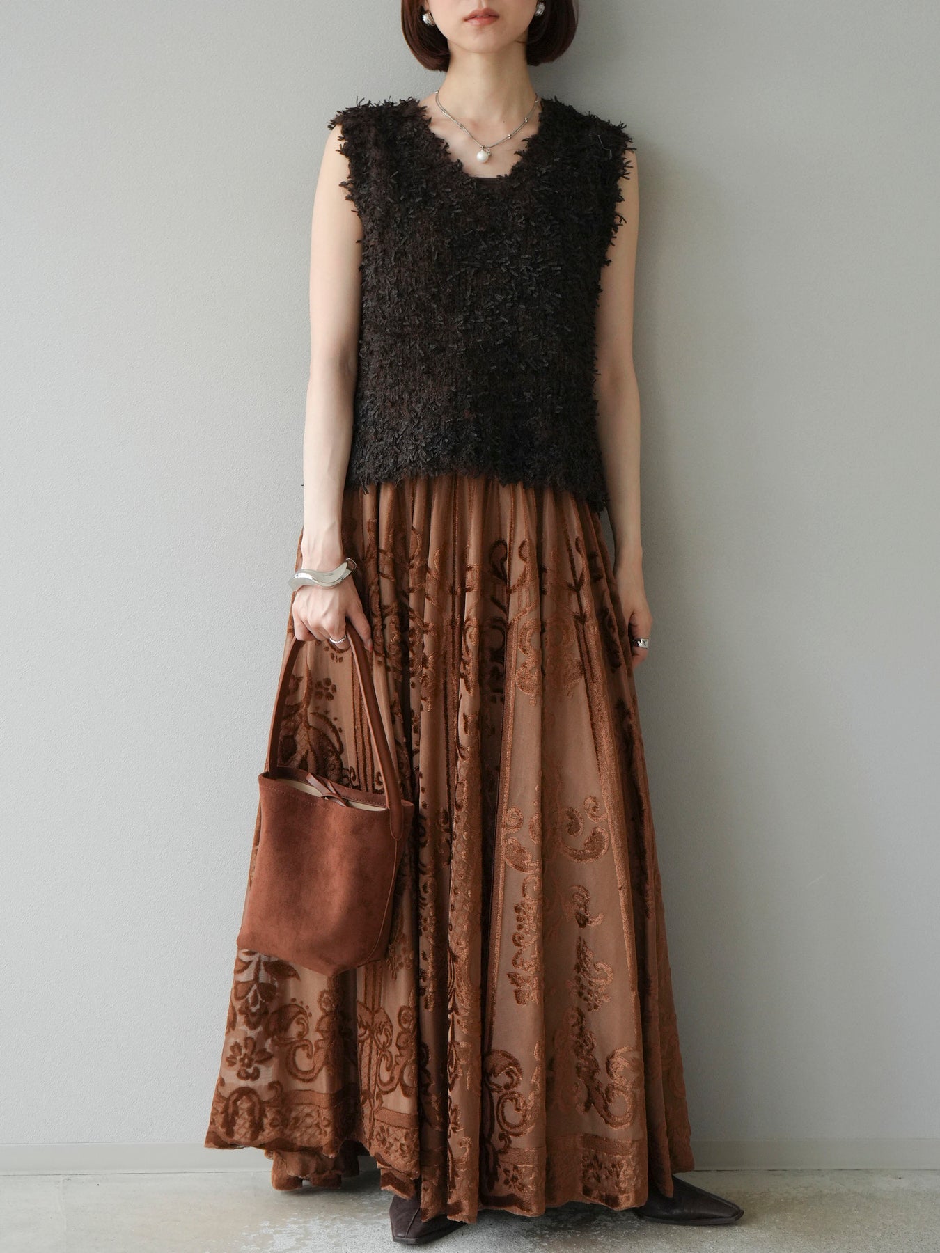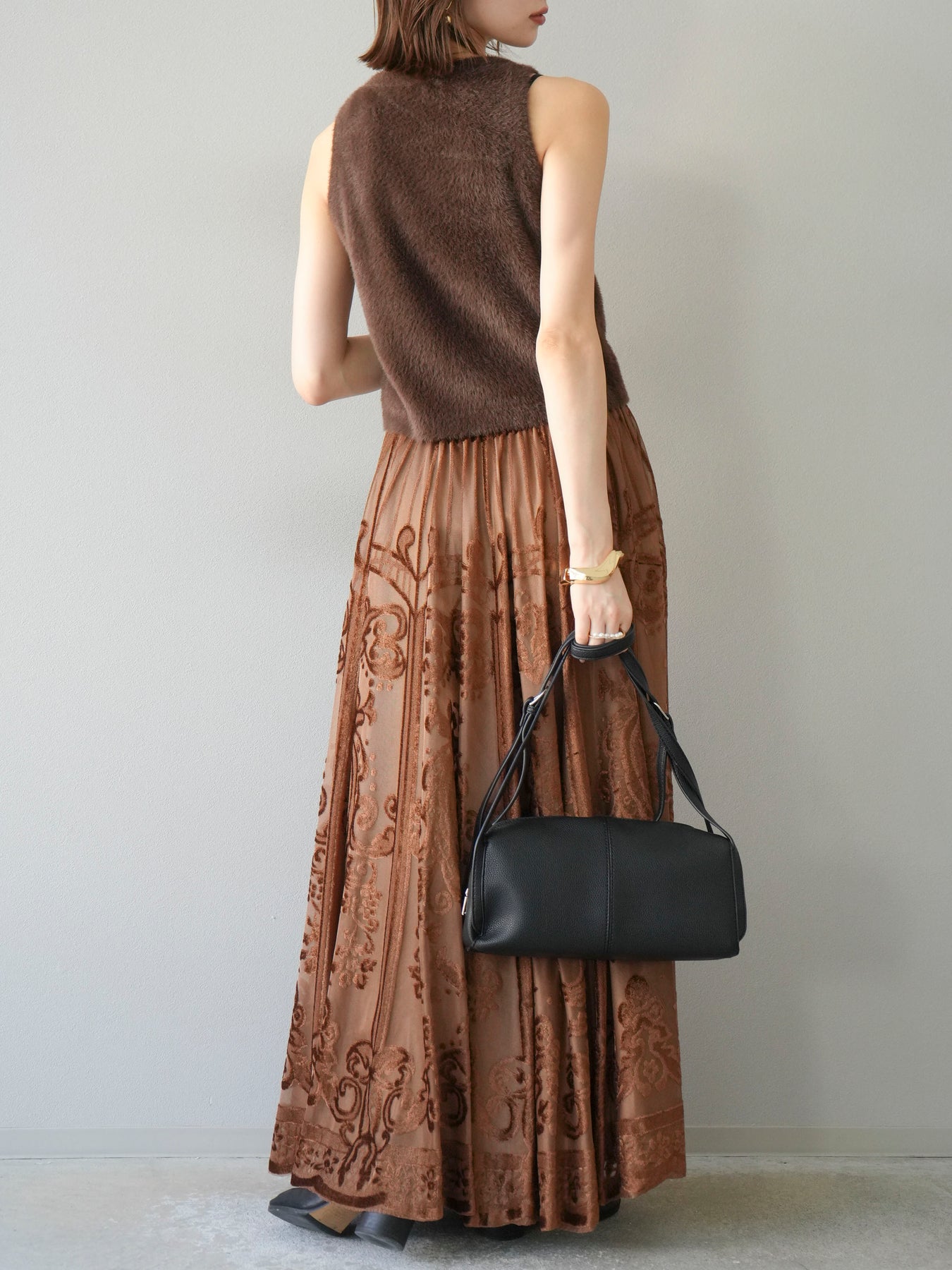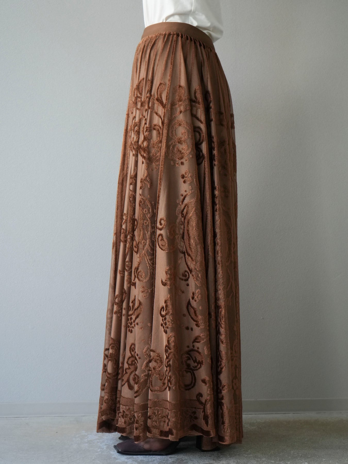 [予約]アンティーク柄フロッキーマキシスカート/ブラウン