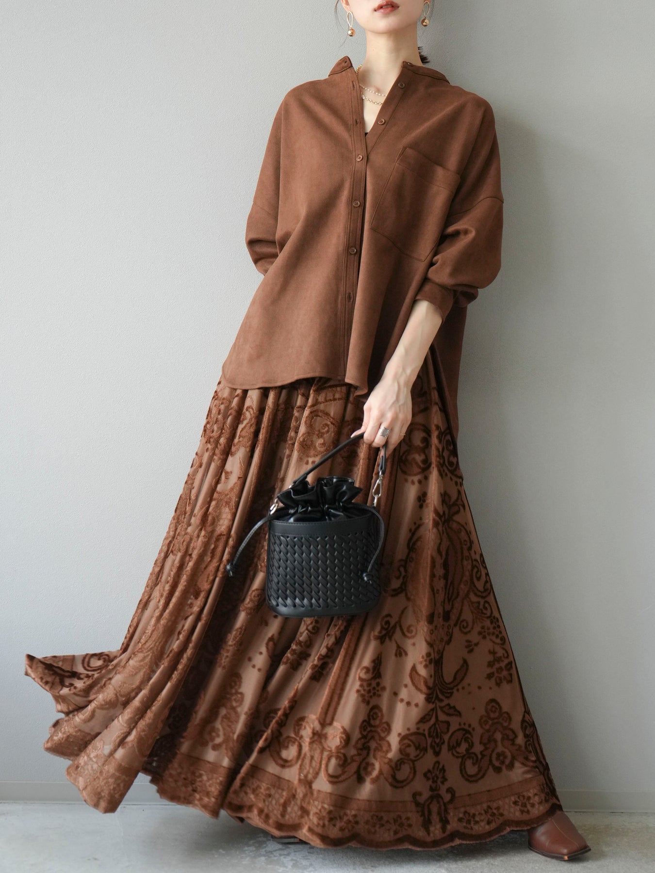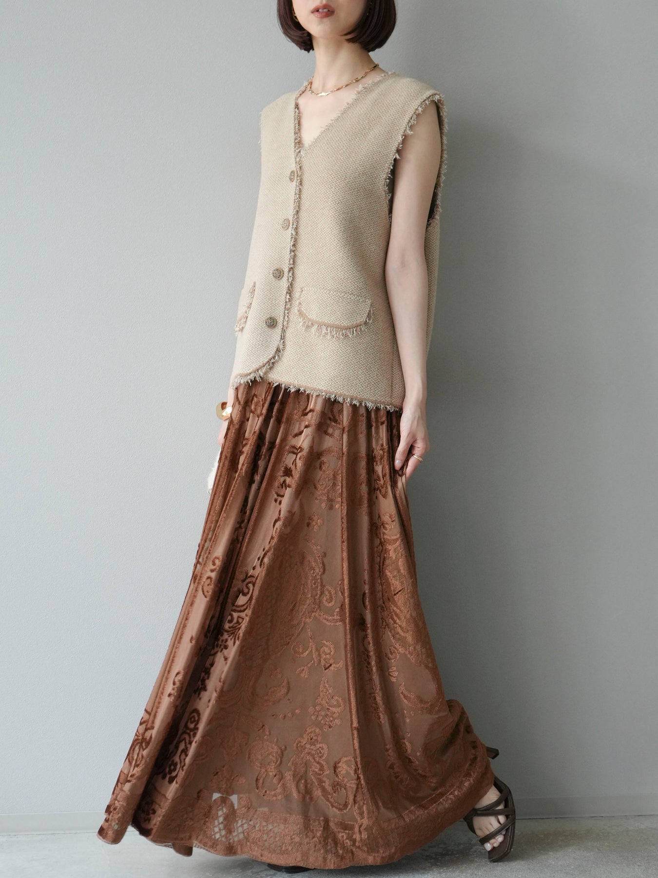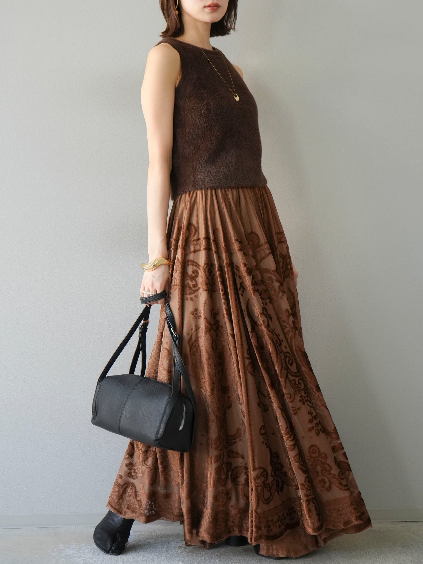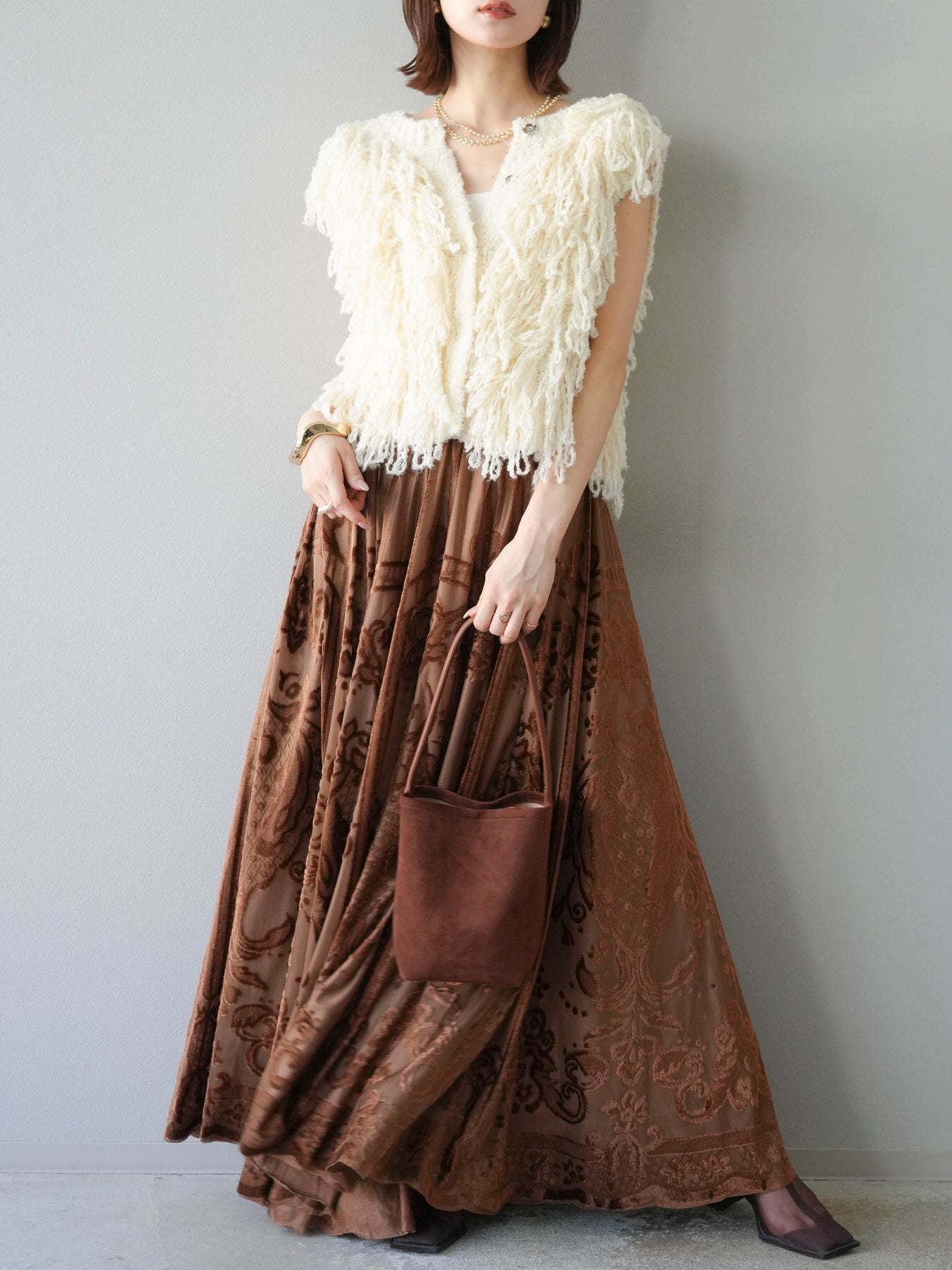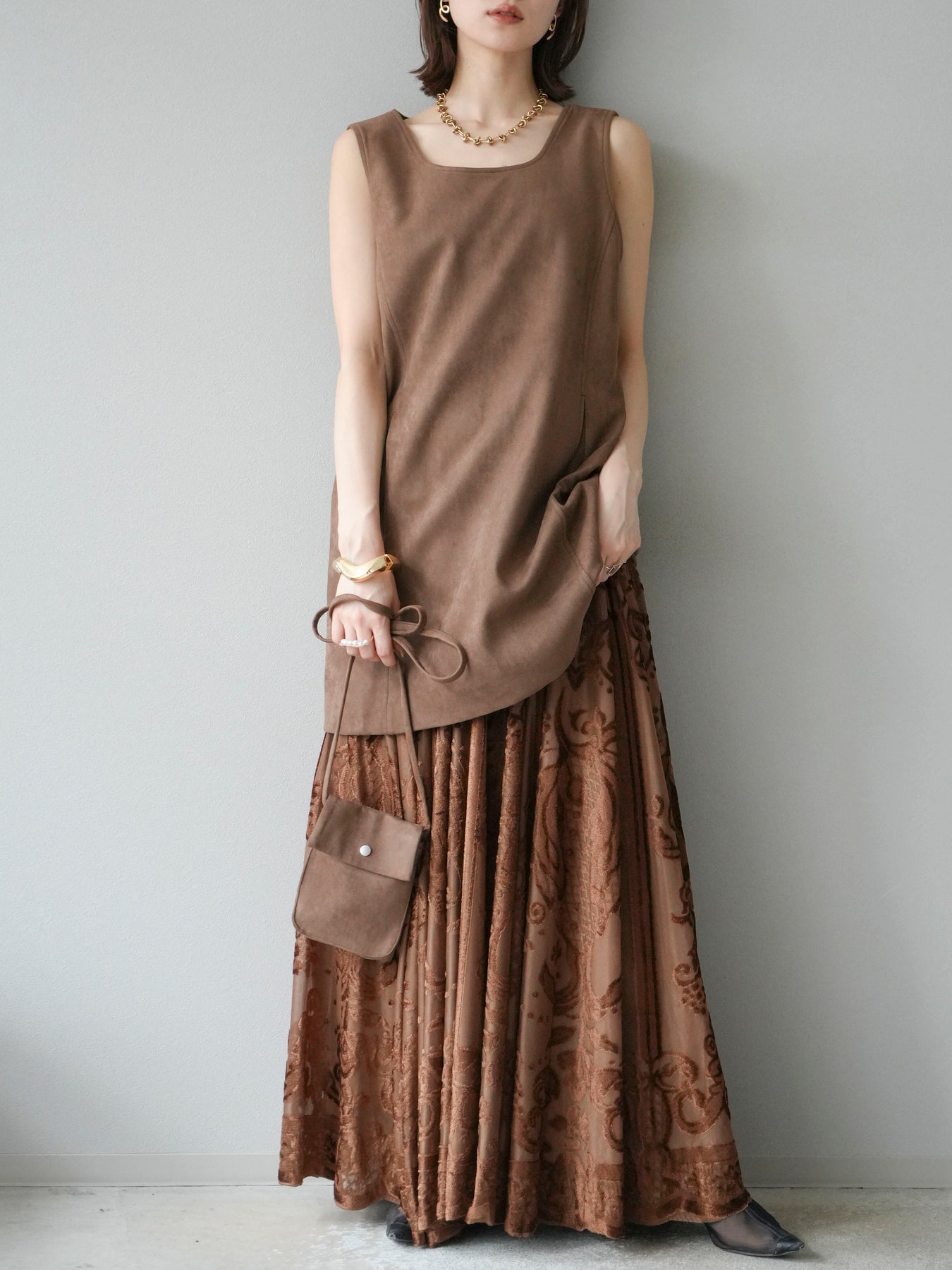 [予約]アンティーク柄フロッキーマキシスカート/ブラウン
