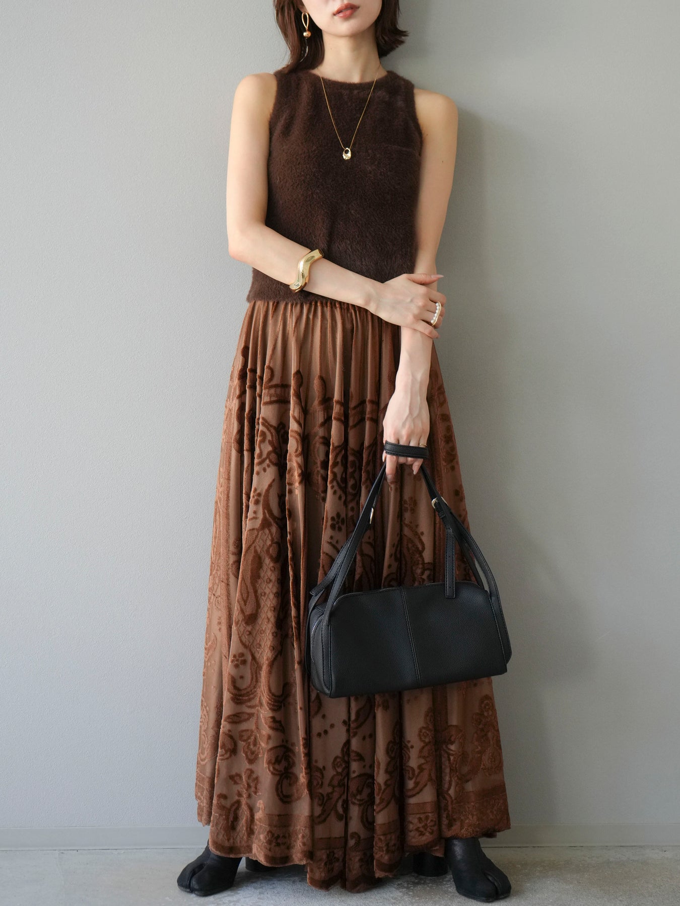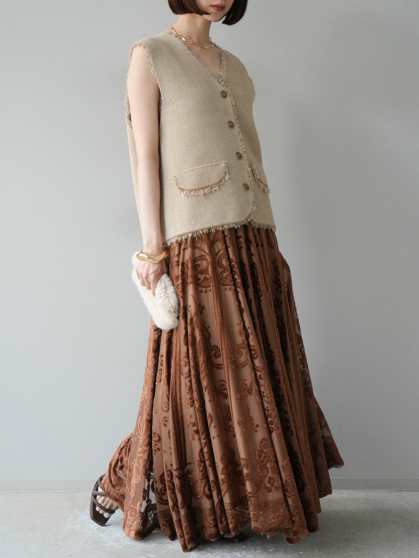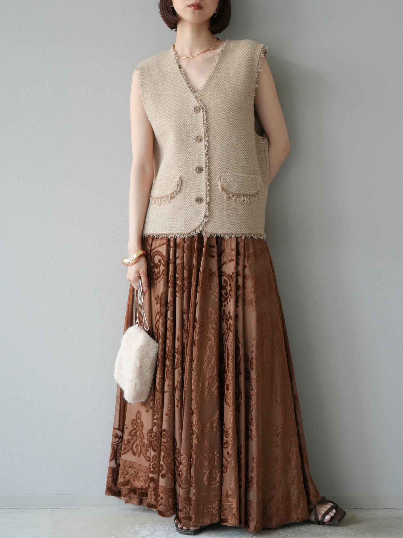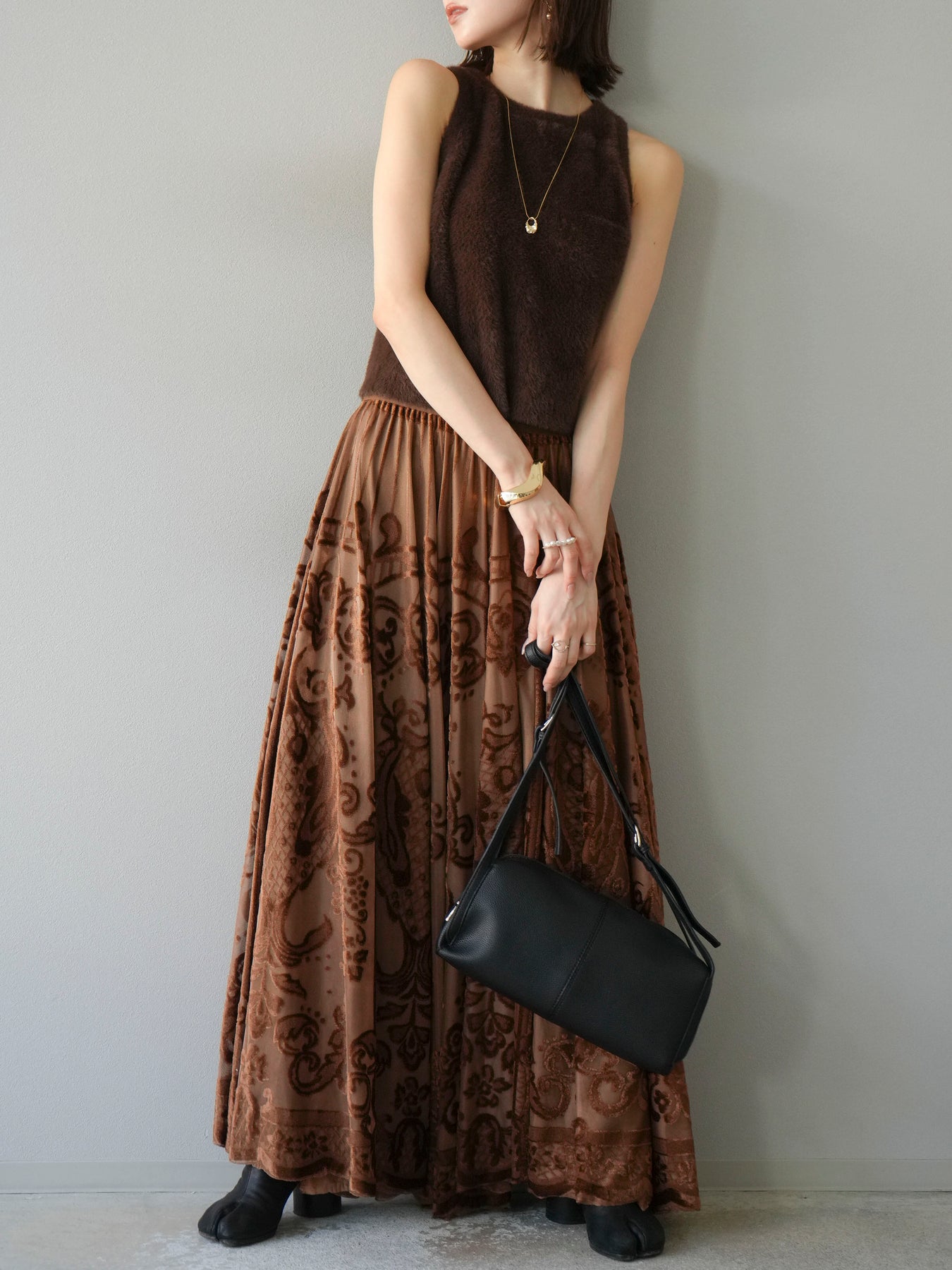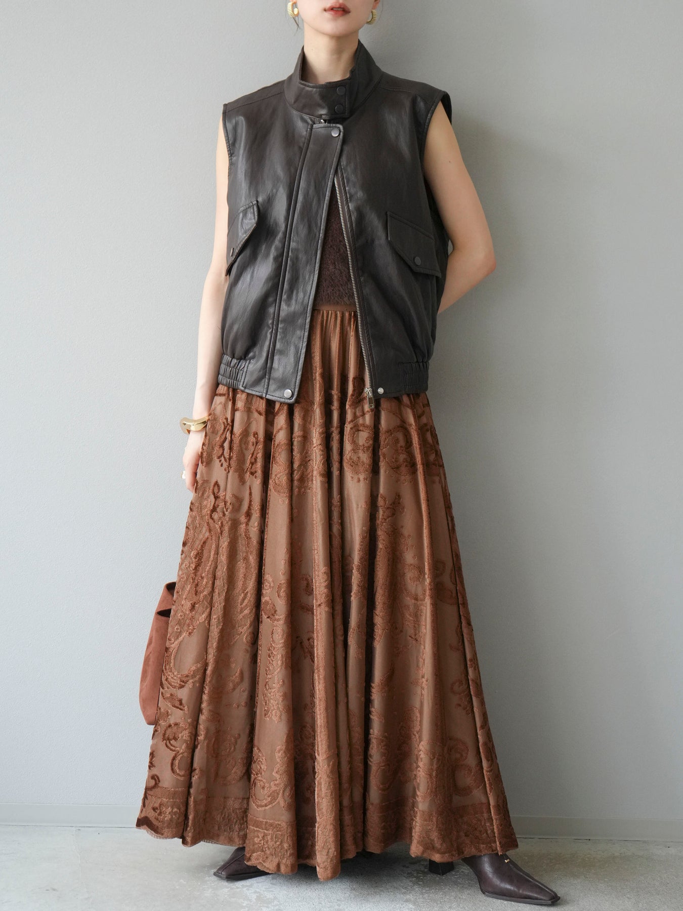 [予約]アンティーク柄フロッキーマキシスカート/ブラウン