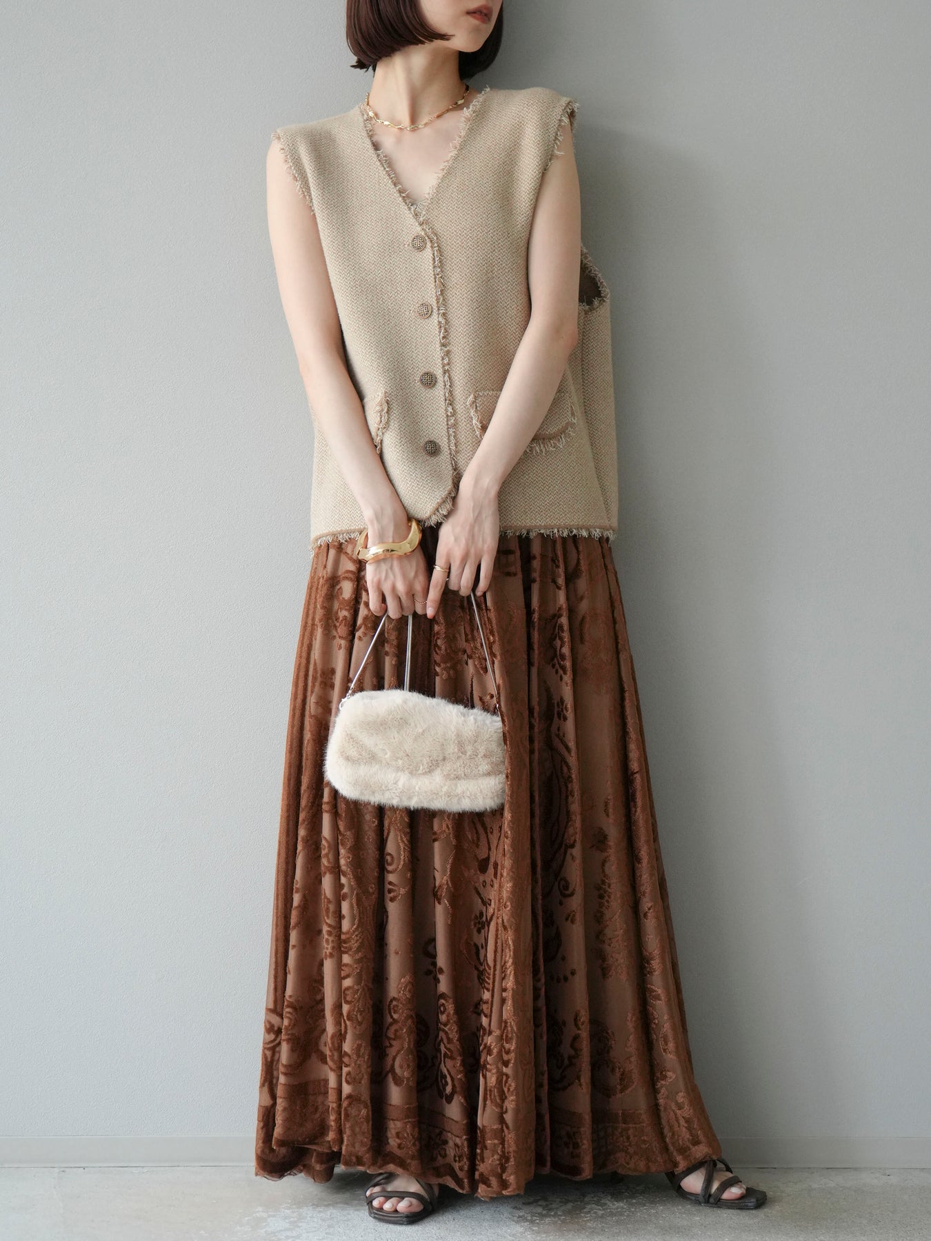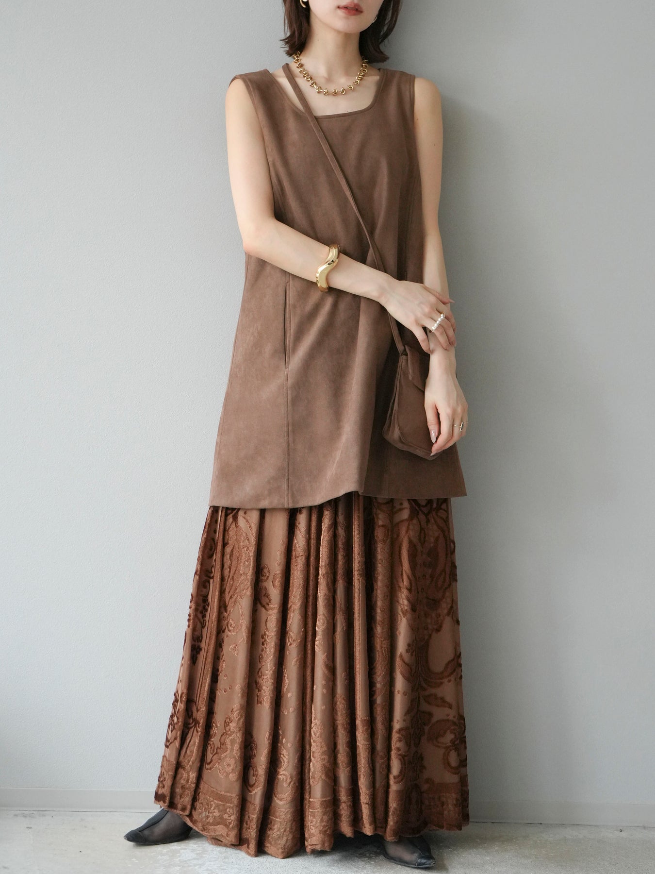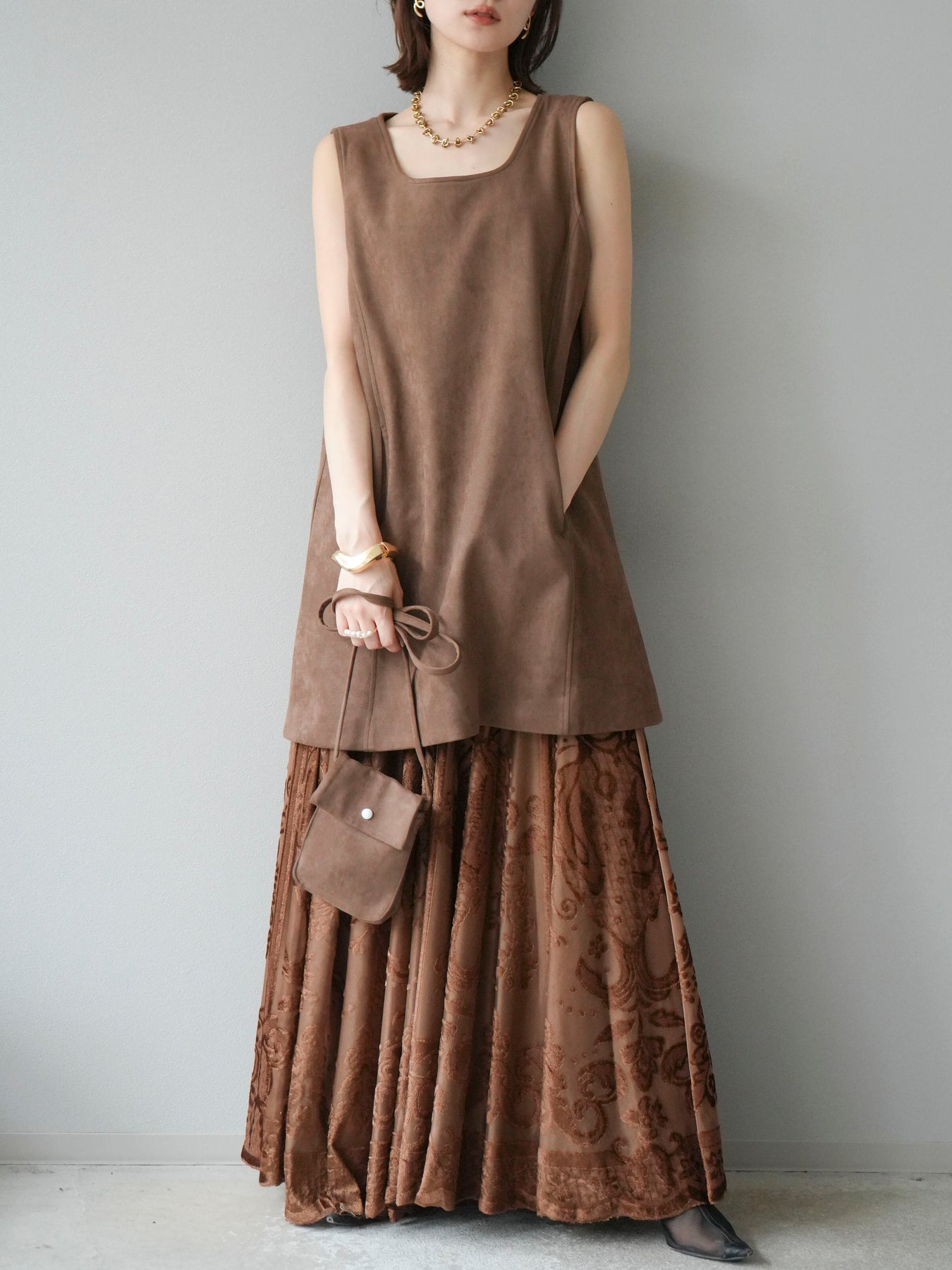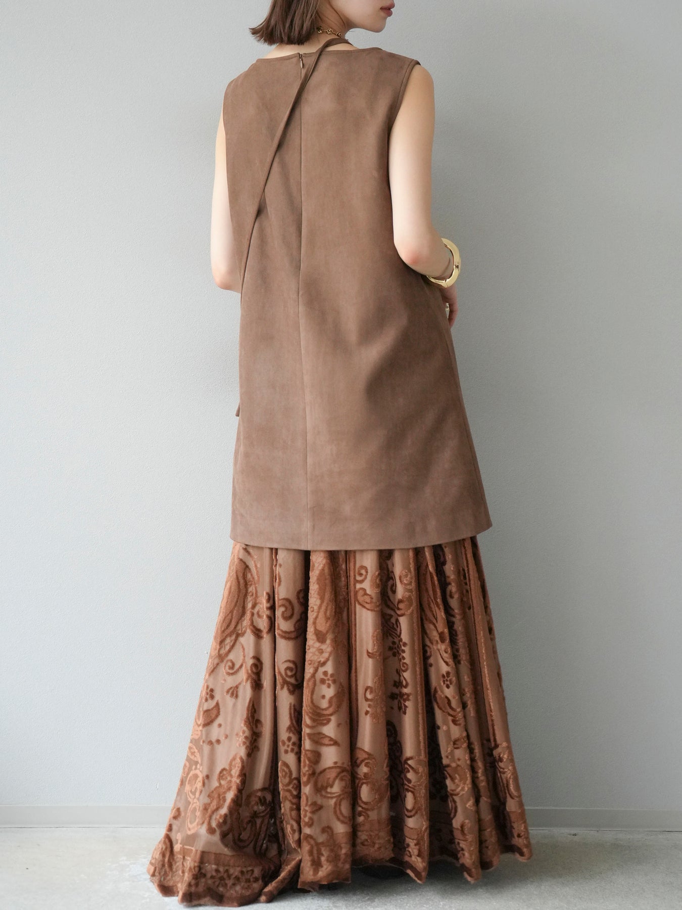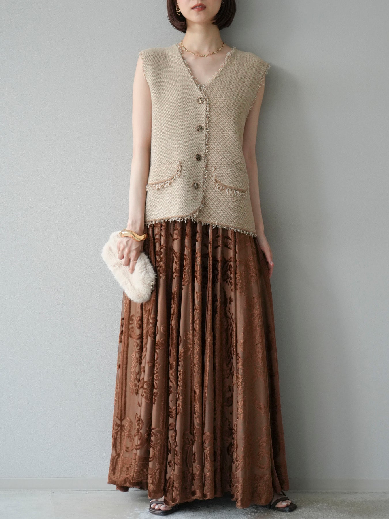 [予約]アンティーク柄フロッキーマキシスカート/ブラウン