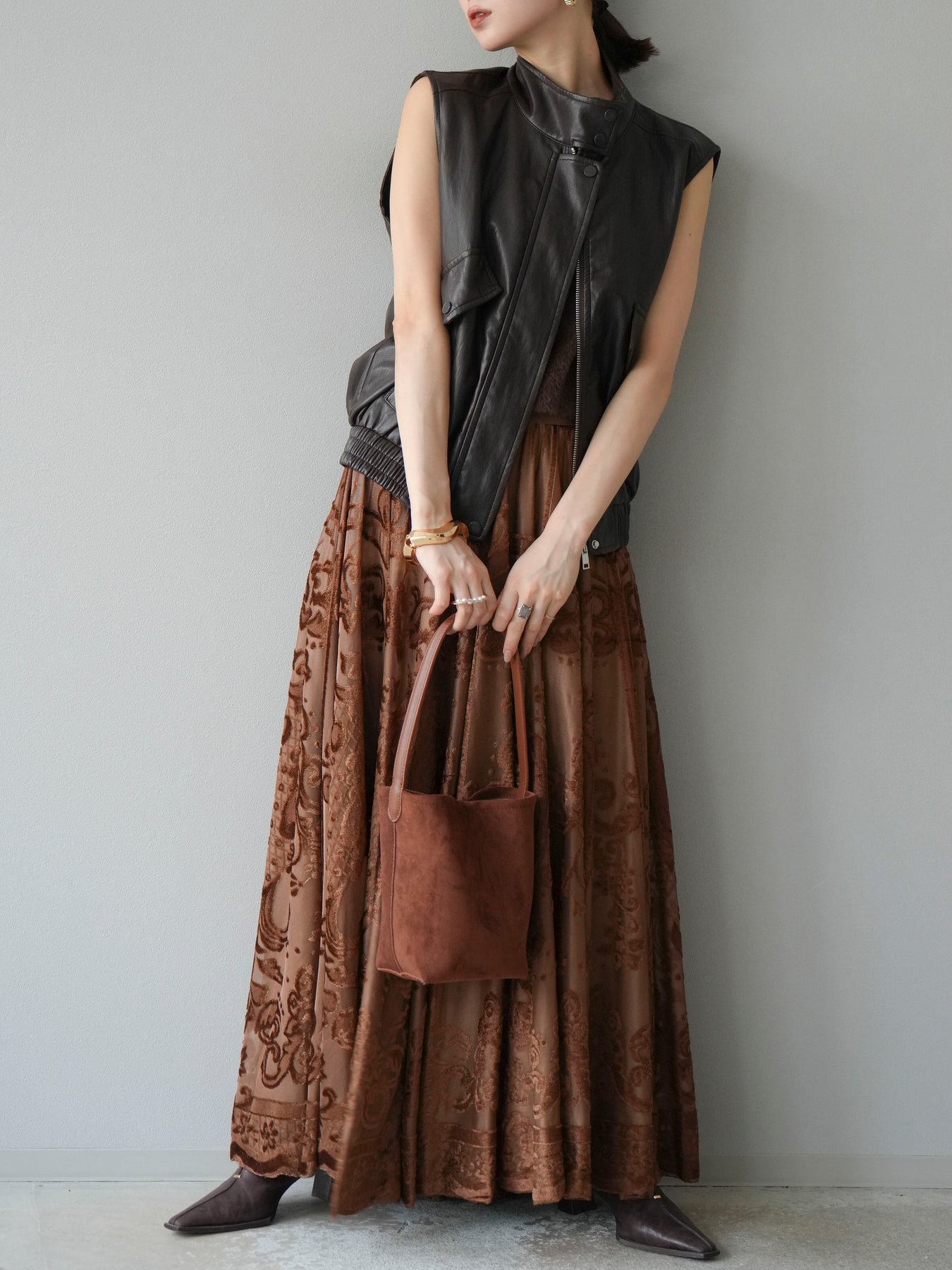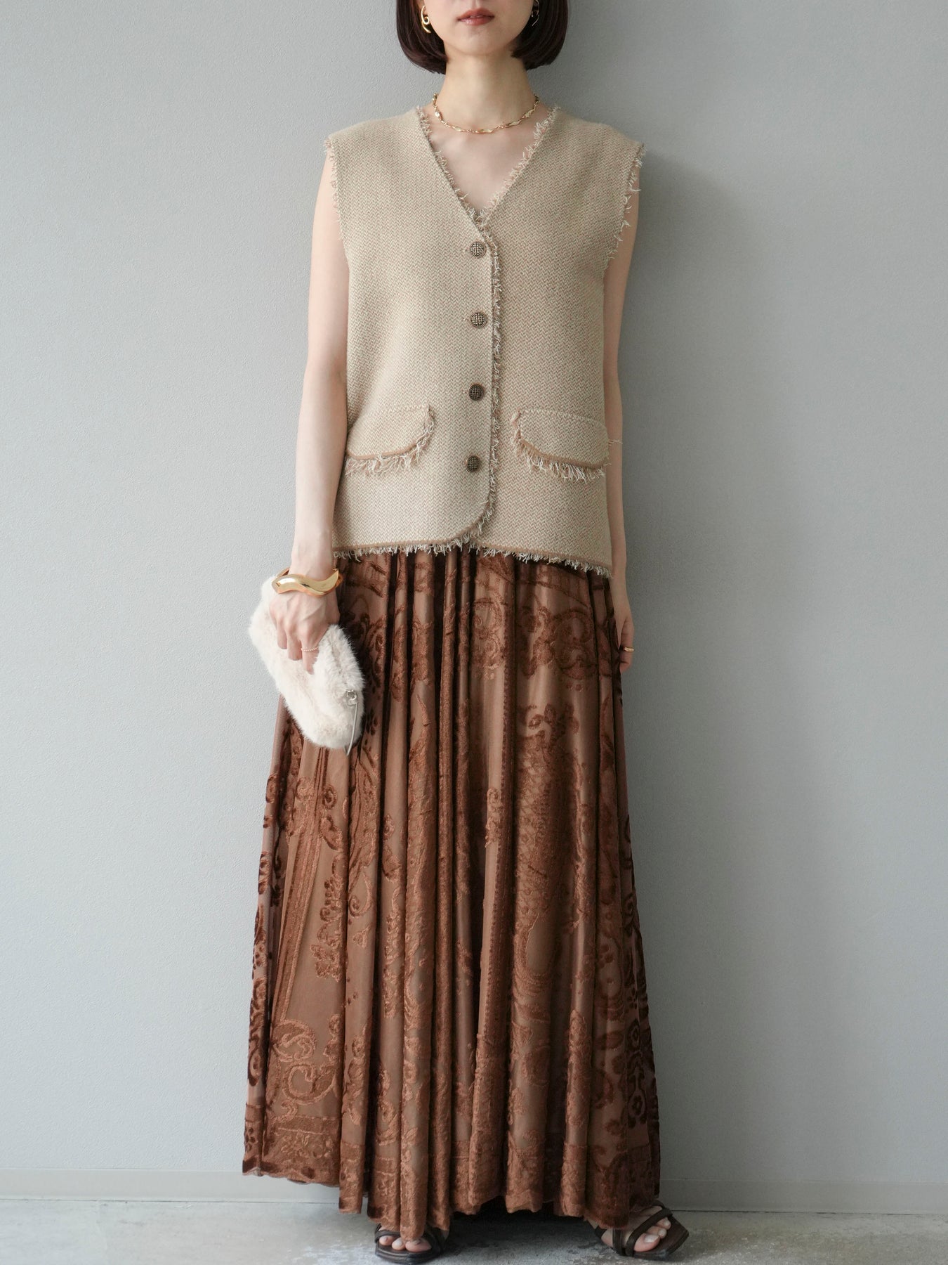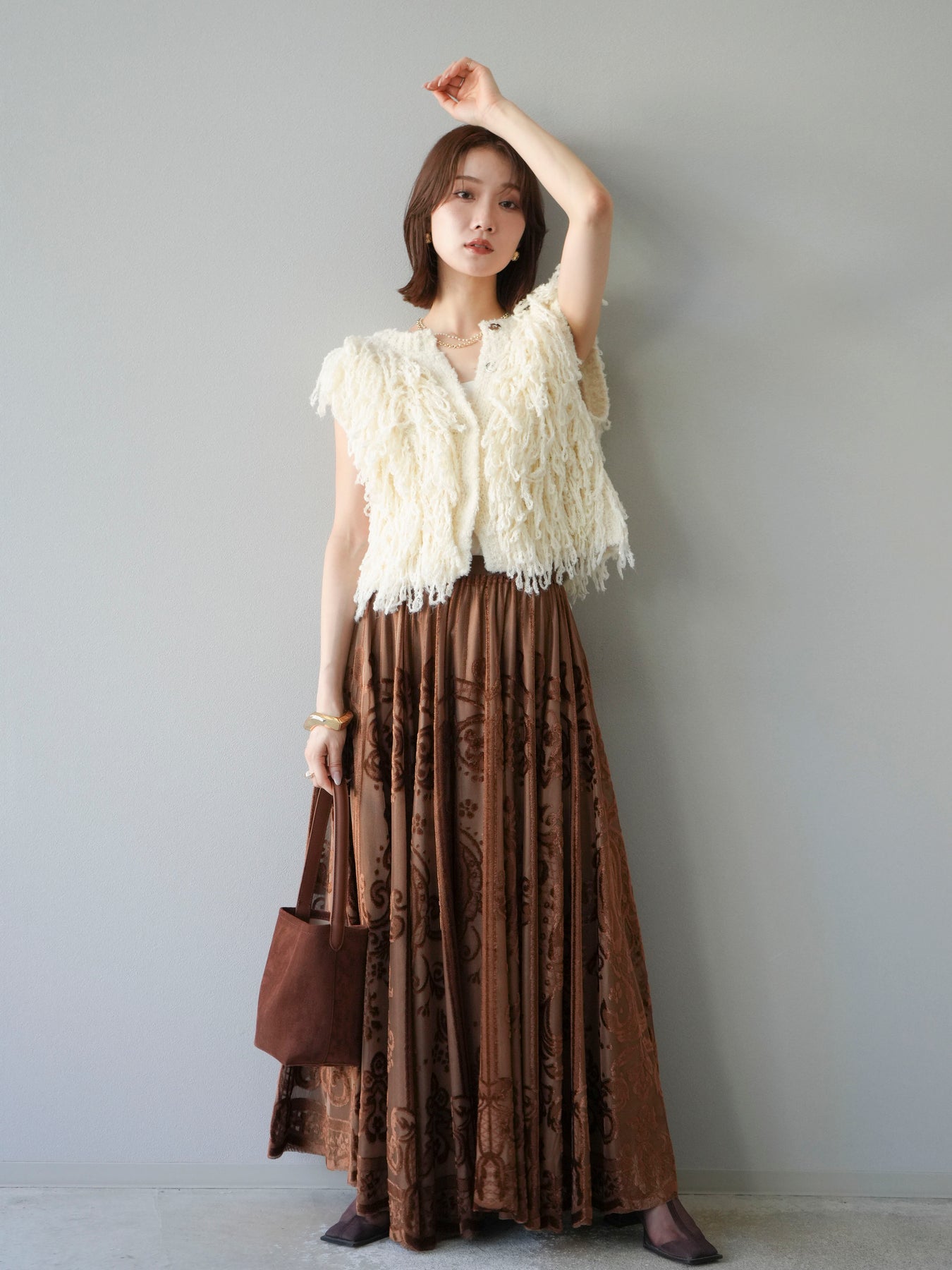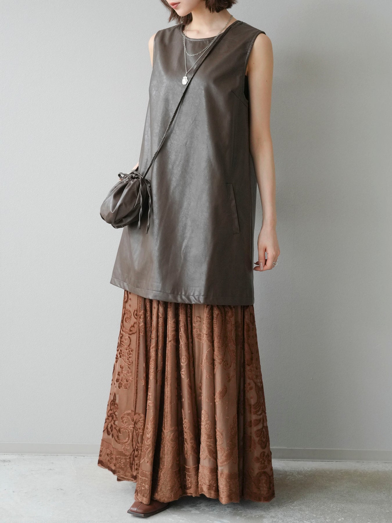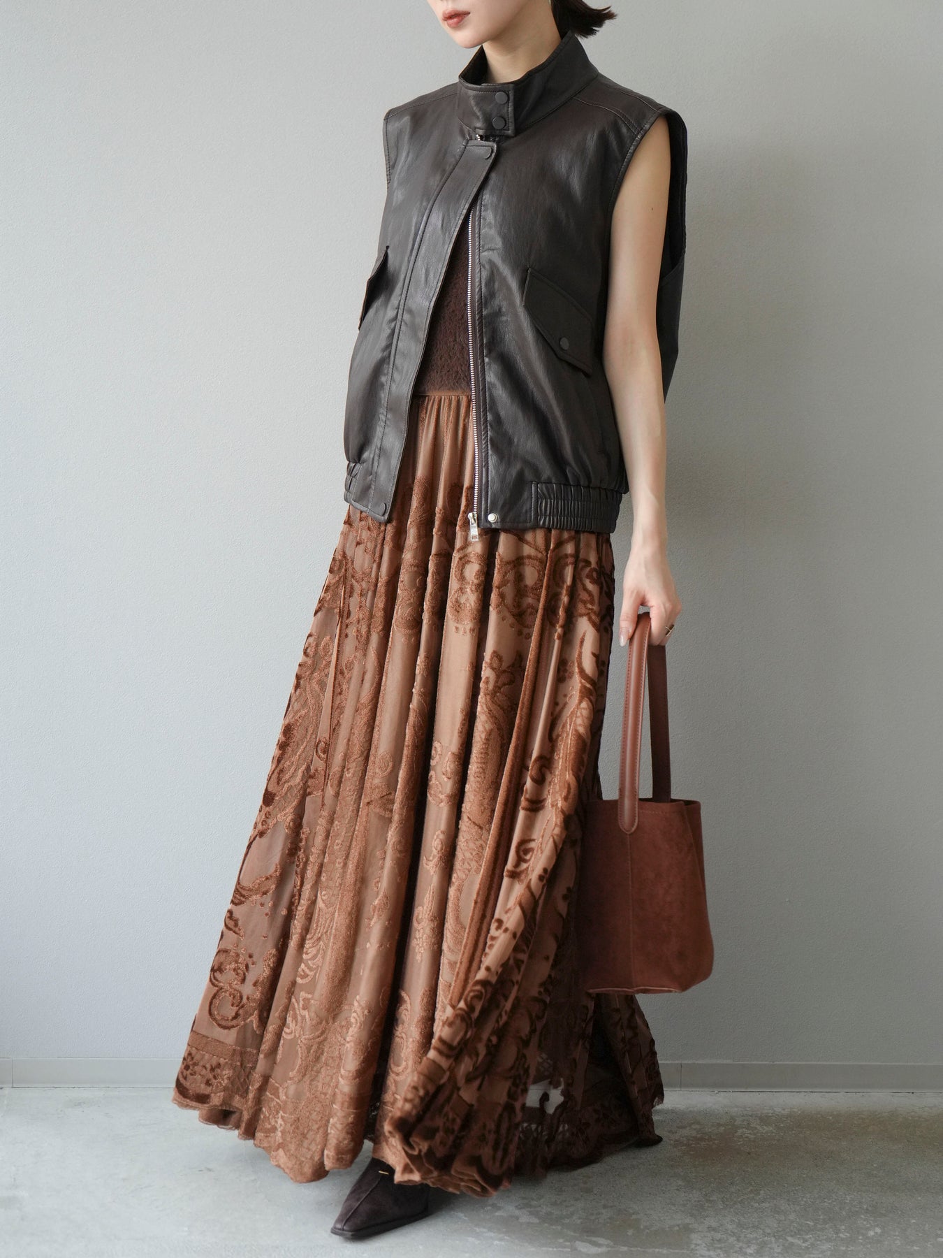 [予約]アンティーク柄フロッキーマキシスカート/ブラウン