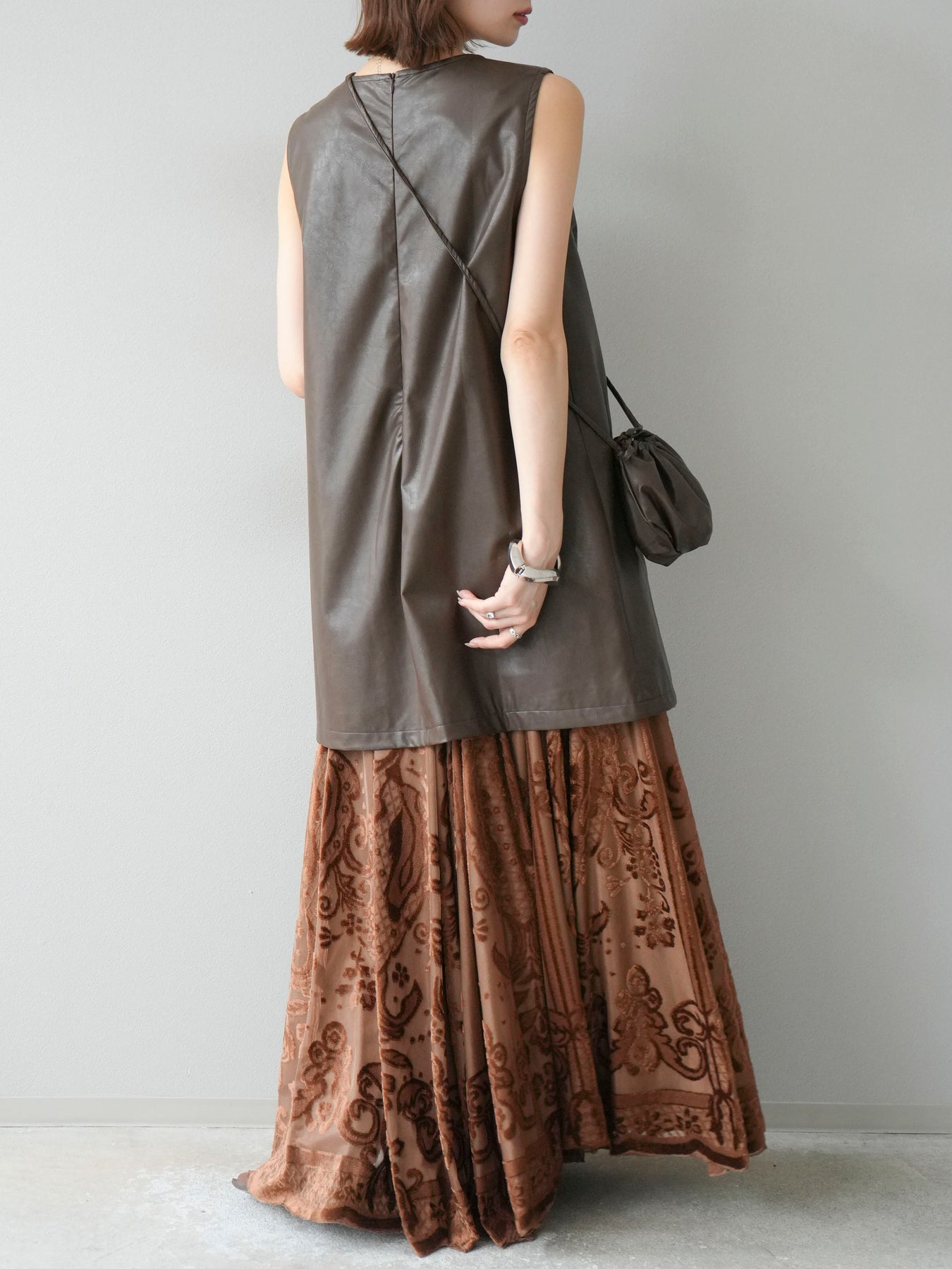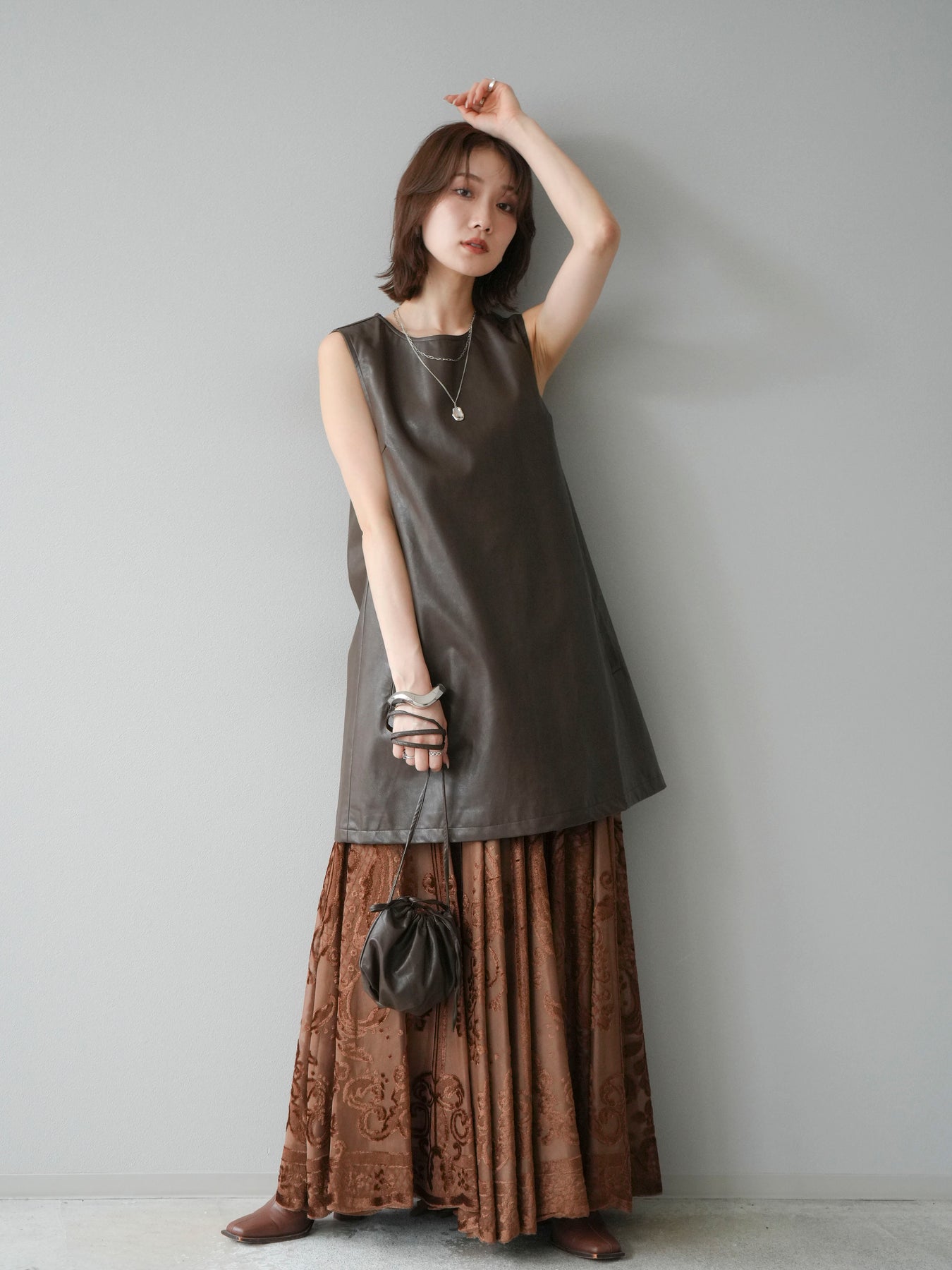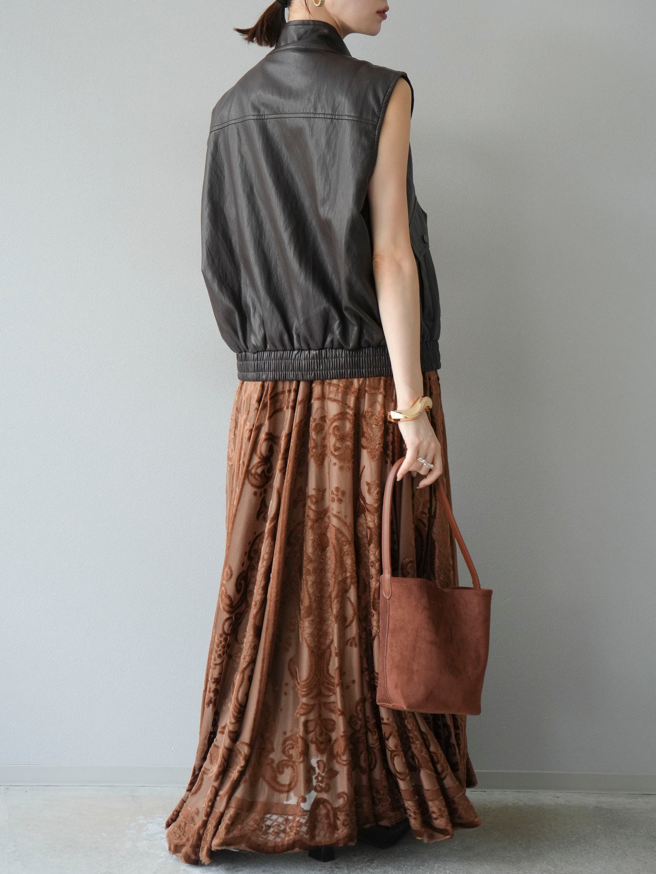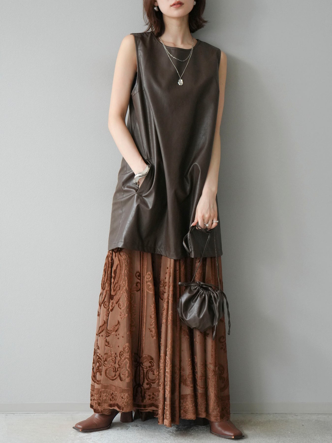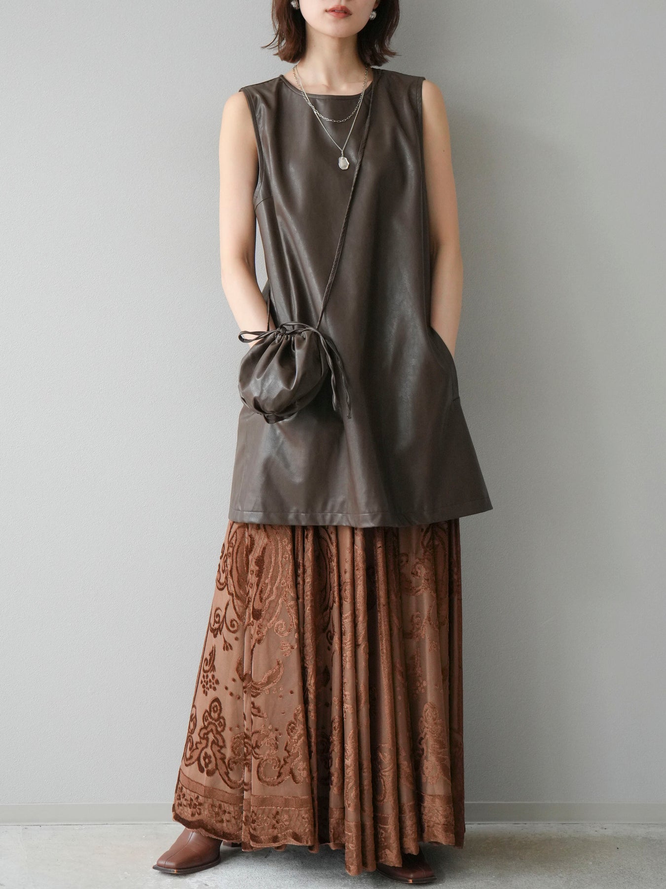 [予約]アンティーク柄フロッキーマキシスカート/ブラウン