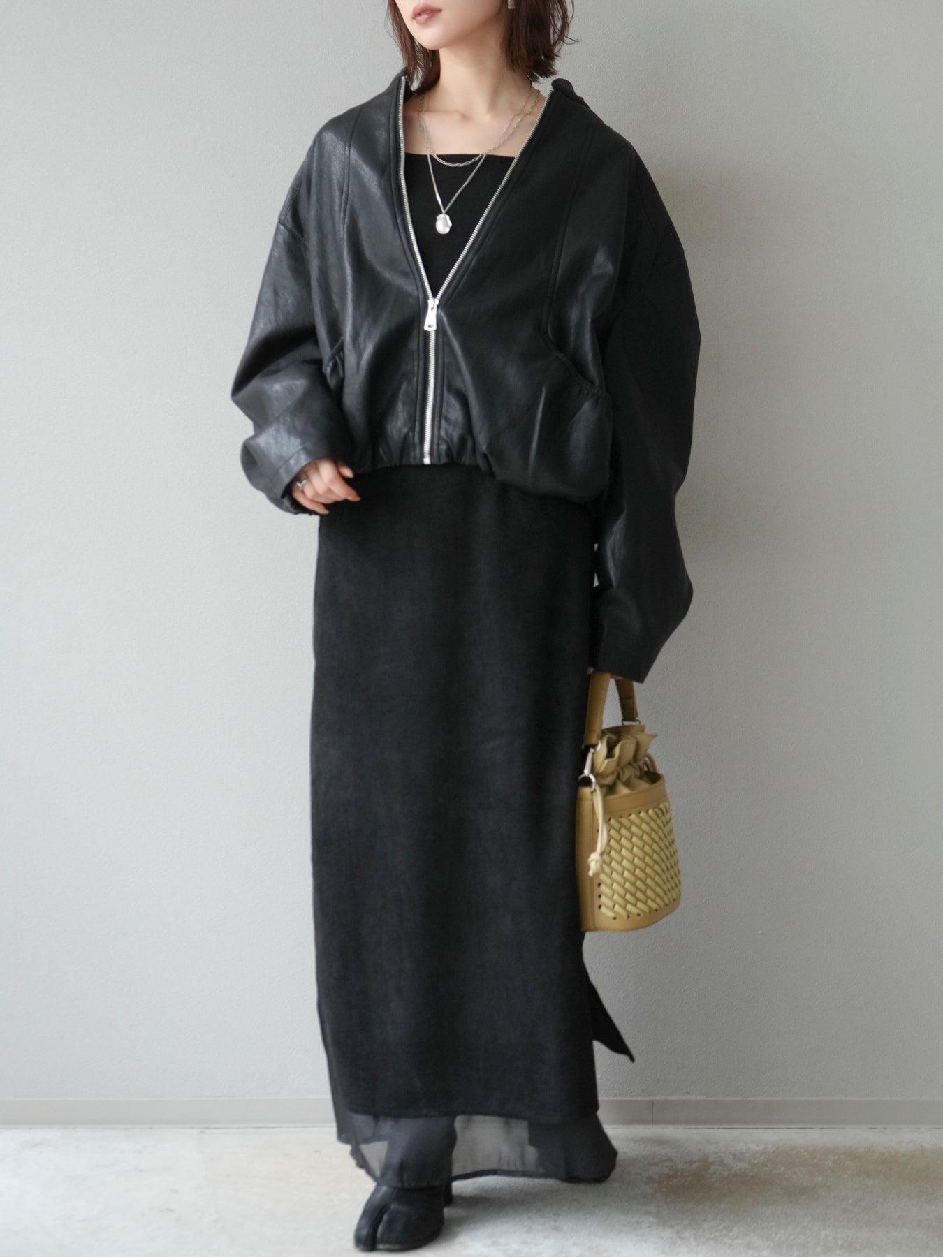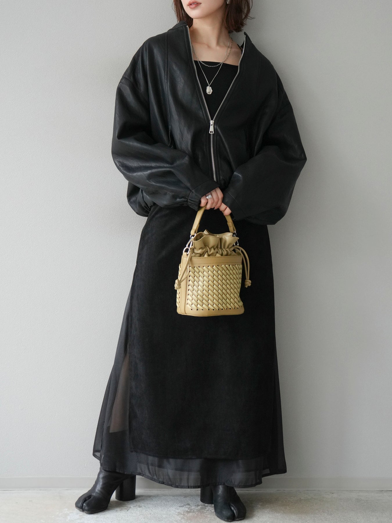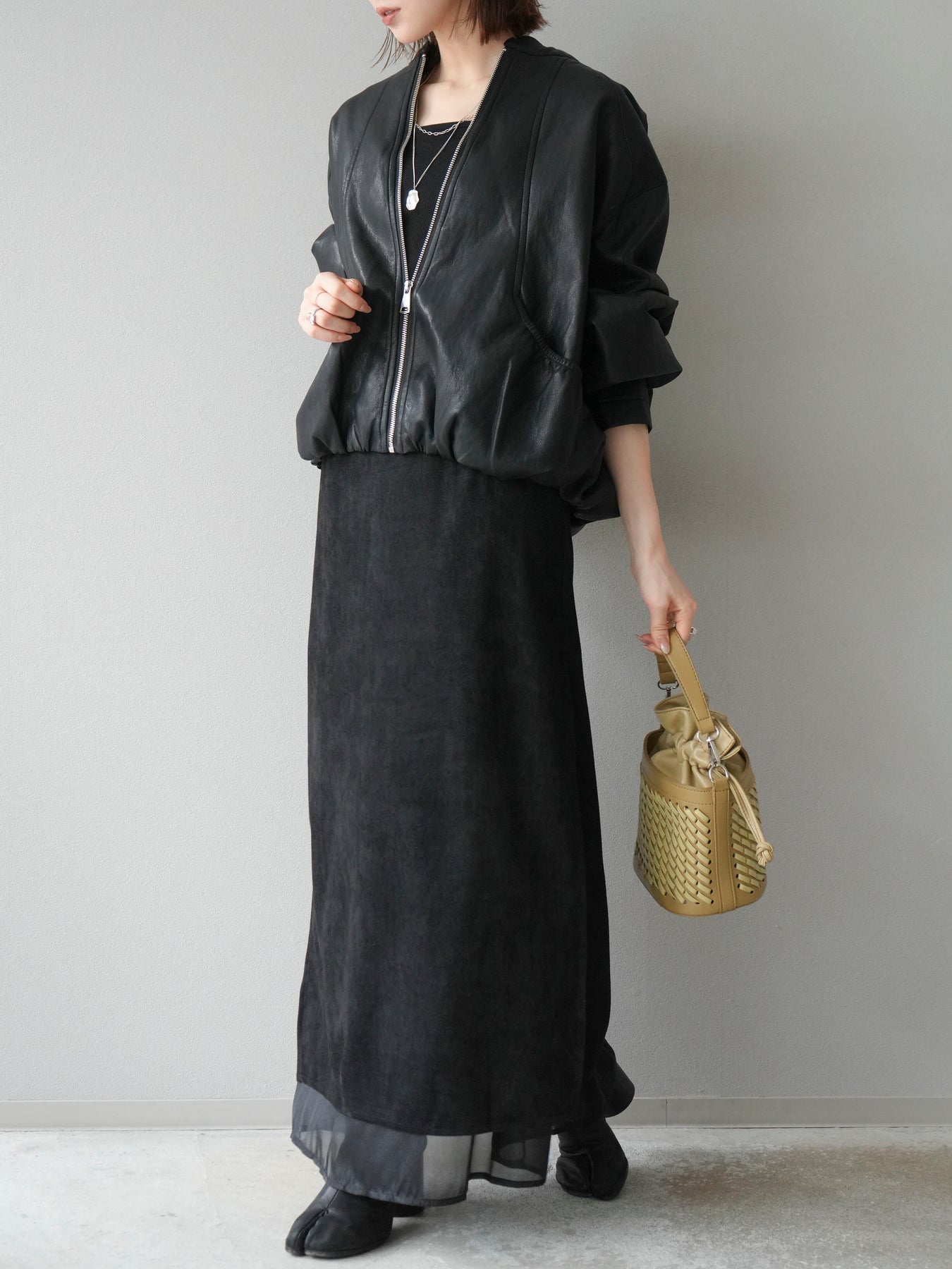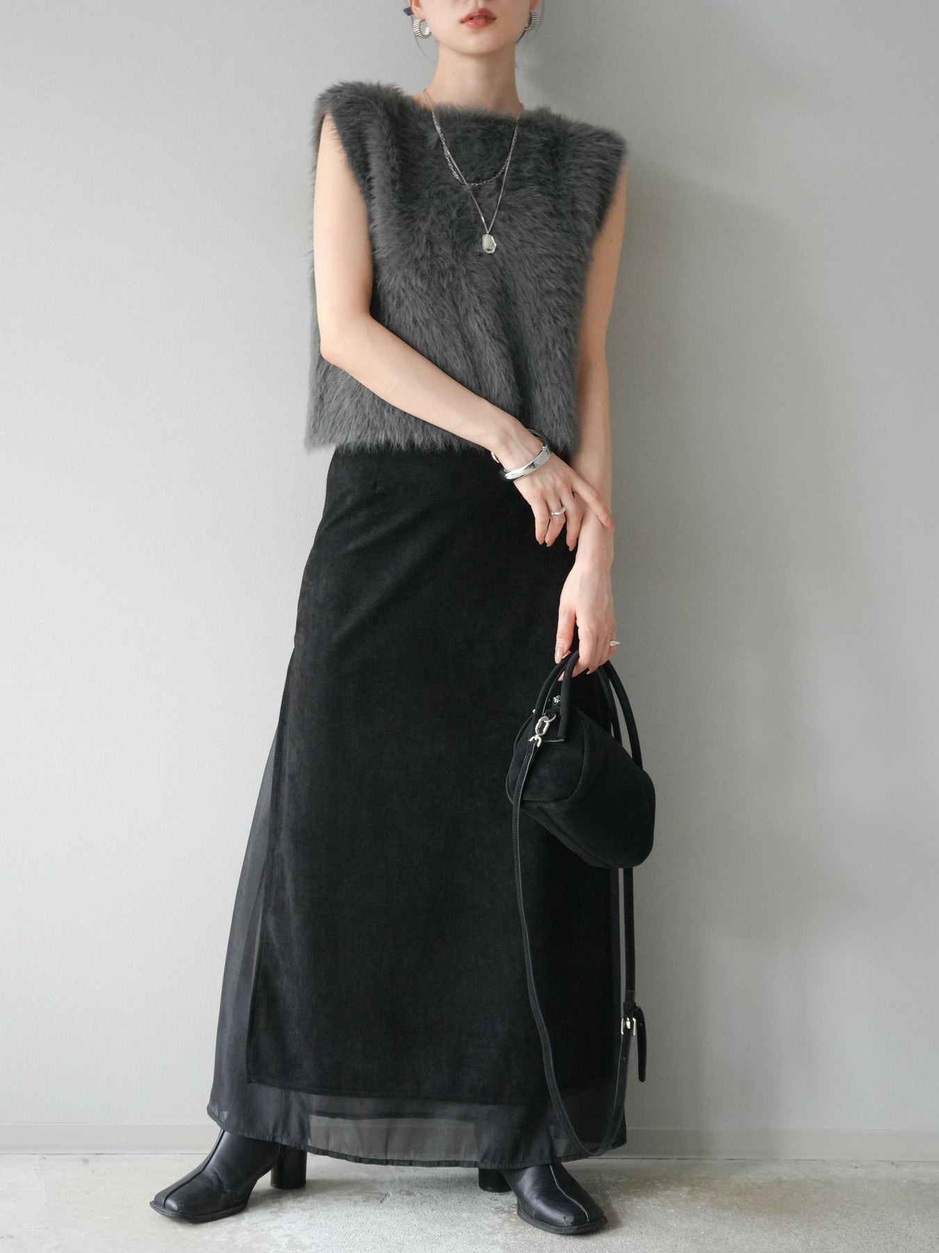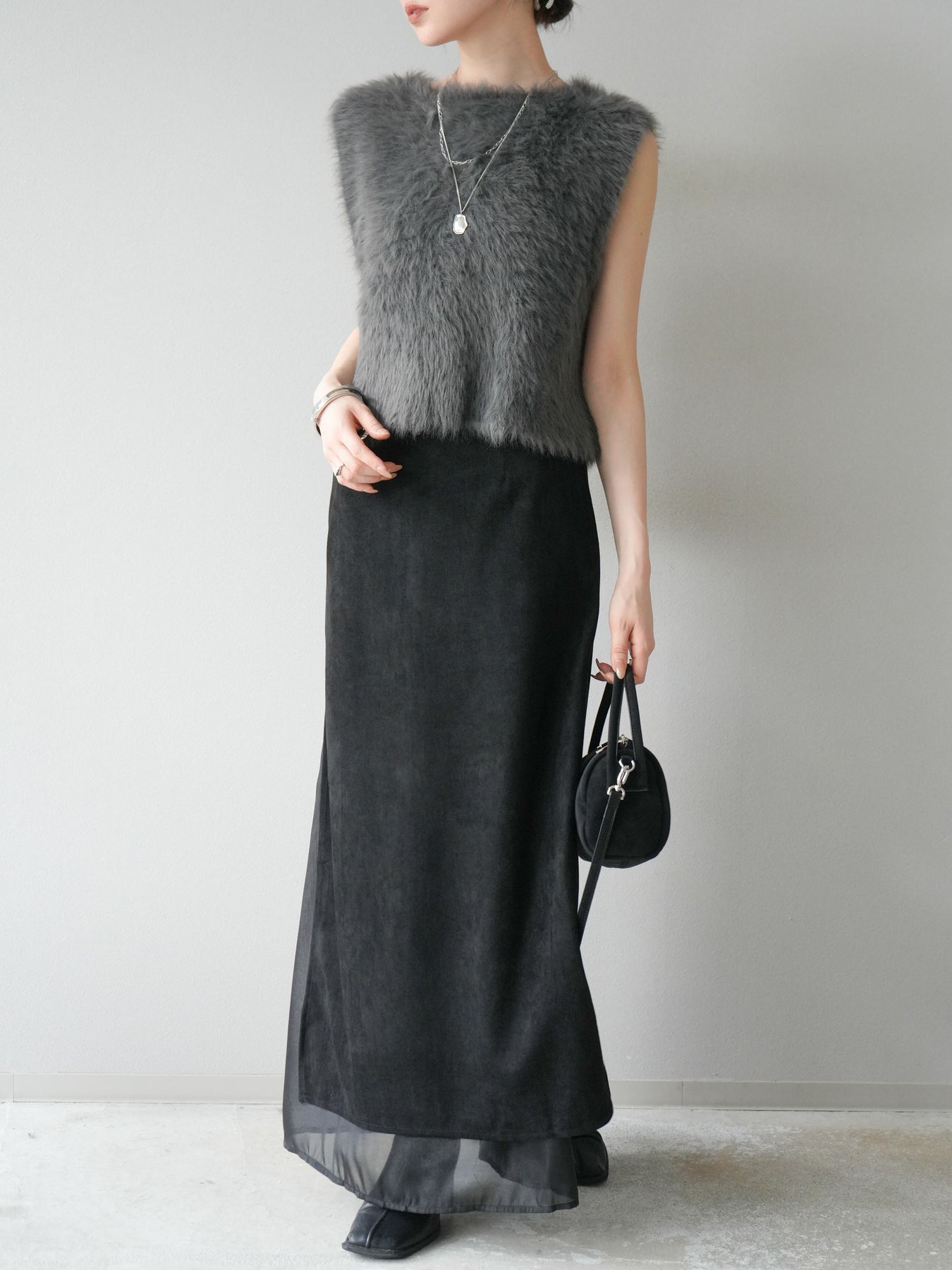 [予約]サイドスリットスウェードドッキングシフォンスカート/ブラック