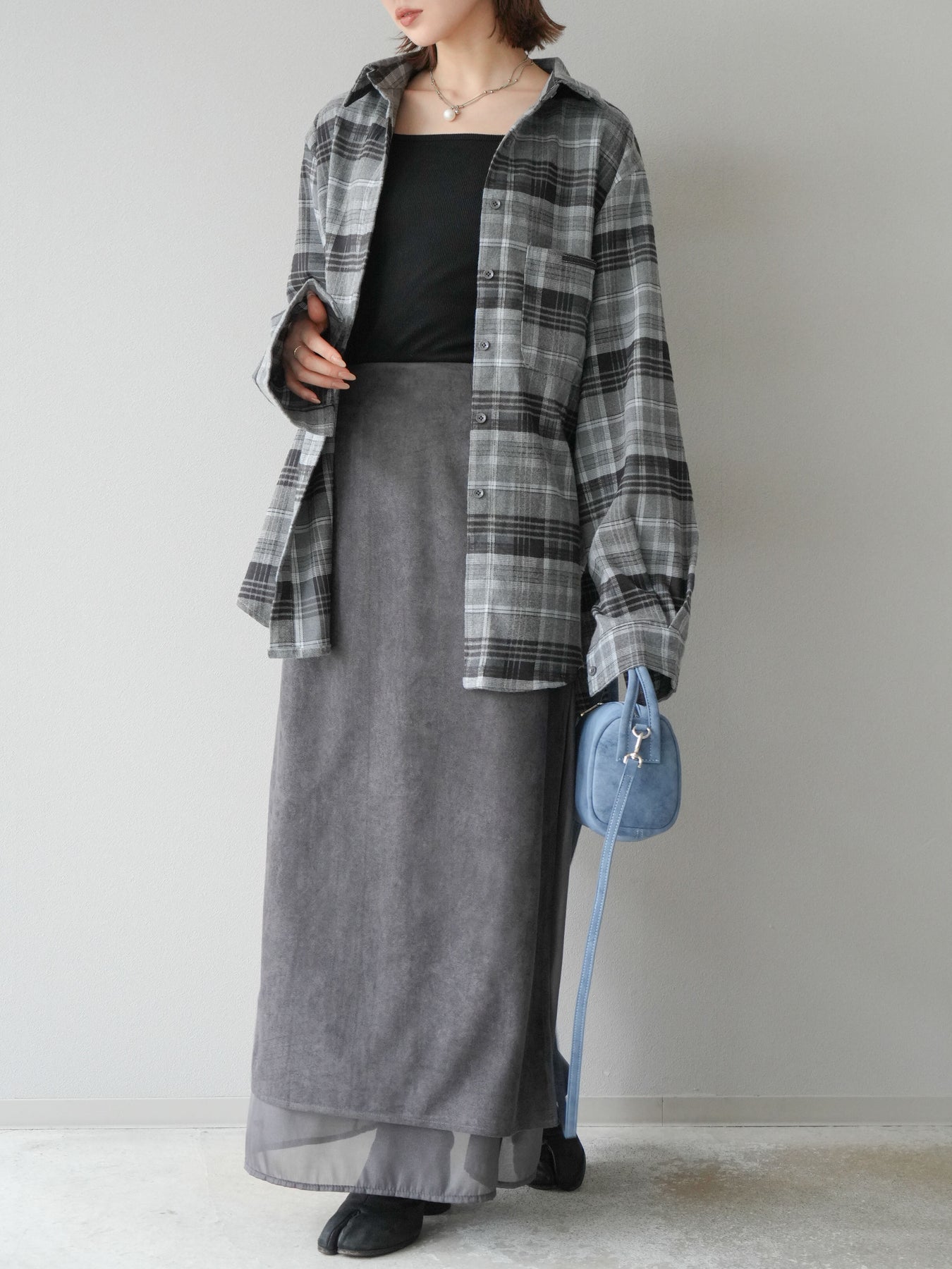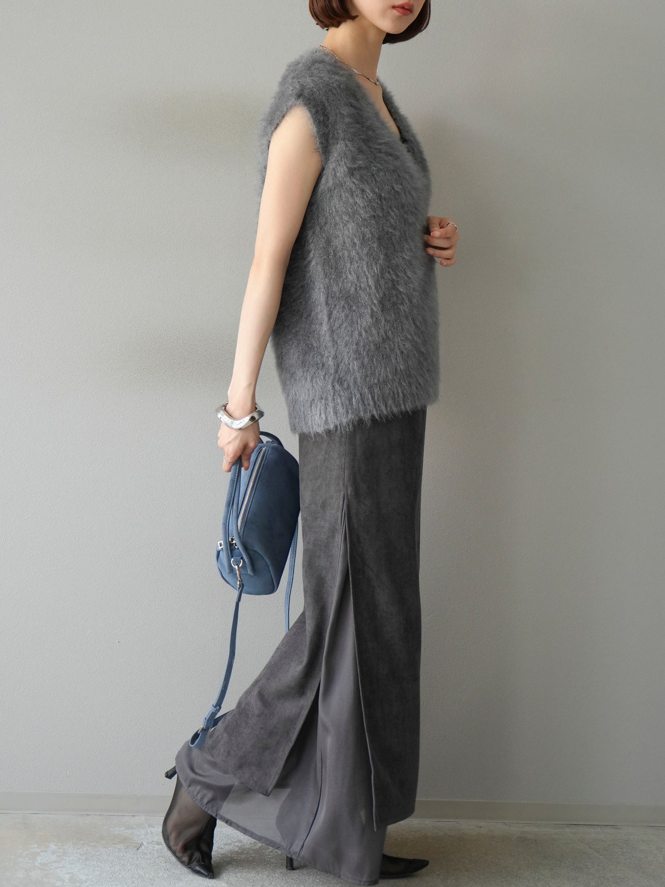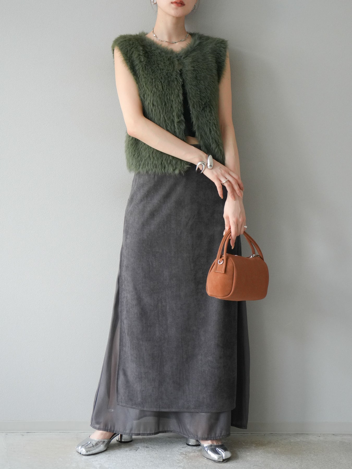 [予約]サイドスリットスウェードドッキングシフォンスカート/グレー