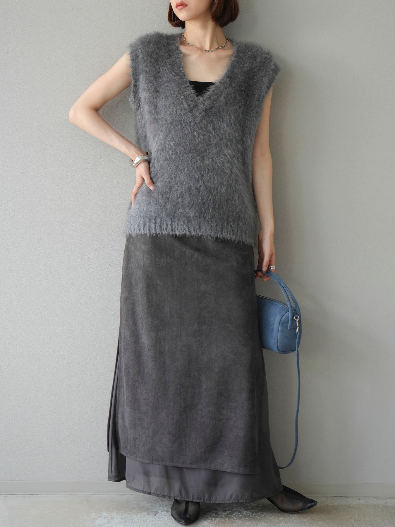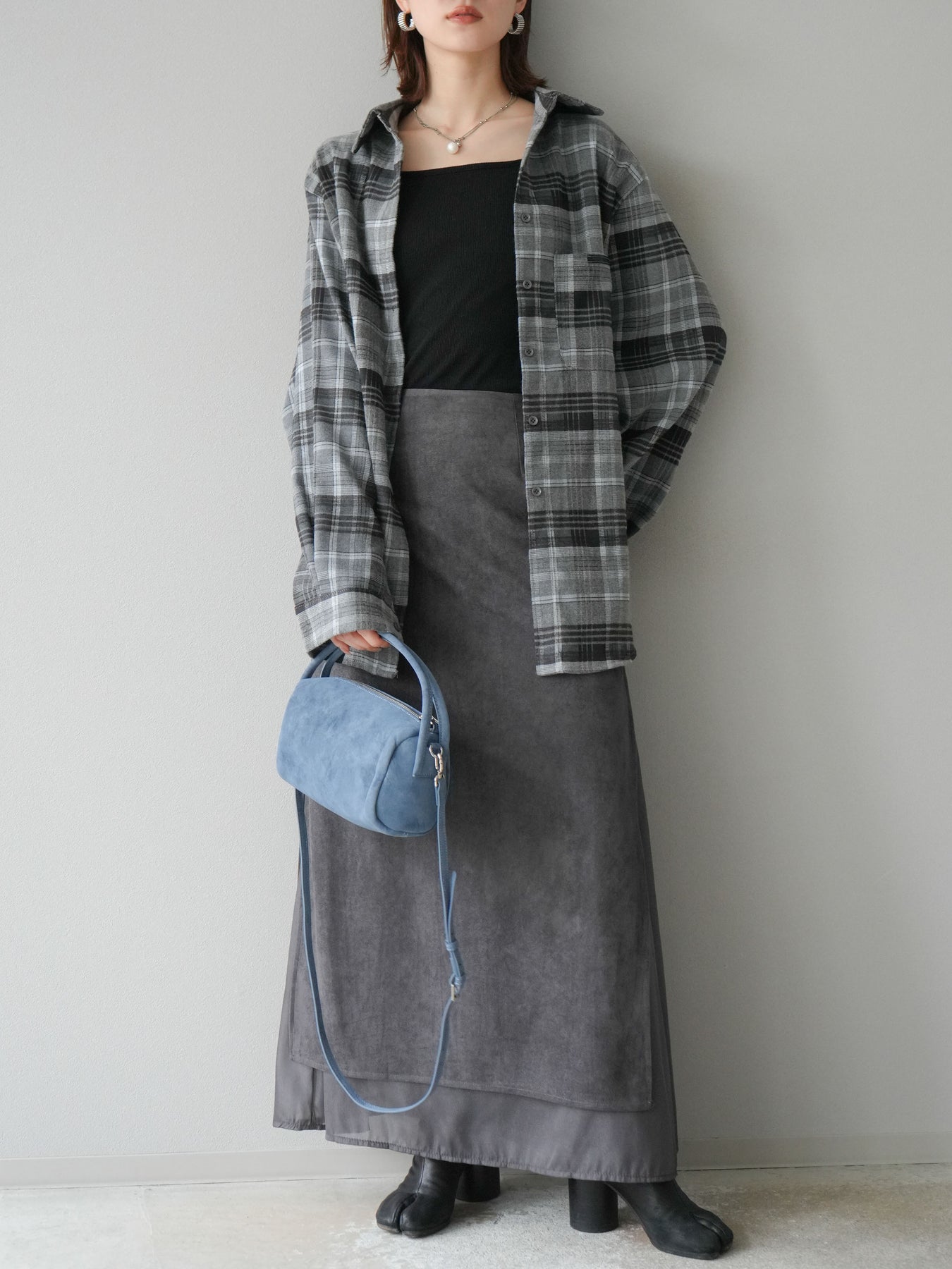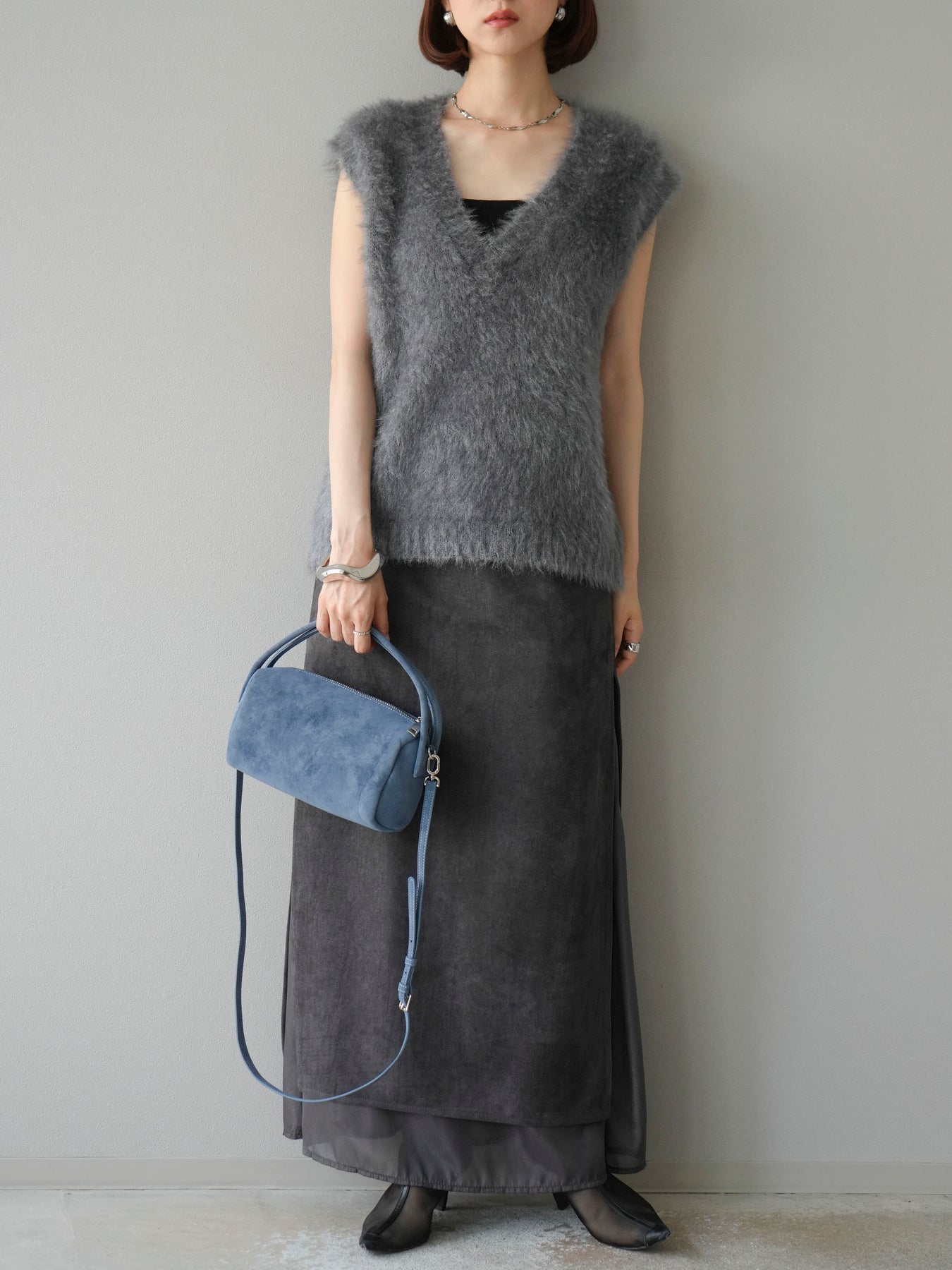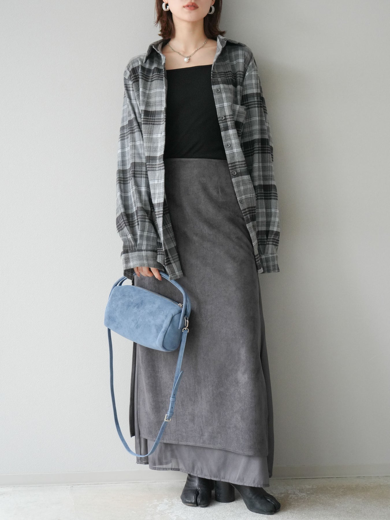 [予約]サイドスリットスウェードドッキングシフォンスカート/グレー