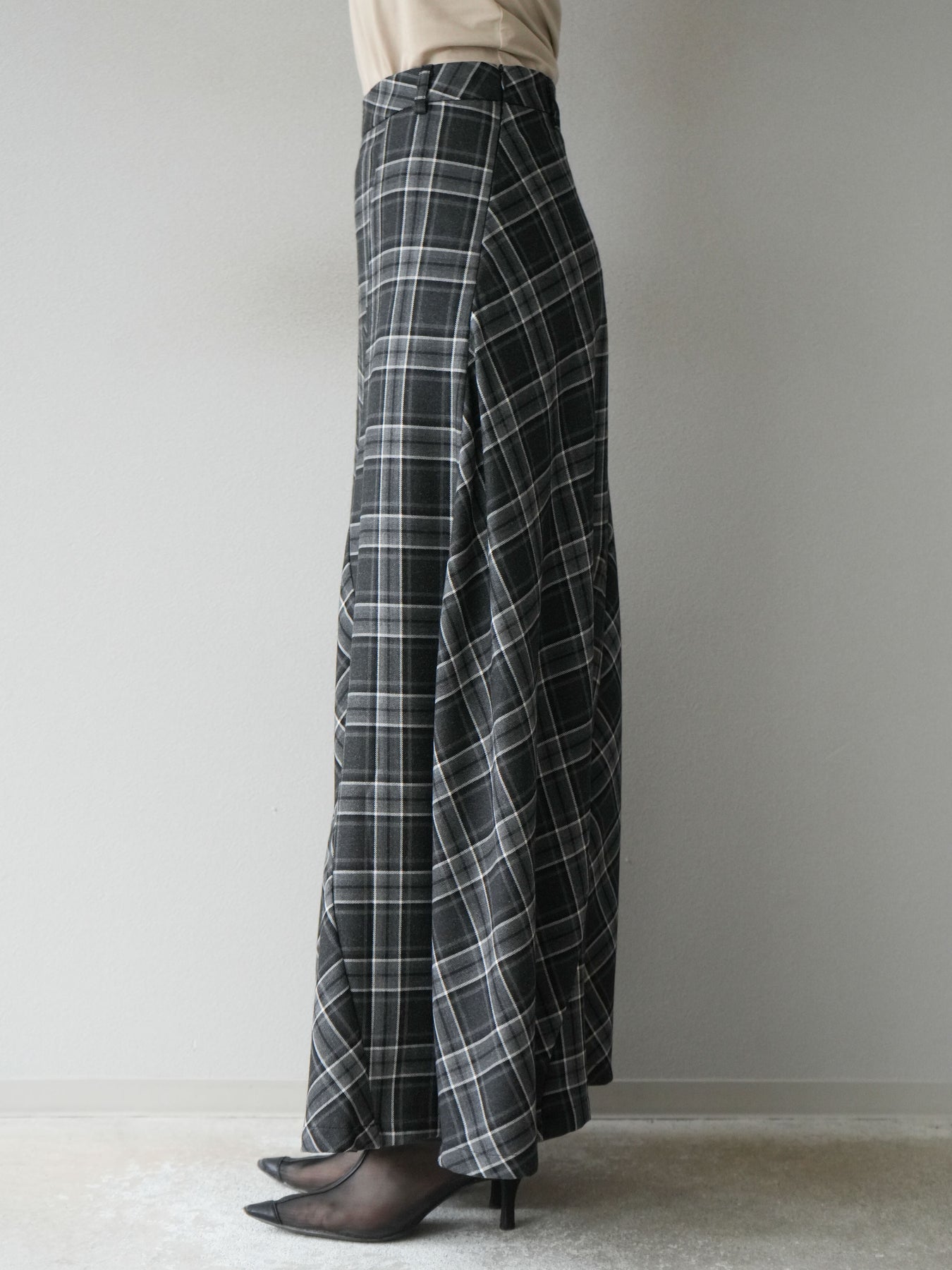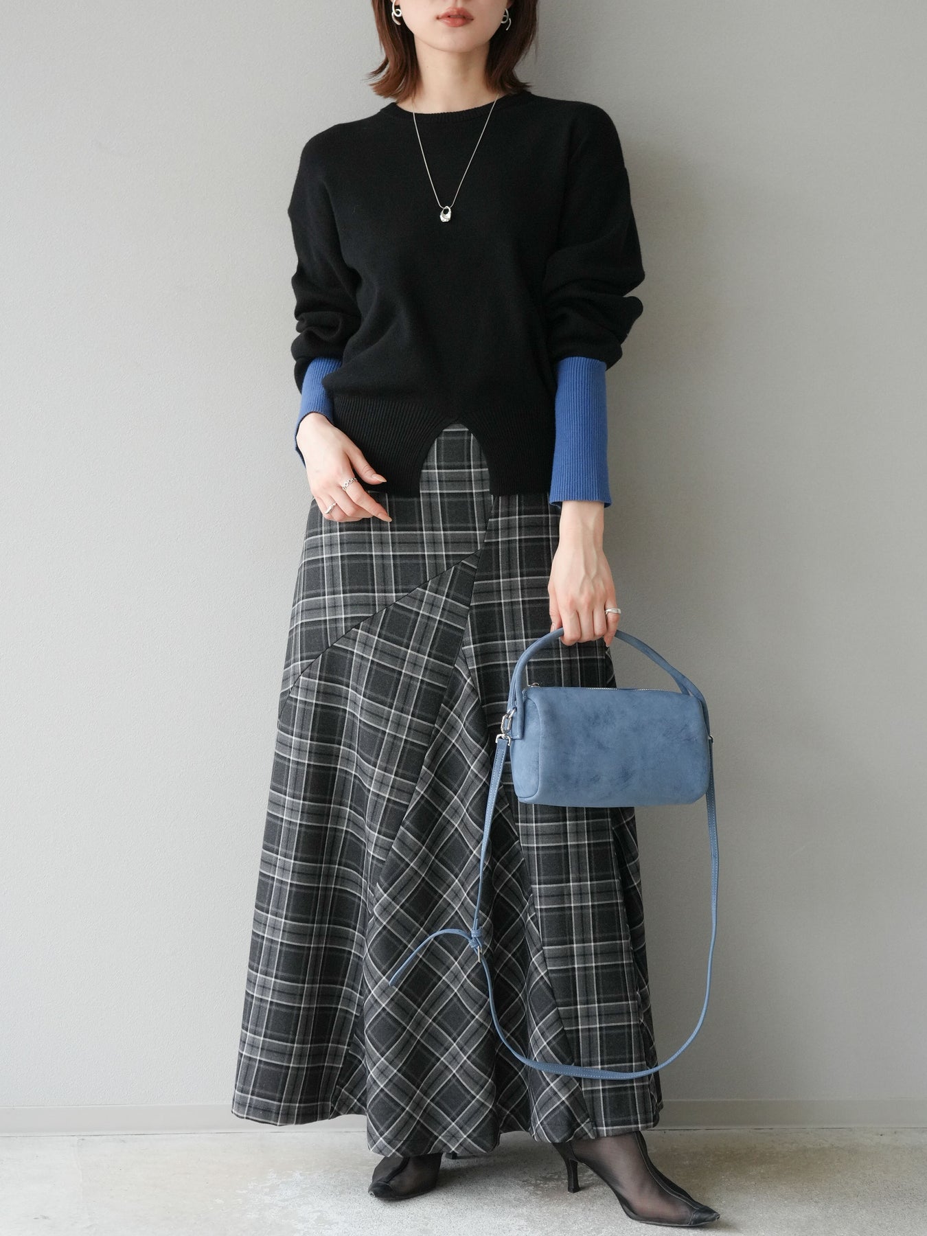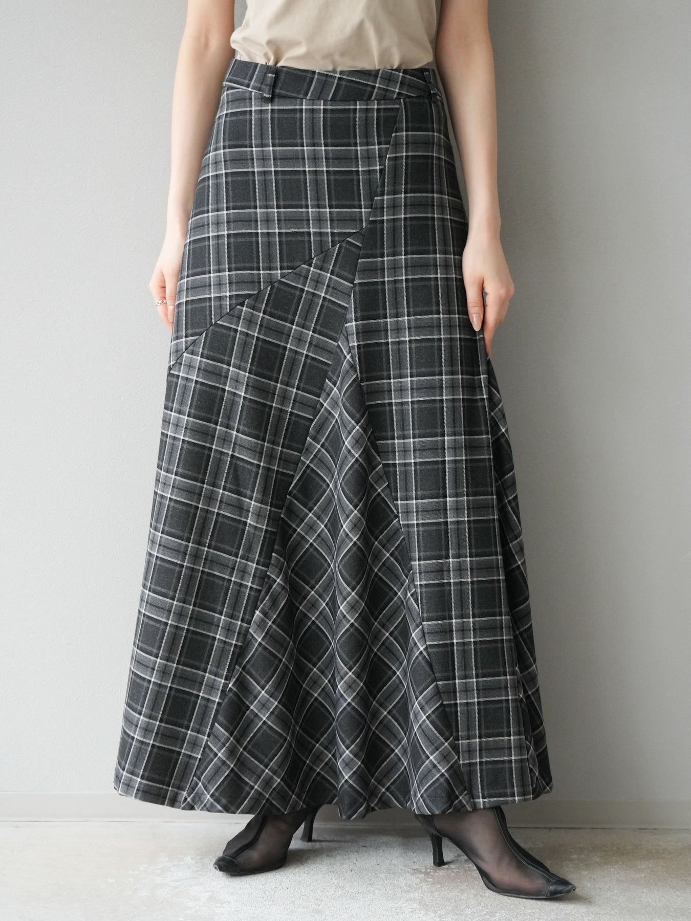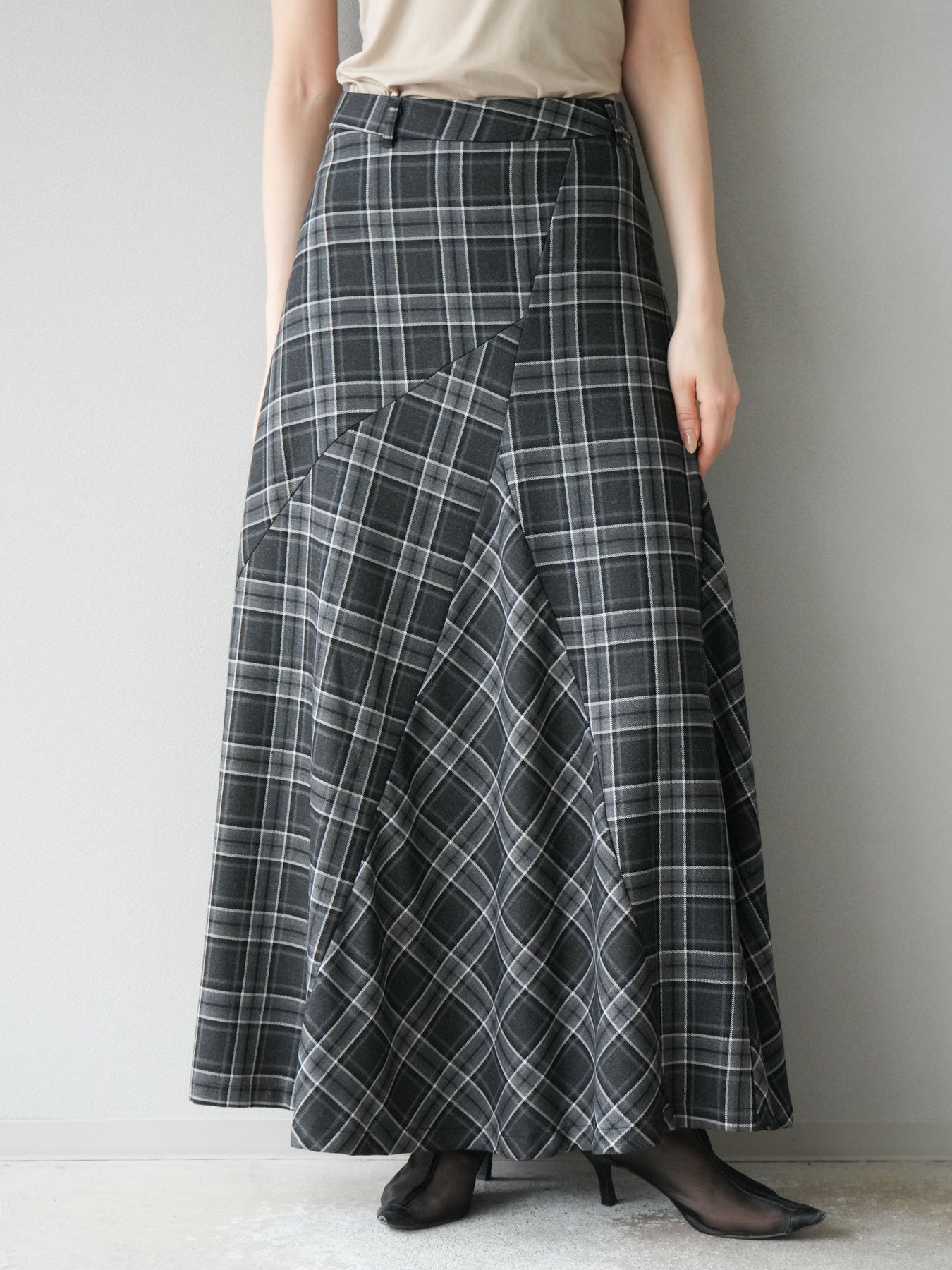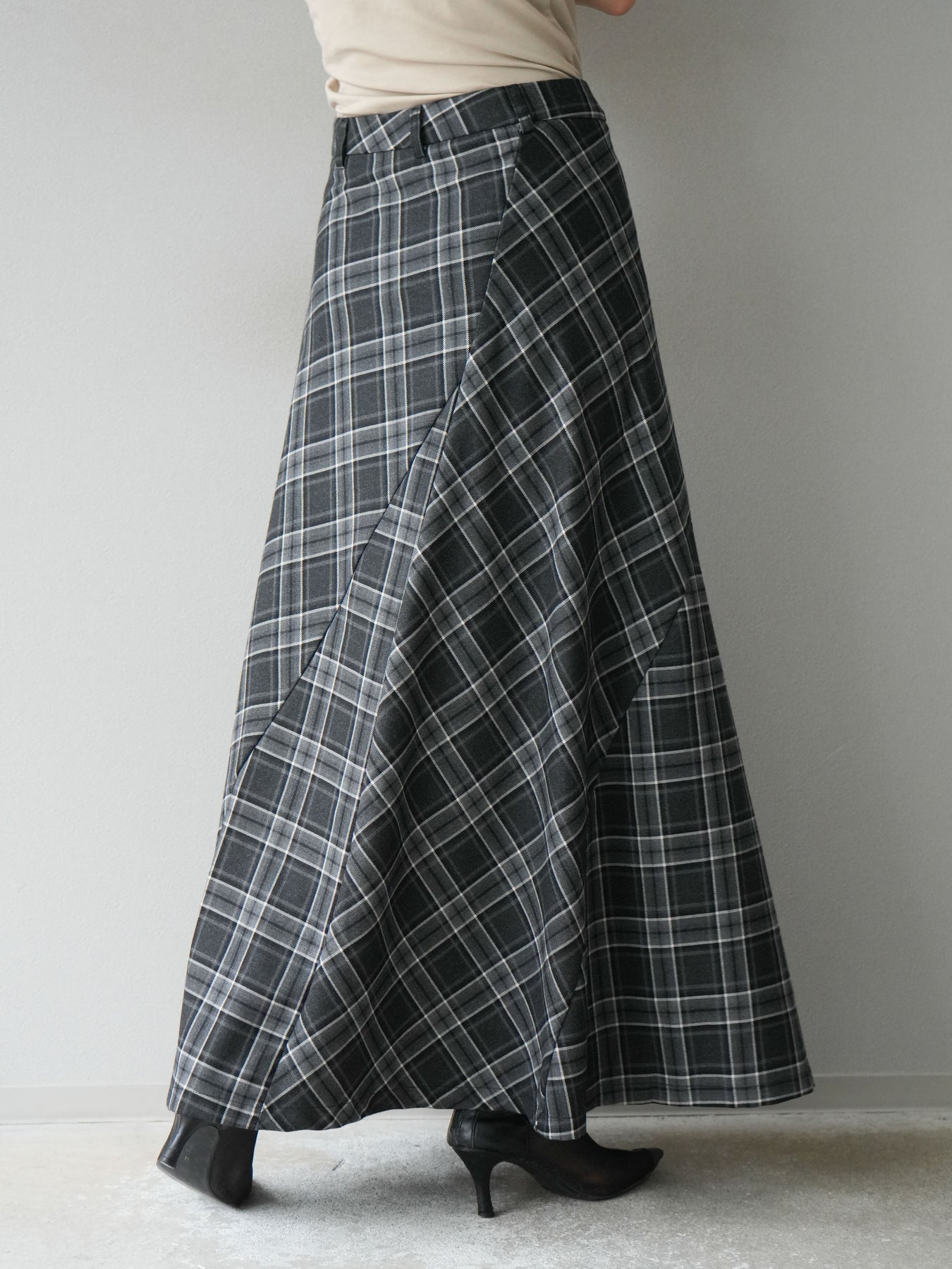 チェック柄を切り替えで組み合わせ、動きのある表情をプラスしたマーメイドスカート。裾にかけて広がるシルエットが女性らしいラインを描きつつ、上品な揺れ感を演出します。ウエスト周りはすっきりと仕上げているため、トップスをインしても美しくまとまるデザイン。シャツやブラウスでクラシカルに、ニットやスウェットでカジュアルダウンも楽しめる、着回し力の高い一着です。シーズンレスで取り入れやすく、スタイリングを華やかに彩ります。