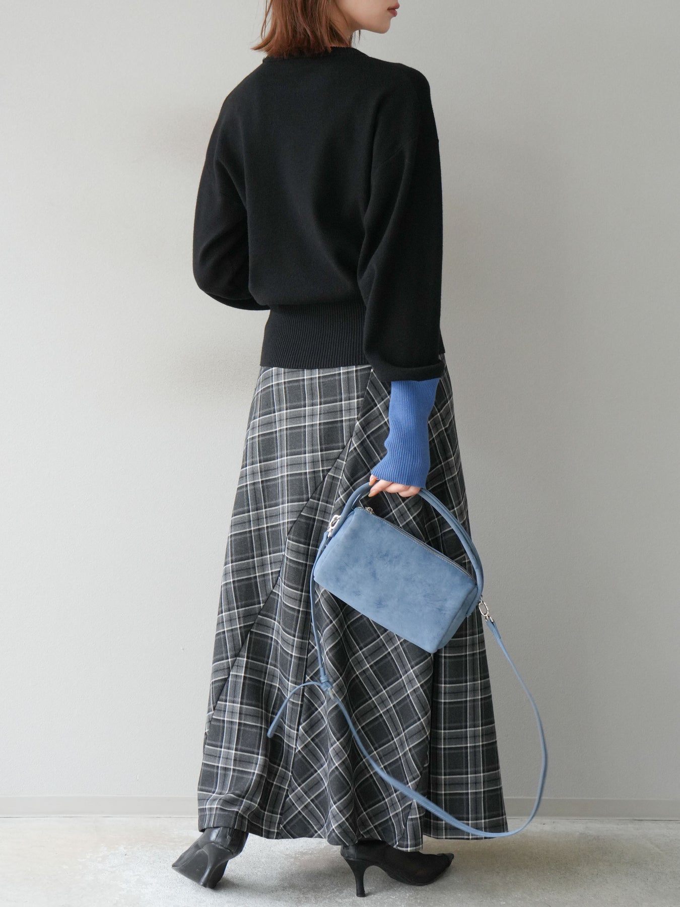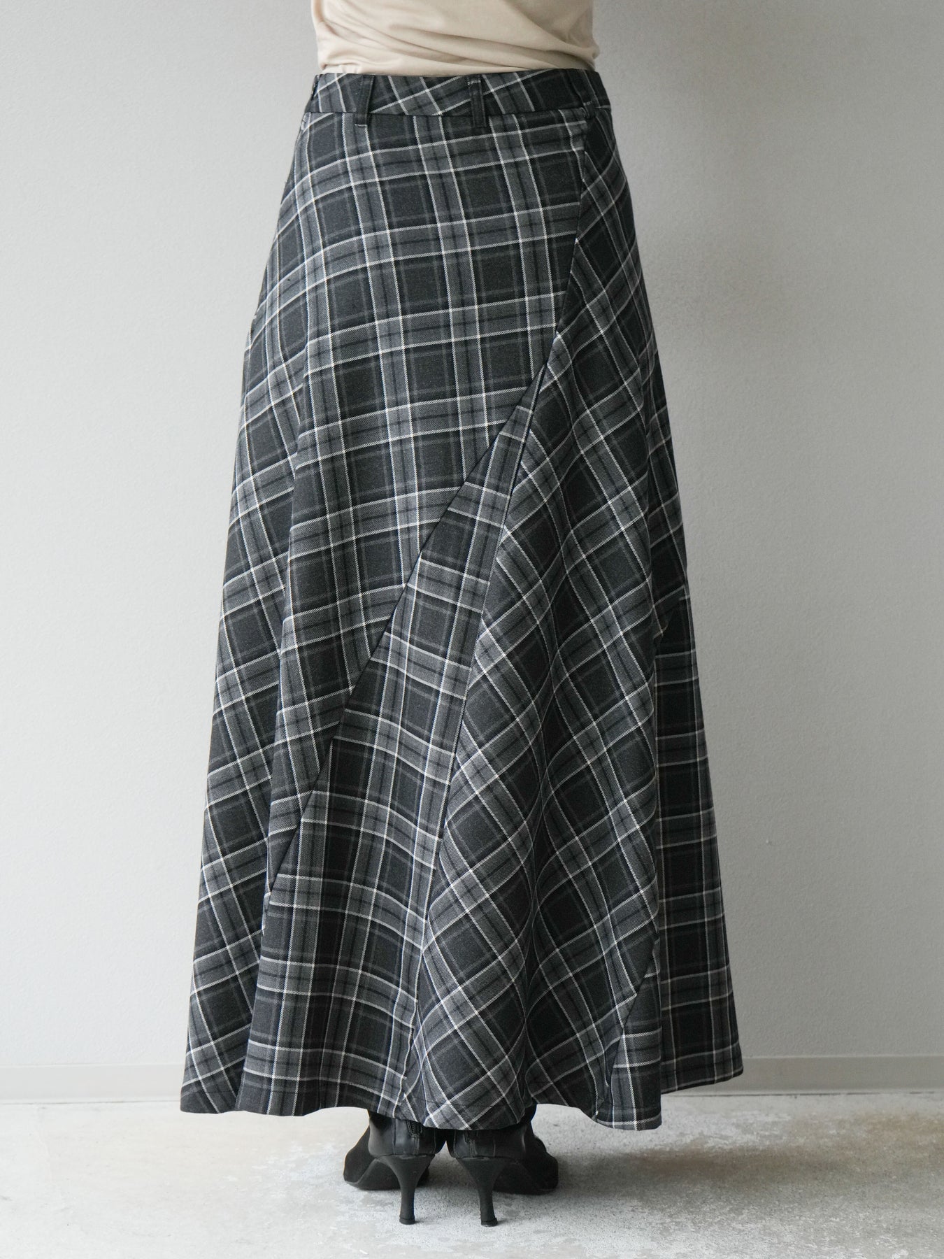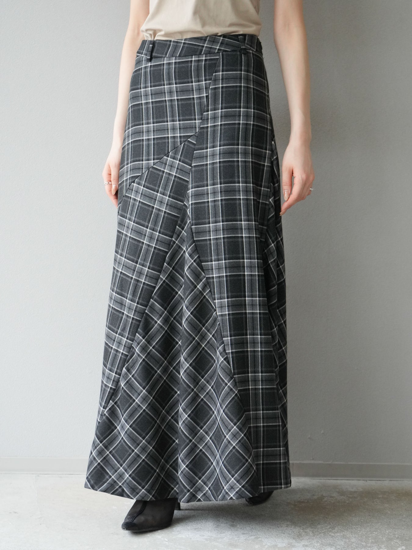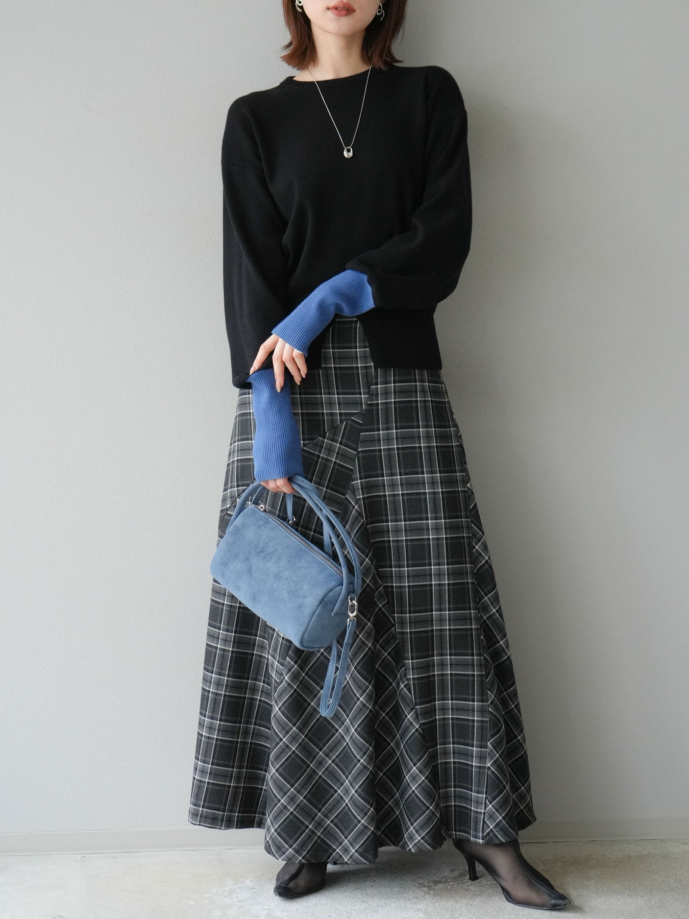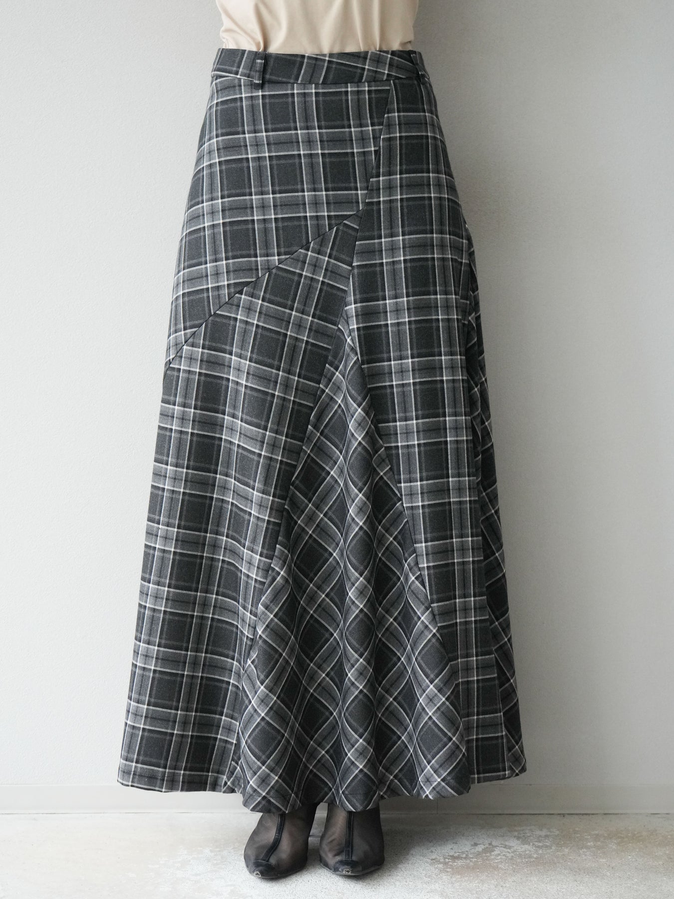チェック柄を切り替えで組み合わせ、動きのある表情をプラスしたマーメイドスカート。裾にかけて広がるシルエットが女性らしいラインを描きつつ、上品な揺れ感を演出します。ウエスト周りはすっきりと仕上げているため、トップスをインしても美しくまとまるデザイン。シャツやブラウスでクラシカルに、ニットやスウェットでカジュアルダウンも楽しめる、着回し力の高い一着です。シーズンレスで取り入れやすく、スタイリングを華やかに彩ります。