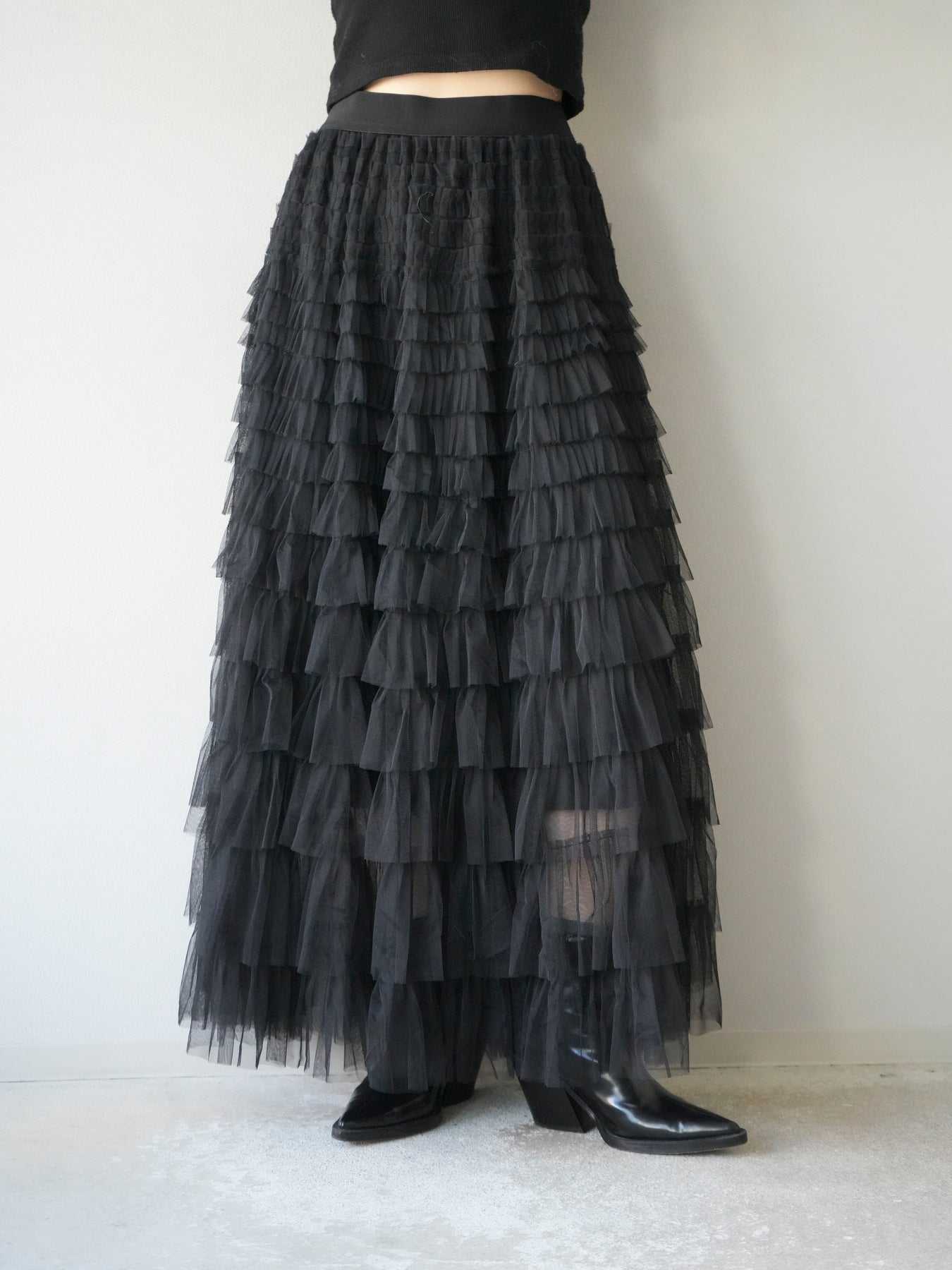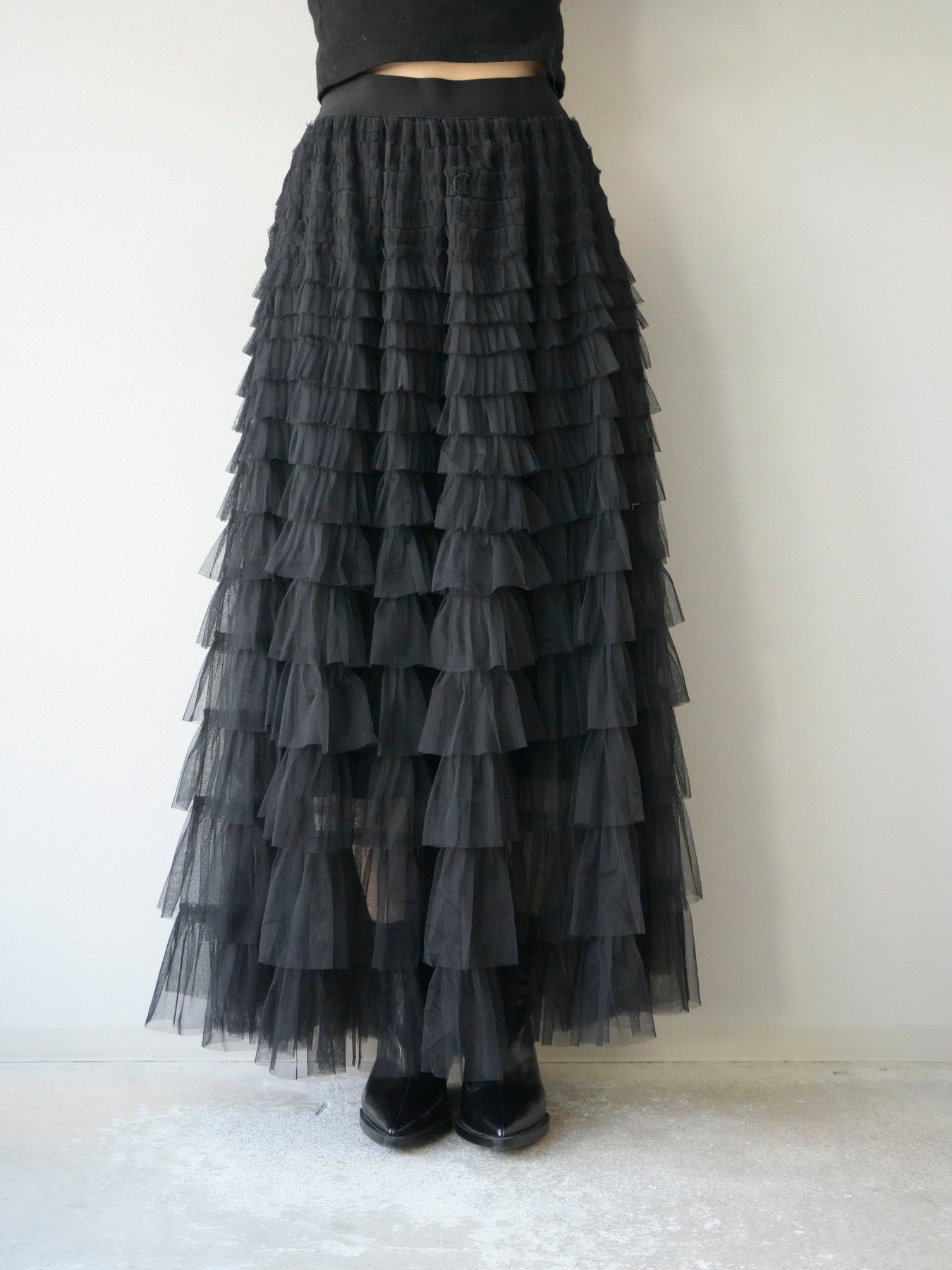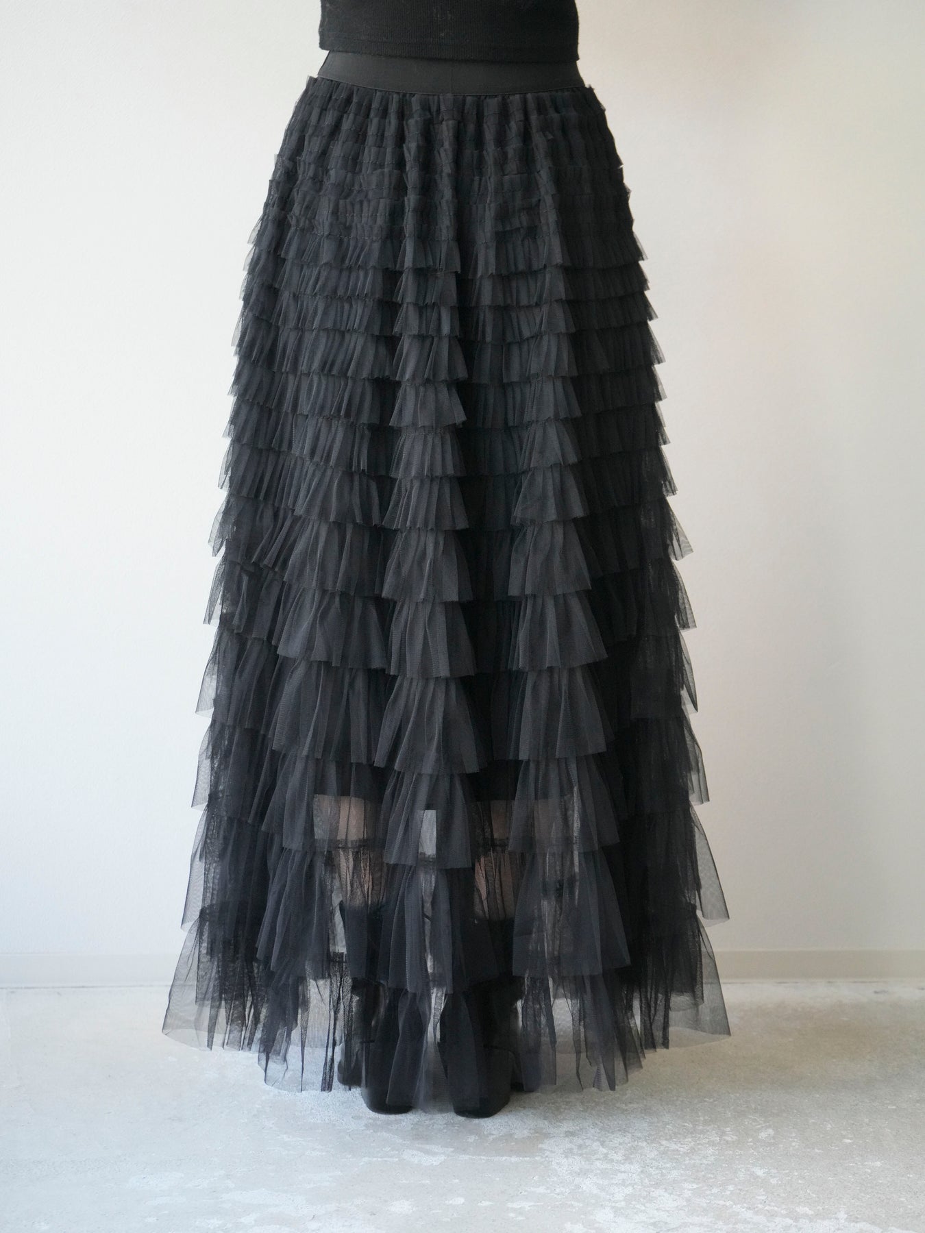 繊細なチュールを幾重にも重ねたティアードデザインが華やかなスカート。動くたびに軽やかに揺れるシルエットが、スタイリングに存在感をプラスします。ウエストはゴム仕様でリラックス感のある穿き心地ながら、ボリューム感のあるティアードがフェミニンさを引き立てる一着。シンプルなトップスを合わせればスカートが主役になり、ジャケットやニットと合わせればドレッシーにもカジュアルにも着こなせます。特別なシーンからデイリー使いまで幅広く活躍できるアイテムです。