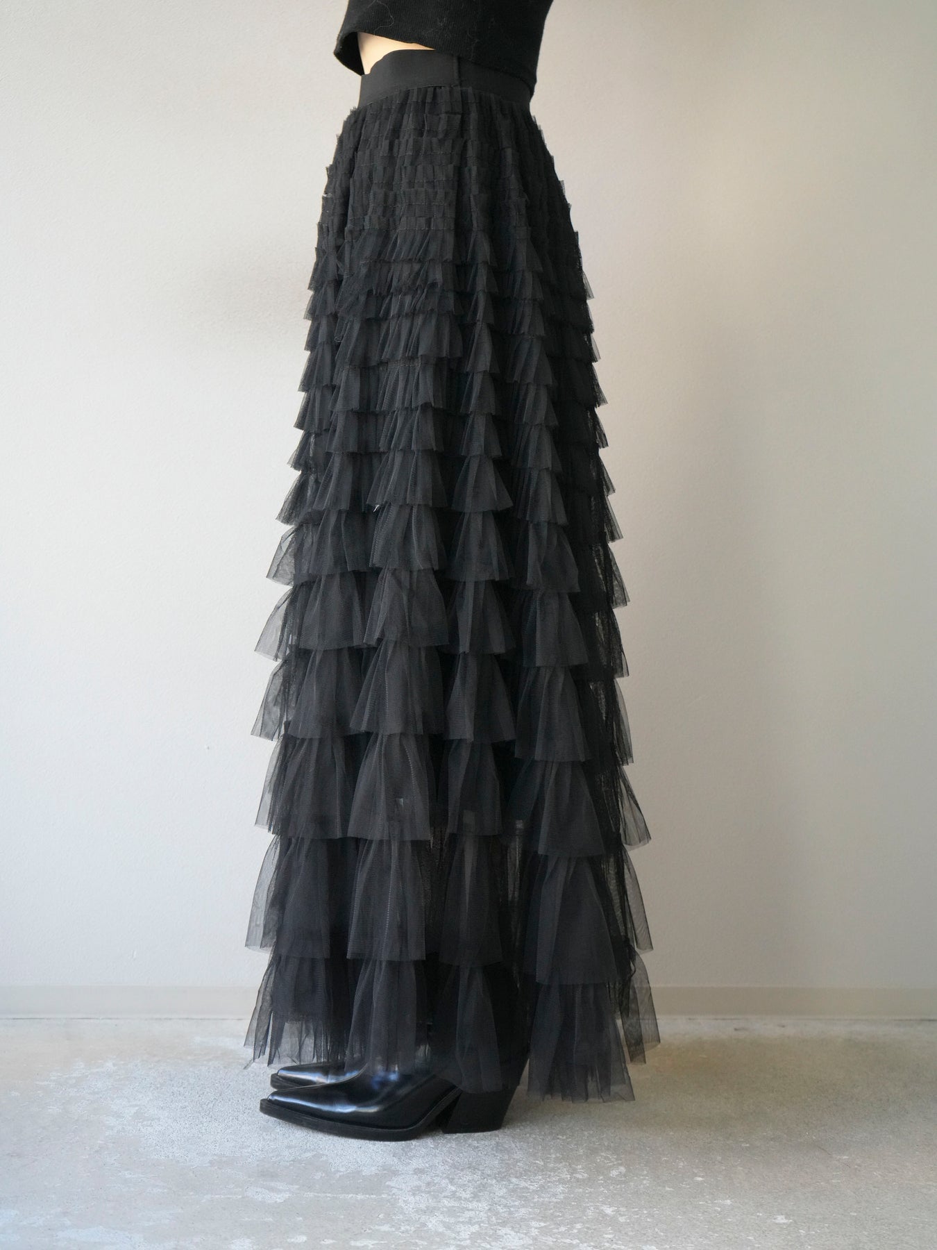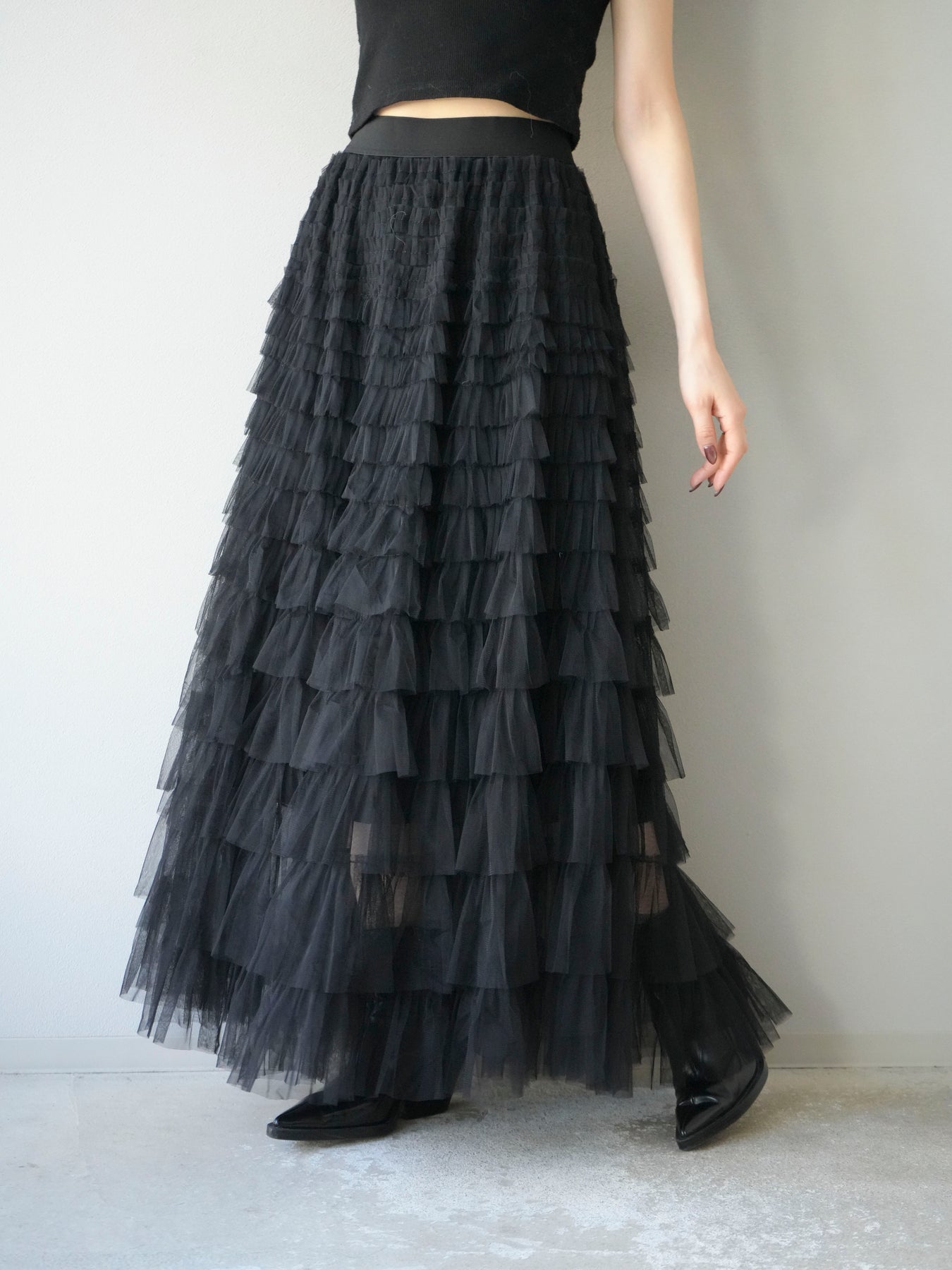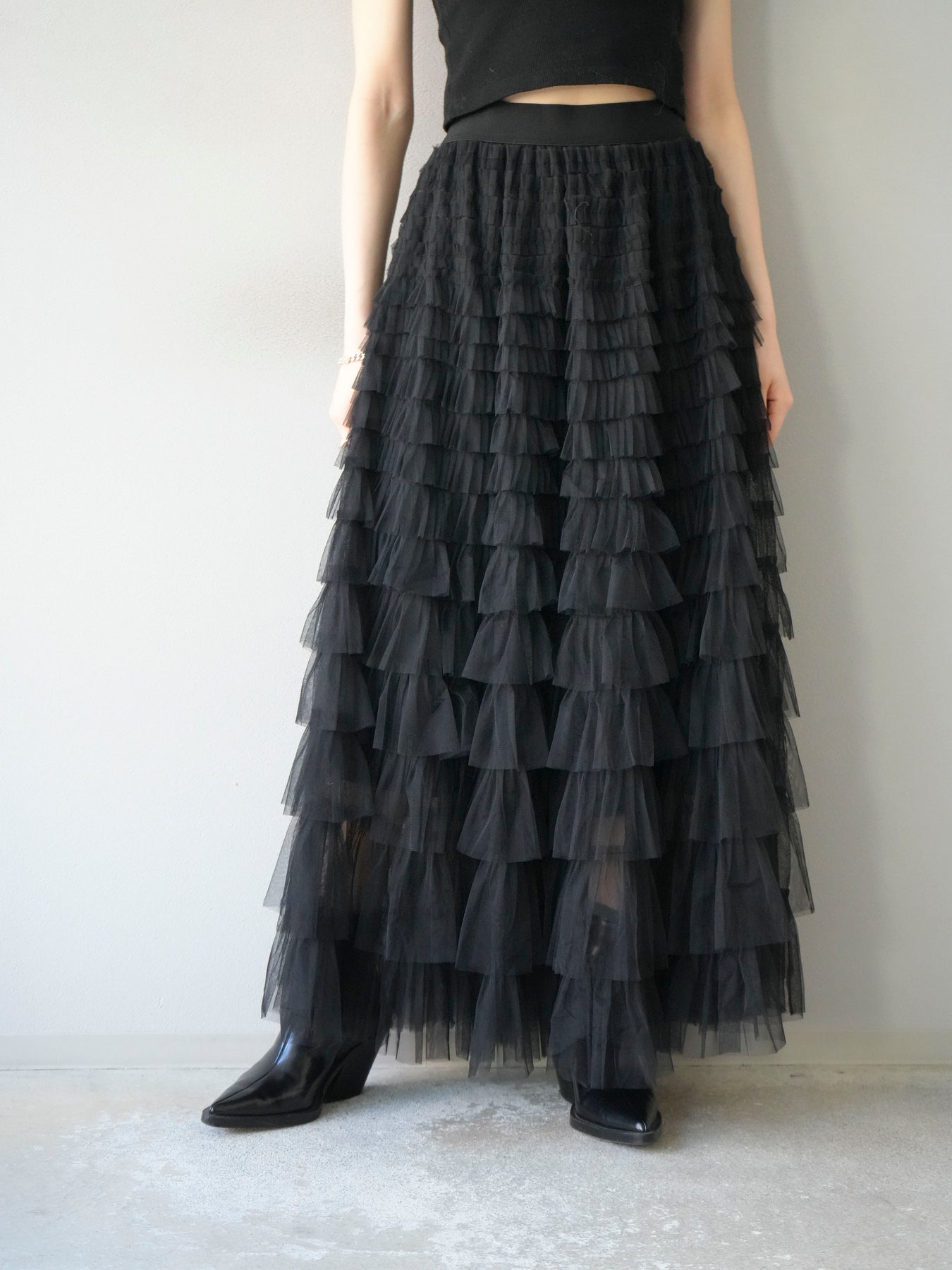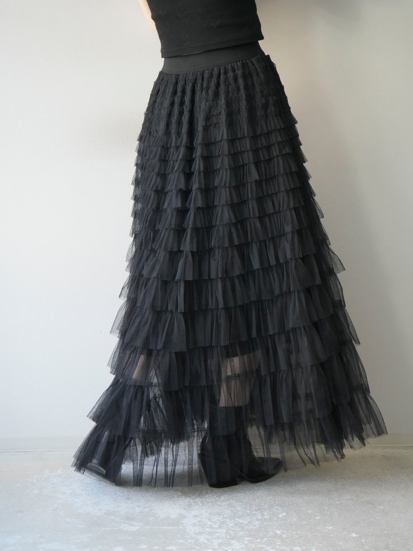 繊細なチュールを幾重にも重ねたティアードデザインが華やかなスカート。動くたびに軽やかに揺れるシルエットが、スタイリングに存在感をプラスします。ウエストはゴム仕様でリラックス感のある穿き心地ながら、ボリューム感のあるティアードがフェミニンさを引き立てる一着。シンプルなトップスを合わせればスカートが主役になり、ジャケットやニットと合わせればドレッシーにもカジュアルにも着こなせます。特別なシーンからデイリー使いまで幅広く活躍できるアイテムです。