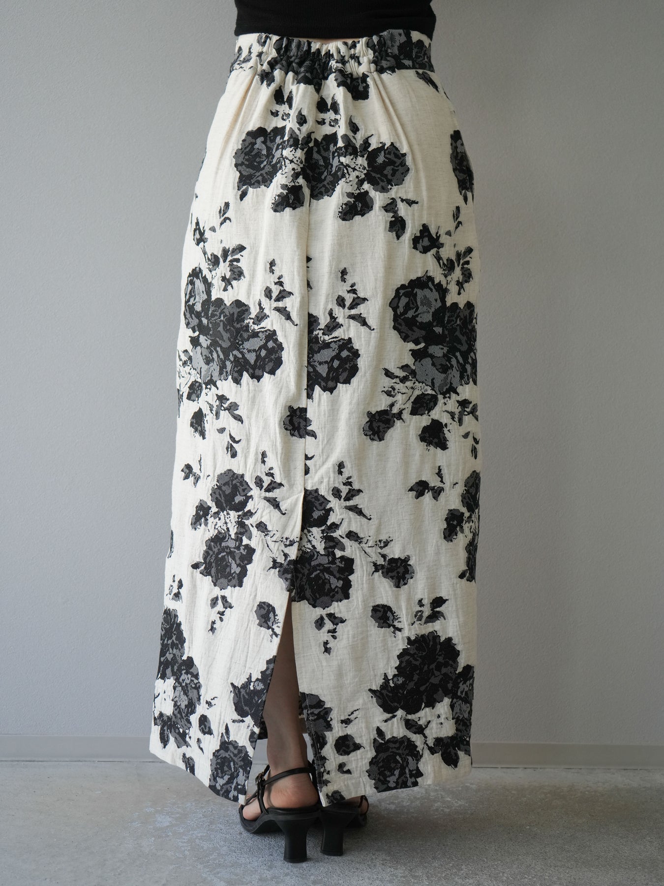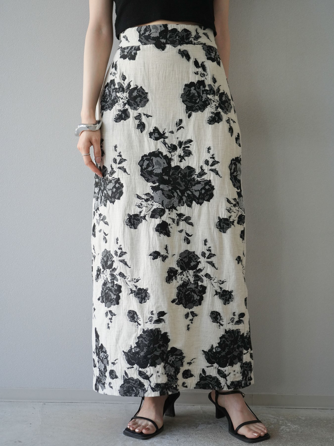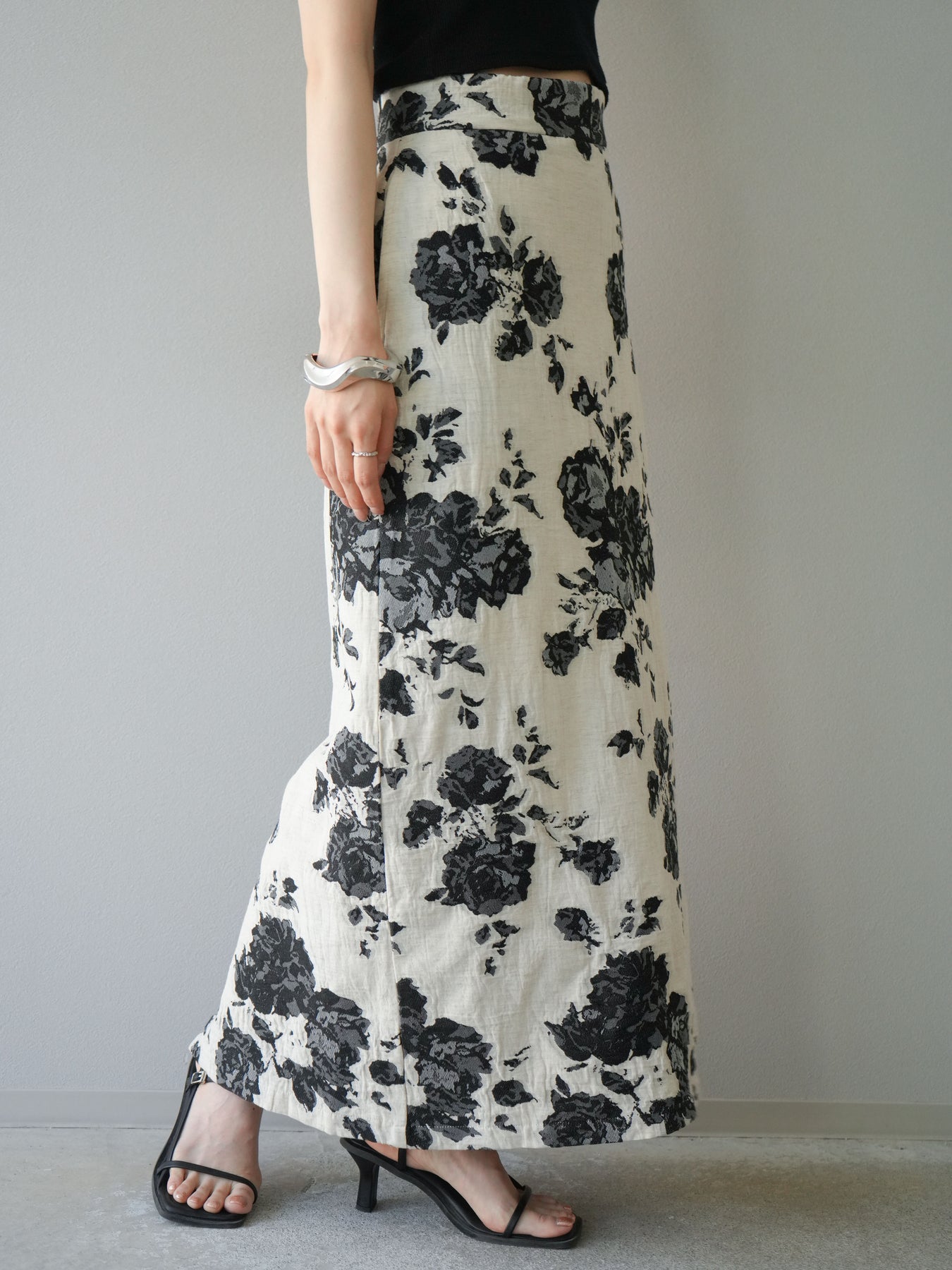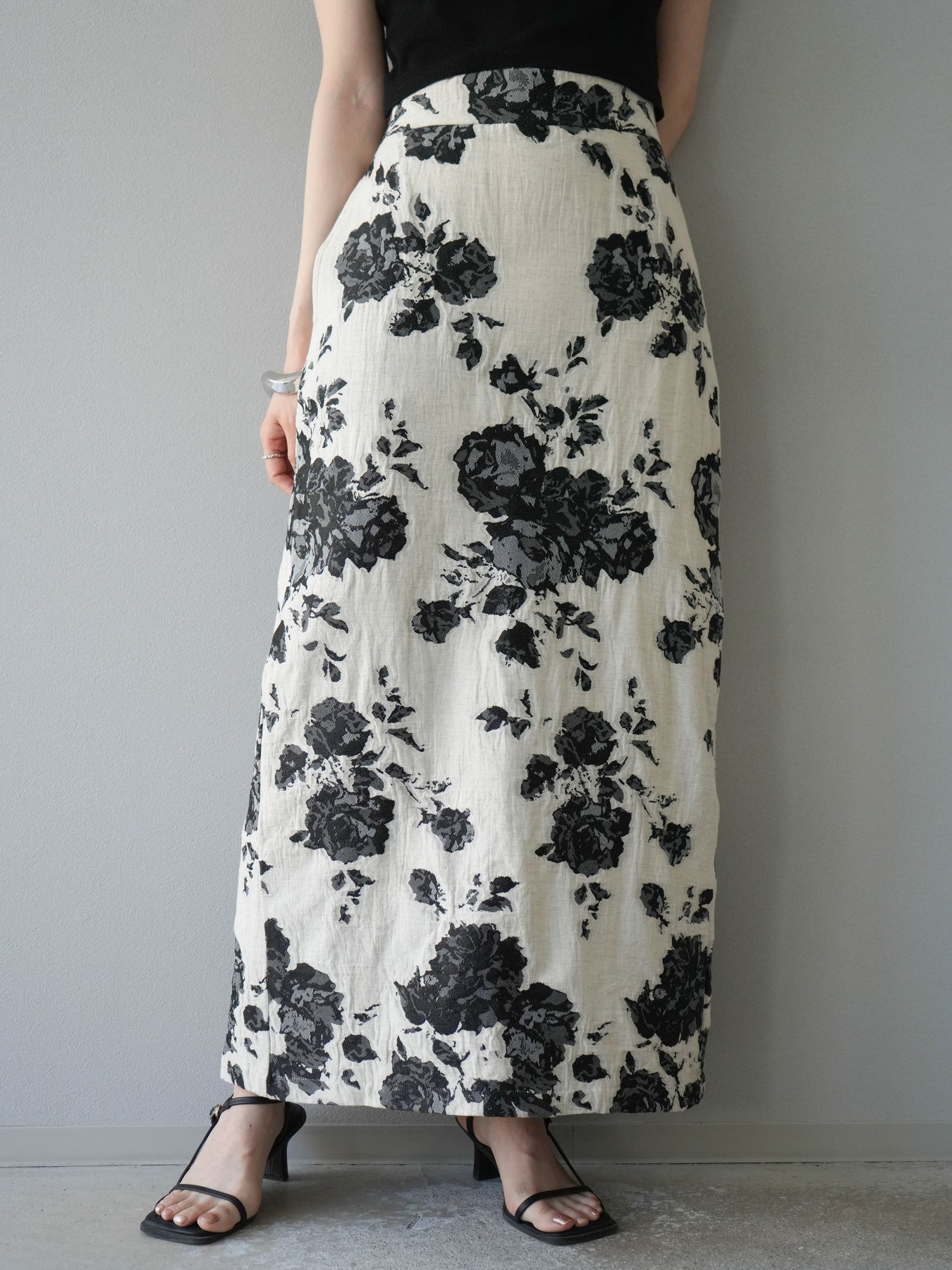 立体的なジャガード織りで表現されたフラワーモチーフが印象的なIラインスカート。 程よいハリ感とナチュラルな風合いがあり、存在感がありながらもスタイリングに馴染む一枚です。 ウエストから裾にかけてすっきりとしたラインを描くシルエットが、大人っぽく上品な印象に。 トップスをインしたスタイリングで、柄を引き立てる着こなしがおすすめです。 カジュアルにもきれいめにも着回せる、万能アイテムです。