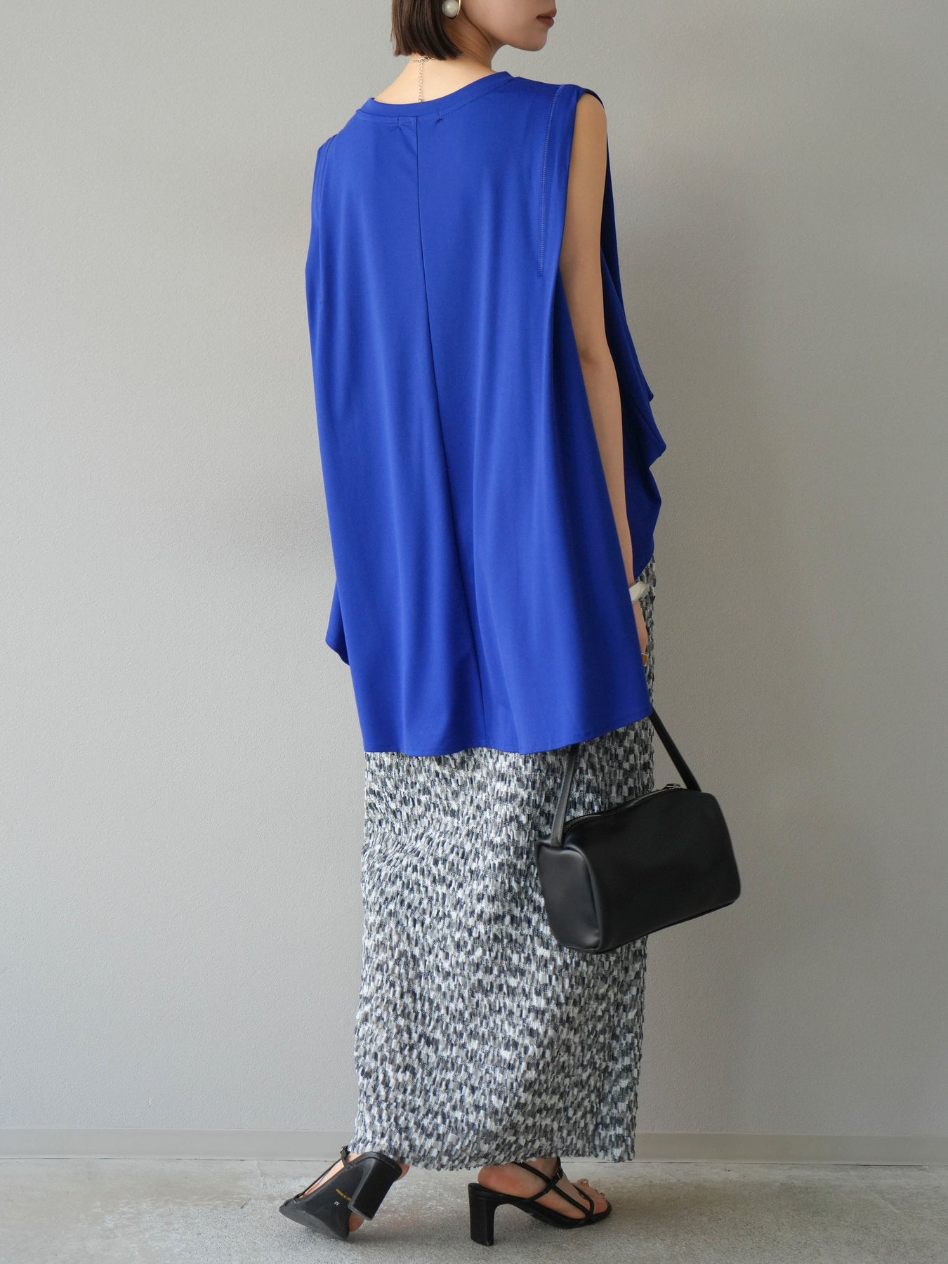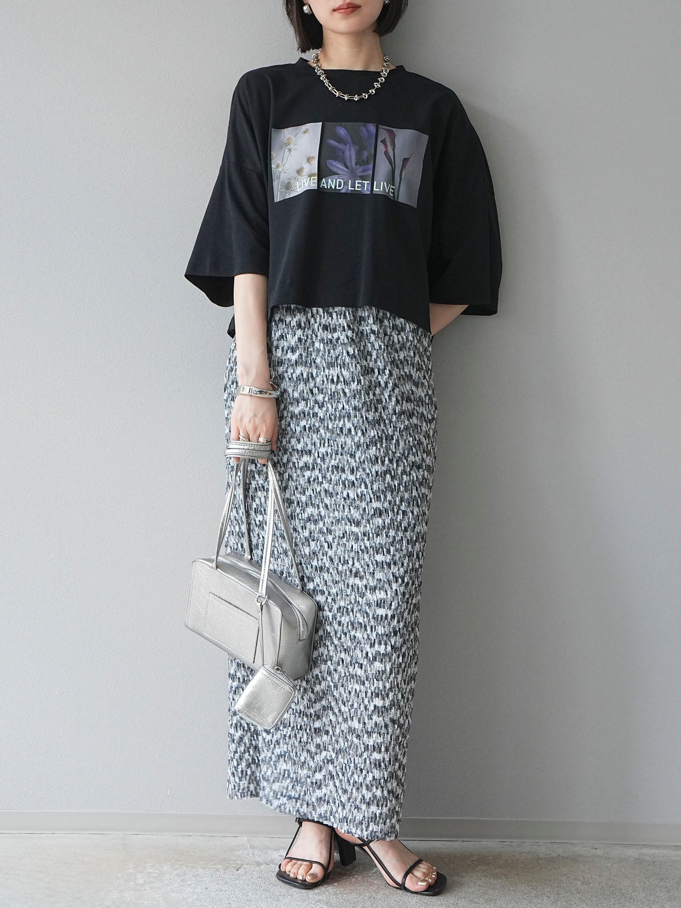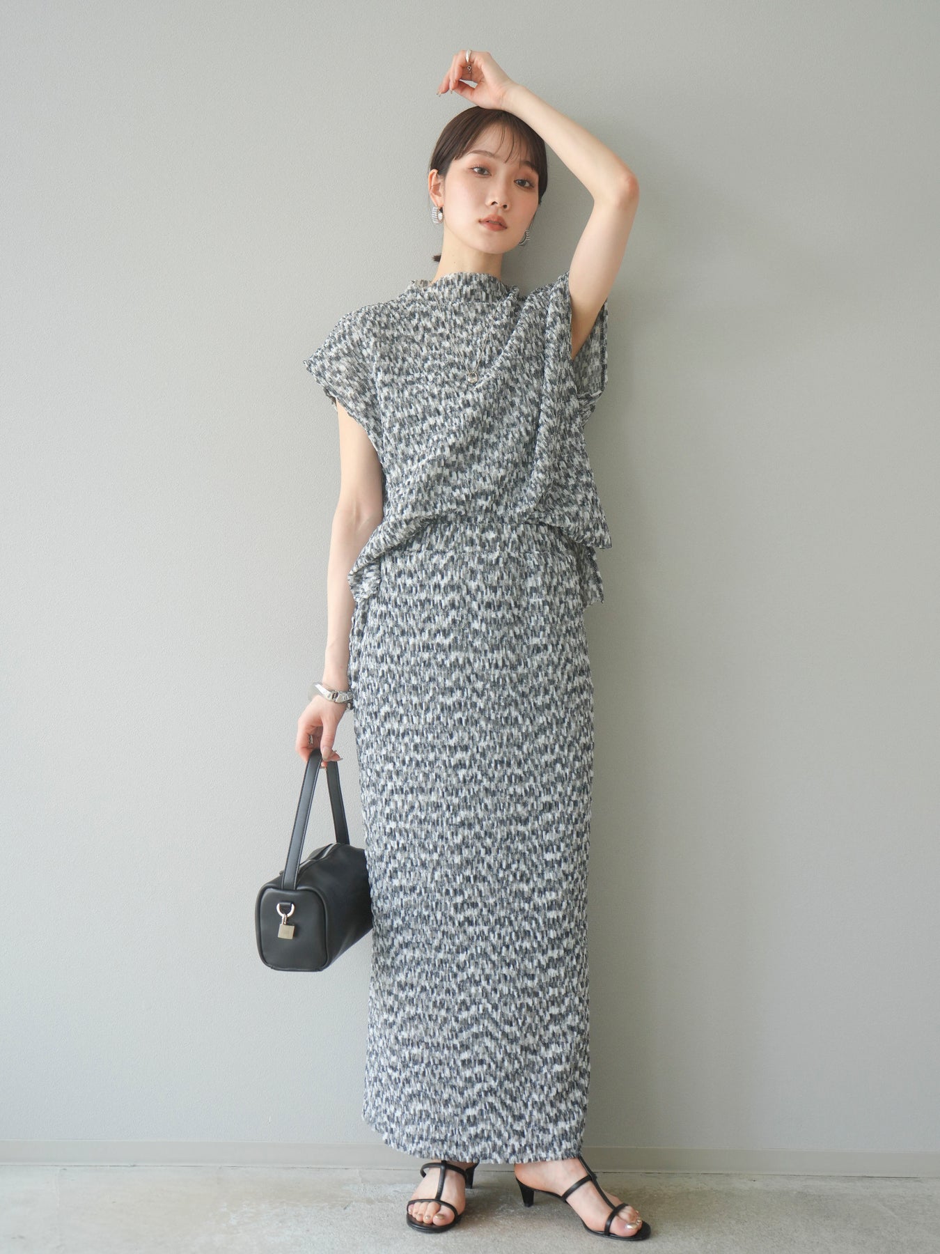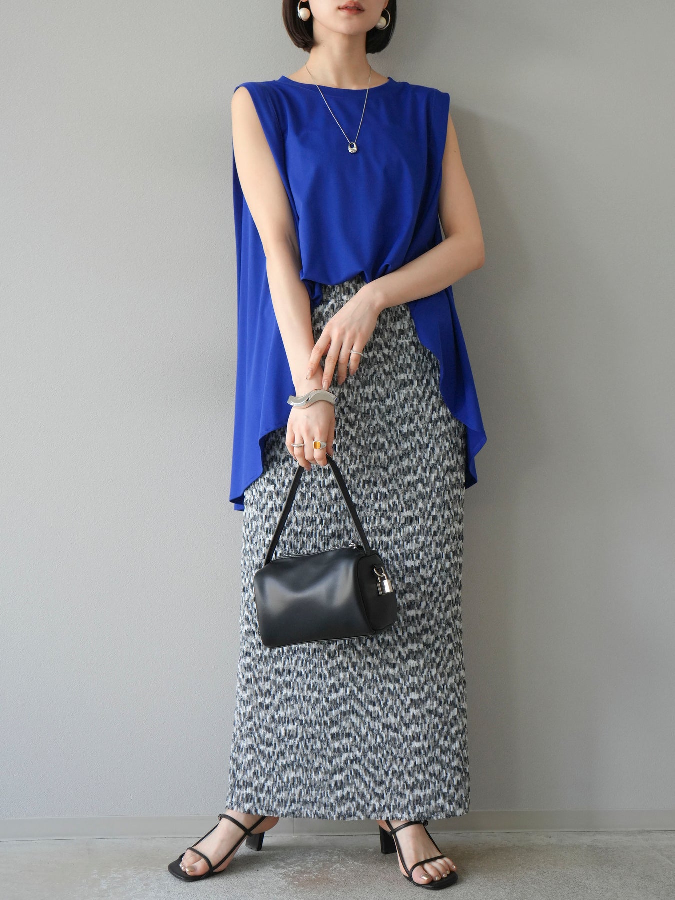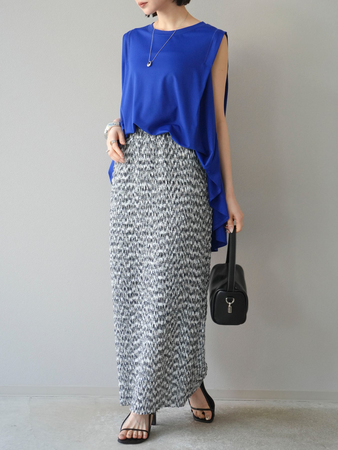 鮮やかな色使いと凹凸感のある表情豊かな生地が魅力の、マルチカラーランダムプリーツタイトスカート。縦に流れるランダムなプリーツがスタイルアップ効果を引き立て、すっきりとしたIラインシルエットで大人っぽく着こなせる一着です。ストレッチ性のある素材とウエストゴム仕様で、ストレスフリーな履き心地も嬉しいポイント。同柄トップスとのセットアップスタイルはもちろん、無地のTシャツやブラウスとの組み合わせでも映える、春夏の着映えスカートです。 ※ボトムス、キャミソール(インナー)以外の商品は一律でインナーは付属していません。