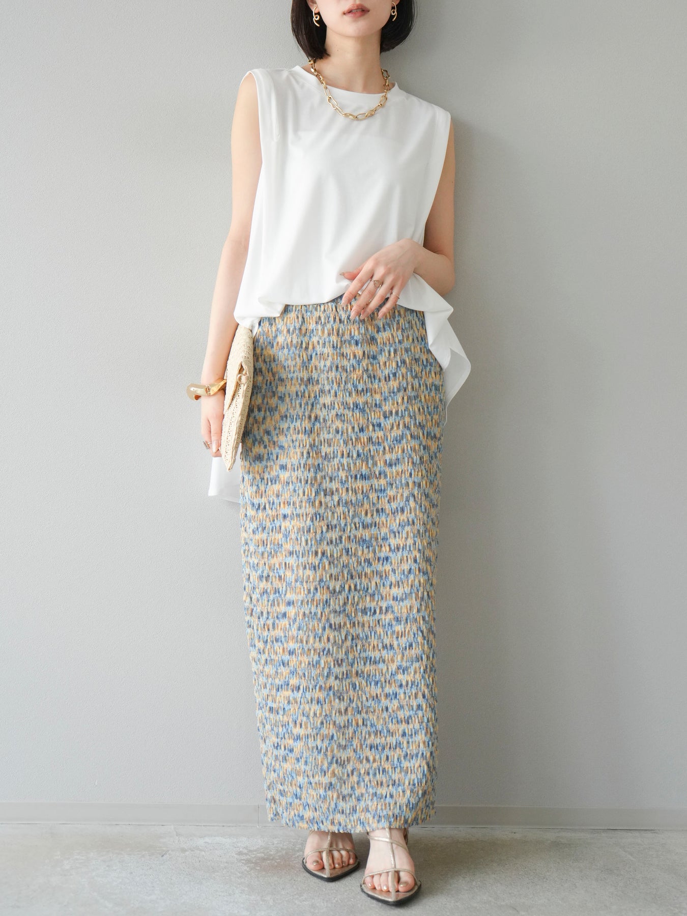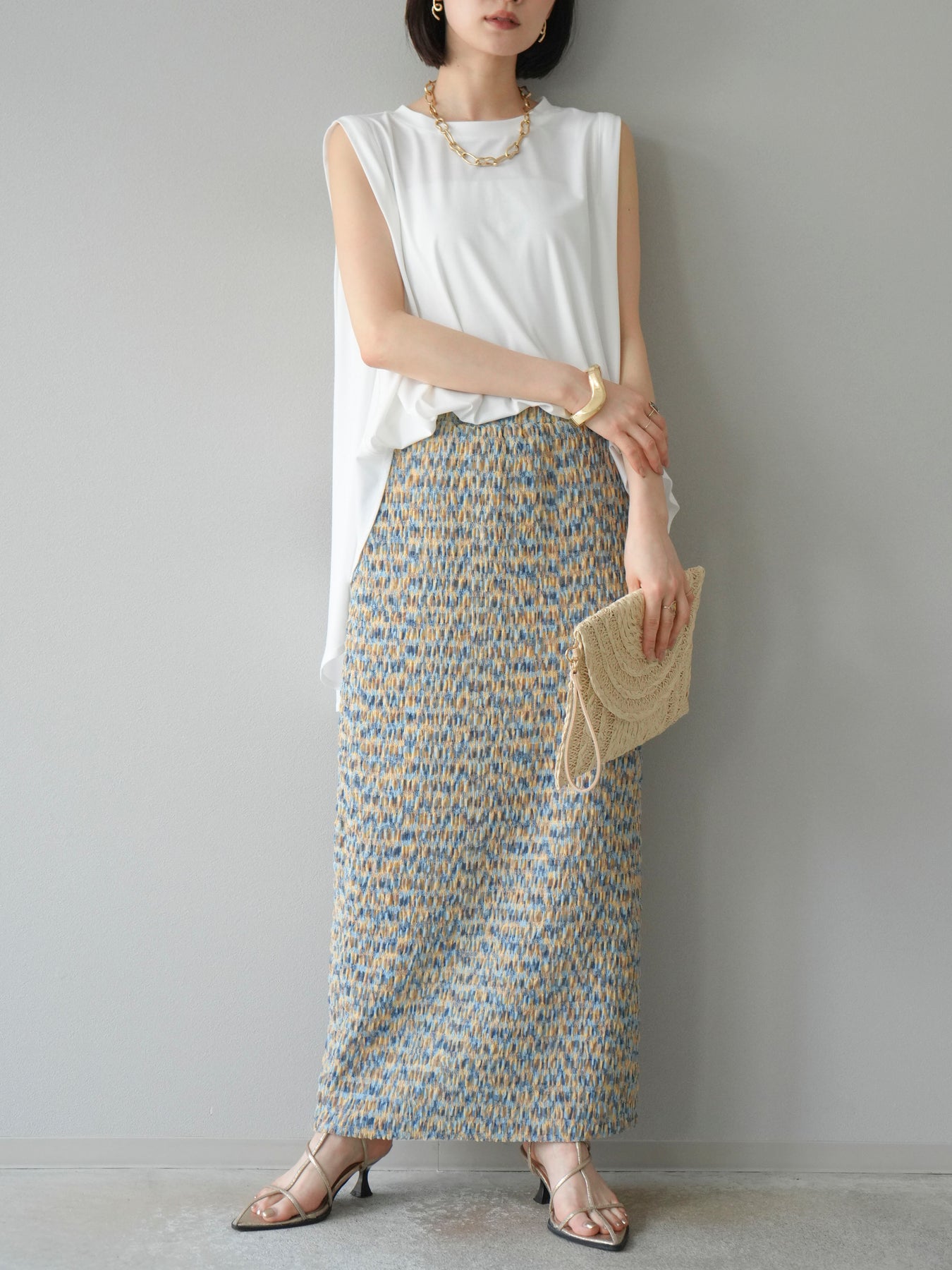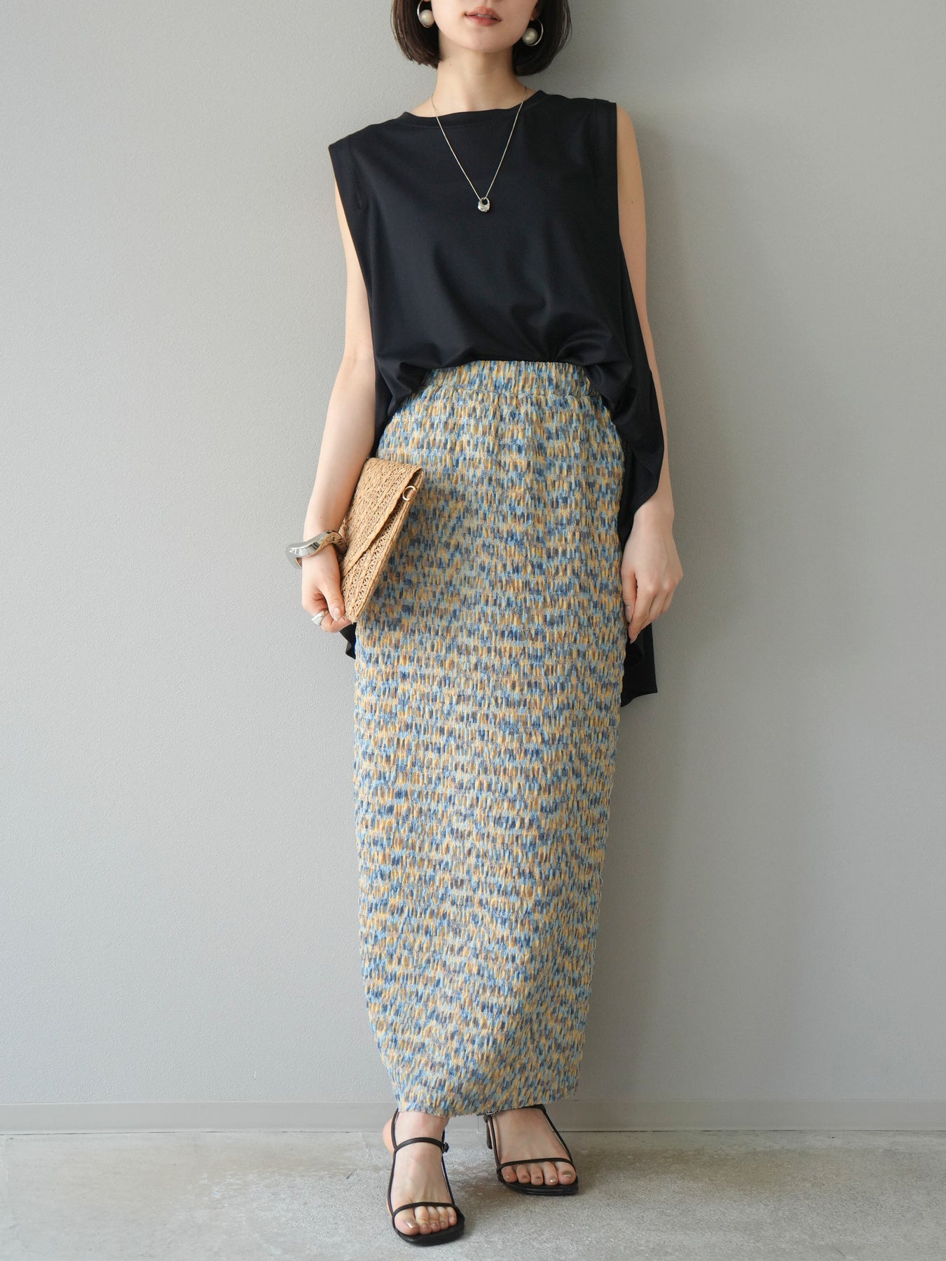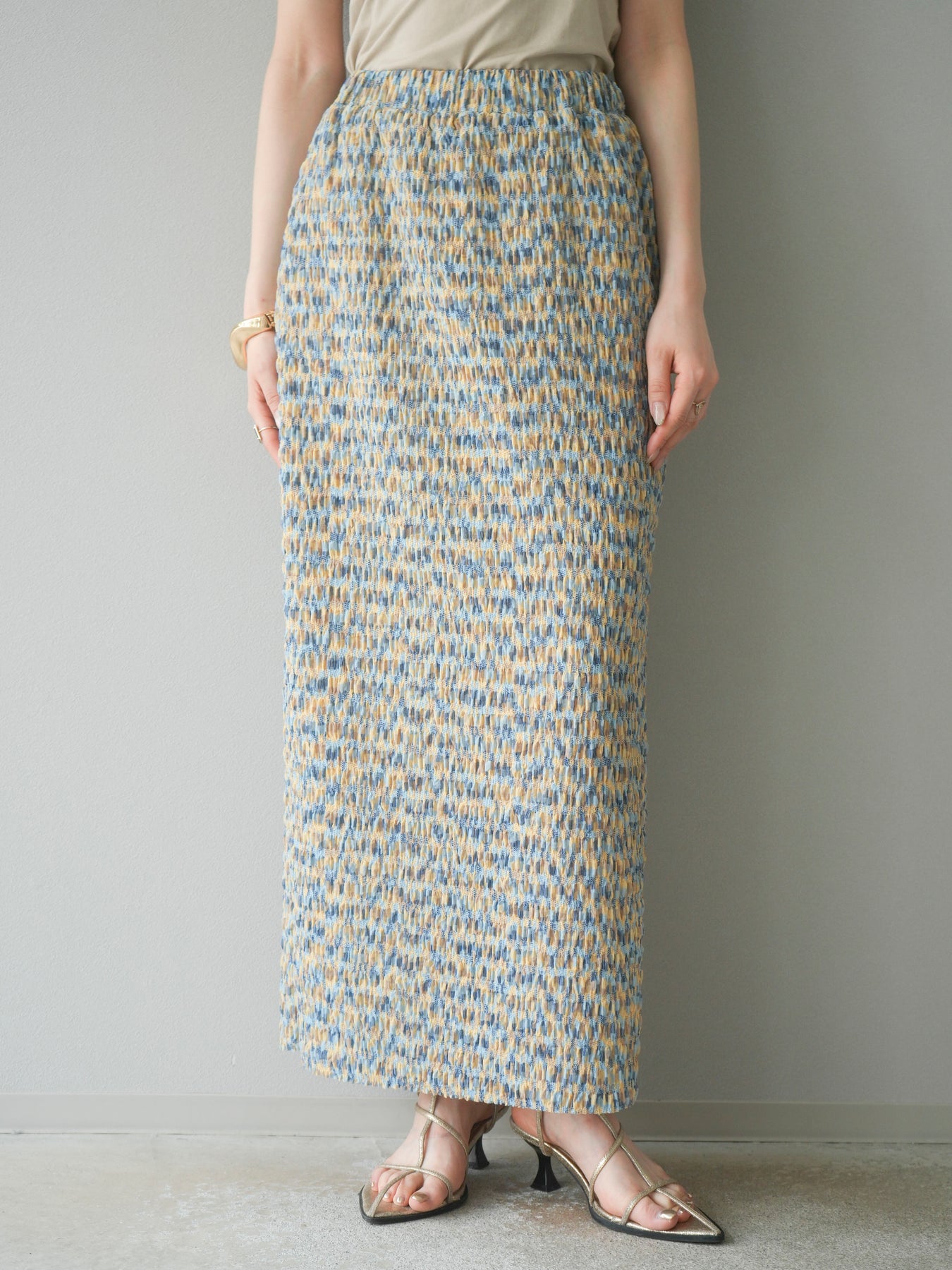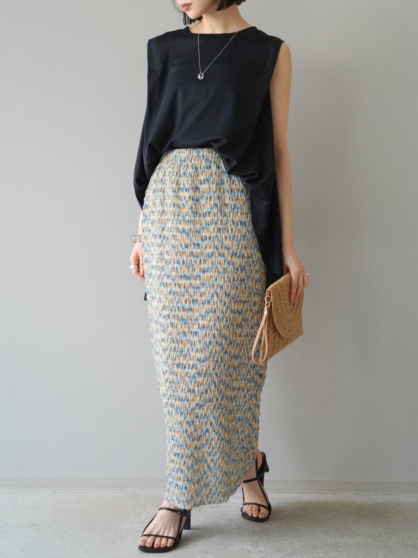 鮮やかな色使いと凹凸感のある表情豊かな生地が魅力の、マルチカラーランダムプリーツタイトスカート。縦に流れるランダムなプリーツがスタイルアップ効果を引き立て、すっきりとしたIラインシルエットで大人っぽく着こなせる一着です。ストレッチ性のある素材とウエストゴム仕様で、ストレスフリーな履き心地も嬉しいポイント。同柄トップスとのセットアップスタイルはもちろん、無地のTシャツやブラウスとの組み合わせでも映える、春夏の着映えスカートです。 ※ボトムス、キャミソール(インナー)以外の商品は一律でインナーは付属していません。