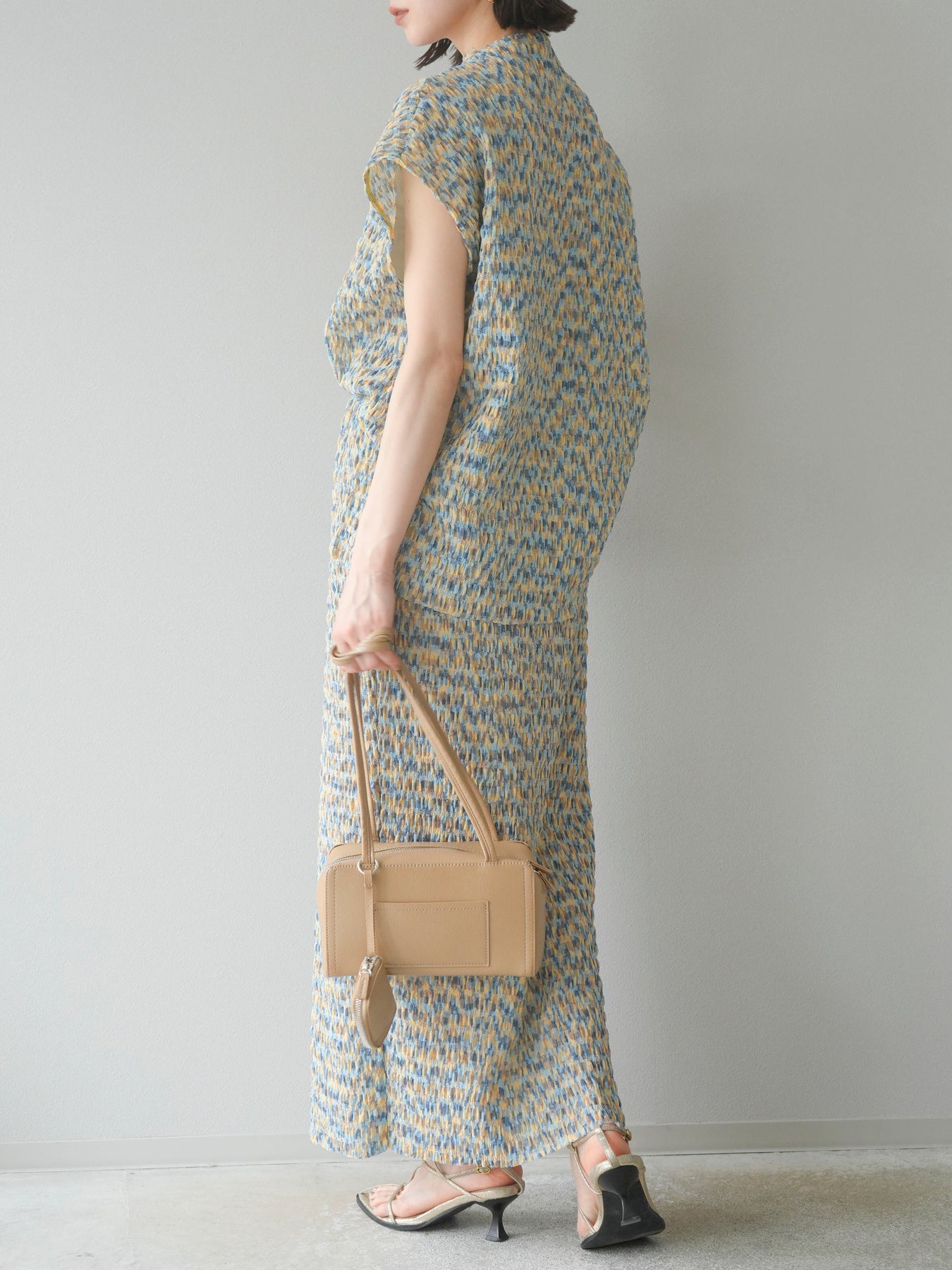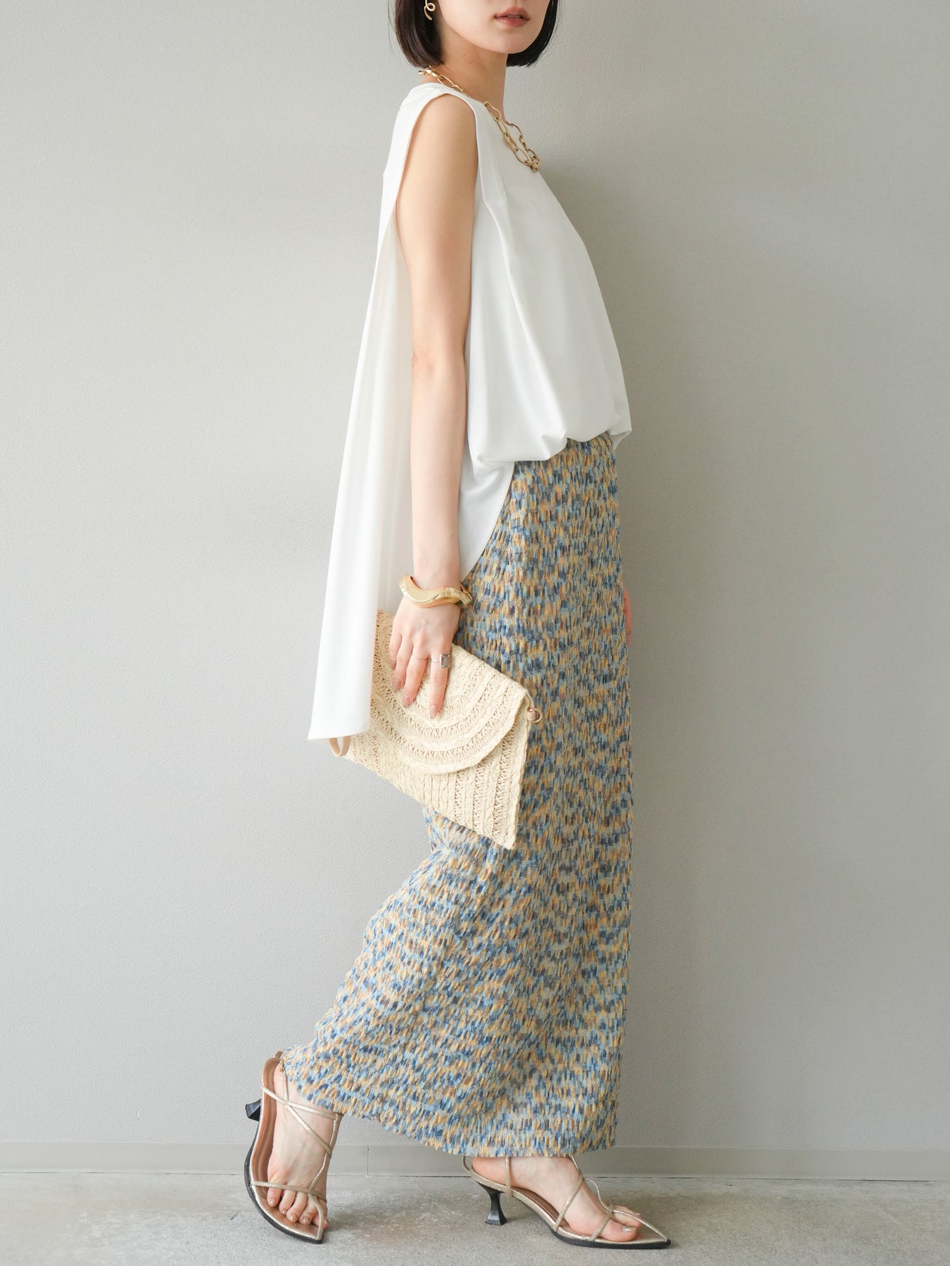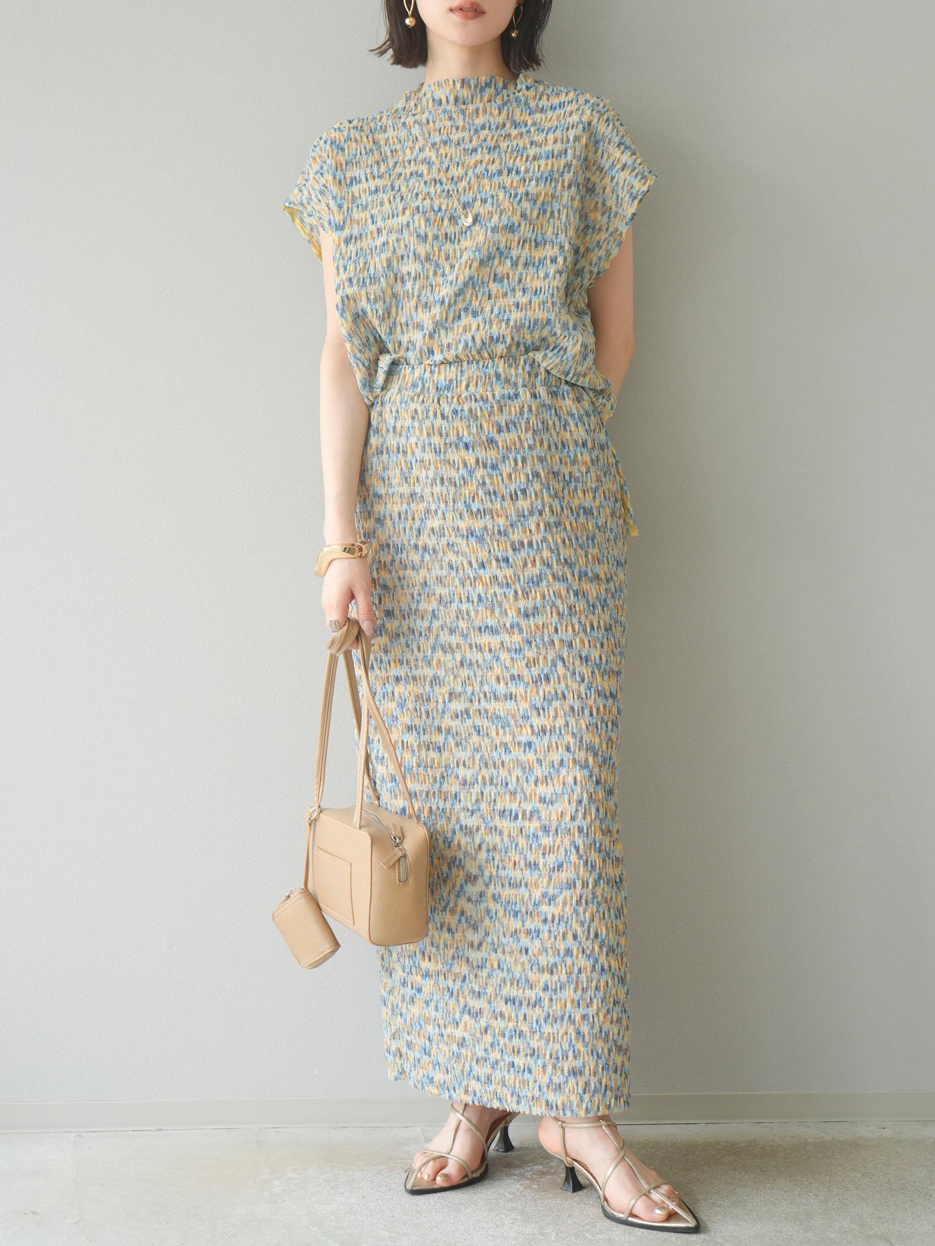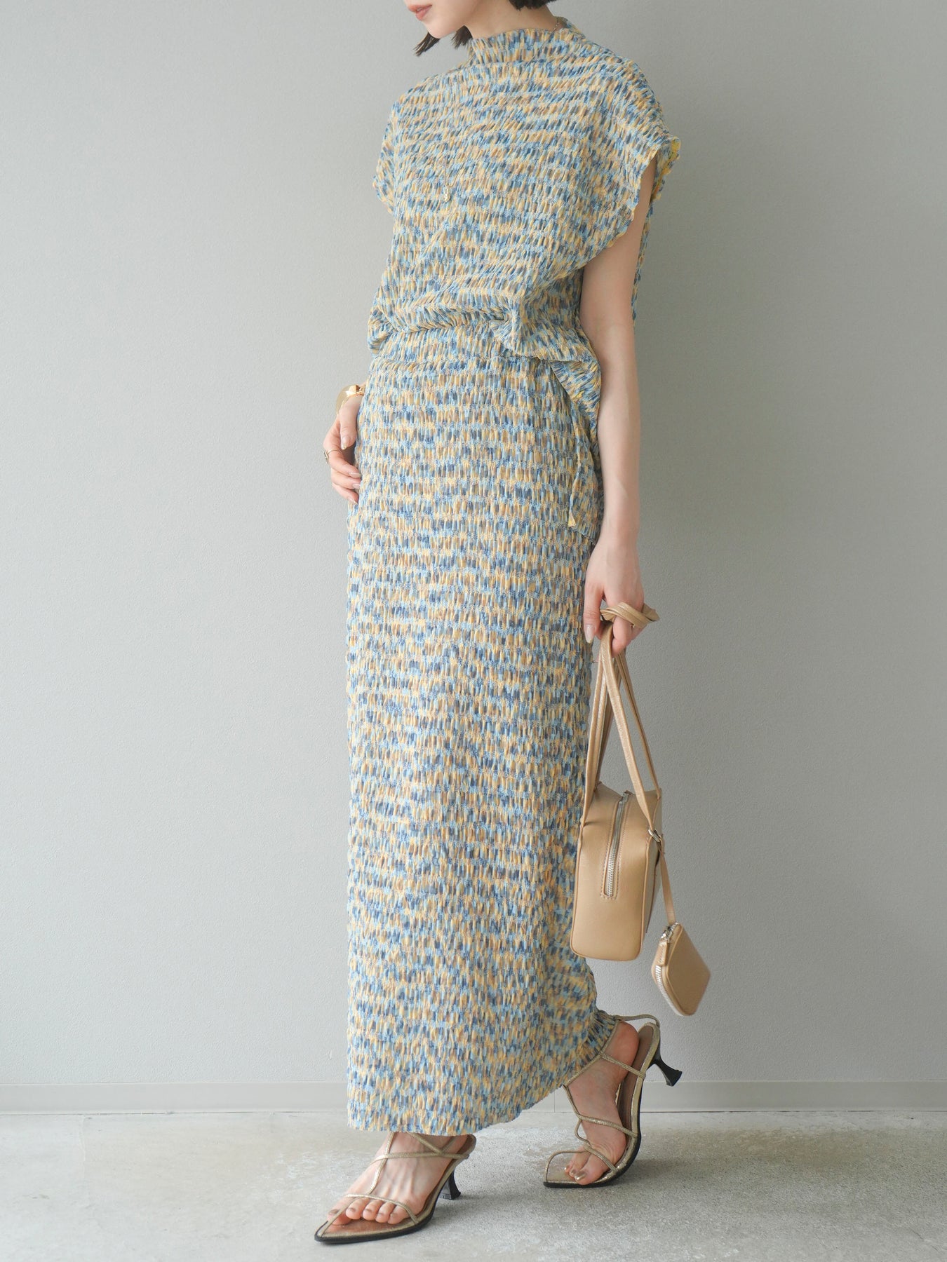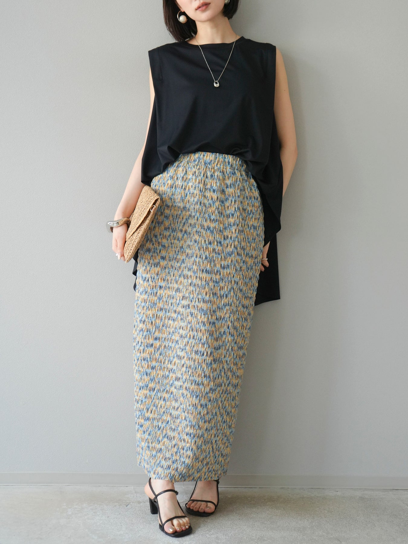 鮮やかな色使いと凹凸感のある表情豊かな生地が魅力の、マルチカラーランダムプリーツタイトスカート。縦に流れるランダムなプリーツがスタイルアップ効果を引き立て、すっきりとしたIラインシルエットで大人っぽく着こなせる一着です。ストレッチ性のある素材とウエストゴム仕様で、ストレスフリーな履き心地も嬉しいポイント。同柄トップスとのセットアップスタイルはもちろん、無地のTシャツやブラウスとの組み合わせでも映える、春夏の着映えスカートです。 ※ボトムス、キャミソール(インナー)以外の商品は一律でインナーは付属していません。