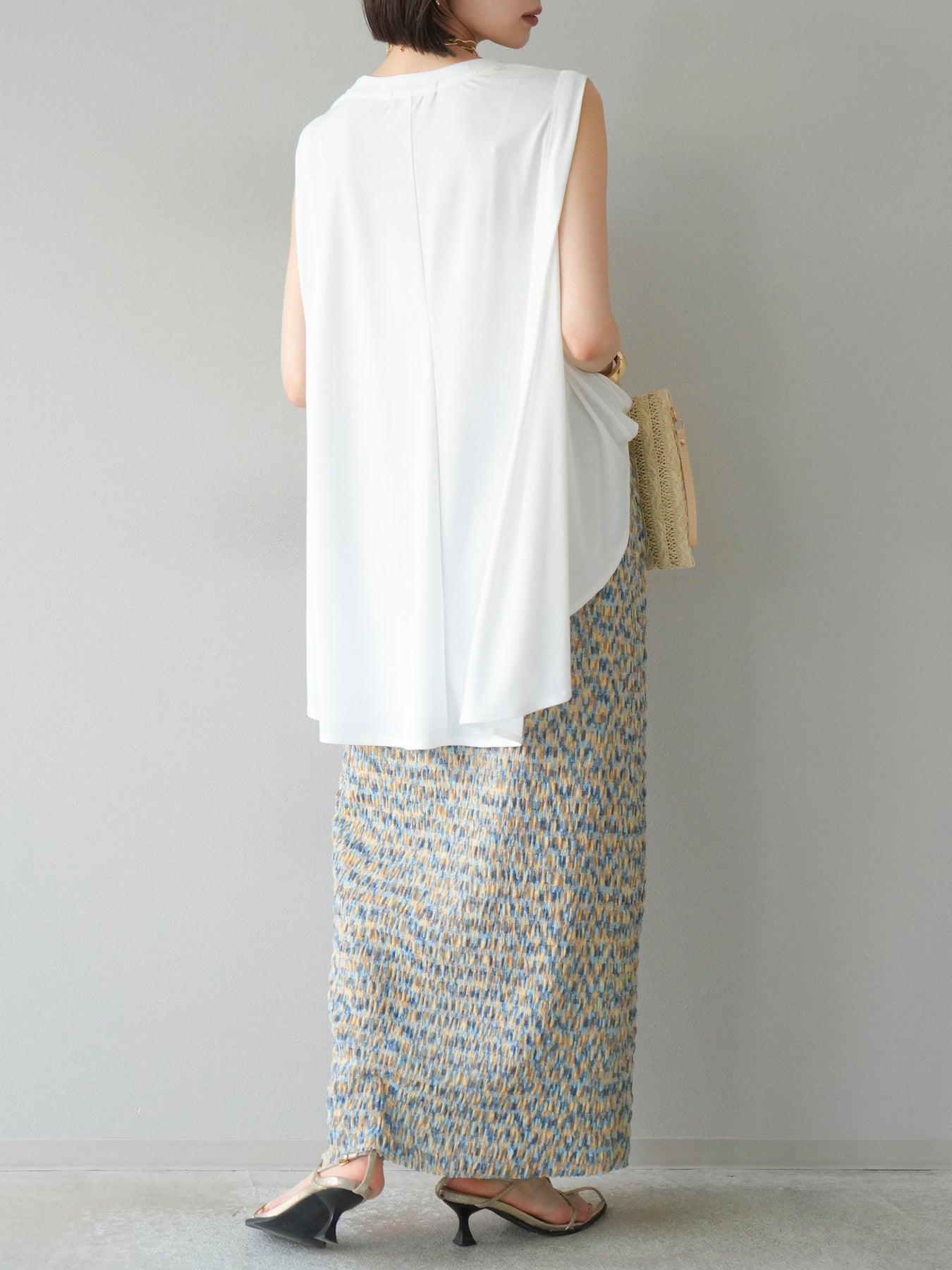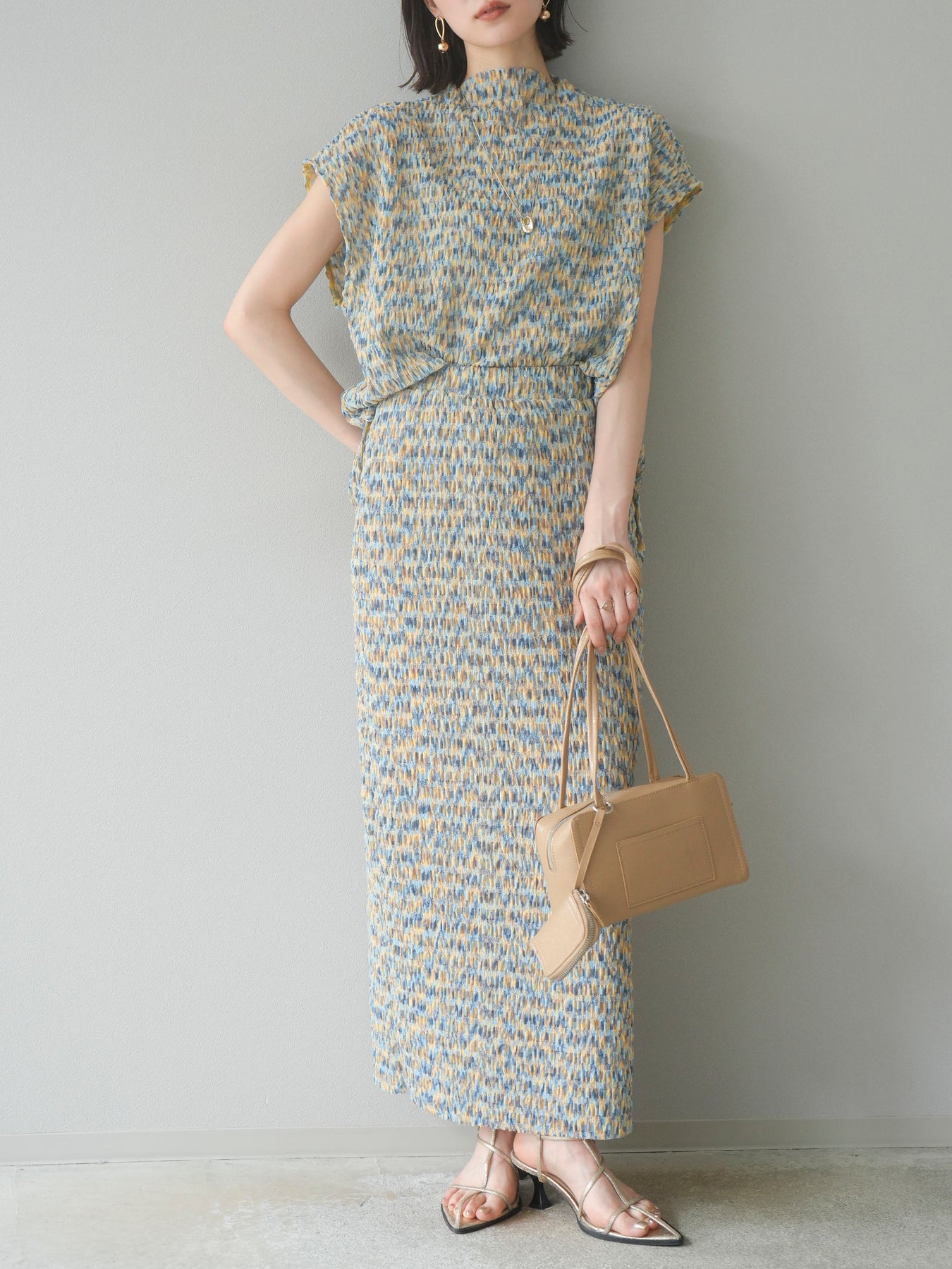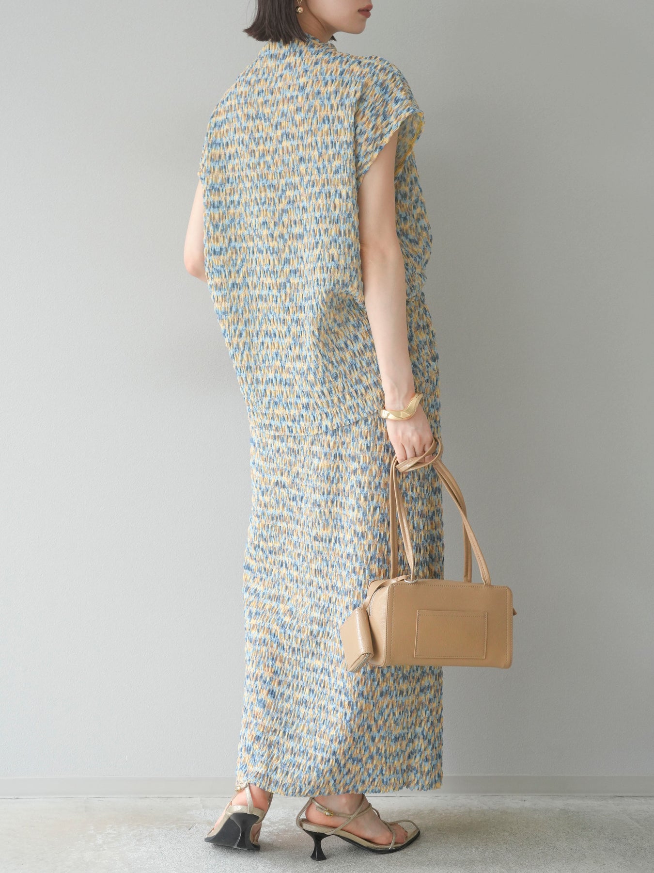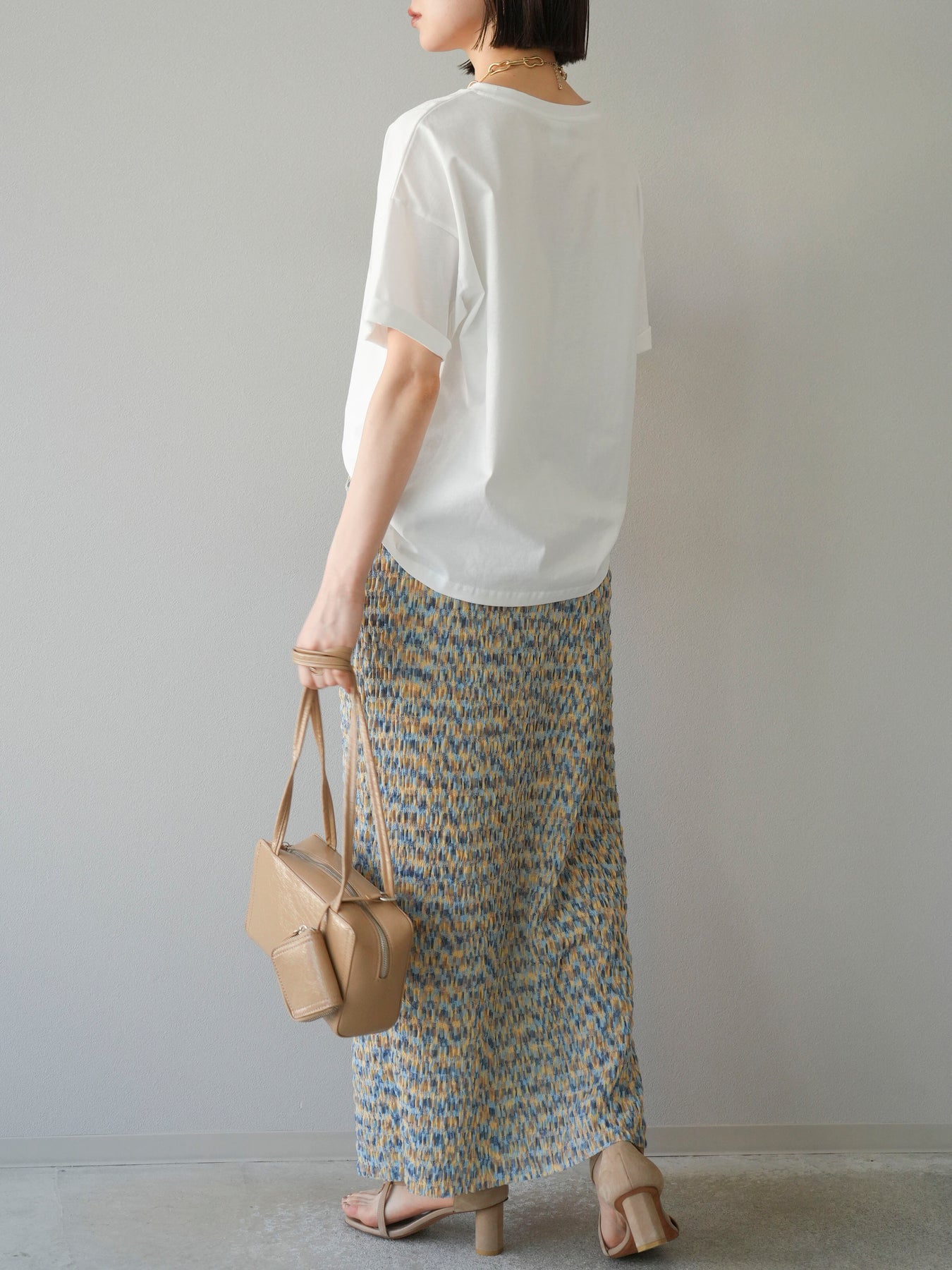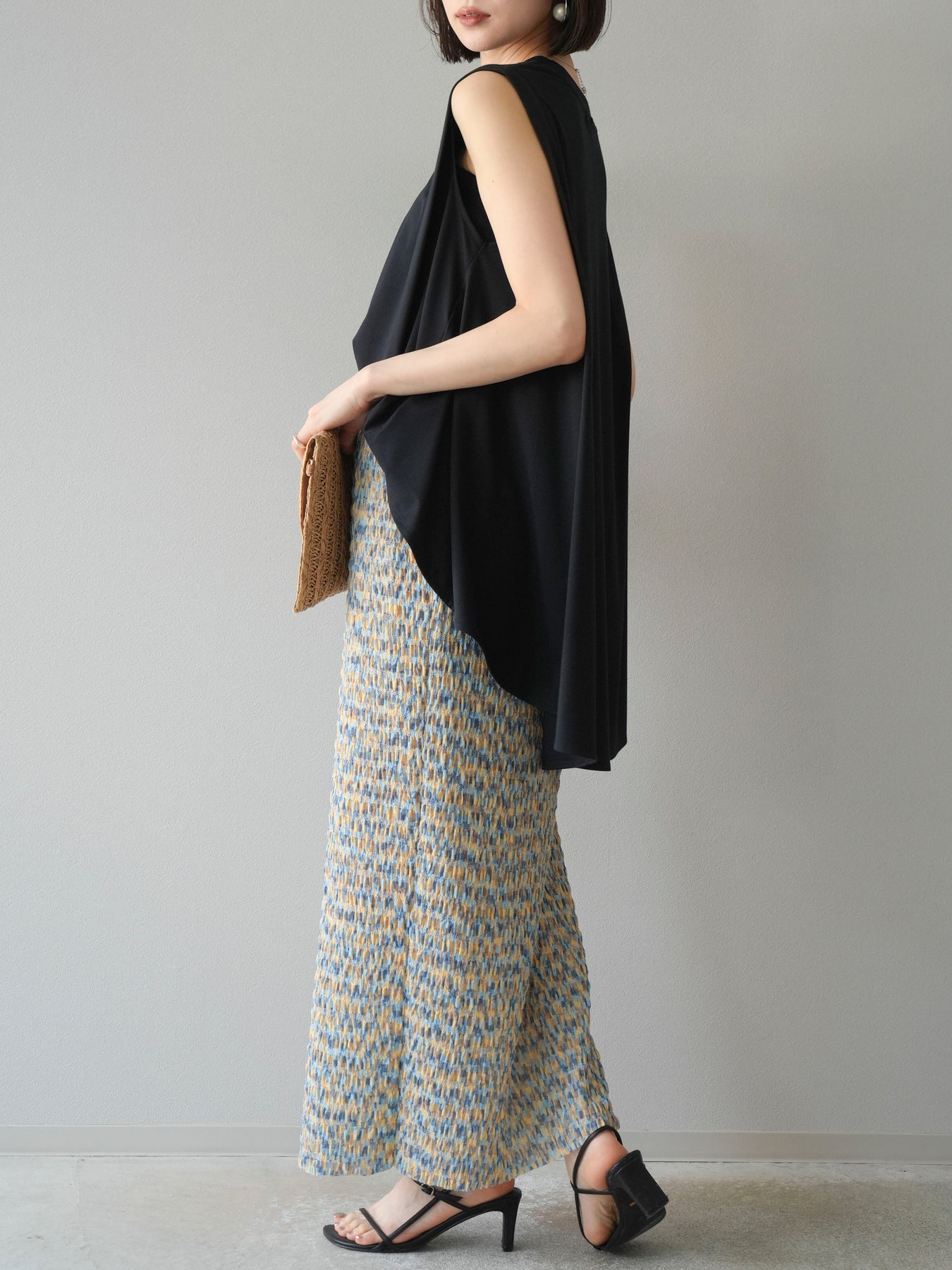鮮やかな色使いと凹凸感のある表情豊かな生地が魅力の、マルチカラーランダムプリーツタイトスカート。縦に流れるランダムなプリーツがスタイルアップ効果を引き立て、すっきりとしたIラインシルエットで大人っぽく着こなせる一着です。ストレッチ性のある素材とウエストゴム仕様で、ストレスフリーな履き心地も嬉しいポイント。同柄トップスとのセットアップスタイルはもちろん、無地のTシャツやブラウスとの組み合わせでも映える、春夏の着映えスカートです。 ※ボトムス、キャミソール(インナー)以外の商品は一律でインナーは付属していません。