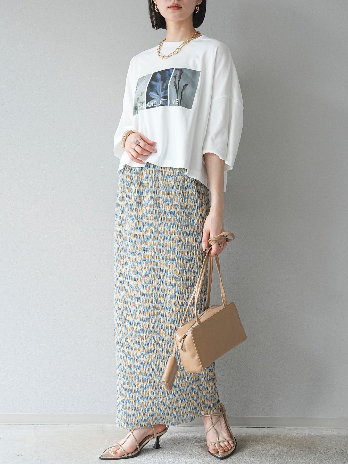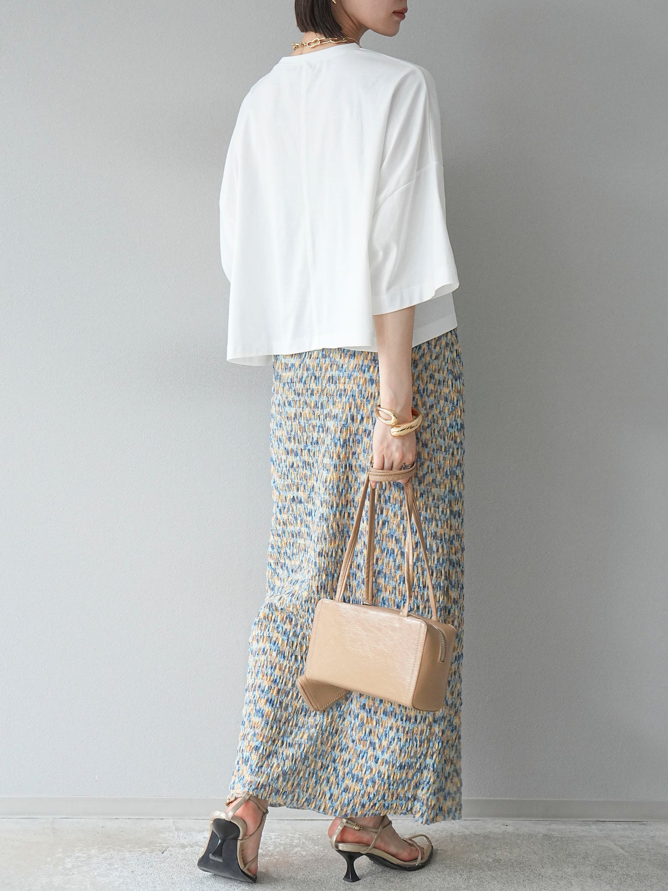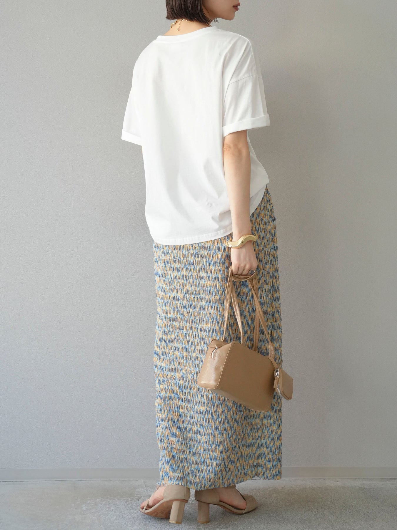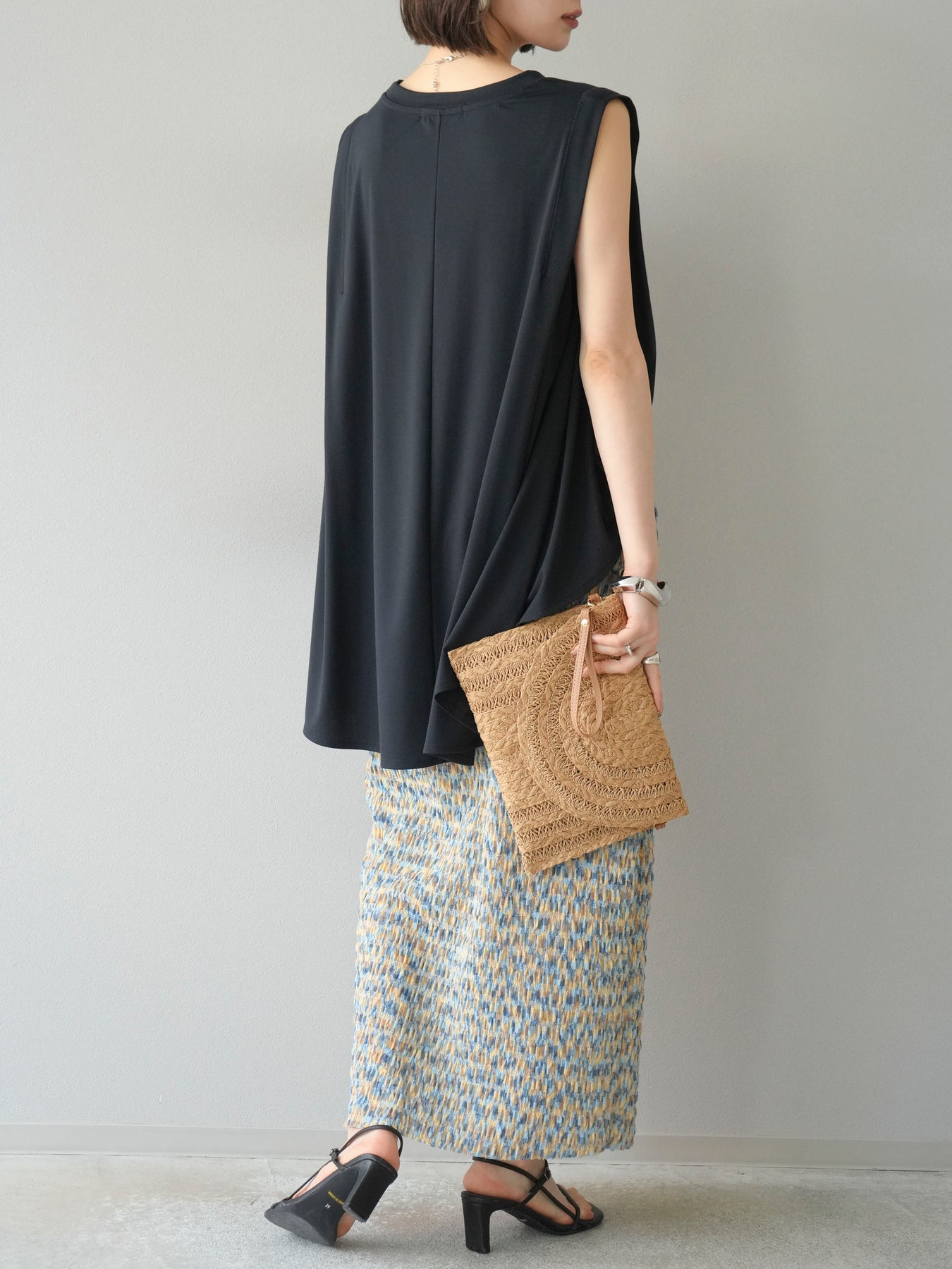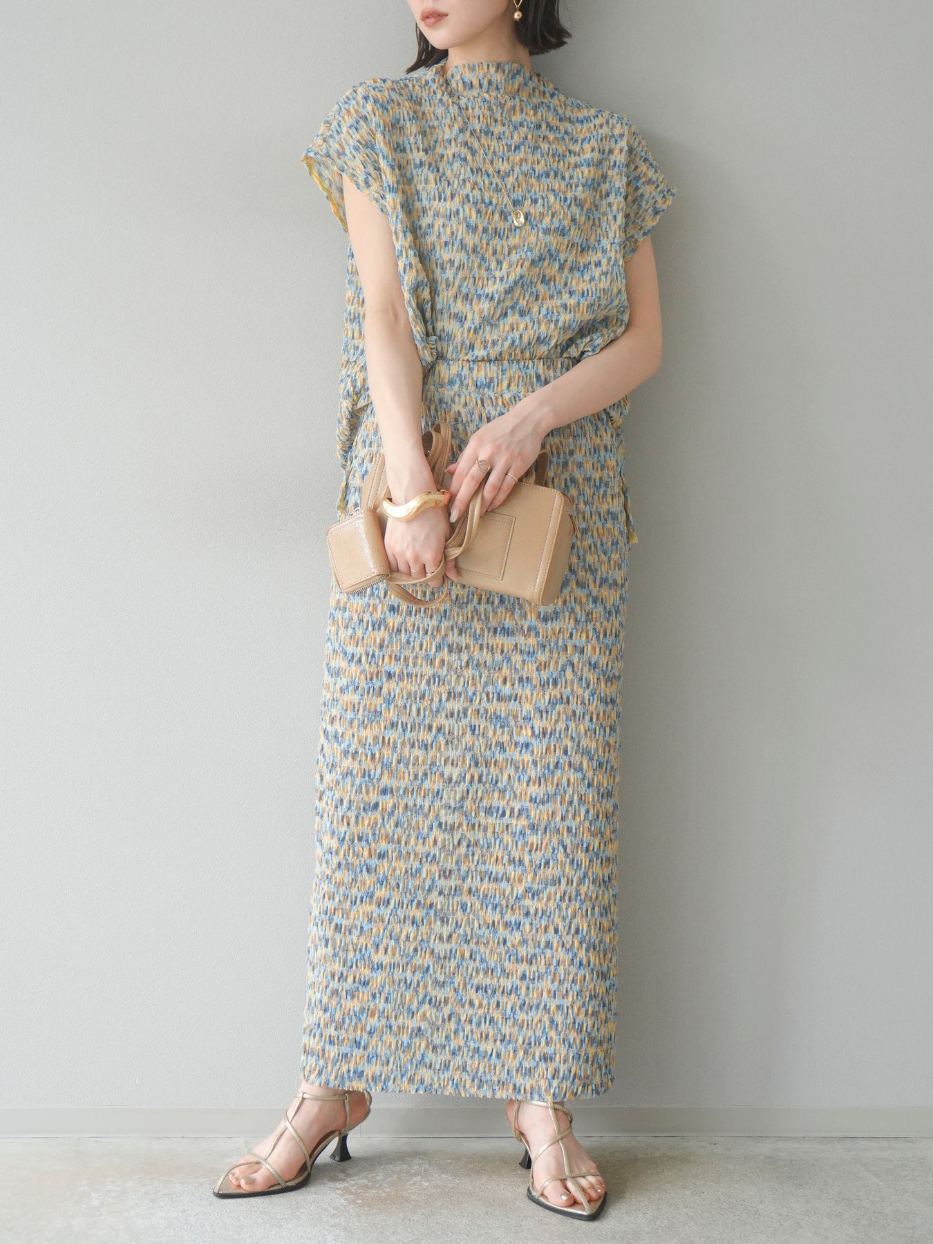 鮮やかな色使いと凹凸感のある表情豊かな生地が魅力の、マルチカラーランダムプリーツタイトスカート。縦に流れるランダムなプリーツがスタイルアップ効果を引き立て、すっきりとしたIラインシルエットで大人っぽく着こなせる一着です。ストレッチ性のある素材とウエストゴム仕様で、ストレスフリーな履き心地も嬉しいポイント。同柄トップスとのセットアップスタイルはもちろん、無地のTシャツやブラウスとの組み合わせでも映える、春夏の着映えスカートです。 ※ボトムス、キャミソール(インナー)以外の商品は一律でインナーは付属していません。