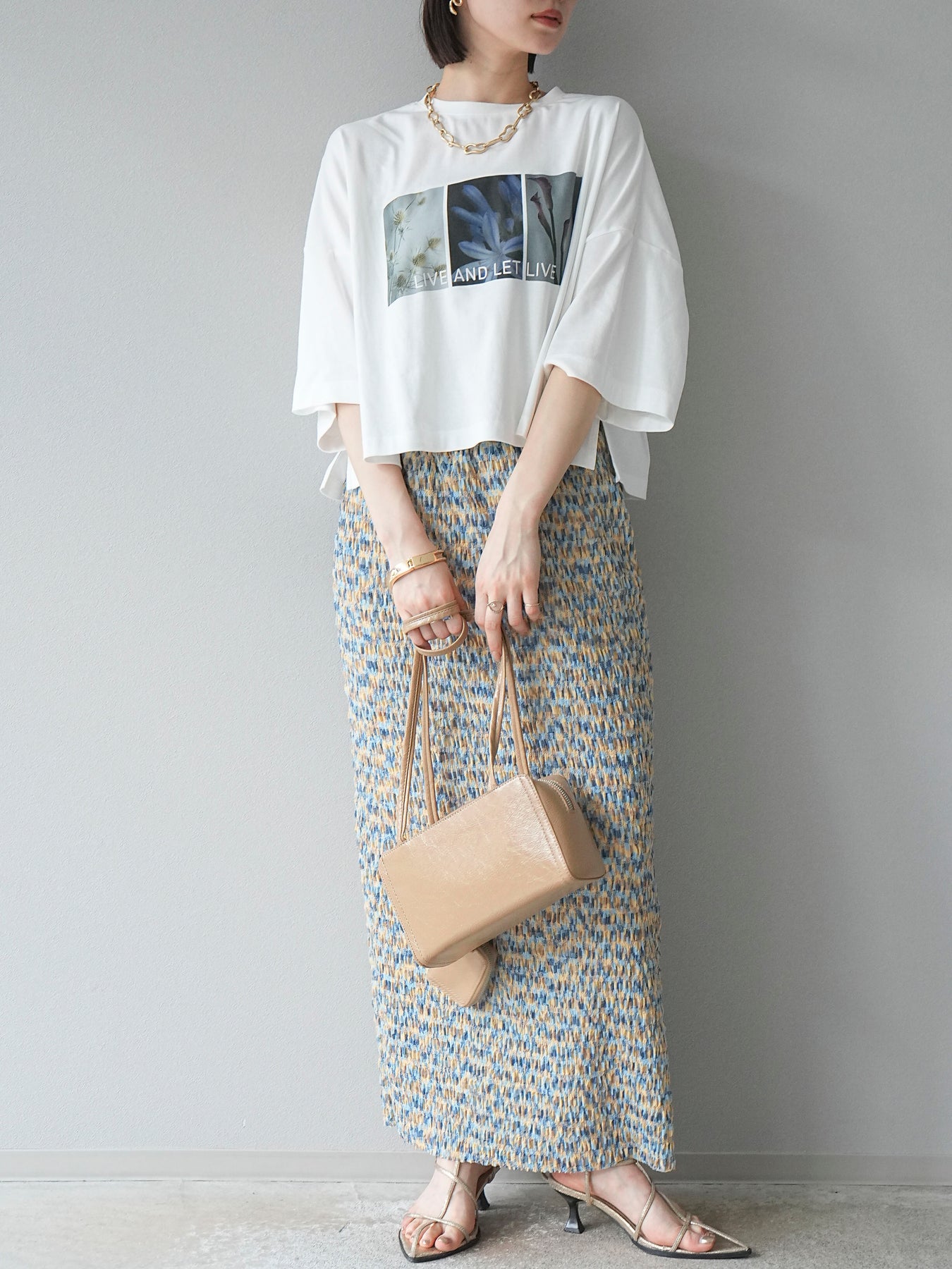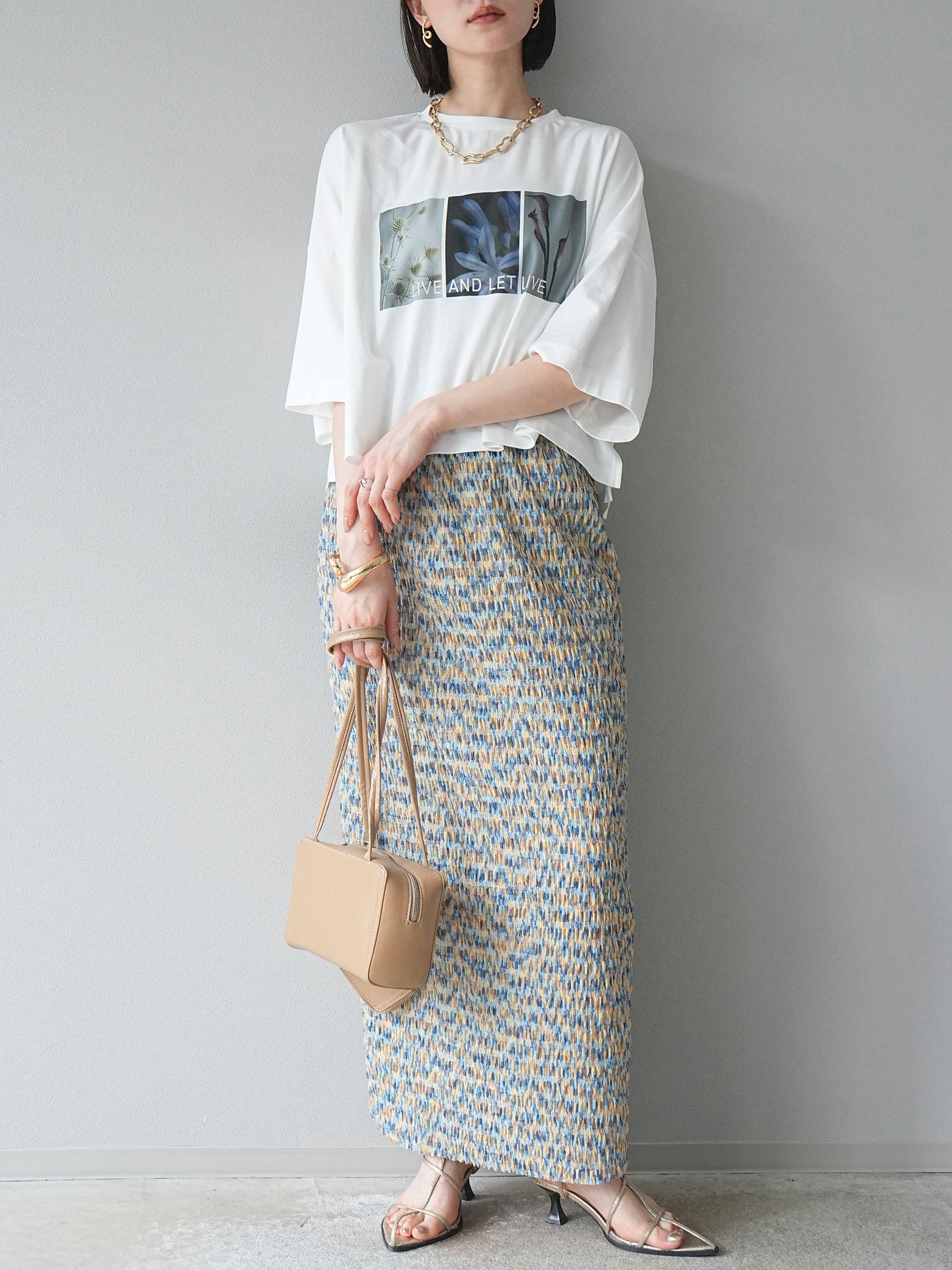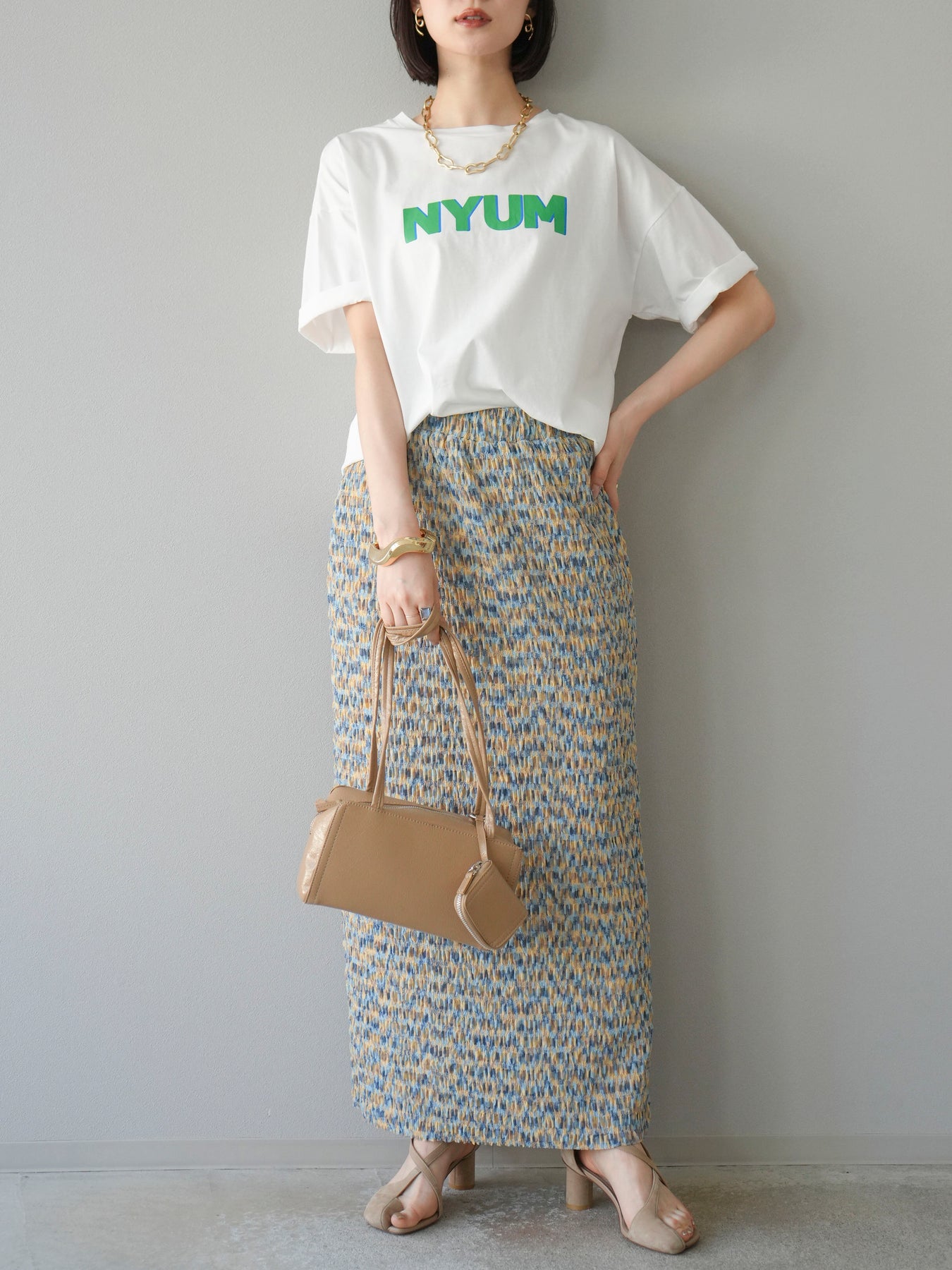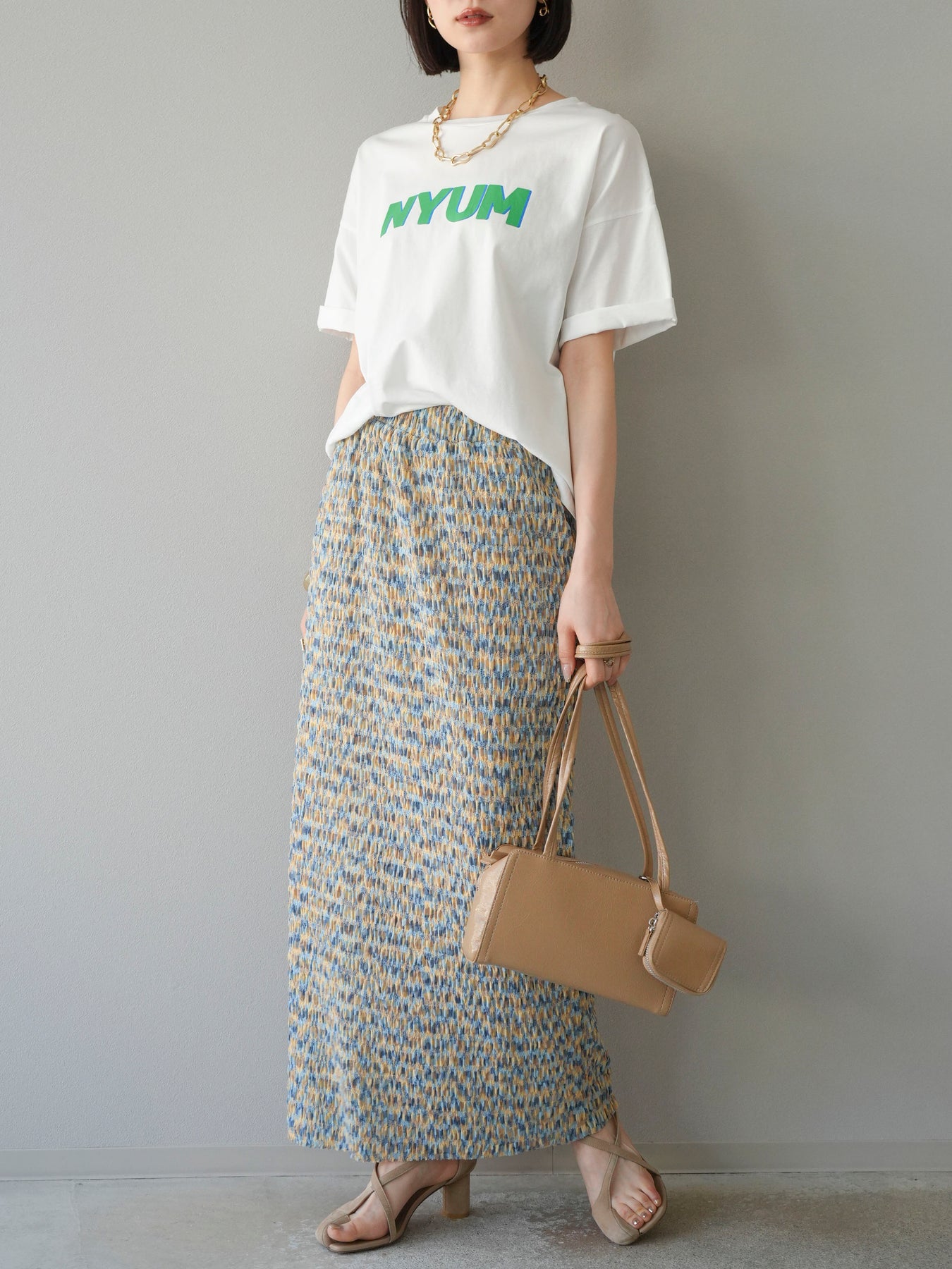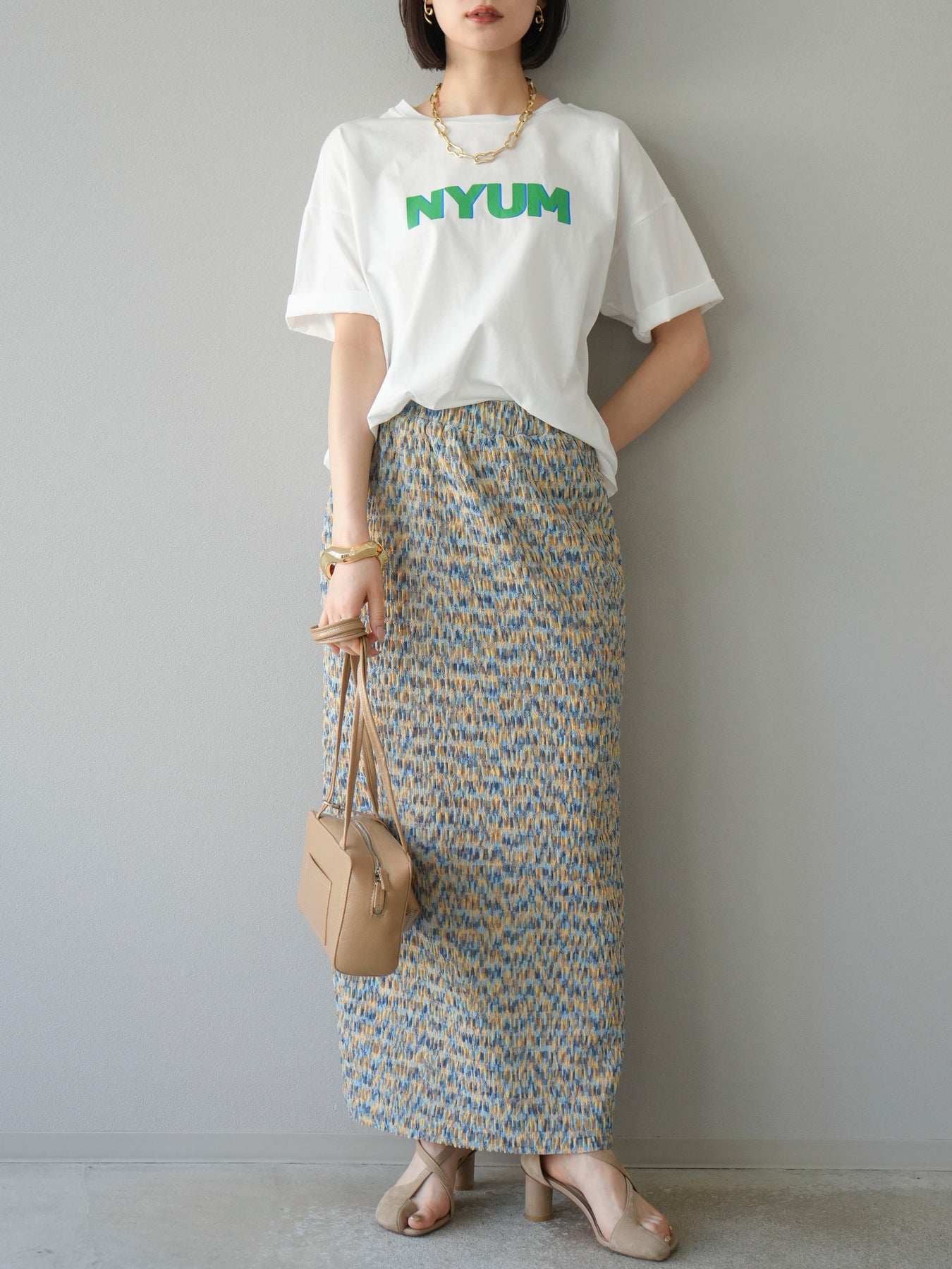 鮮やかな色使いと凹凸感のある表情豊かな生地が魅力の、マルチカラーランダムプリーツタイトスカート。縦に流れるランダムなプリーツがスタイルアップ効果を引き立て、すっきりとしたIラインシルエットで大人っぽく着こなせる一着です。ストレッチ性のある素材とウエストゴム仕様で、ストレスフリーな履き心地も嬉しいポイント。同柄トップスとのセットアップスタイルはもちろん、無地のTシャツやブラウスとの組み合わせでも映える、春夏の着映えスカートです。 ※ボトムス、キャミソール(インナー)以外の商品は一律でインナーは付属していません。