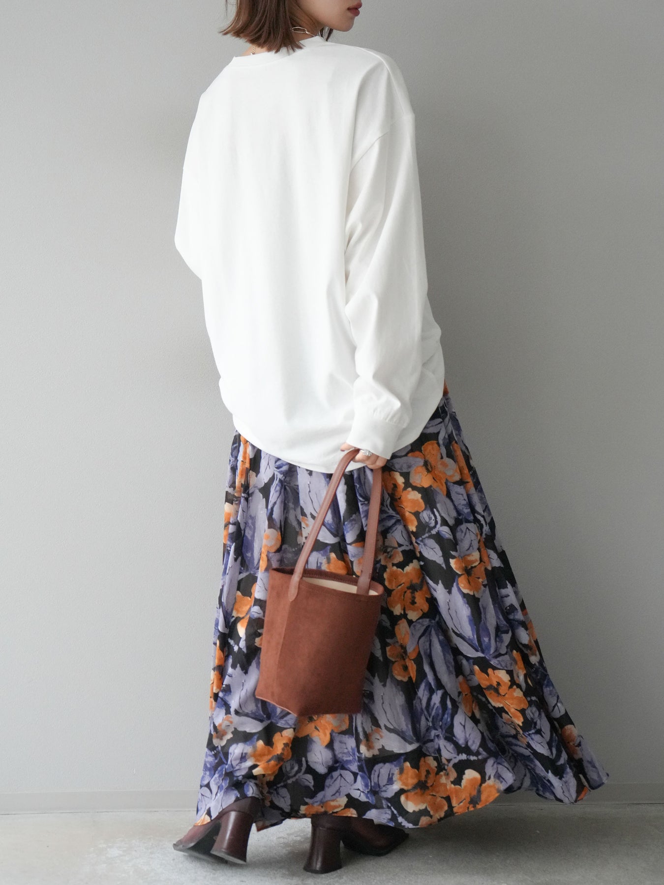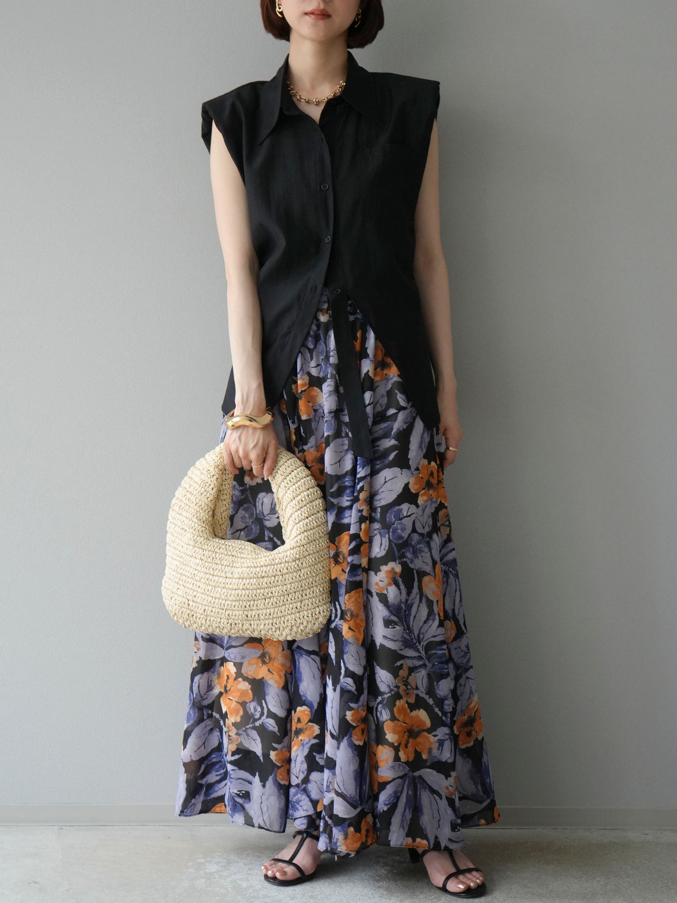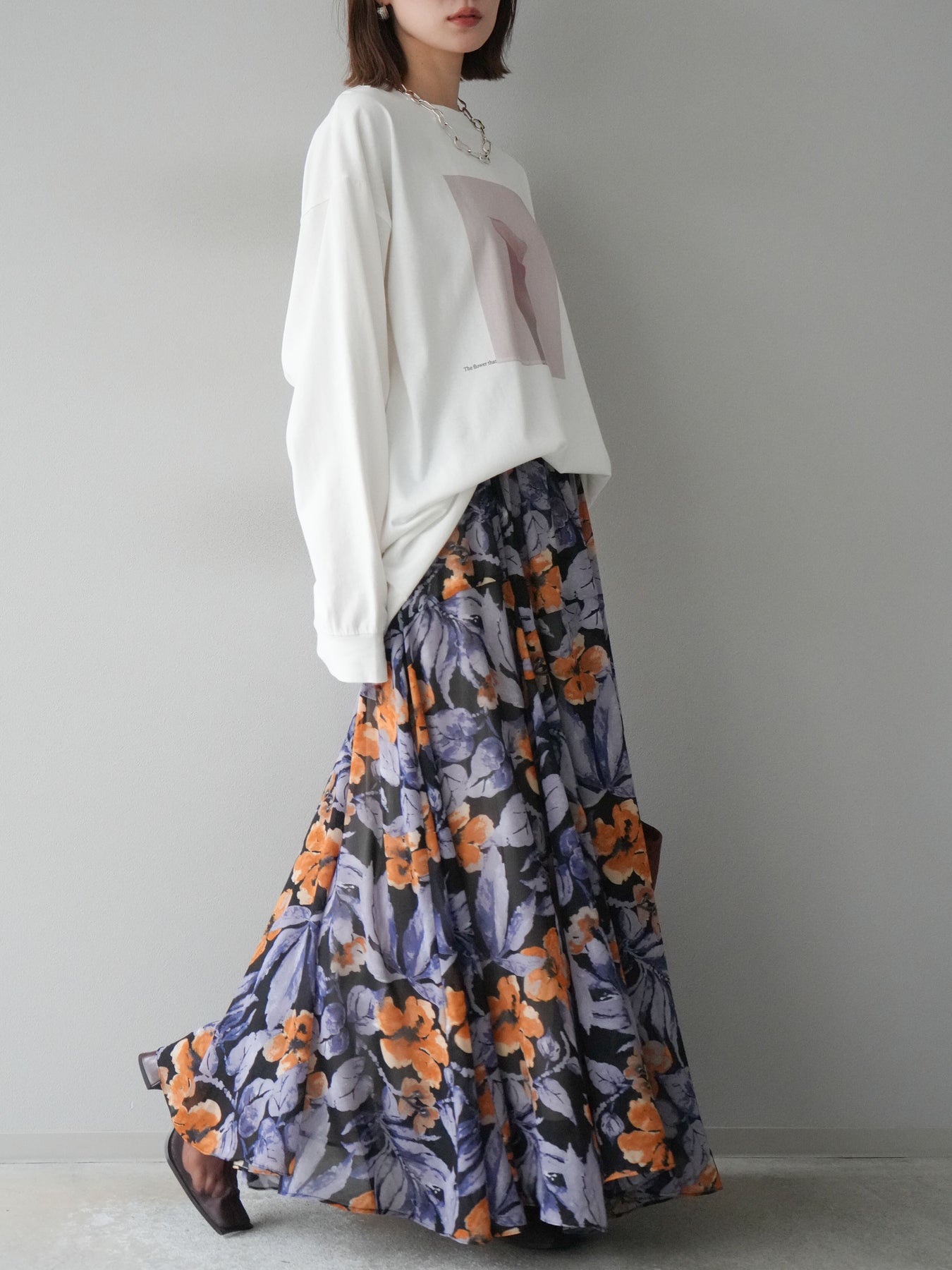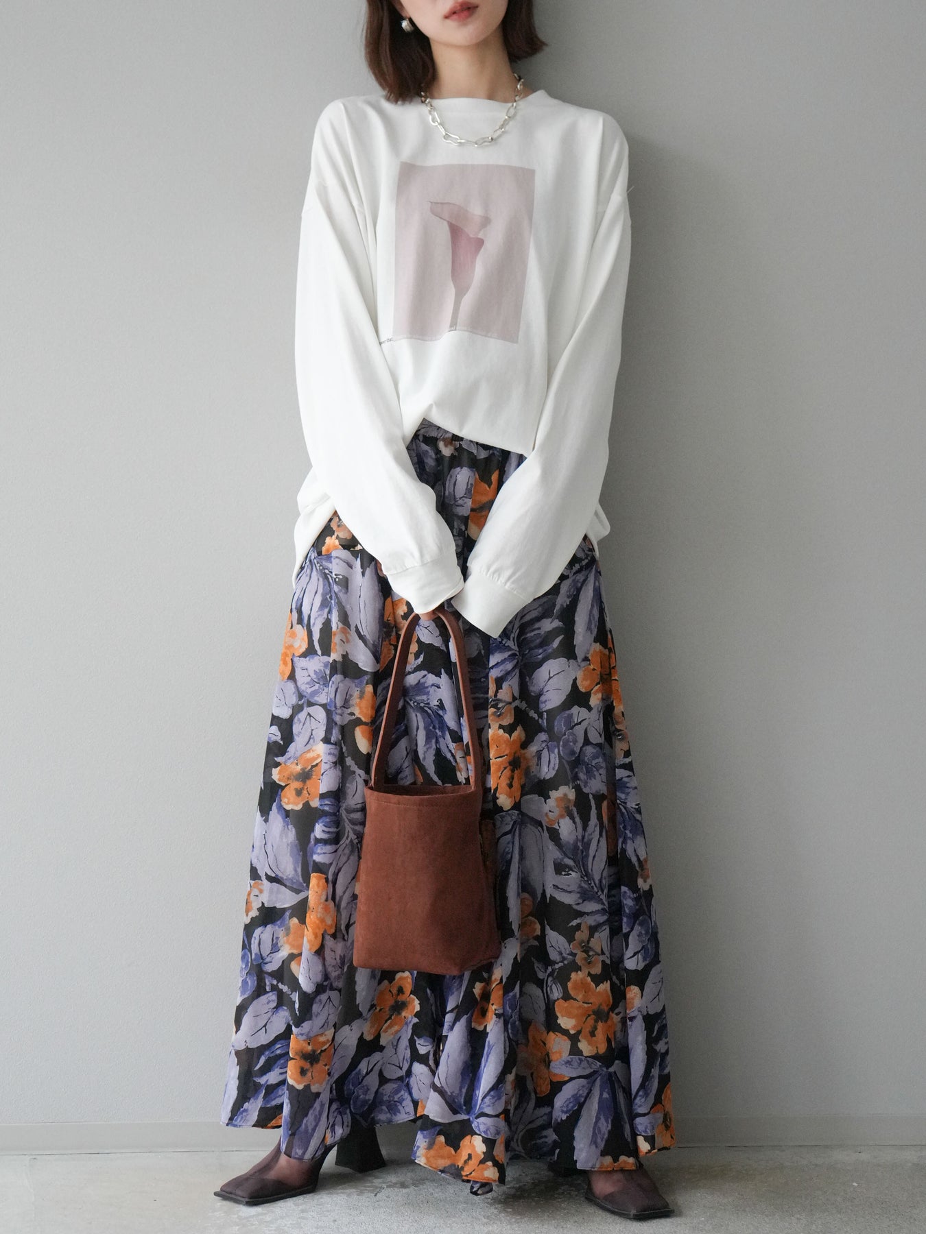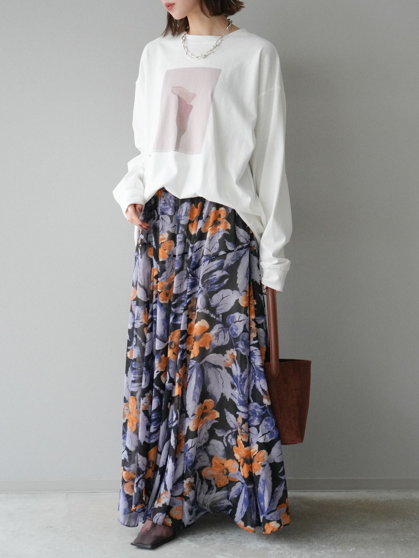 [予約]フラワープリントボリュームフレアスカート/ブラック