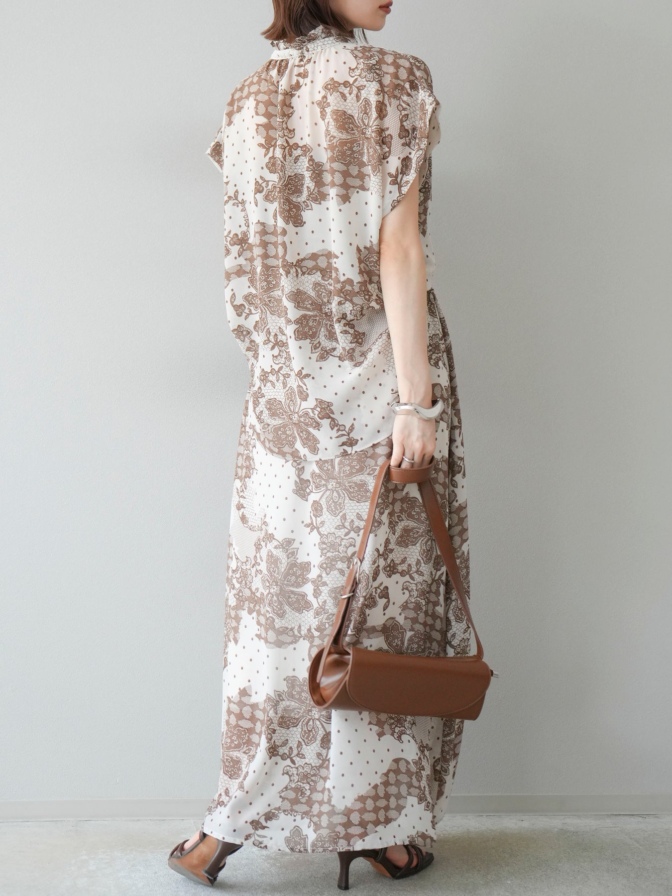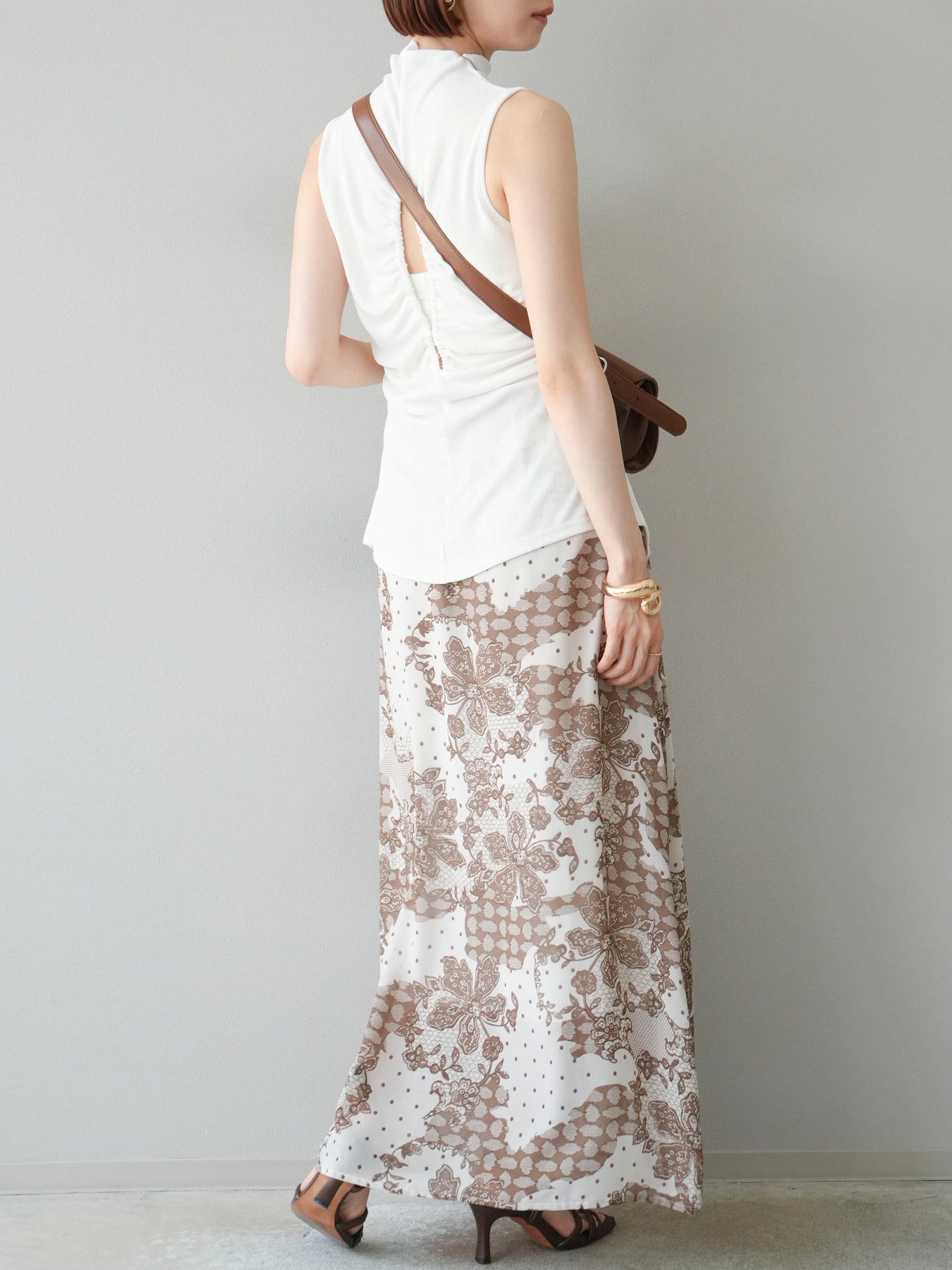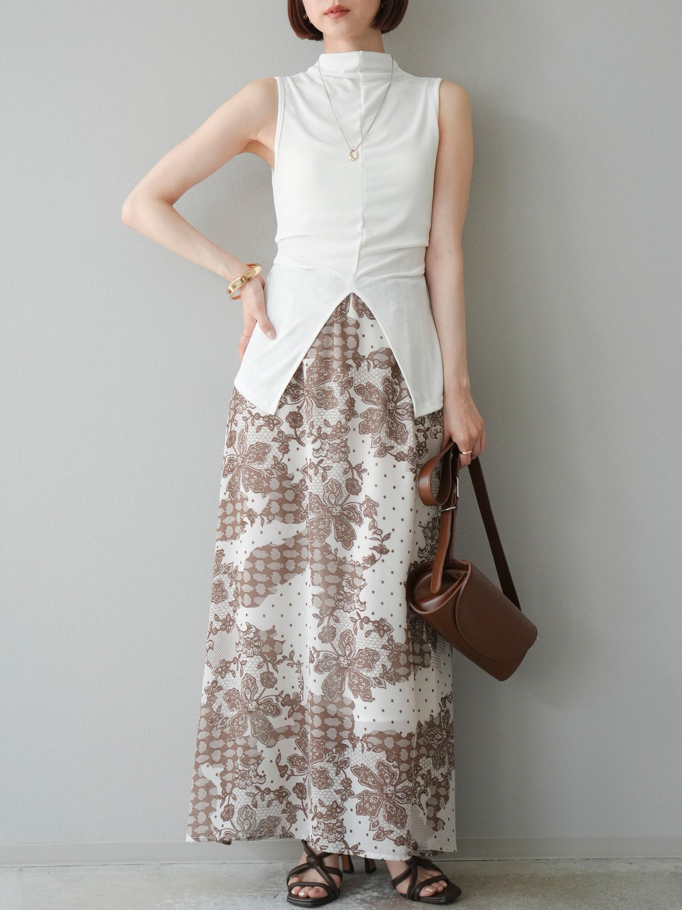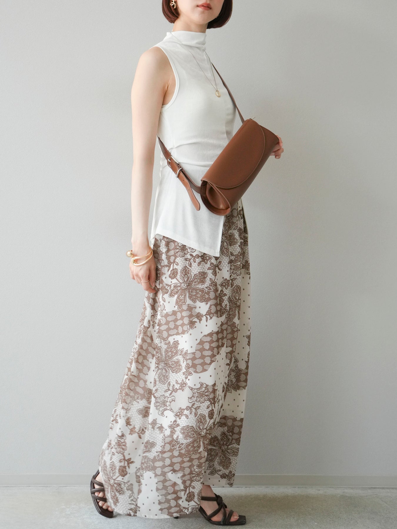 繊細なフラワーレース調プリントが施された、軽やかで華やかなフレアスカート。やわらかな素材感が動くたびにふんわりと揺れ、女性らしさを引き立てます。 ウエストは総ゴム仕様で、リラクシーな穿き心地ながら、すっきりとした腰まわりと程よい広がりのシルエットが上品な印象に。 シンプルなトップスと合わせるだけで、コーディネートの主役になる存在感のある一着です。