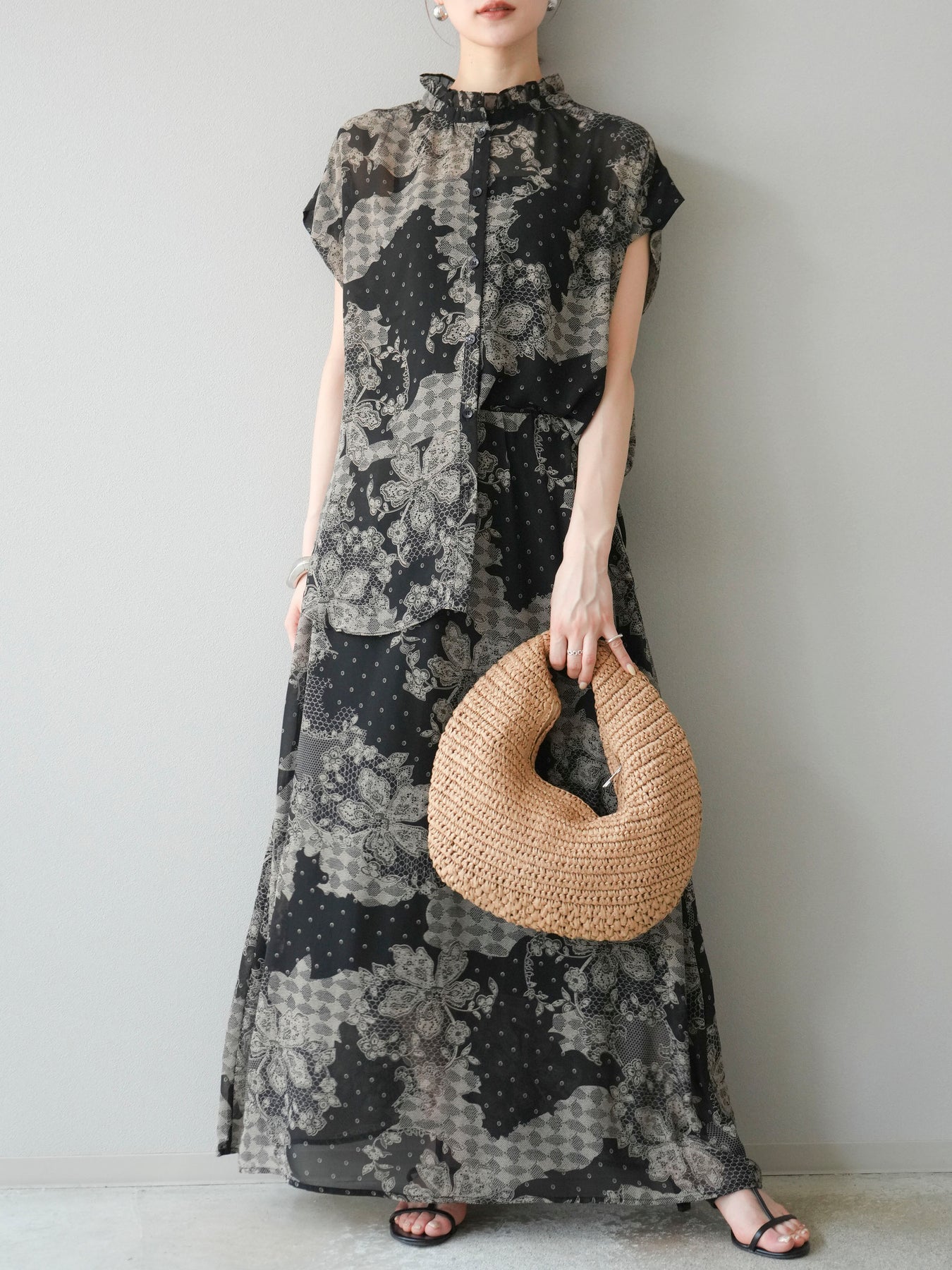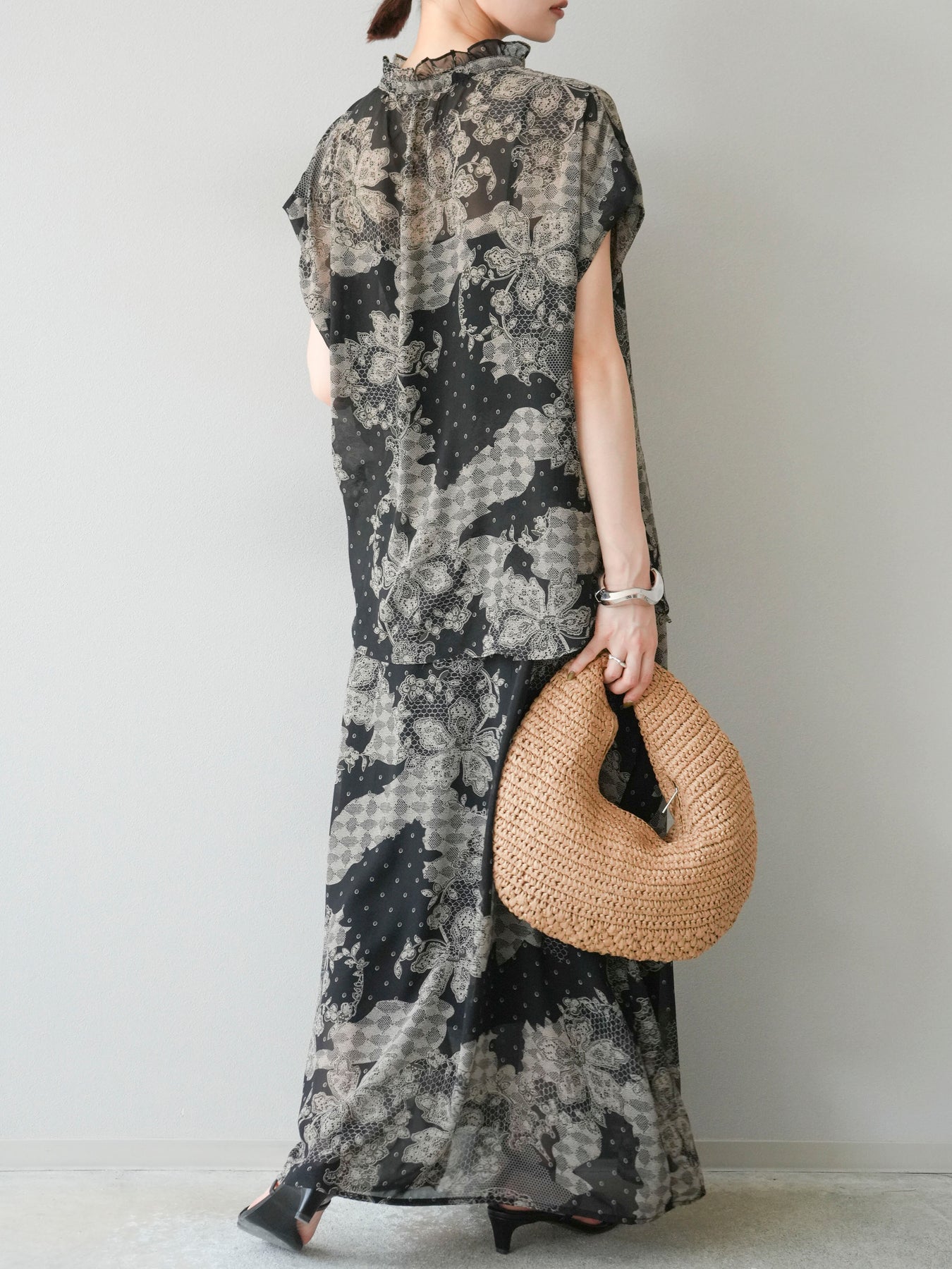 [予約]フラワーパターンフレアスカート/ブラック