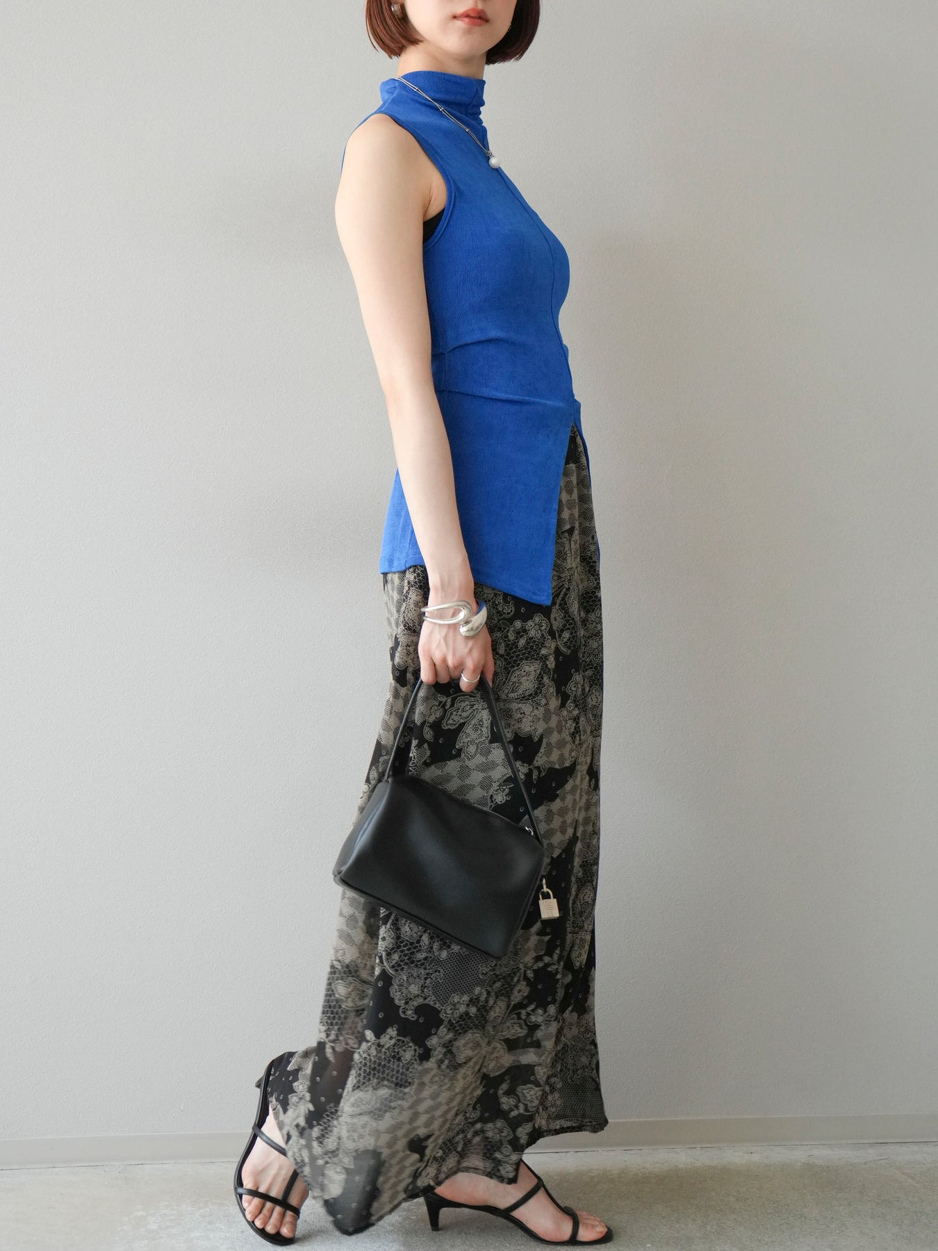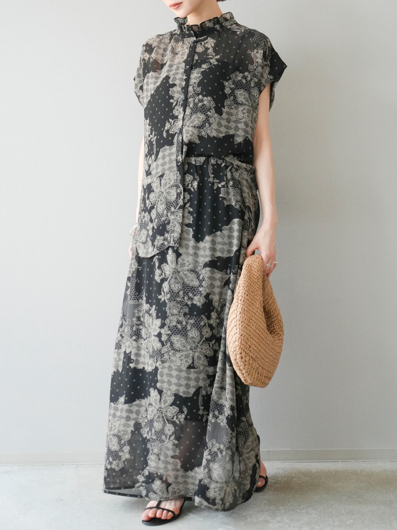 繊細なフラワーレース調プリントが施された、軽やかで華やかなフレアスカート。やわらかな素材感が動くたびにふんわりと揺れ、女性らしさを引き立てます。 ウエストは総ゴム仕様で、リラクシーな穿き心地ながら、すっきりとした腰まわりと程よい広がりのシルエットが上品な印象に。 シンプルなトップスと合わせるだけで、コーディネートの主役になる存在感のある一着です。