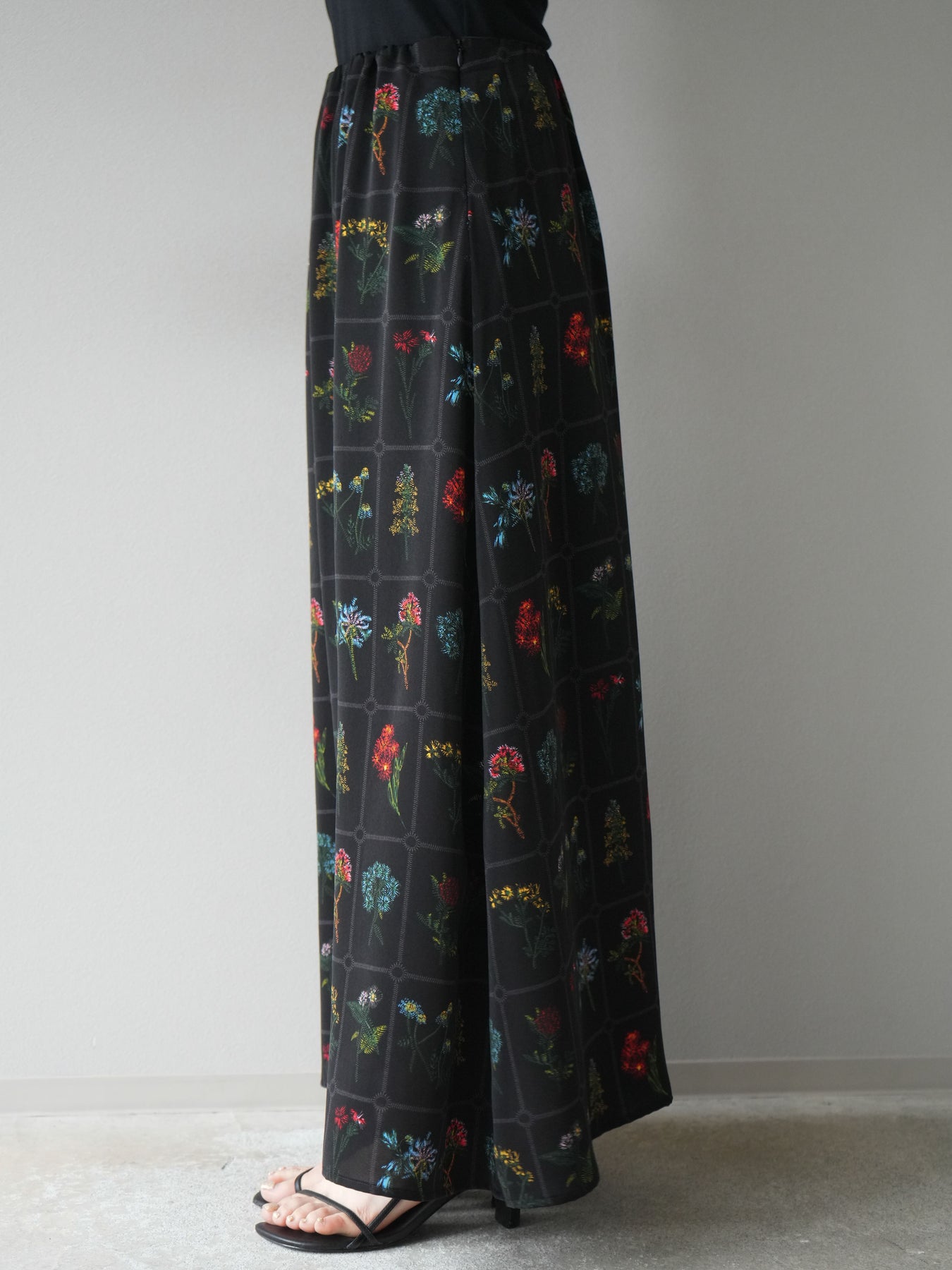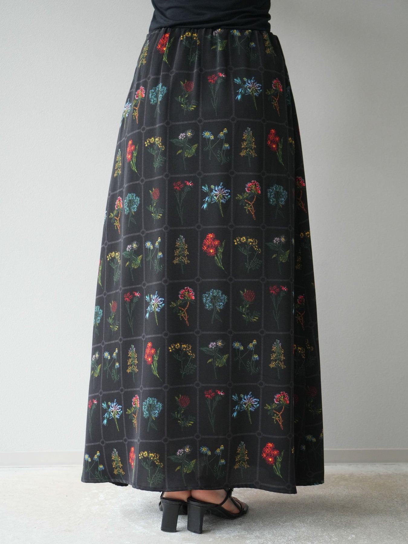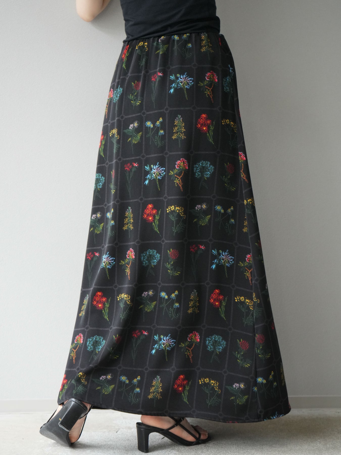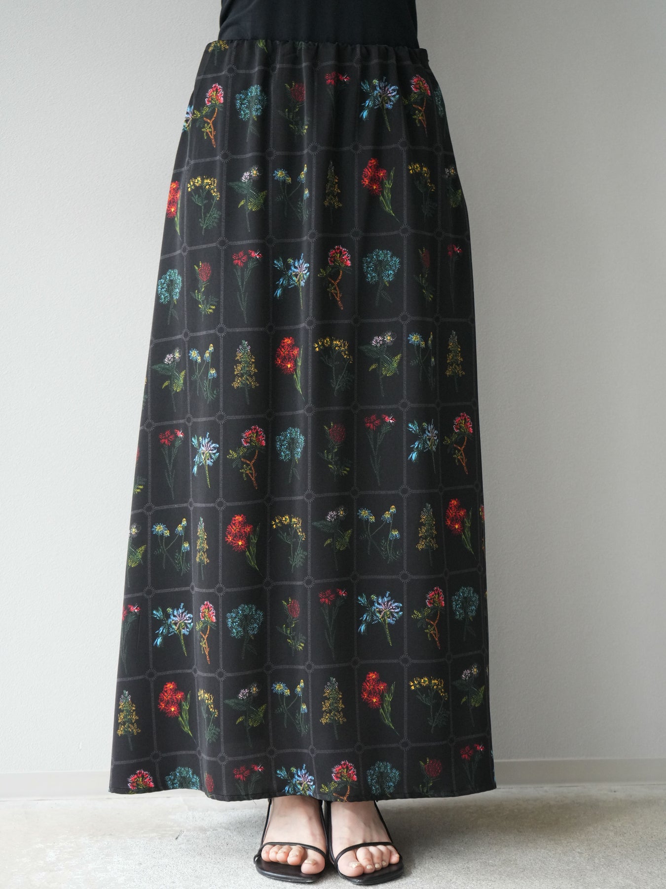 [予約]パッチワークフラワープリントフレアスカート/ブラック