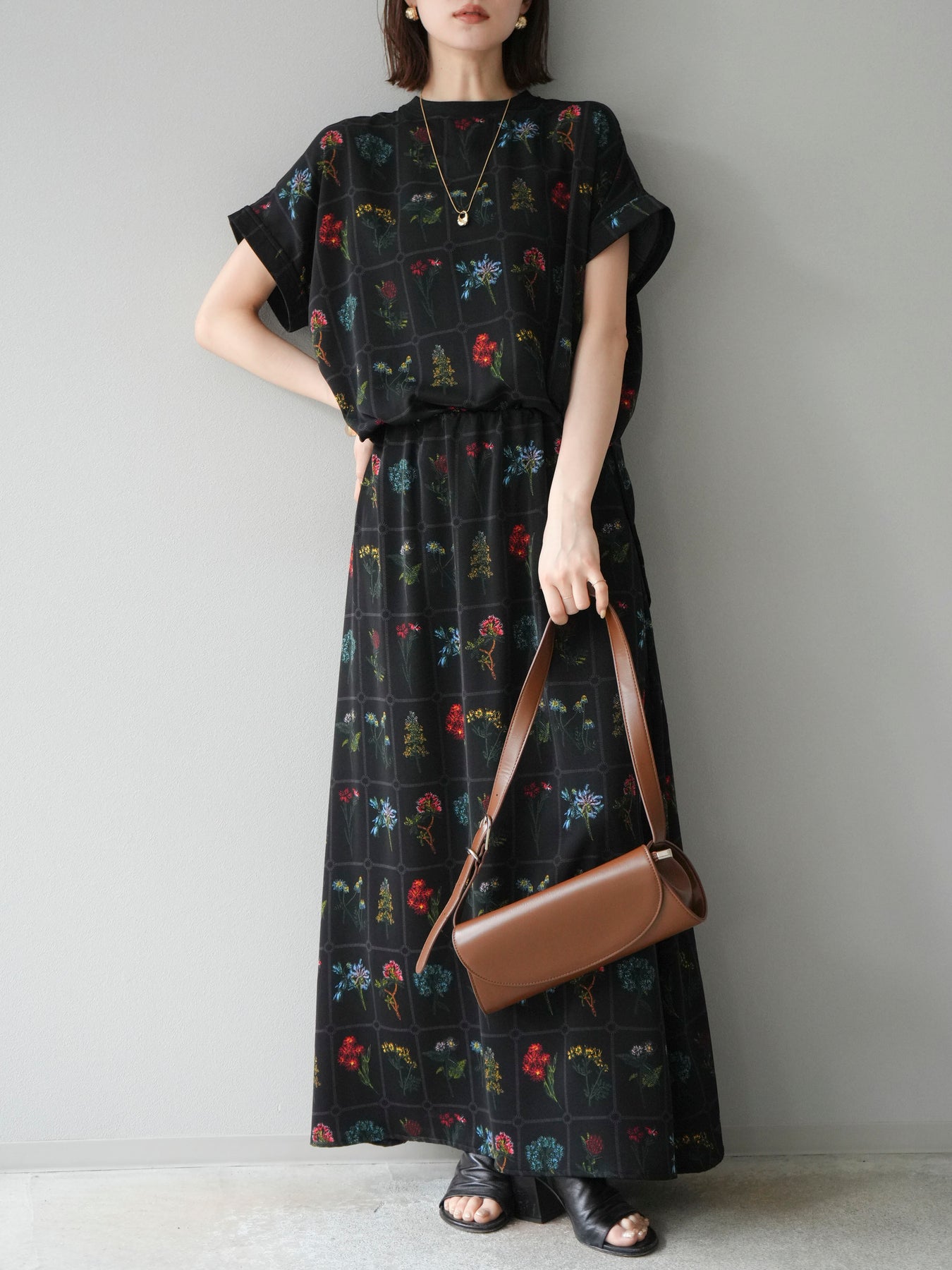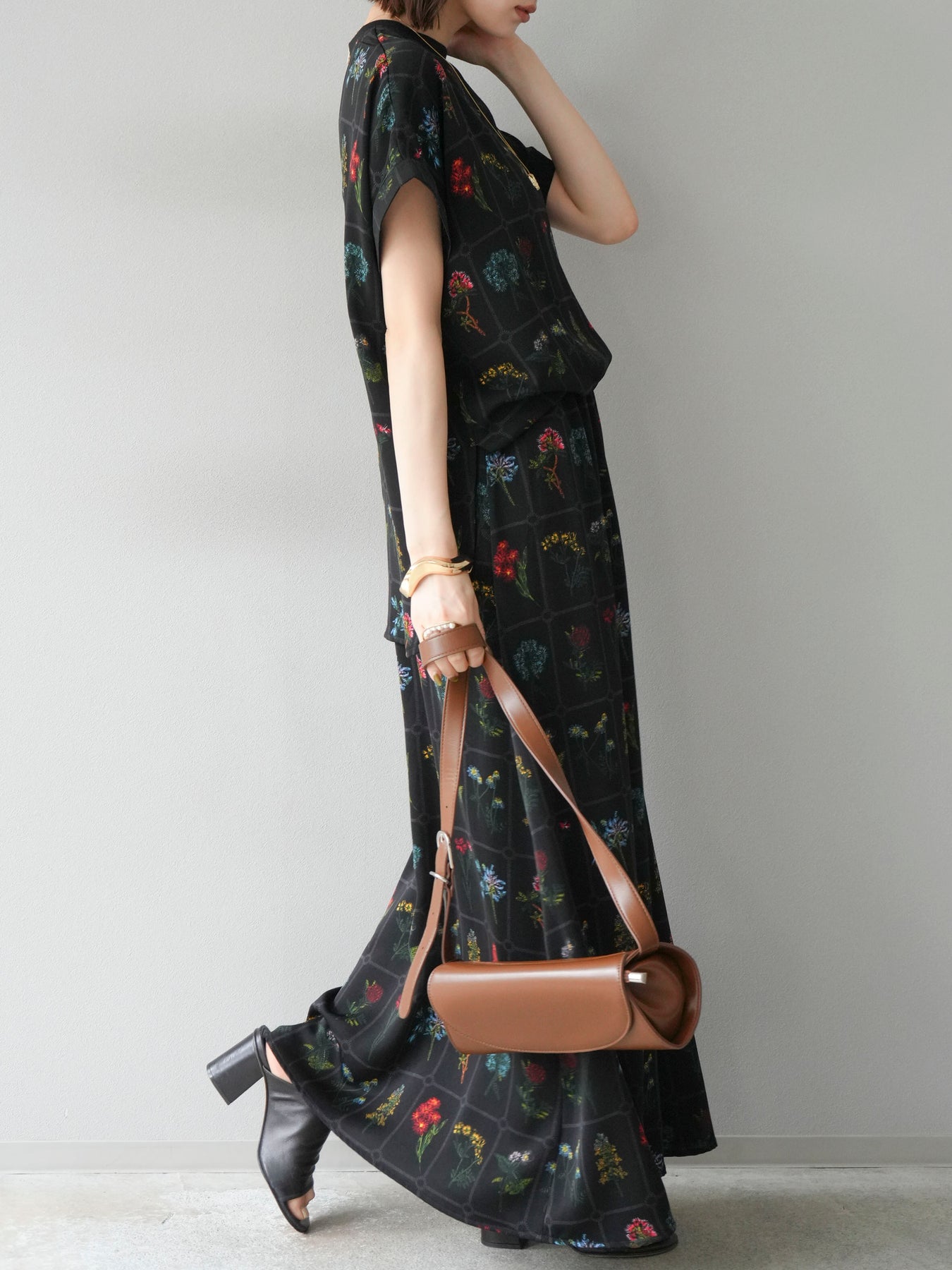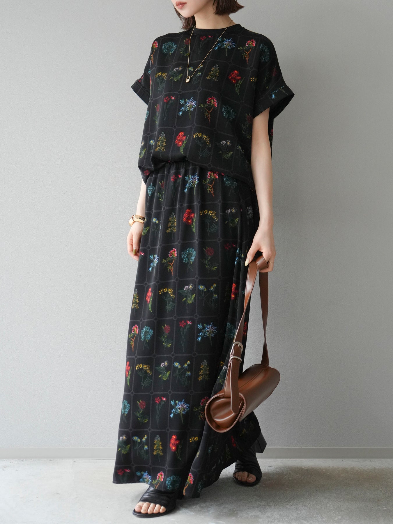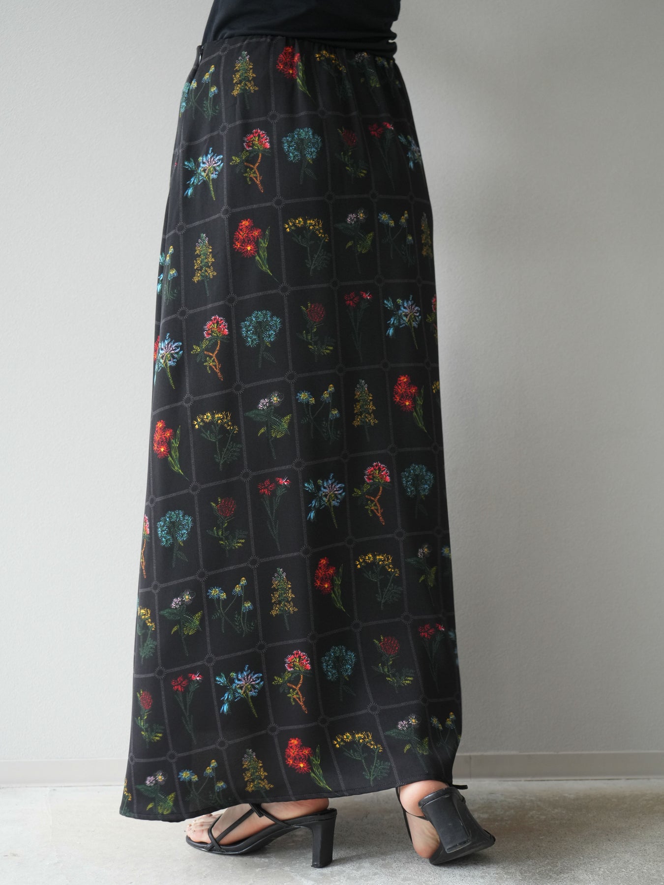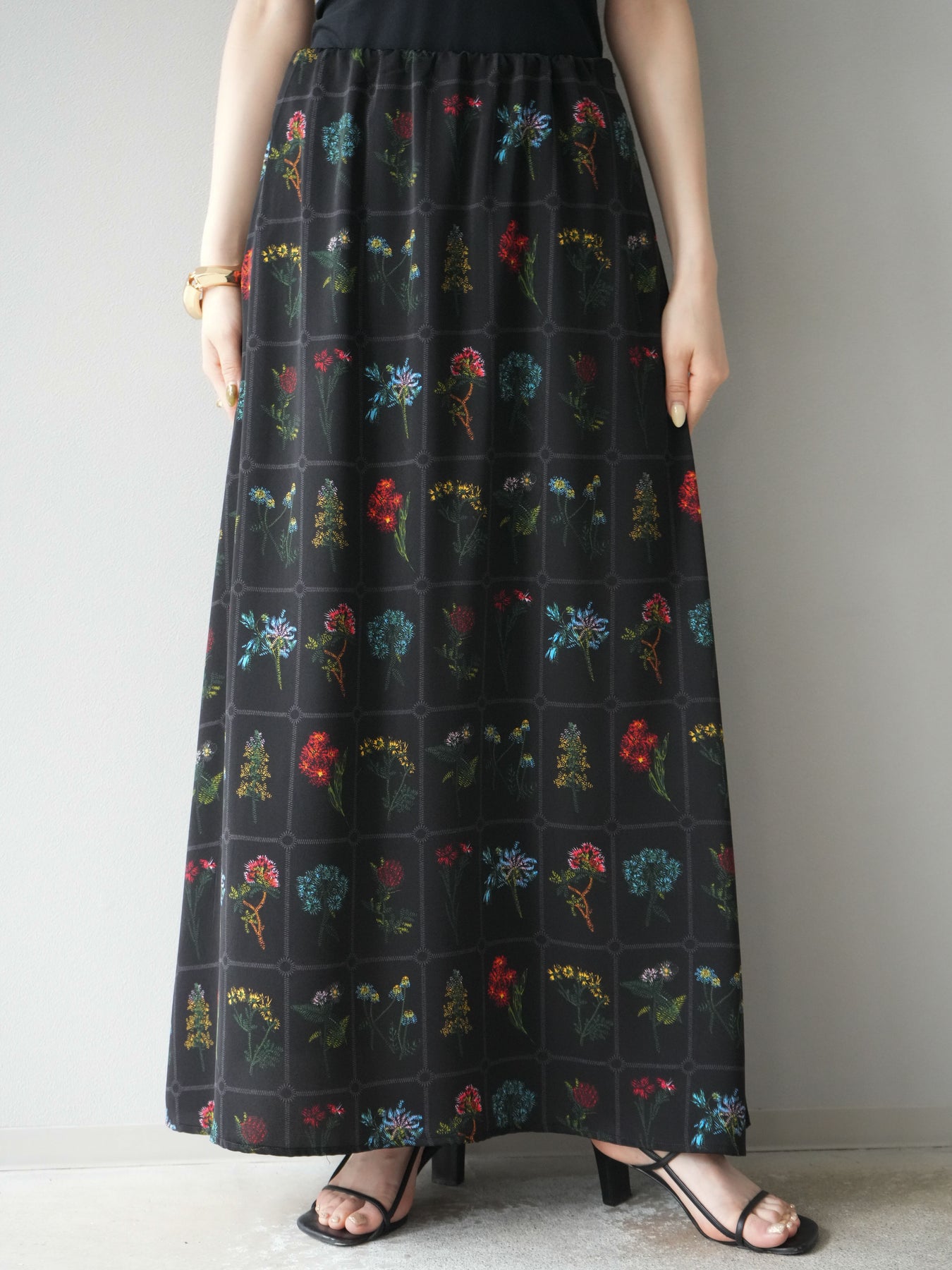 [予約]パッチワークフラワープリントフレアスカート/ブラック