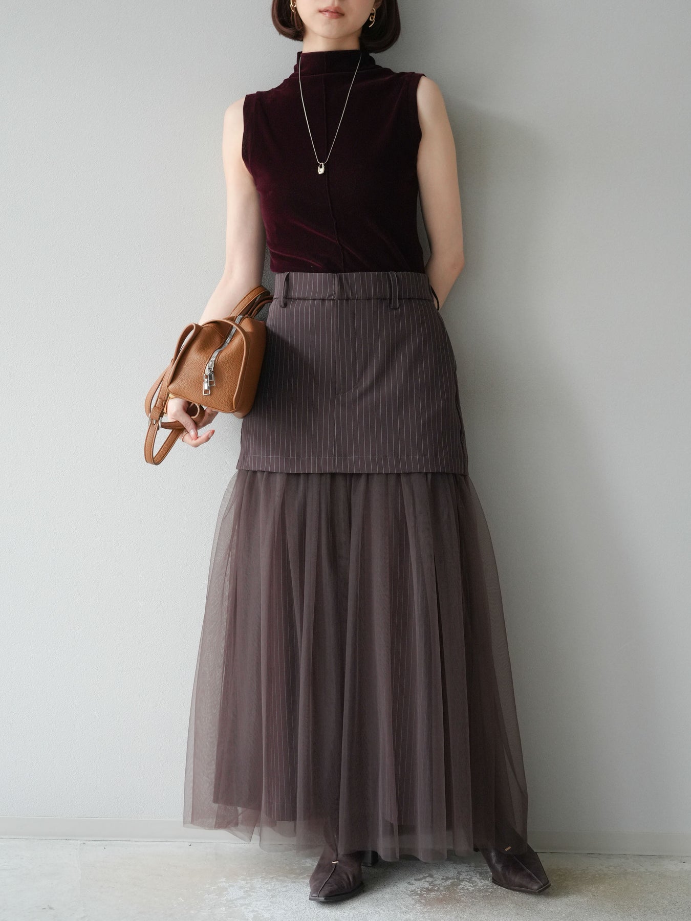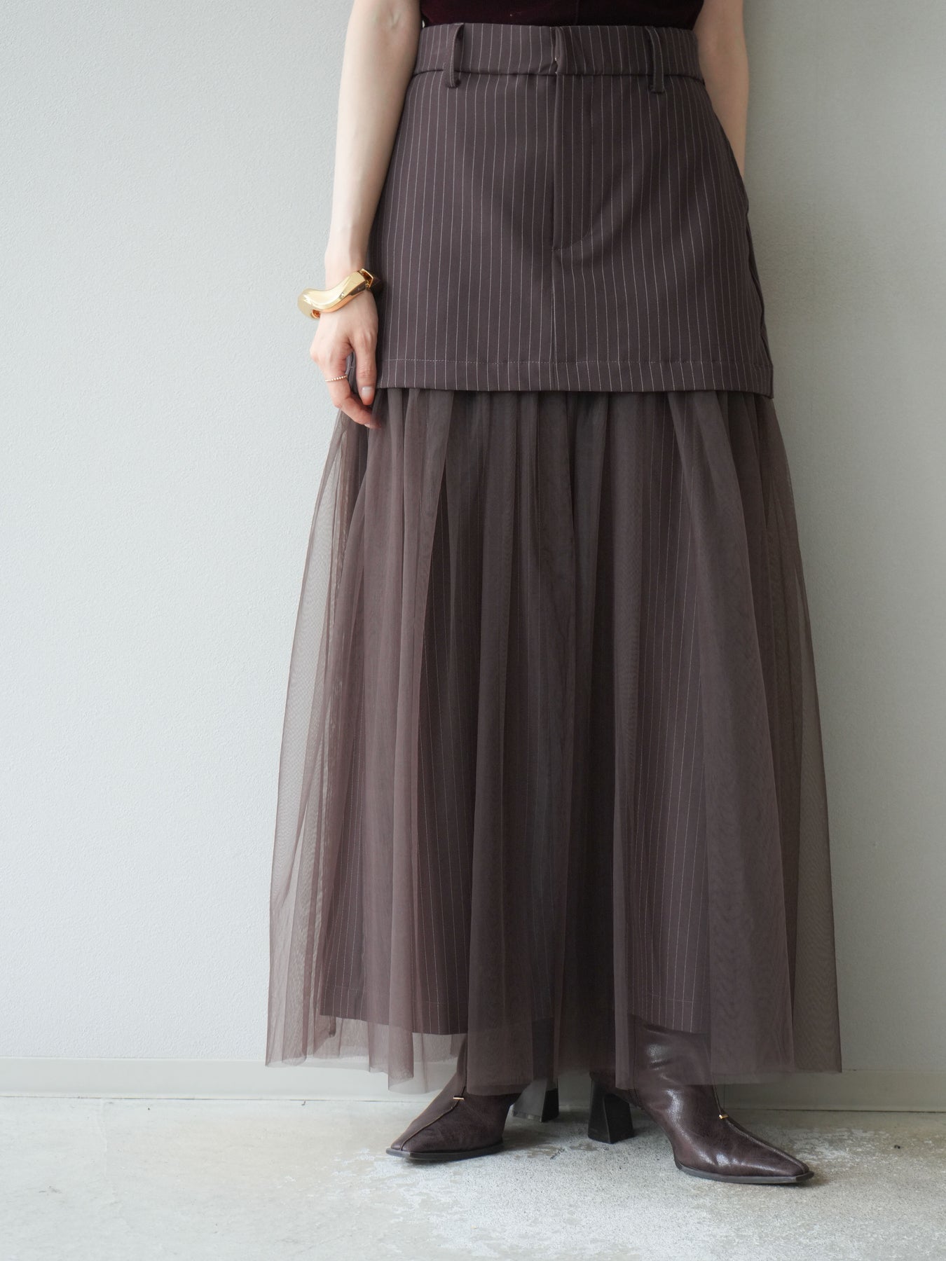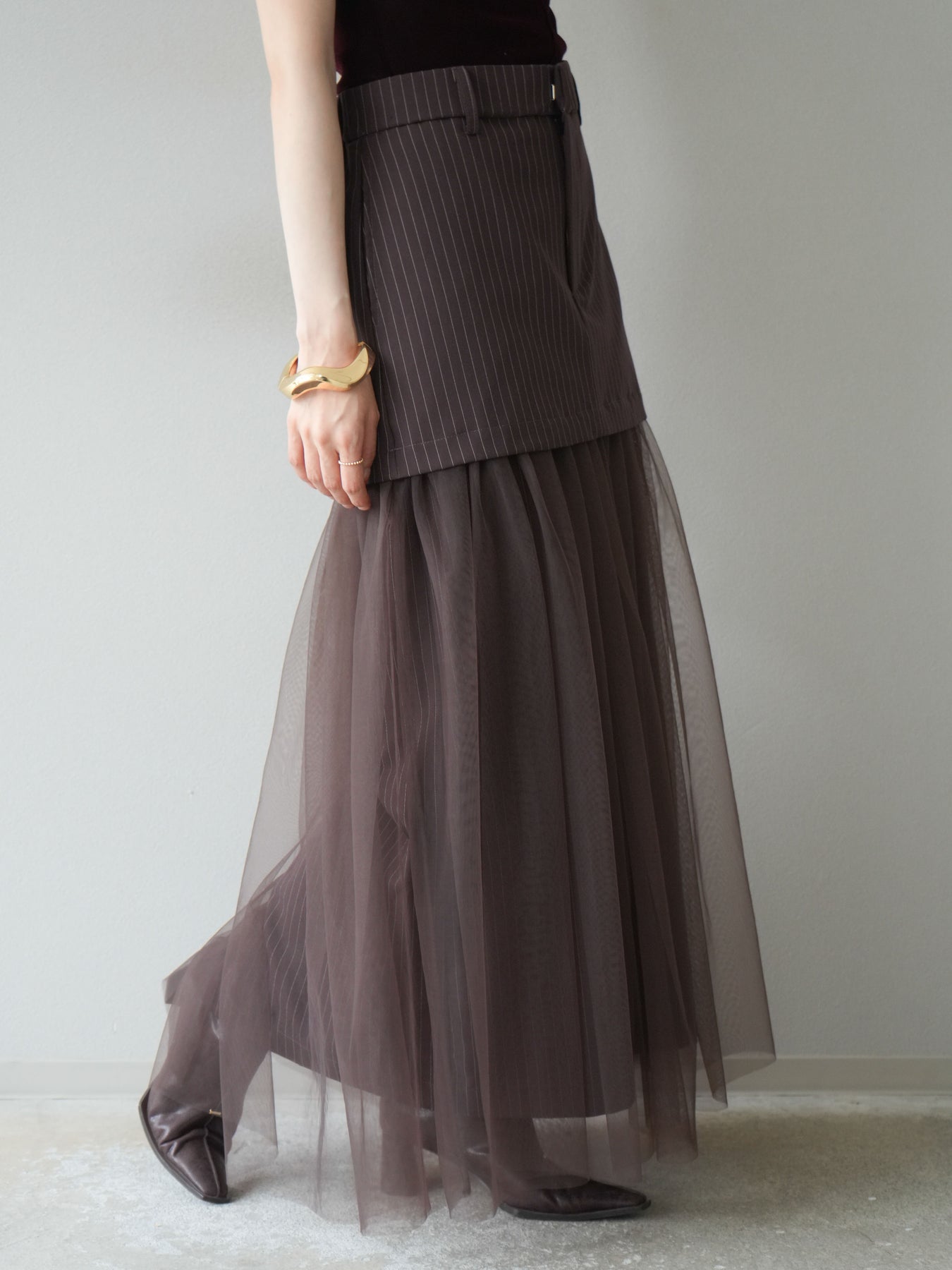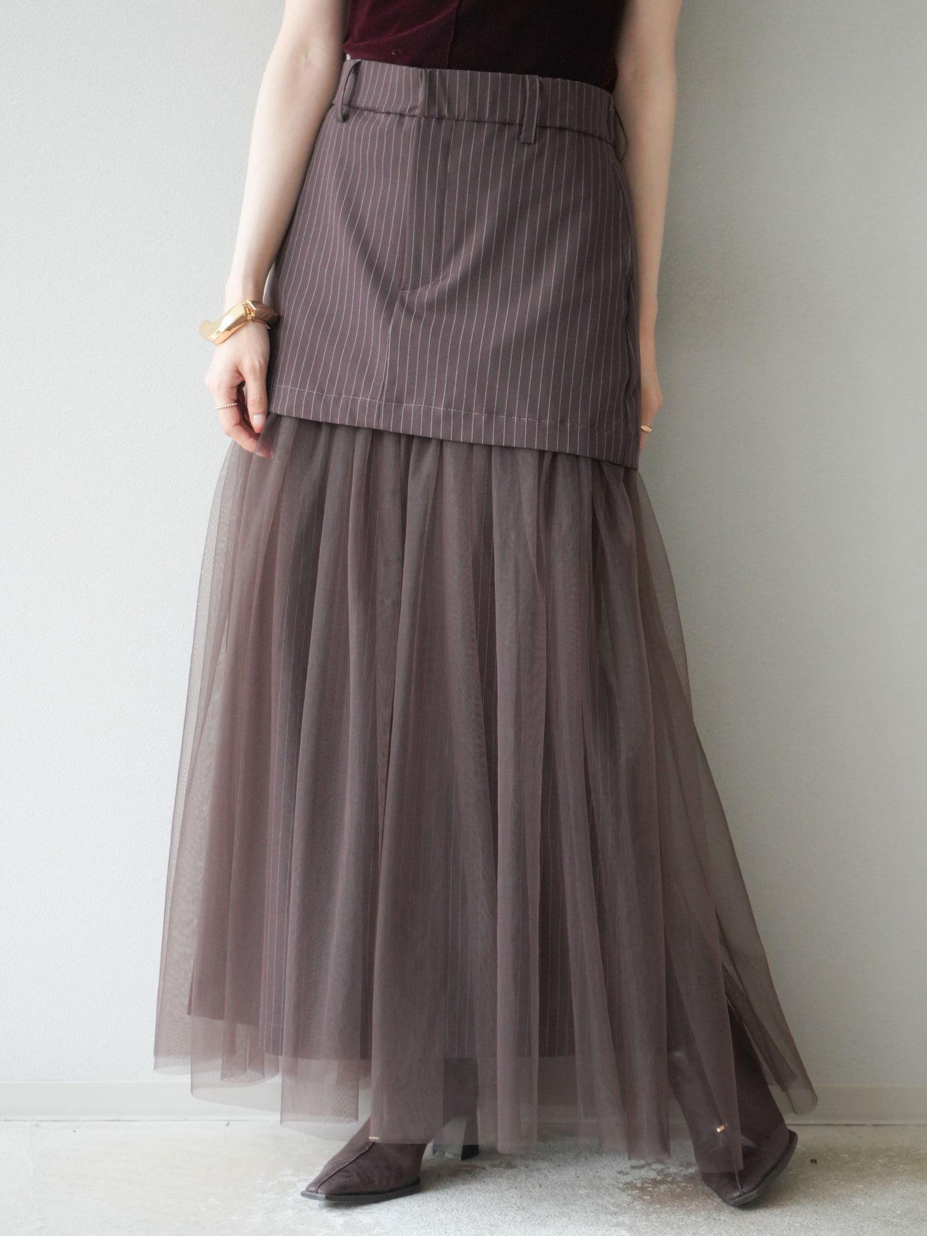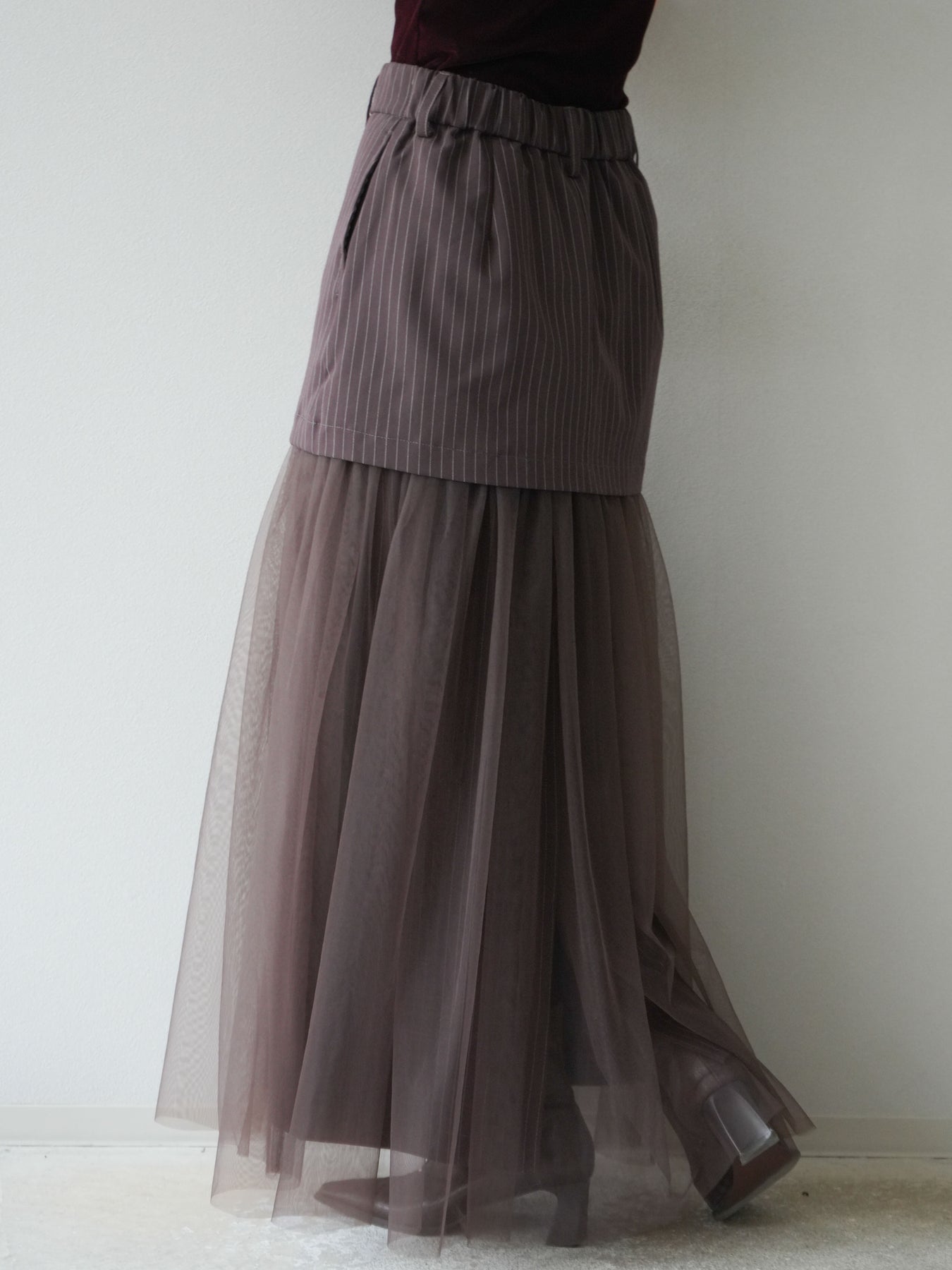 ストライプ生地とチュール素材を切り替えたデザインが特徴的なスカート。異素材の組み合わせがスタイリングに奥行きを与え、シンプルなトップスと合わせるだけで華やかな印象に仕上がります。ウエスト部分はすっきりとしたストライプで大人っぽさを演出し、裾にかけて広がるチュールが軽やかな揺れをプラス。縦ラインを強調することでスタイルアップ効果も期待できます。カジュアルからきれいめまで幅広く対応でき、シーズンを問わず活躍する主役級アイテムです。