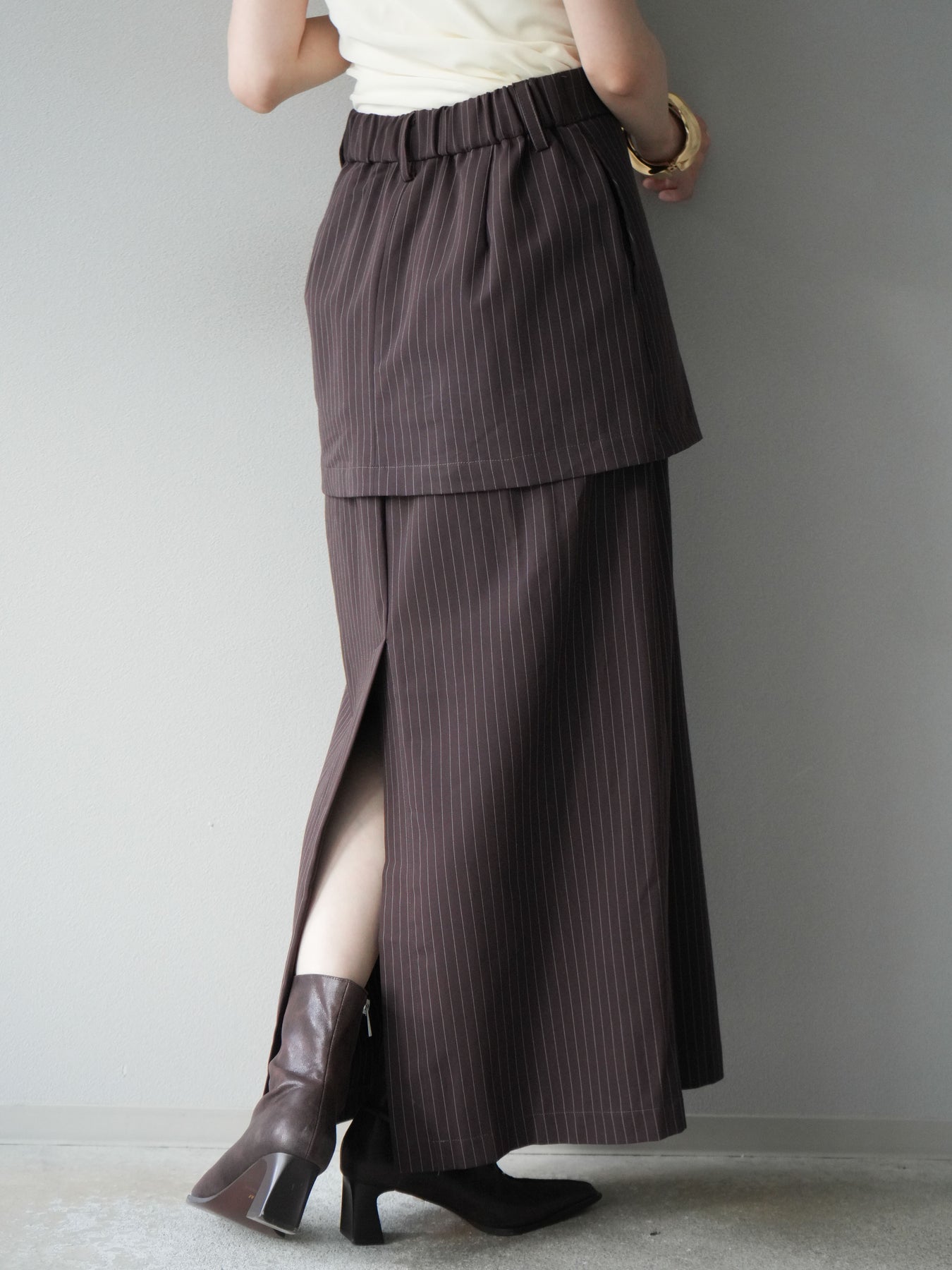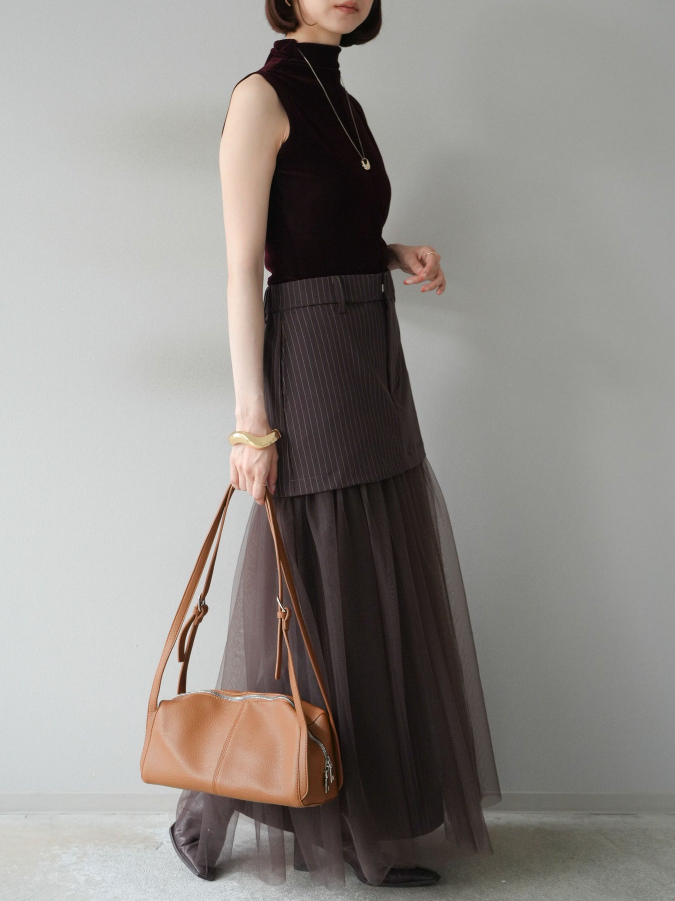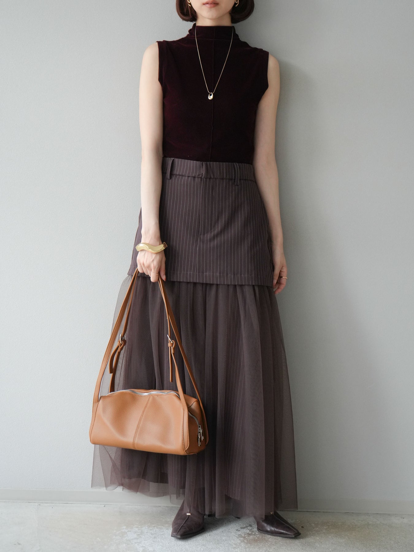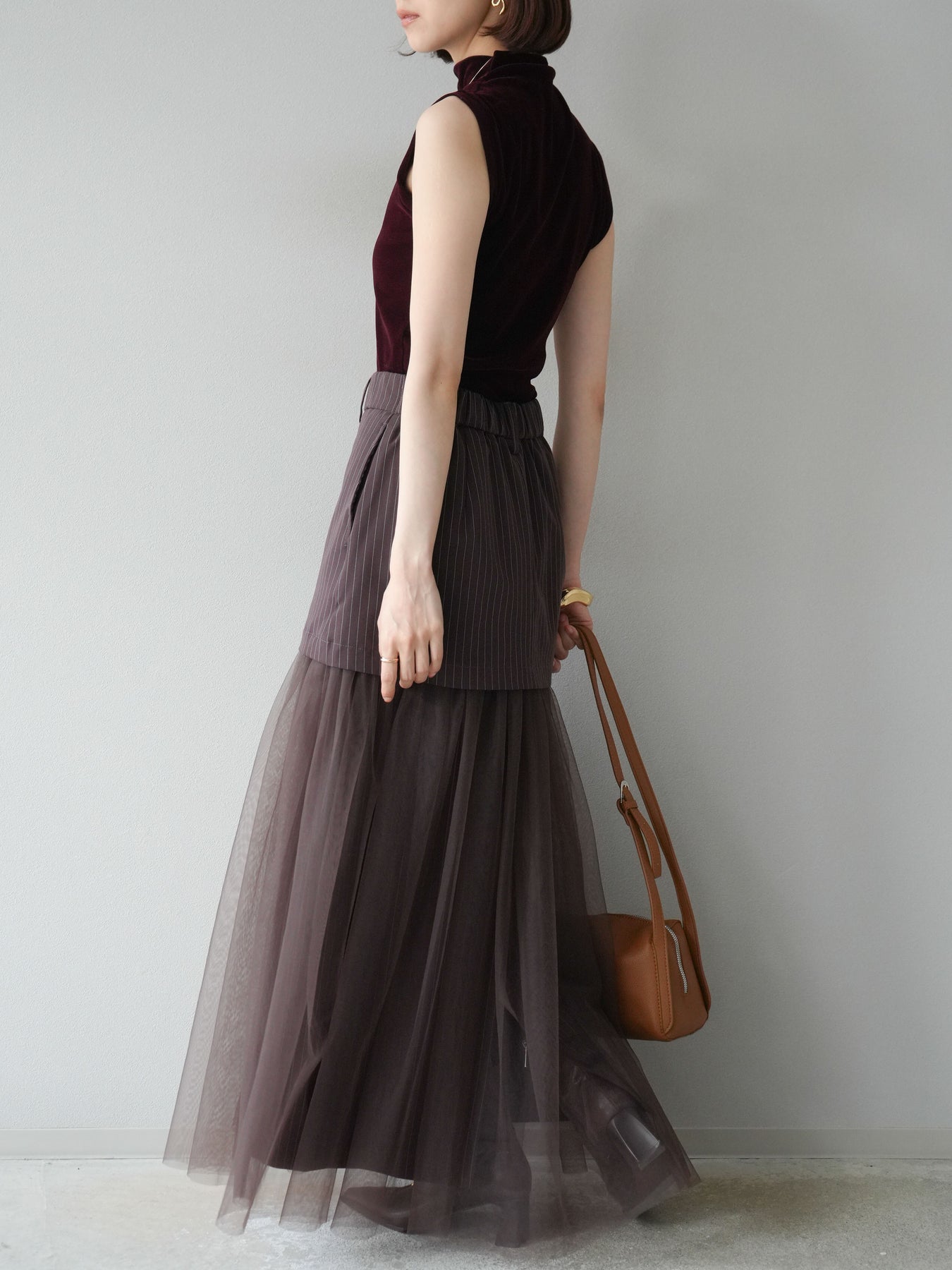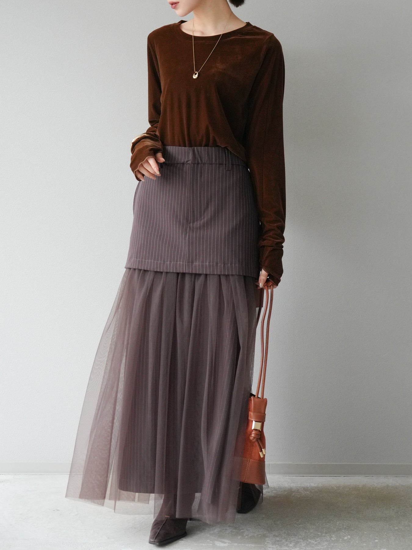ストライプ生地とチュール素材を切り替えたデザインが特徴的なスカート。異素材の組み合わせがスタイリングに奥行きを与え、シンプルなトップスと合わせるだけで華やかな印象に仕上がります。ウエスト部分はすっきりとしたストライプで大人っぽさを演出し、裾にかけて広がるチュールが軽やかな揺れをプラス。縦ラインを強調することでスタイルアップ効果も期待できます。カジュアルからきれいめまで幅広く対応でき、シーズンを問わず活躍する主役級アイテムです。