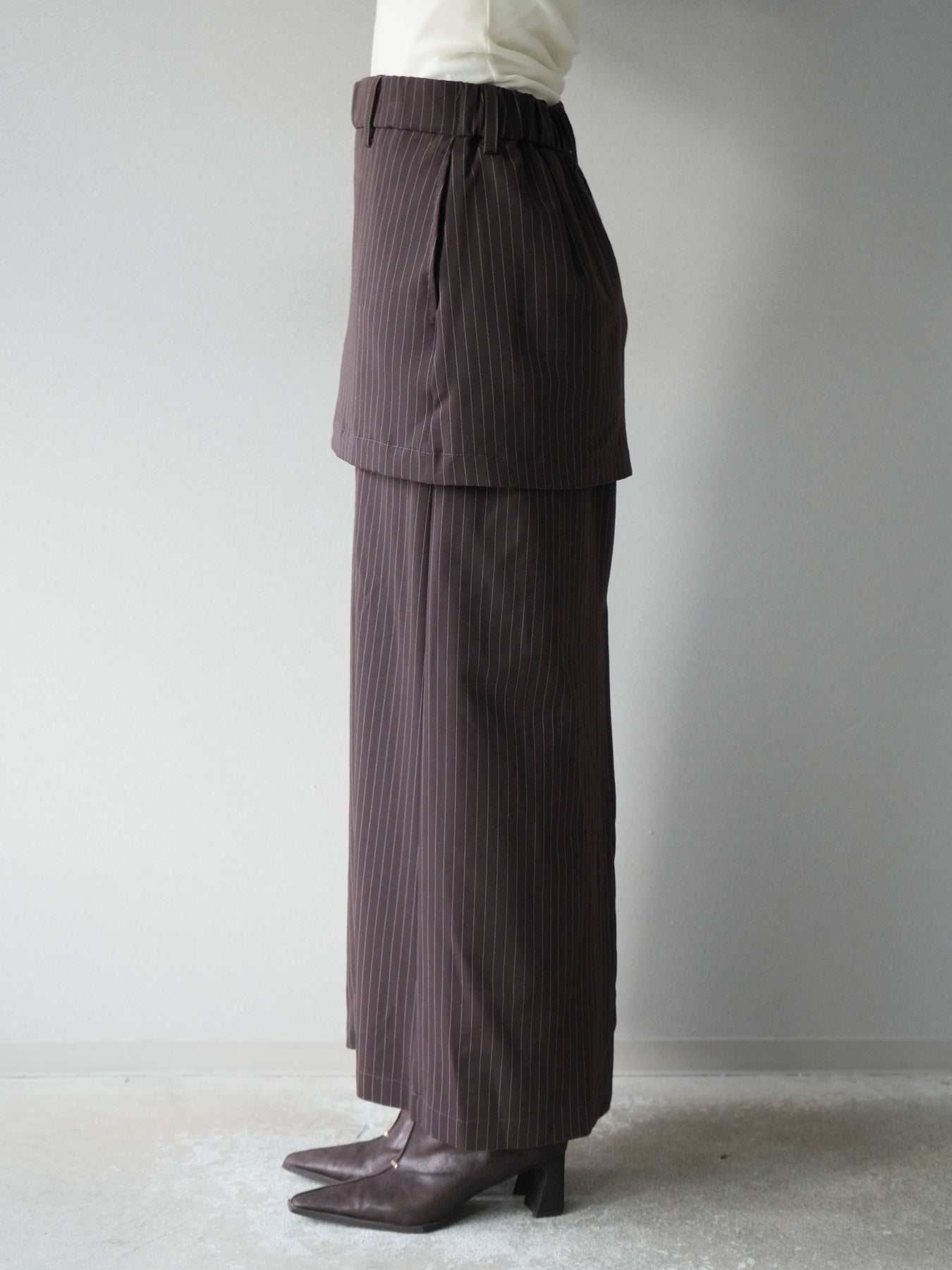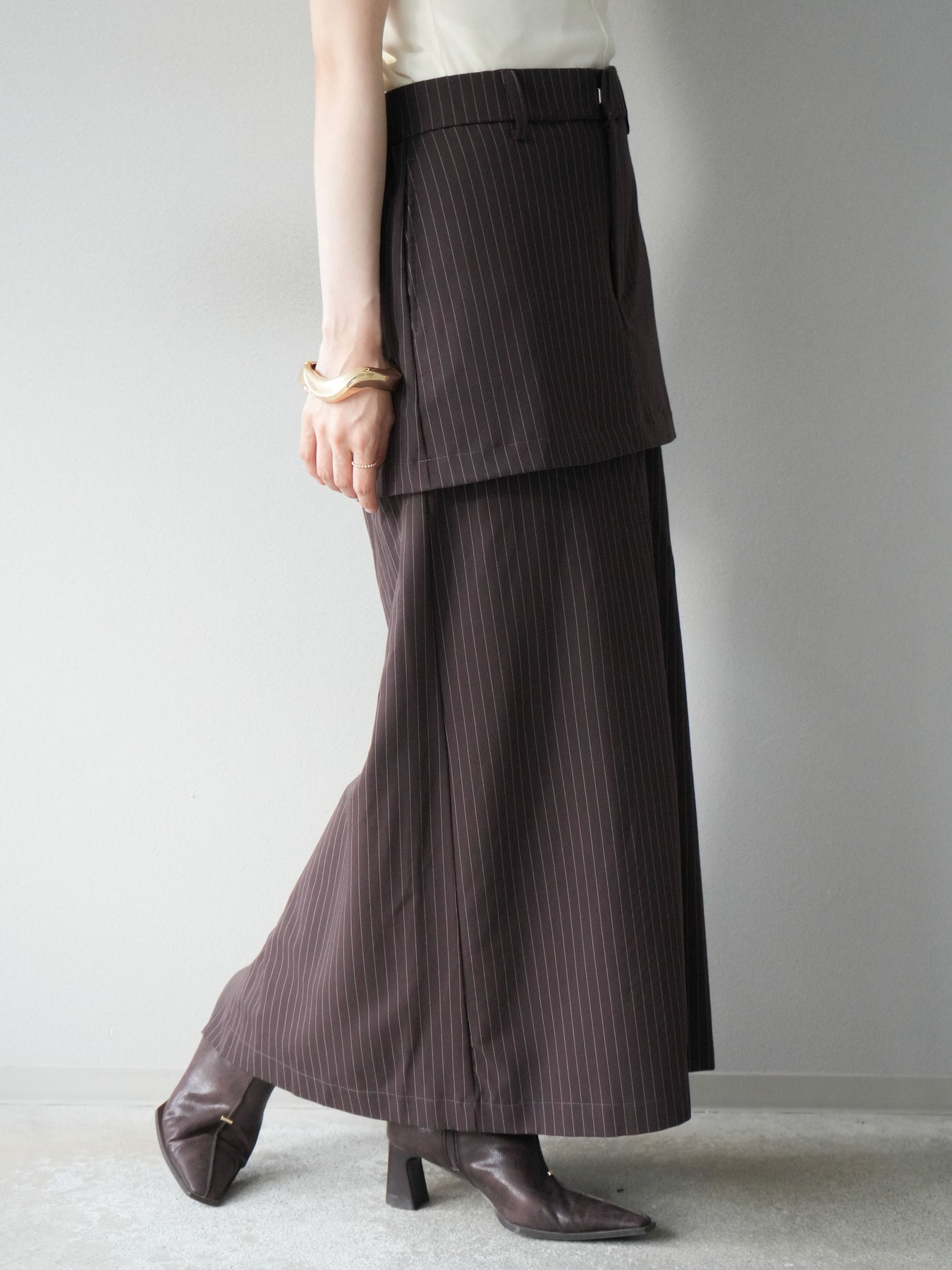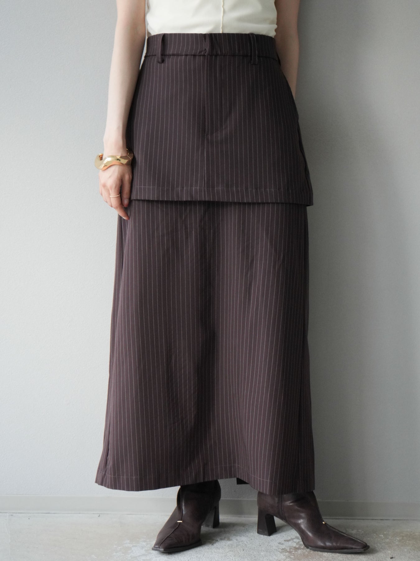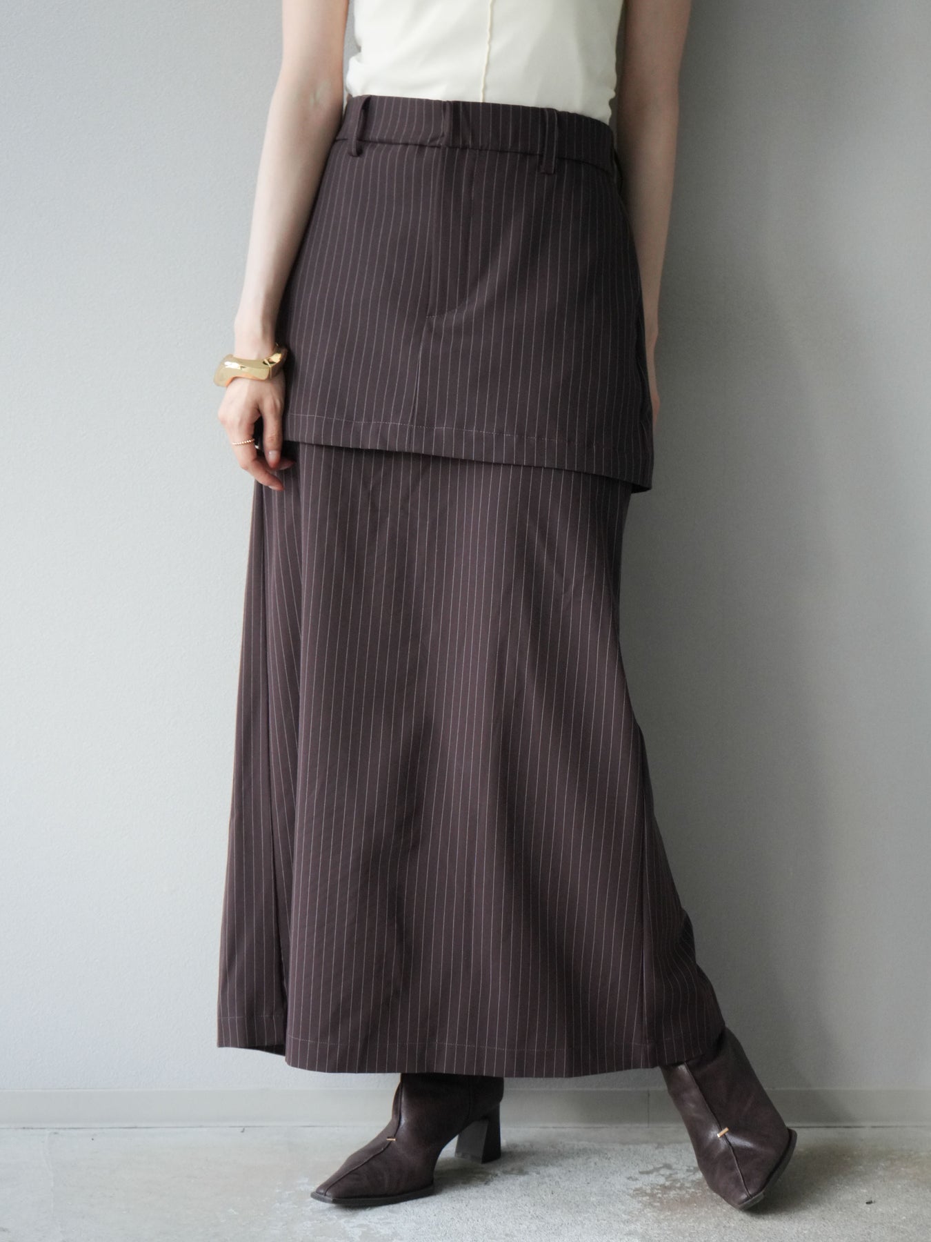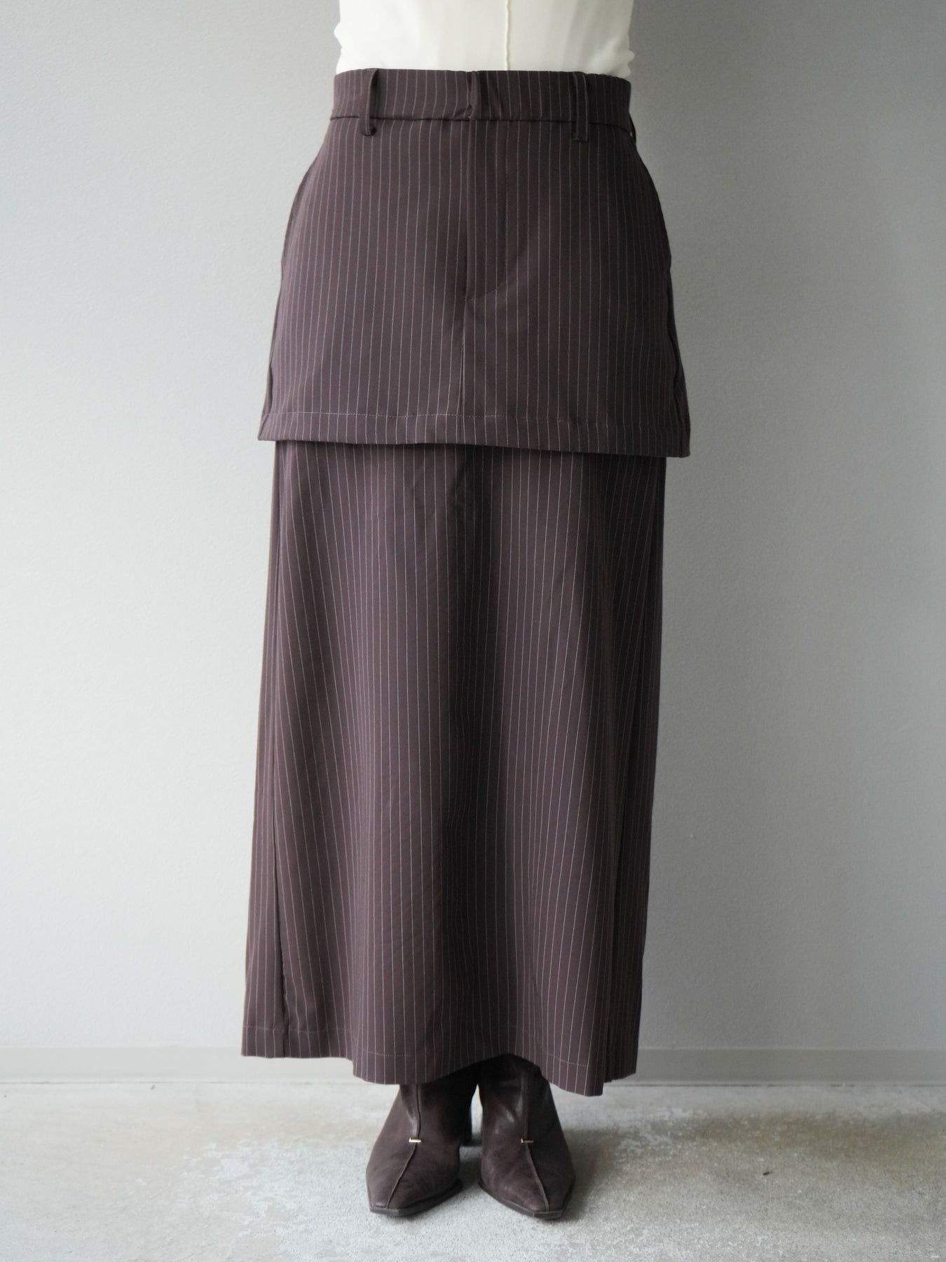 ストライプ生地とチュール素材を切り替えたデザインが特徴的なスカート。異素材の組み合わせがスタイリングに奥行きを与え、シンプルなトップスと合わせるだけで華やかな印象に仕上がります。ウエスト部分はすっきりとしたストライプで大人っぽさを演出し、裾にかけて広がるチュールが軽やかな揺れをプラス。縦ラインを強調することでスタイルアップ効果も期待できます。カジュアルからきれいめまで幅広く対応でき、シーズンを問わず活躍する主役級アイテムです。