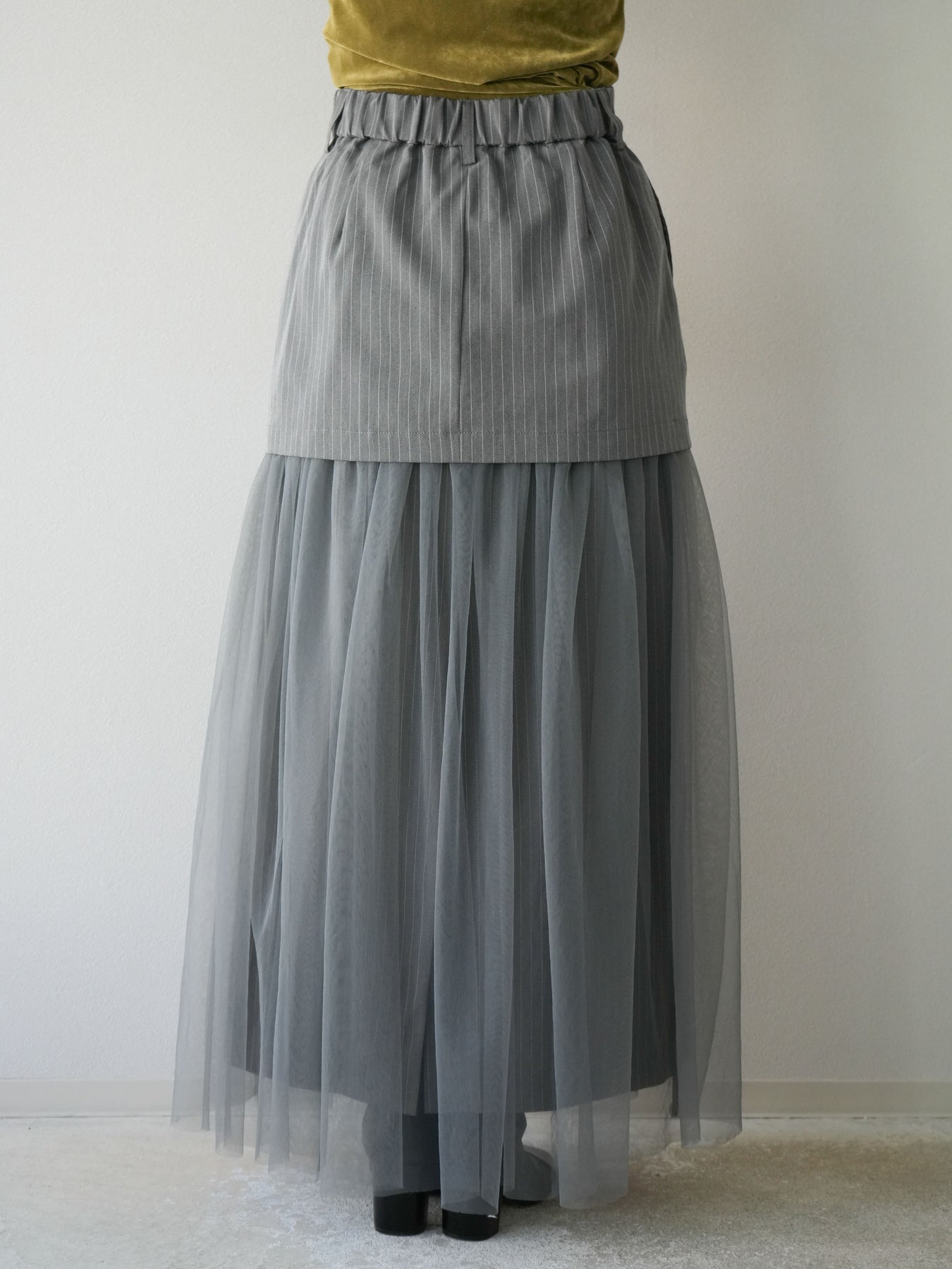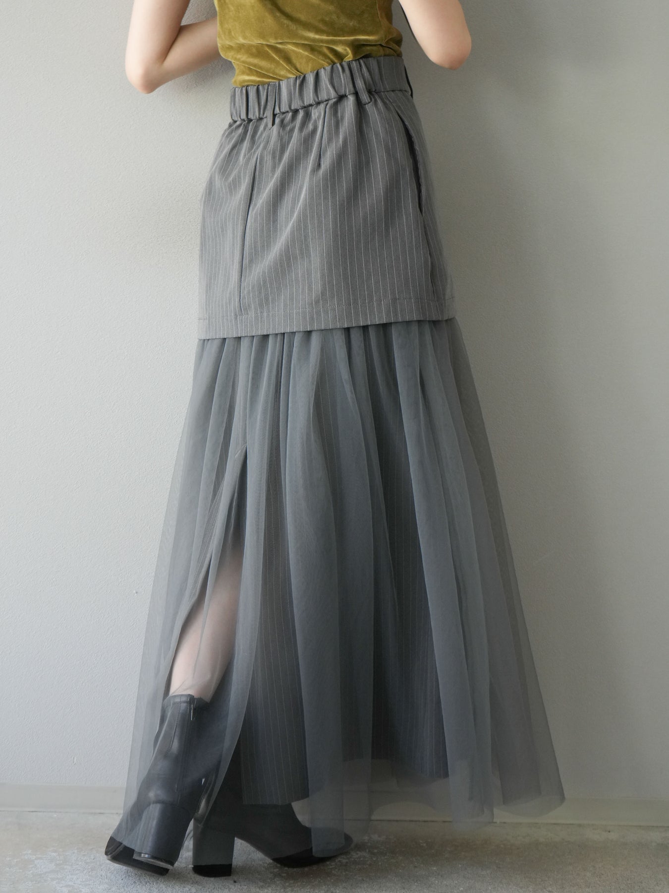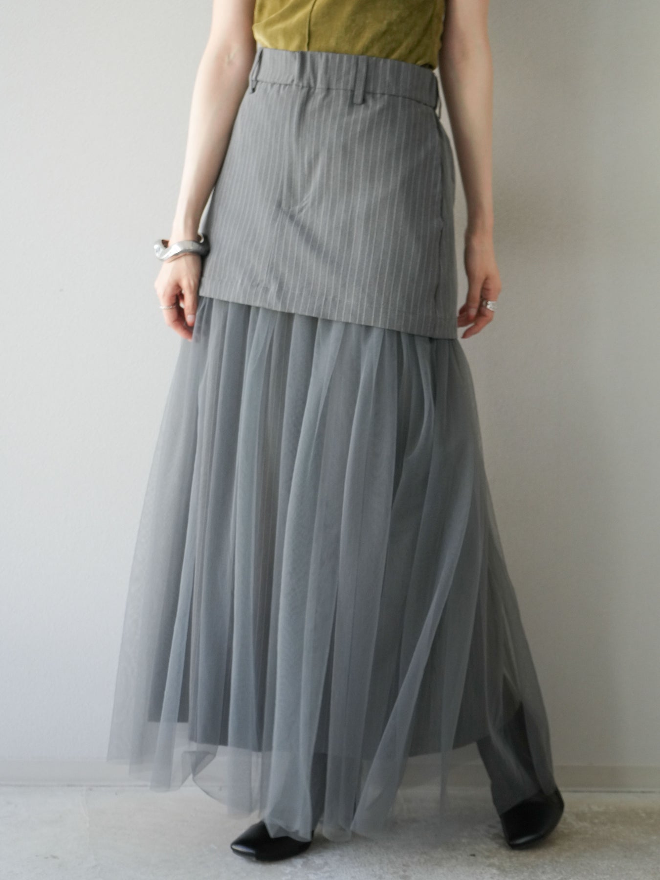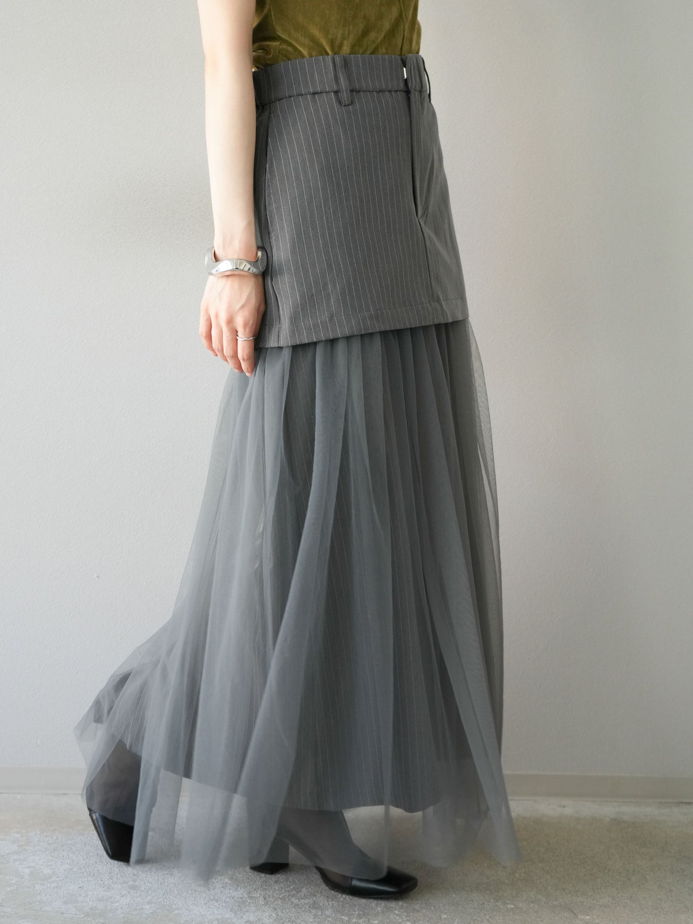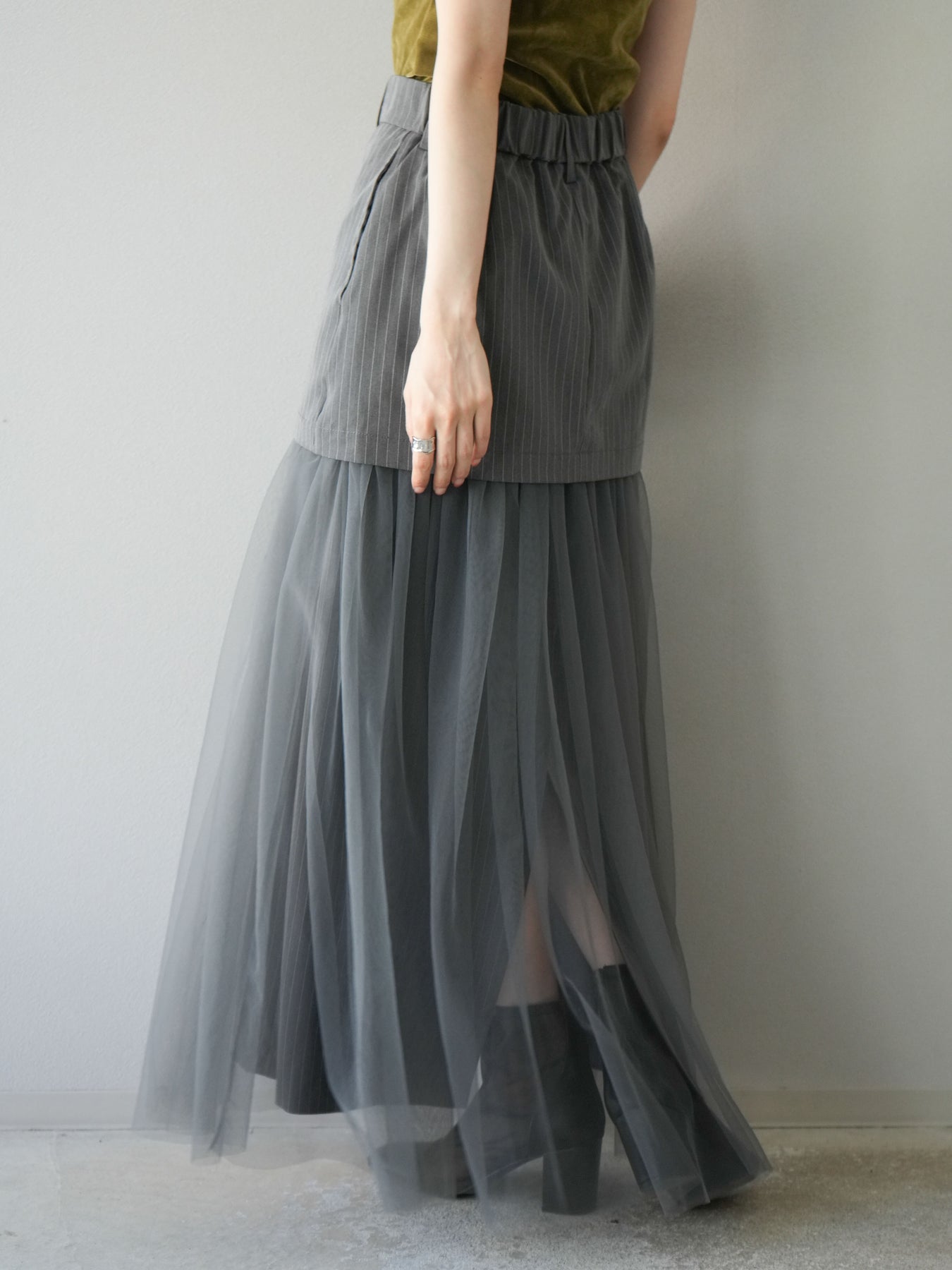 ストライプ生地とチュール素材を切り替えたデザインが特徴的なスカート。異素材の組み合わせがスタイリングに奥行きを与え、シンプルなトップスと合わせるだけで華やかな印象に仕上がります。ウエスト部分はすっきりとしたストライプで大人っぽさを演出し、裾にかけて広がるチュールが軽やかな揺れをプラス。縦ラインを強調することでスタイルアップ効果も期待できます。カジュアルからきれいめまで幅広く対応でき、シーズンを問わず活躍する主役級アイテムです。